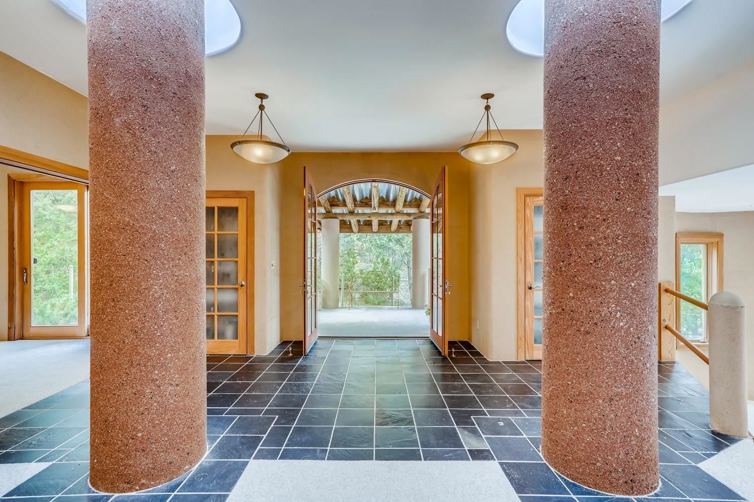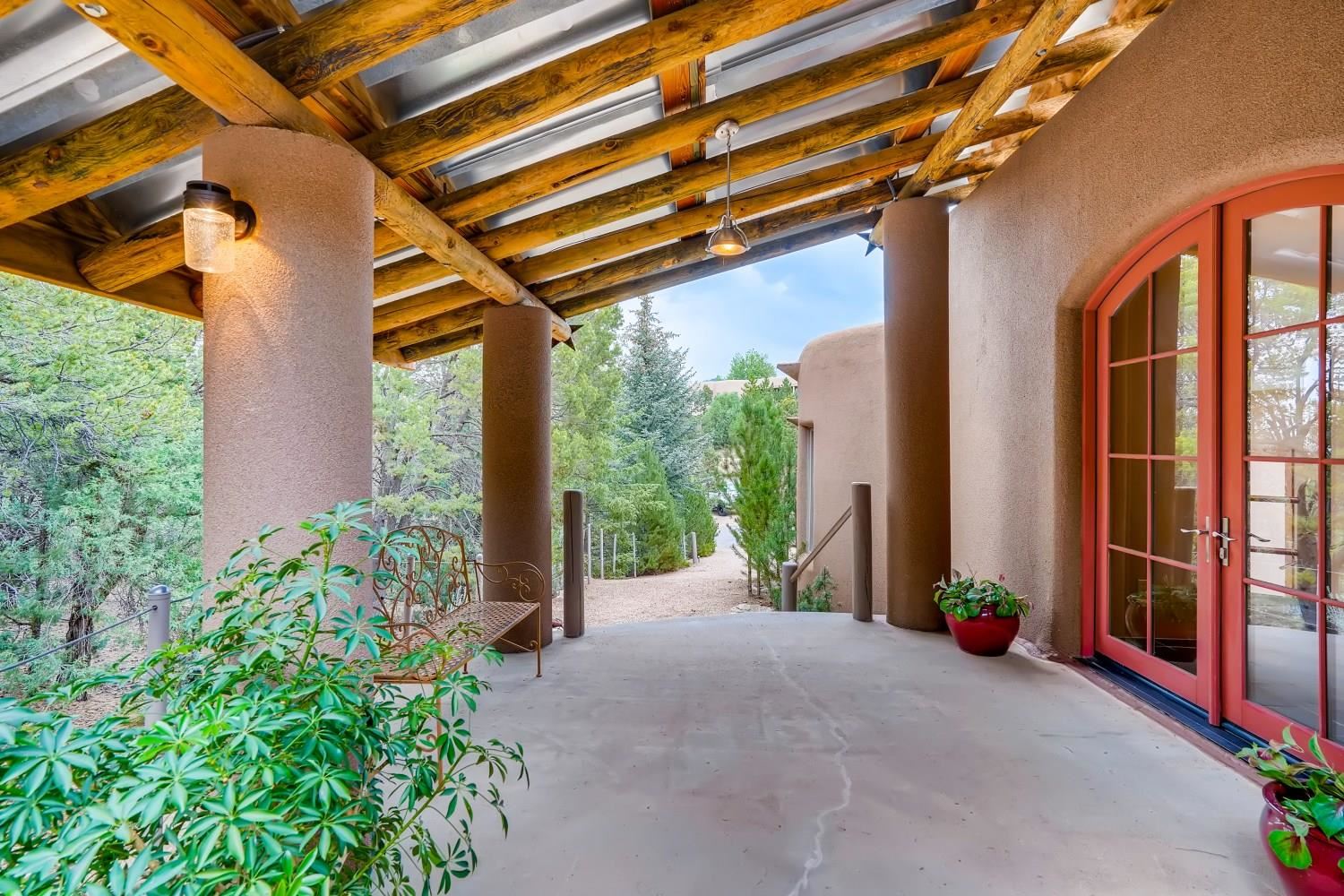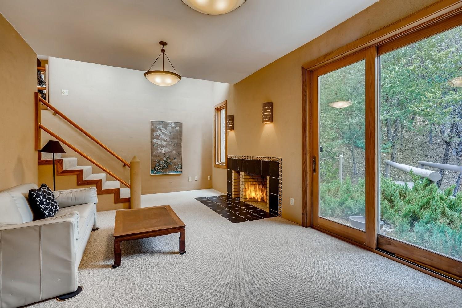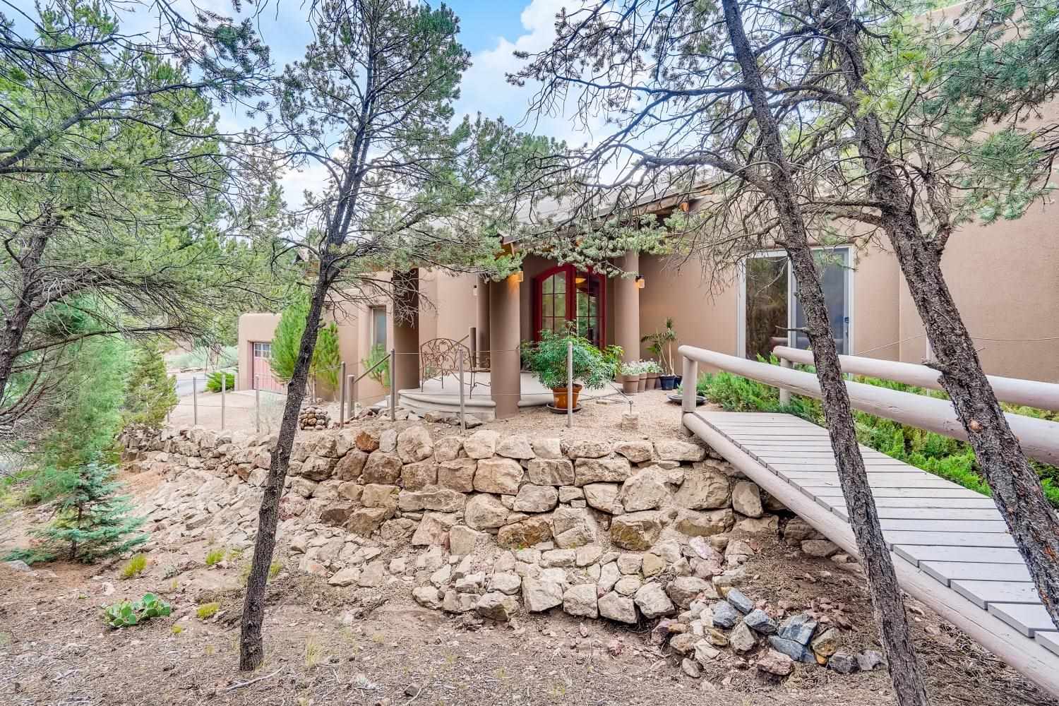 Come revive your spirit at the Santa Fe Summit in Casa Tesuque Creek. Adjacent to the Santa Fe National Forest - nestled in the foothills in a wooded setting that backs up to conservation land, this spectacular property is around the corner from 10,000 Waves Spa and Restaurant, a quick 4.5 miles on Hyde Park Road to downtown Santa Fe, and 12 miles from the closest development to the Santa Fe Ski Basin.Casa Tesuque Creek has accommodated an art gallery and a sculptureand painting studio within its primary residence. There are high ceilings throughout, with gallery lighting and ample wall display space.This contemporary home flows with an open floor plan and boasts two wood-burning natural gas fireplaces - one in a study off the primarybedroom and the other in the great room. You'll enjoy watching wildlife through expansive windows in the kitchen, and there is a generous walk-in closet & dressing area in the primary suite.Off-street parking - available for five cars, is convenient for guests, and the recent good news is that the 4-year construction of an adjacent residence is now completed, bringing Casa Tesuque Creek back into a place of harmony.