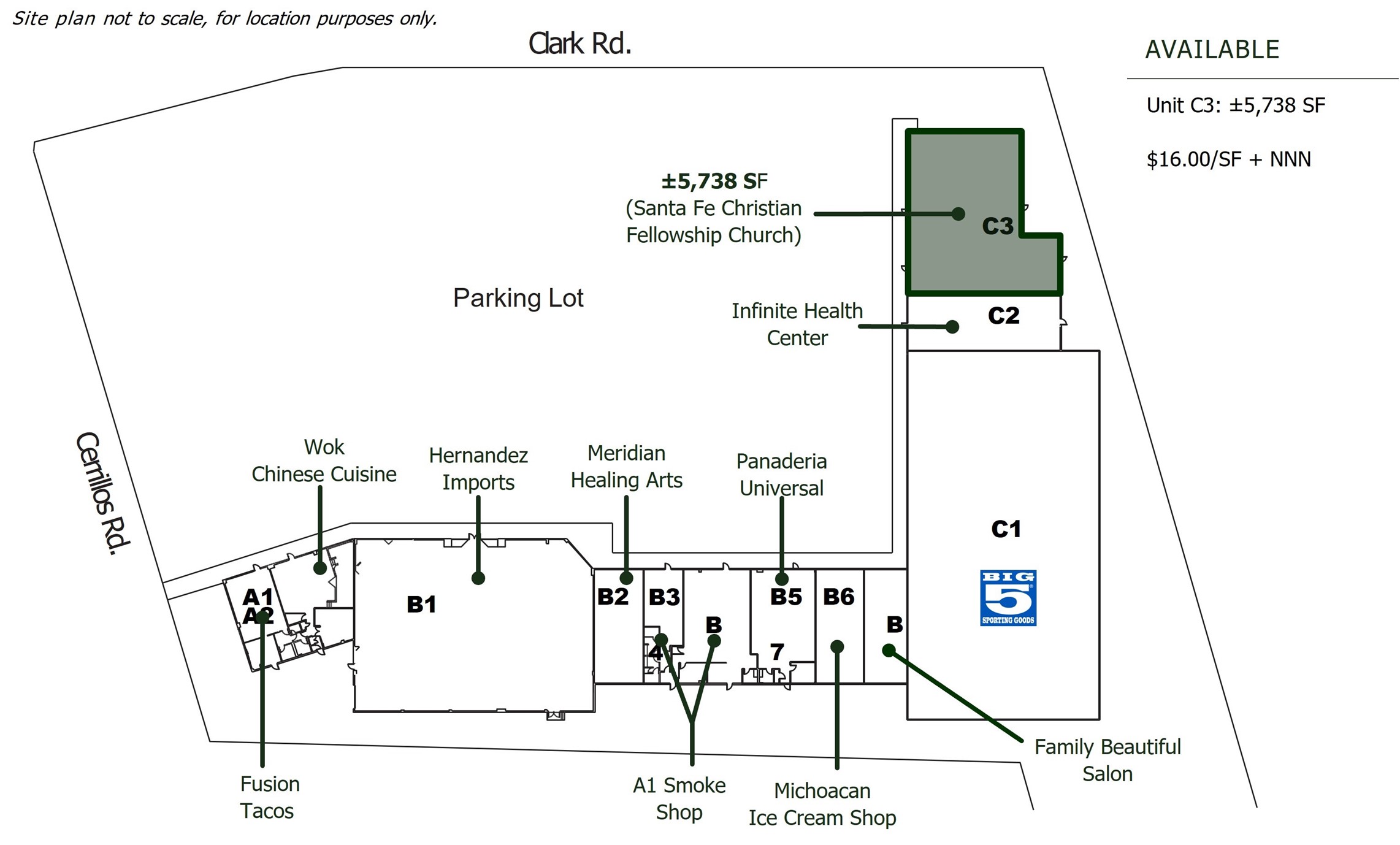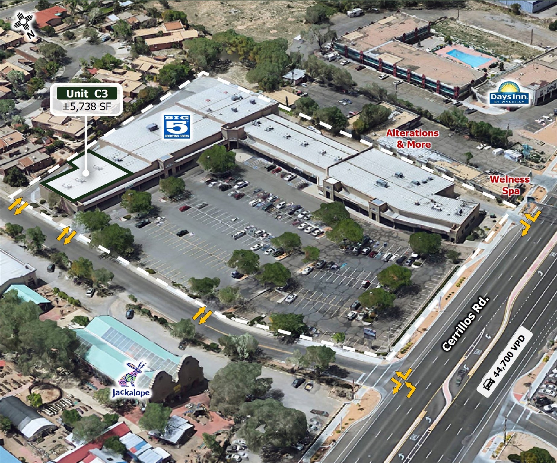 AVAILABLE: Unit C3: 5,738 SF | LEASE RATE: $16.00/SF + NNN | ZONING: C-2 | HIGHLIGHTS: Established shopping center - great for new business, Shopping center anchored by Big 5 Sporting Goods, Adjacent to iconic Jackalope Store & CVS, Ample customer parking, Tremendous traffic and visibility on Cerrillos Rd., Over 43,000 cars per day on Cerrillos Rd., Space available along a busy retail corridor