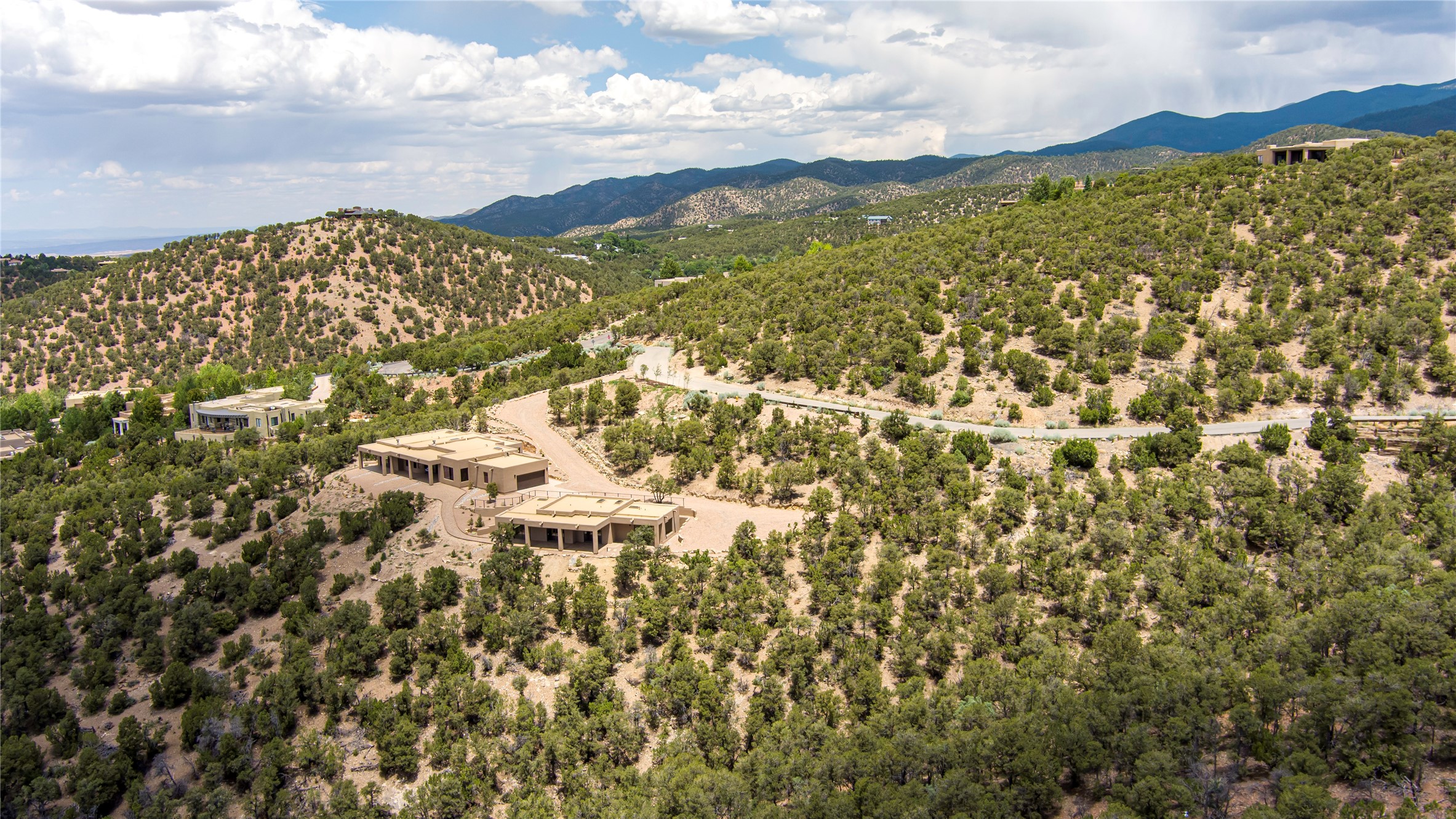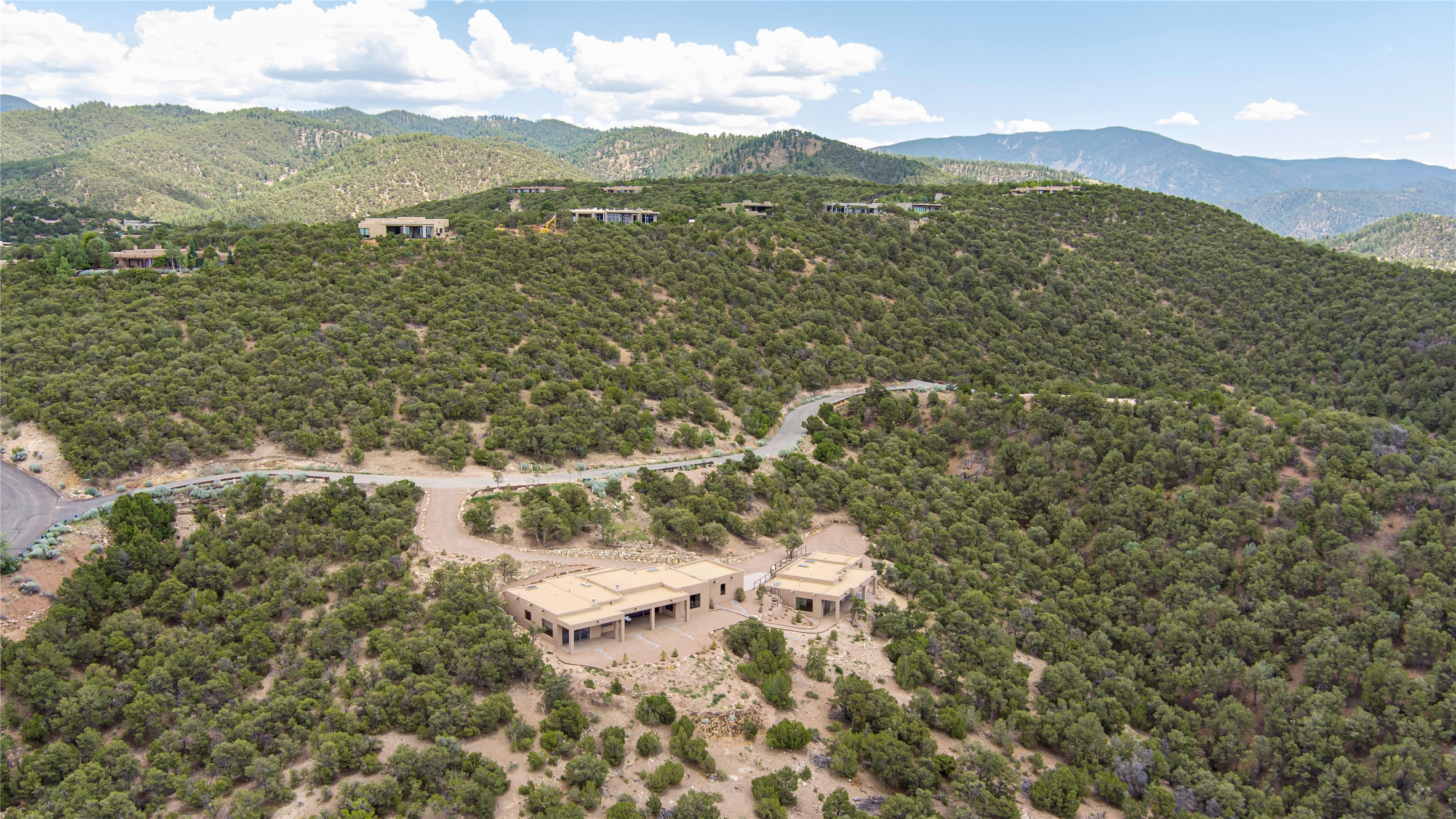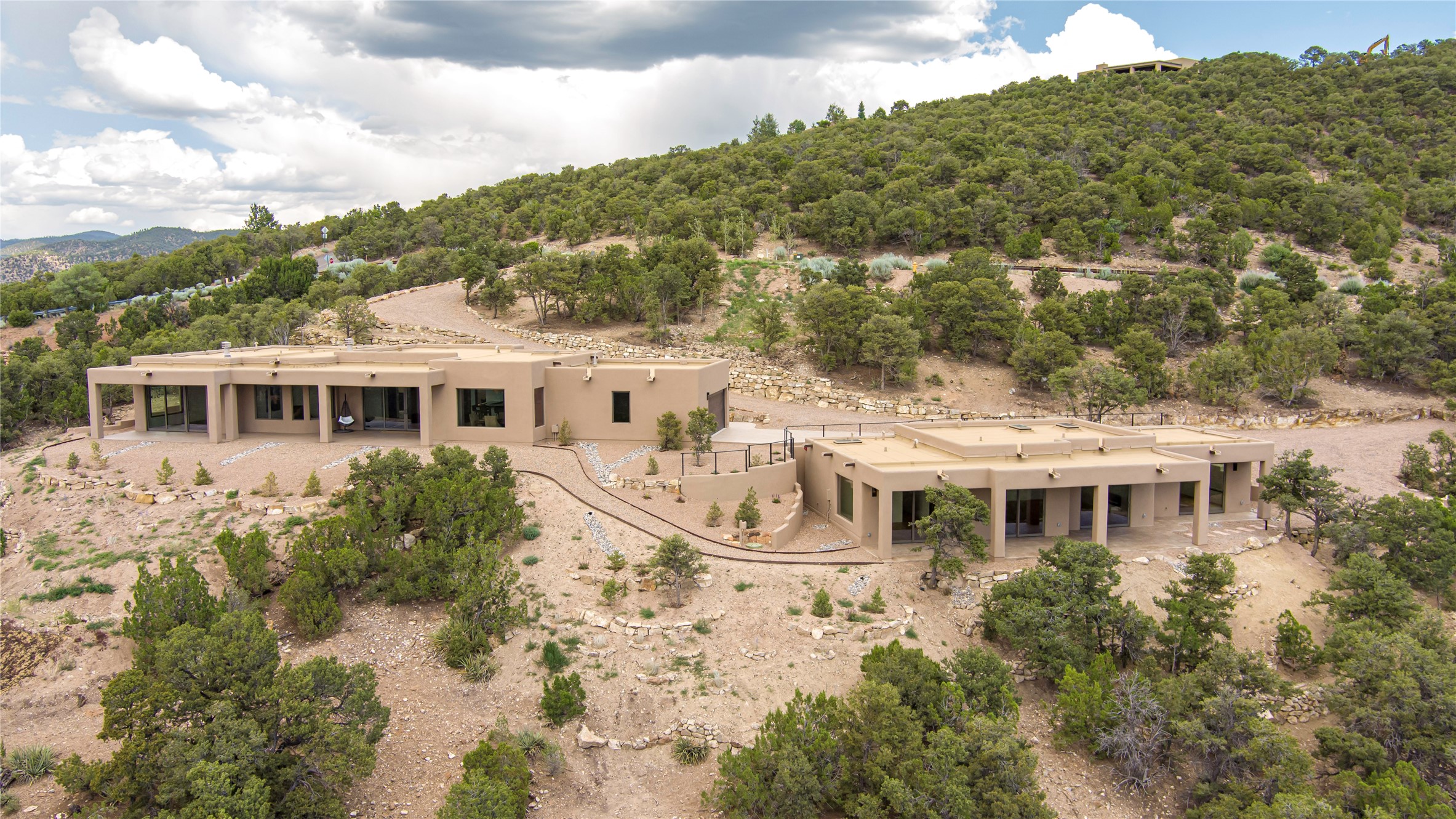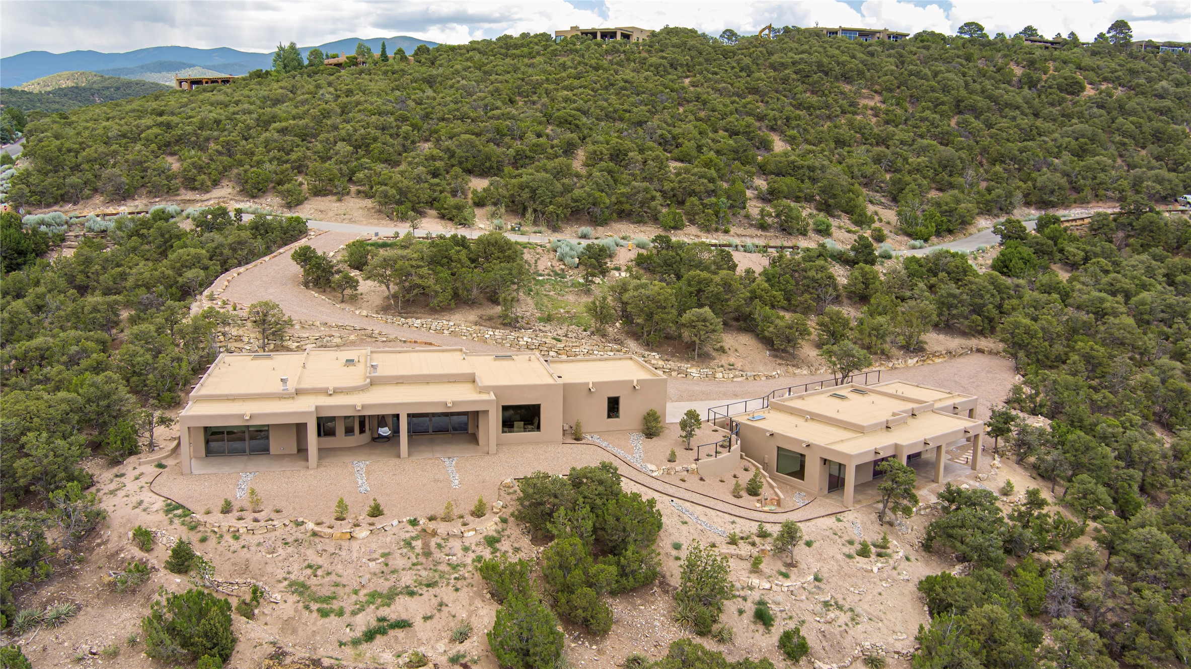 Mountain Living with Breathtaking Views! Discover the perfect blend of luxury and nature in the highly sought-after gated High Summit subdivision. This exceptional property features two contemporary, independent homes perched on a sprawling 2.8 acre lot, offering unparalleled views and tranquility. Prime Location: Just minutes from Santa Fe Plaza, Ski Santa Fe, and scenic hiking and biking trails right outside your door. Main House: 2,461 sq. ft. 2 bedrooms, 2 full baths, an office, and an attached 2-car garage. Guest House: 1,564 sq. ft.2 bedrooms, 2 full baths. Both homes are thoughtfully designed on a single level with no interior steps, offering effortless accessibility. The open-concept layouts boast high-end finishes, including marble and travertine bathrooms, solid wood floors, 8-foot walnut doors, Pella windows, and radiant heating throughout. Each home also features spacious walk-in closets, ductless AC, and expansive covered patios, perfect for outdoor dining or entertaining while soaking in the stunning sunsets. The newly added heated-paved driveway ensures convenience year-round, while the professional landscaping and custom stonework with drip irrigation system enhance the property's natural beauty. Why Choose This Property? Enjoy the serenity of mountain living without sacrificing proximity to Santa Fe's vibrant cultural scene. With world-class restaurants, art galleries, shopping, and entertainment just minutes away, this property offers the ultimate lifestyle for those who cherish both peace and excitement. Don't miss your chance to own this extraordinary retreat!