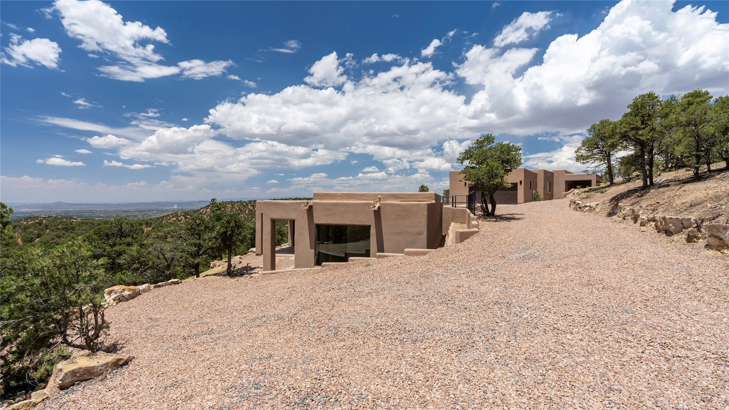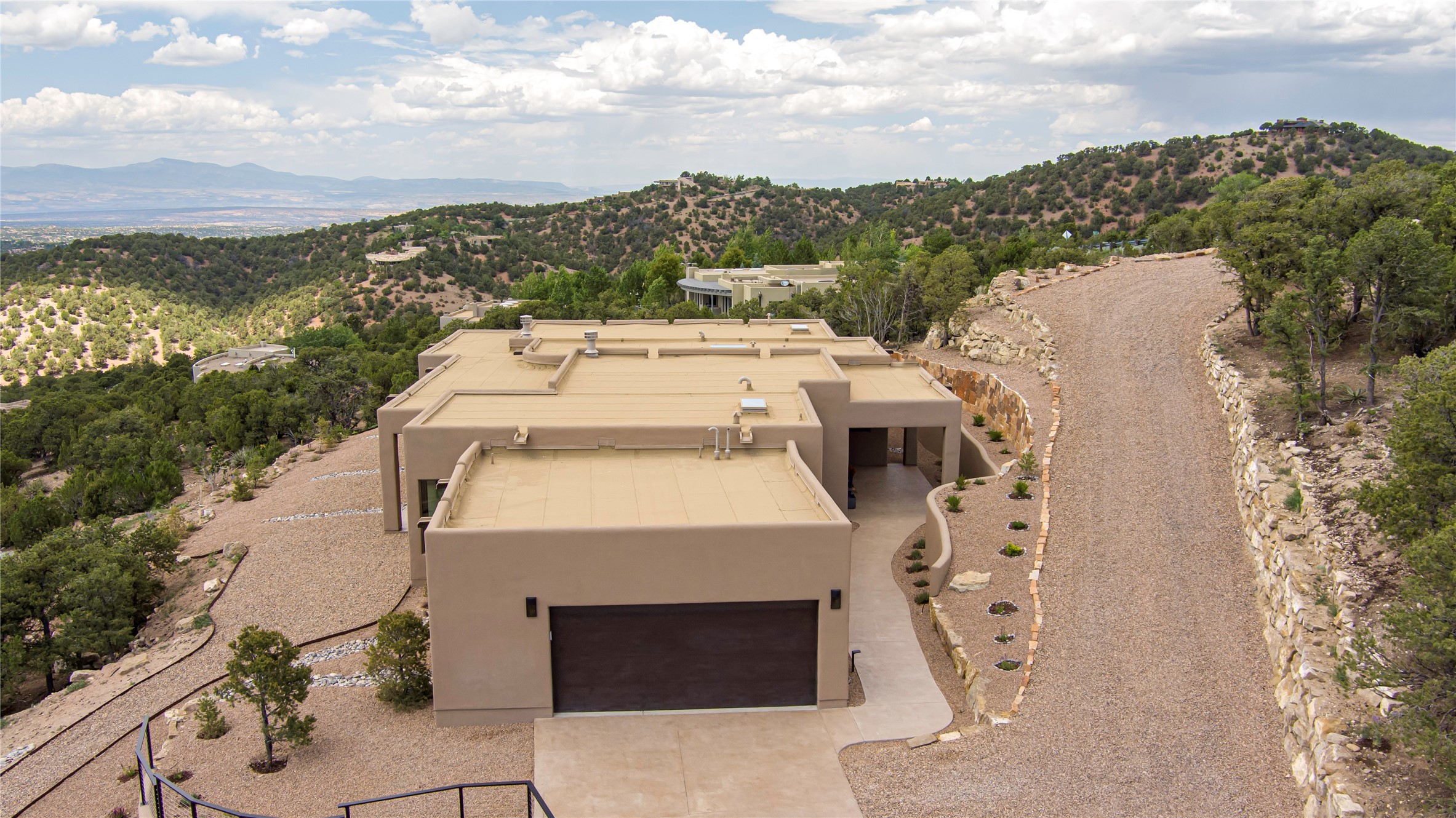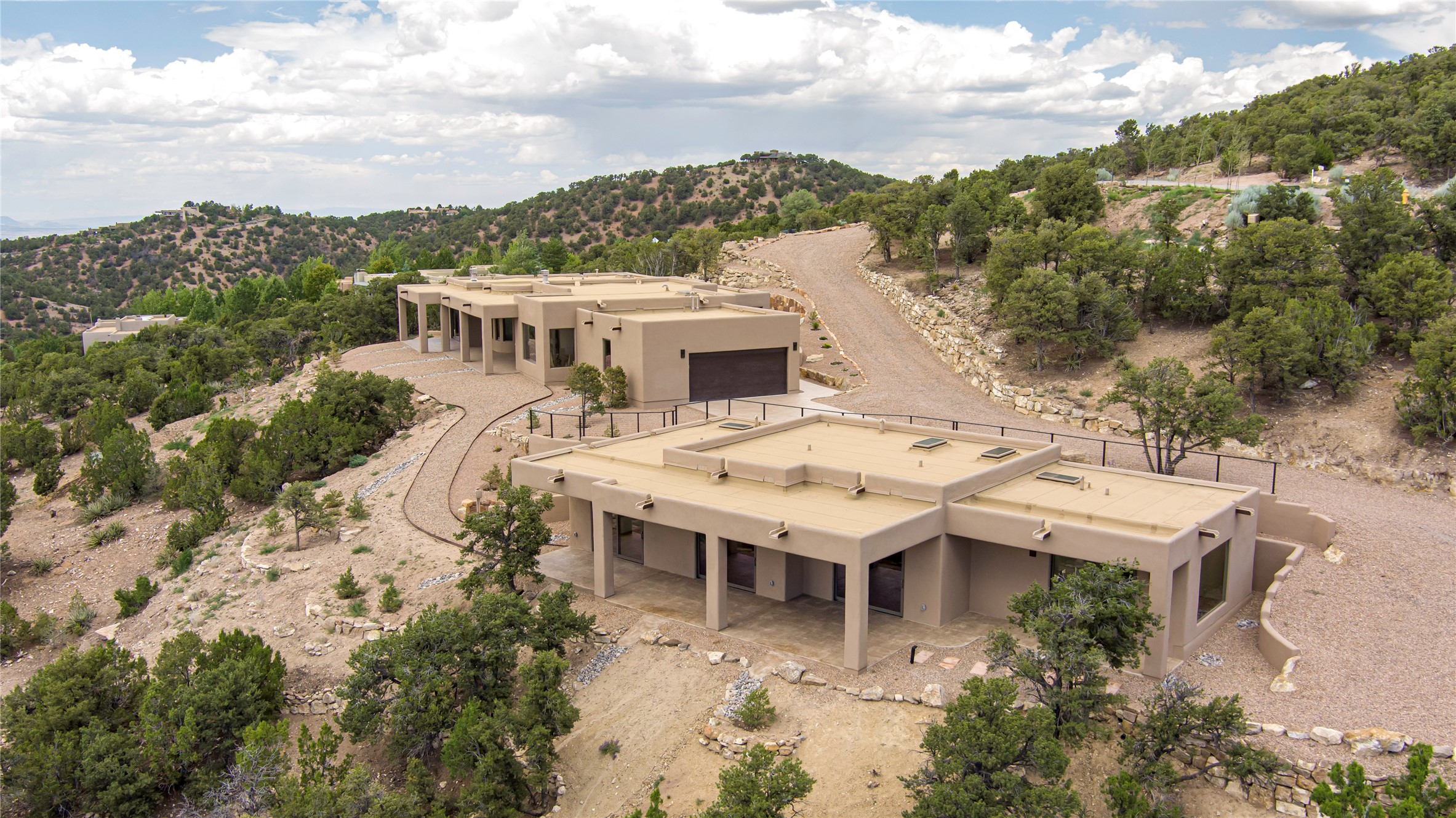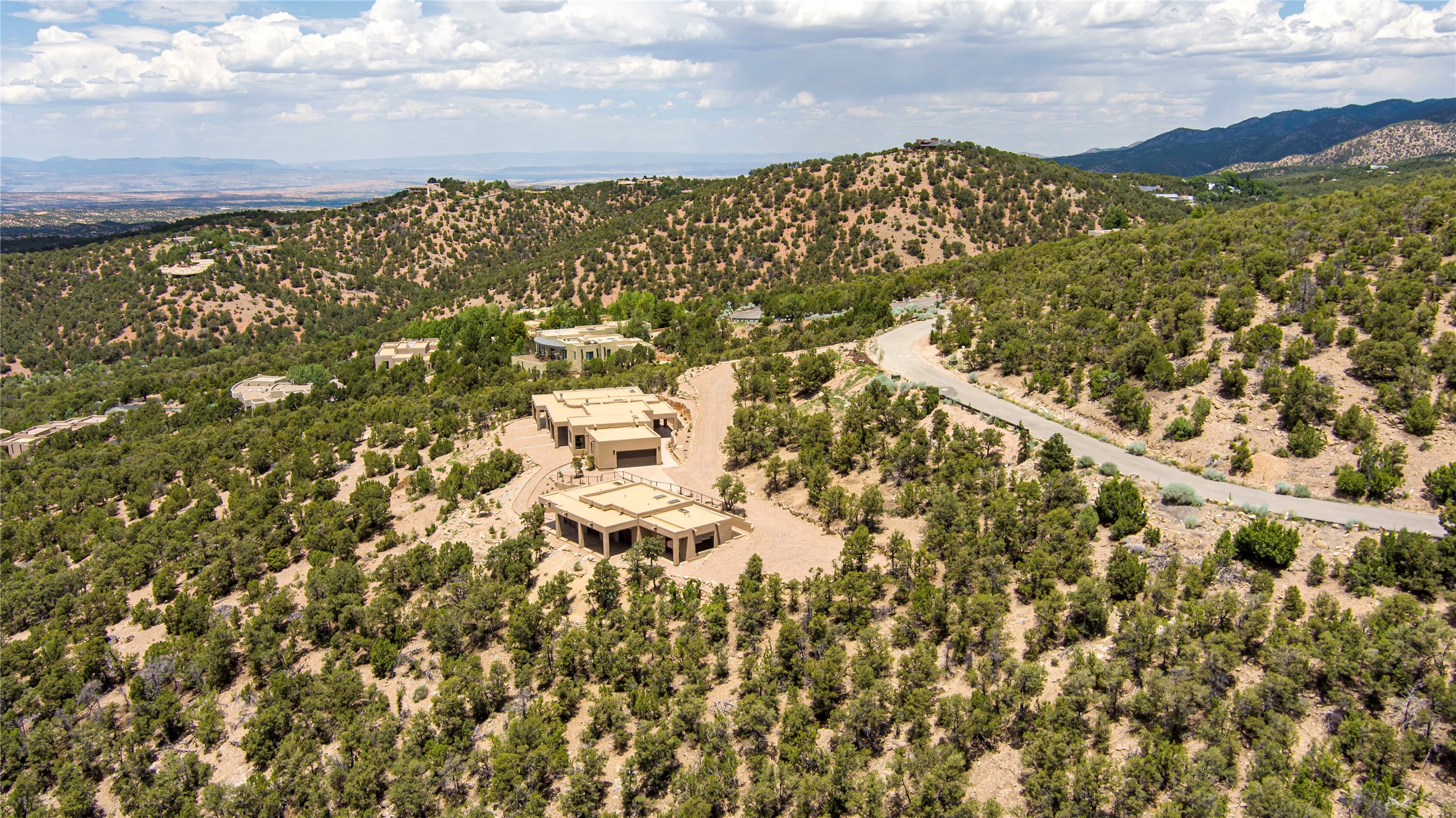 Mountain Living with Breathtaking Views! Discover the perfect blend of luxury and nature in the highly sought-after gated High Summit subdivision. This exceptional property features two contemporary, independent homes perched on a sprawling 2.8 acre lot, offering unparalleled views and tranquility. Prime Location: Just minutes from Santa Fe Plaza, Ski Santa Fe, and scenic hiking and biking trails right outside your door. Main House: 2,461 sq. ft. 2 bedrooms, 2 full baths, an office, and an attached 2-car garage. Guest House: 1,564 sq. ft.2 bedrooms, 2 full baths. Both homes are thoughtfully designed on a single level with no interior steps, offering effortless accessibility. The open-concept layouts boast high-end finishes, including marble and travertine bathrooms, solid wood floors, 8-foot walnut doors, Pella windows, and radiant heating throughout. Each home also features spacious walk-in closets, ductless AC, and expansive covered patios, perfect for outdoor dining or entertaining while soaking in the stunning sunsets. The newly added heated-paved driveway ensures convenience year-round, while the professional landscaping and custom stonework with drip irrigation system enhance the property's natural beauty. Why Choose This Property? Enjoy the serenity of mountain living without sacrificing proximity to Santa Fe's vibrant cultural scene. With world-class restaurants, art galleries, shopping, and entertainment just minutes away, this property offers the ultimate lifestyle for those who cherish both peace and excitement. Don't miss your chance to own this extraordinary retreat!