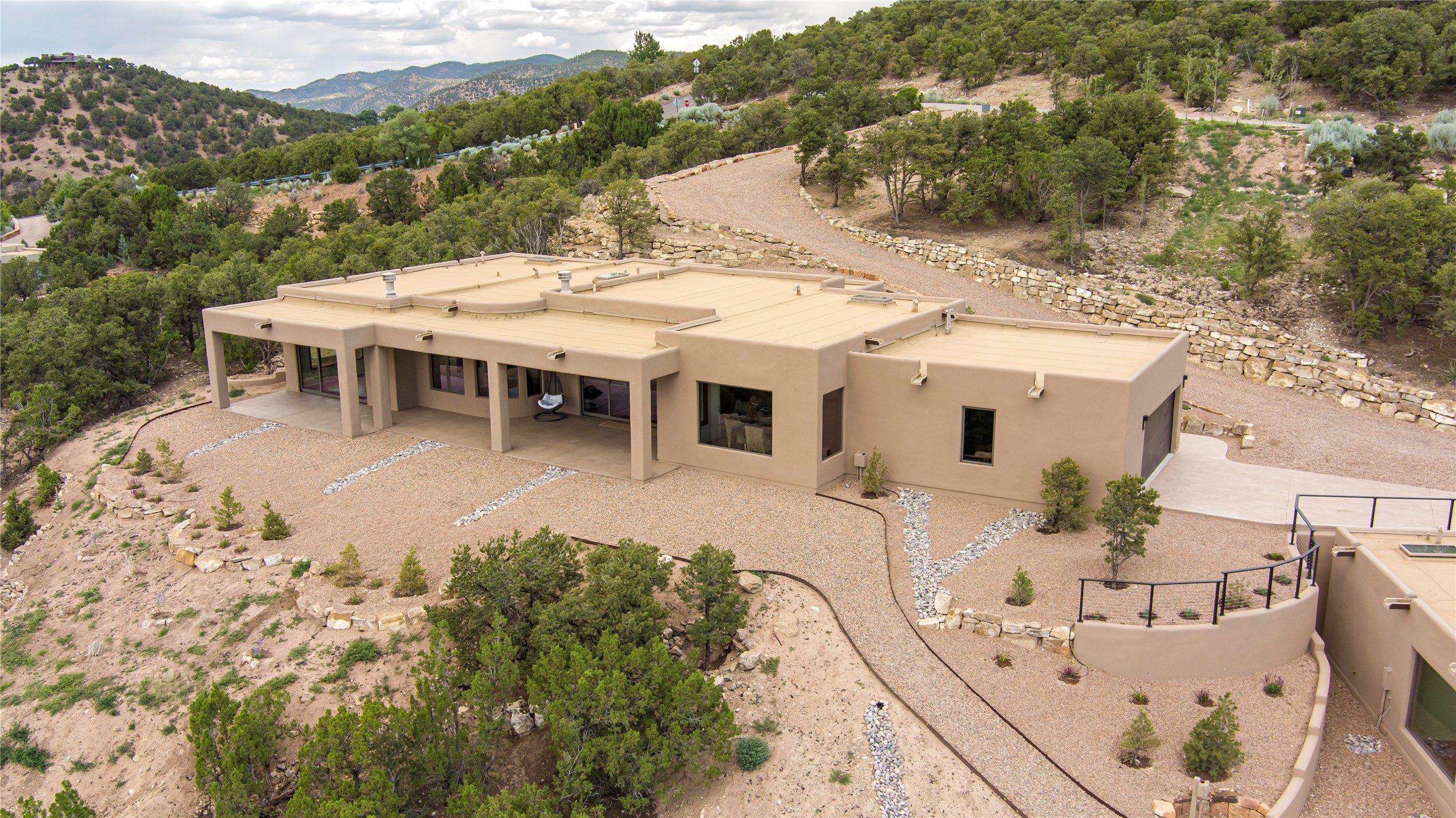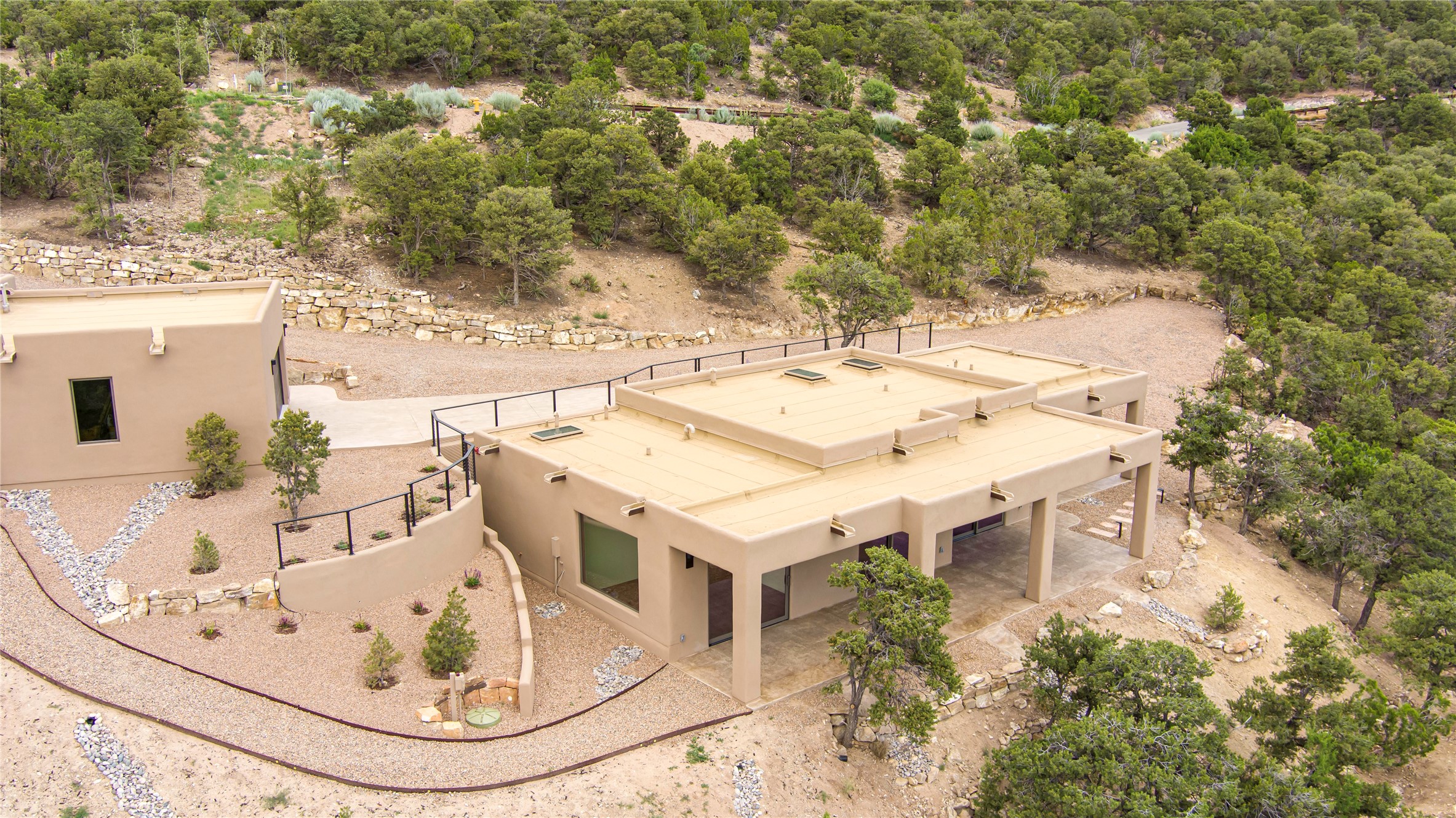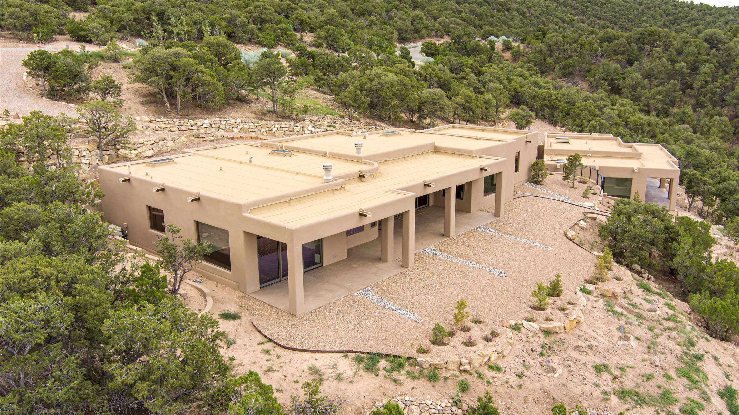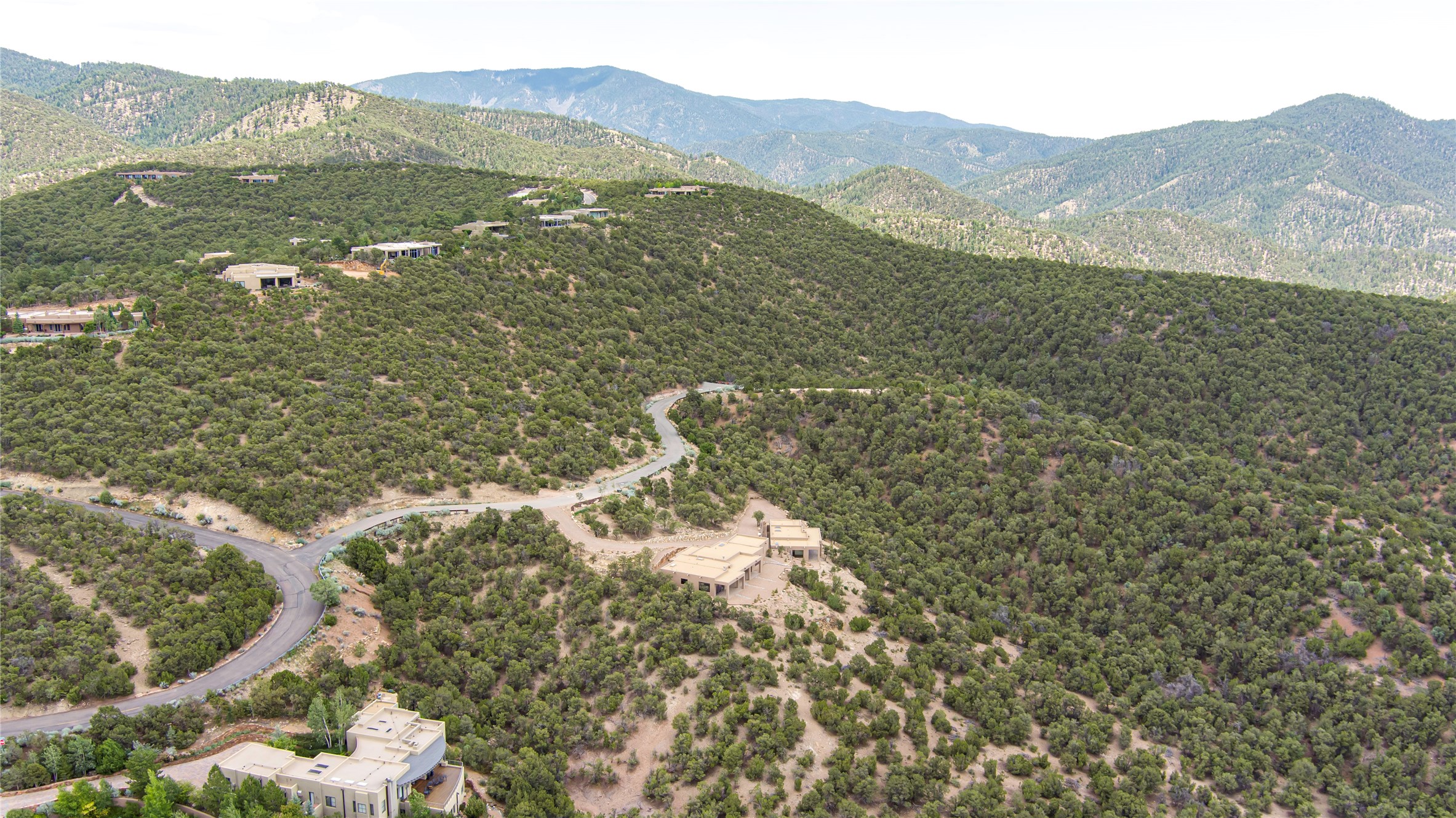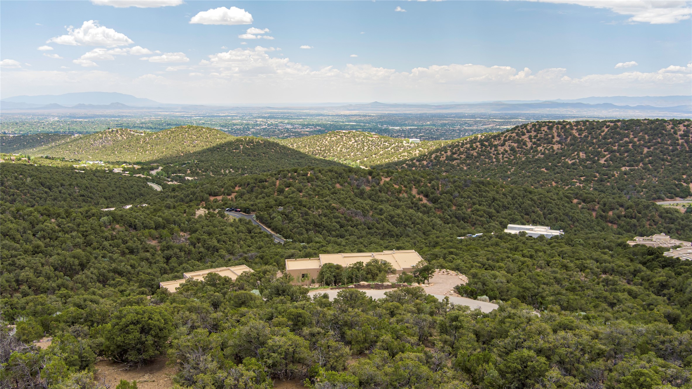 Mountain Living with Breathtaking Views! Discover the perfect blend of luxury and nature in the highly sought-after gated High Summit subdivision. This exceptional property features two contemporary, independent homes perched on a sprawling 2.8 acre lot, offering unparalleled views and tranquility. Prime Location: Just minutes from Santa Fe Plaza, Ski Santa Fe, and scenic hiking and biking trails right outside your door. Main House: 2,461 sq. ft. 2 bedrooms, 2 full baths, an office, and an attached 2-car garage. Guest House: 1,564 sq. ft.2 bedrooms, 2 full baths. Both homes are thoughtfully designed on a single level with no interior steps, offering effortless accessibility. The open-concept layouts boast high-end finishes, including marble and travertine bathrooms, solid wood floors, 8-foot walnut doors, Pella windows, and radiant heating throughout. Each home also features spacious walk-in closets, ductless AC, and expansive covered patios, perfect for outdoor dining or entertaining while soaking in the stunning sunsets. The newly added heated-paved driveway ensures convenience year-round, while the professional landscaping and custom stonework with drip irrigation system enhance the property's natural beauty. Why Choose This Property? Enjoy the serenity of mountain living without sacrificing proximity to Santa Fe's vibrant cultural scene. With world-class restaurants, art galleries, shopping, and entertainment just minutes away, this property offers the ultimate lifestyle for those who cherish both peace and excitement. Don't miss your chance to own this extraordinary retreat!