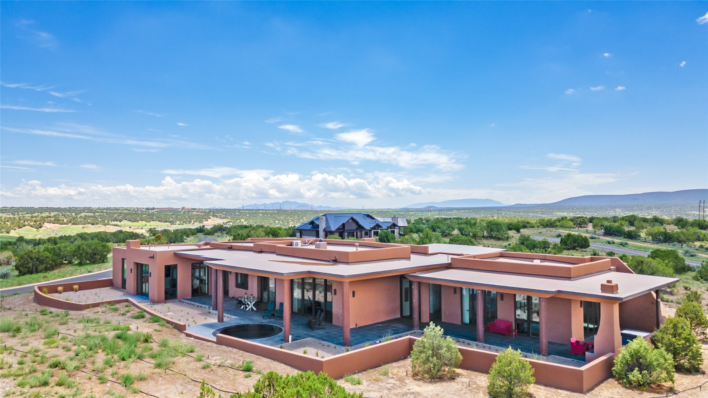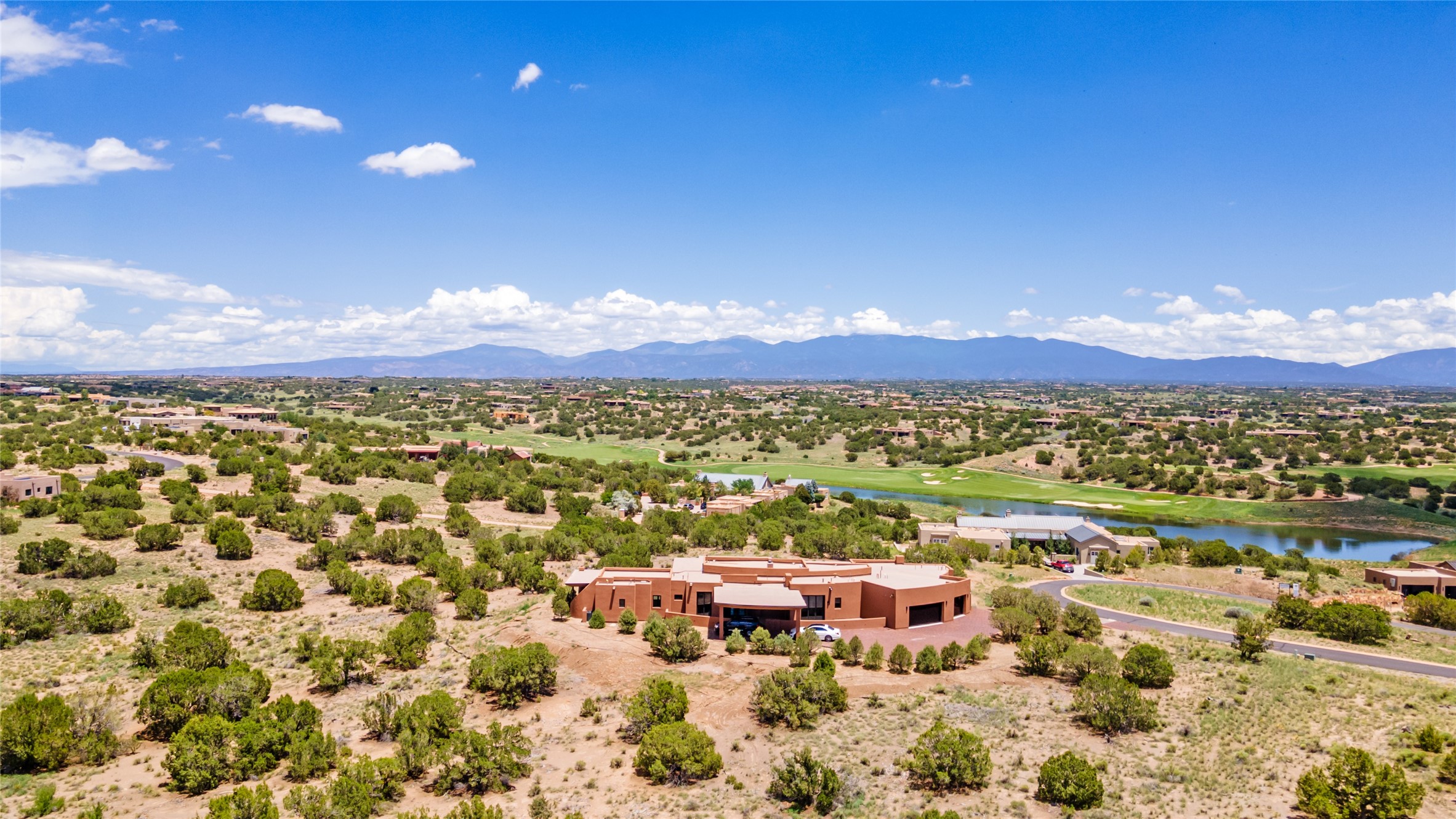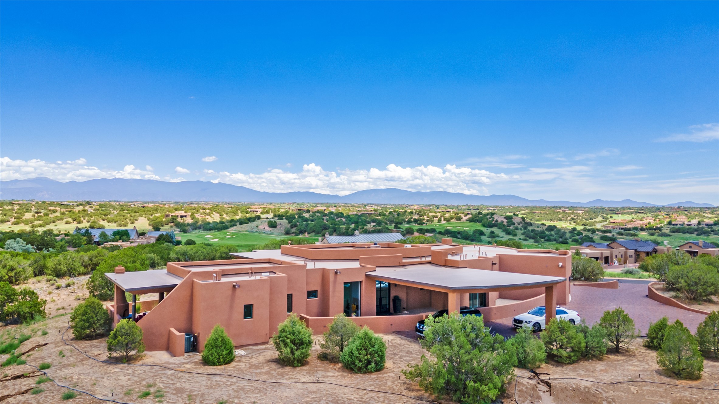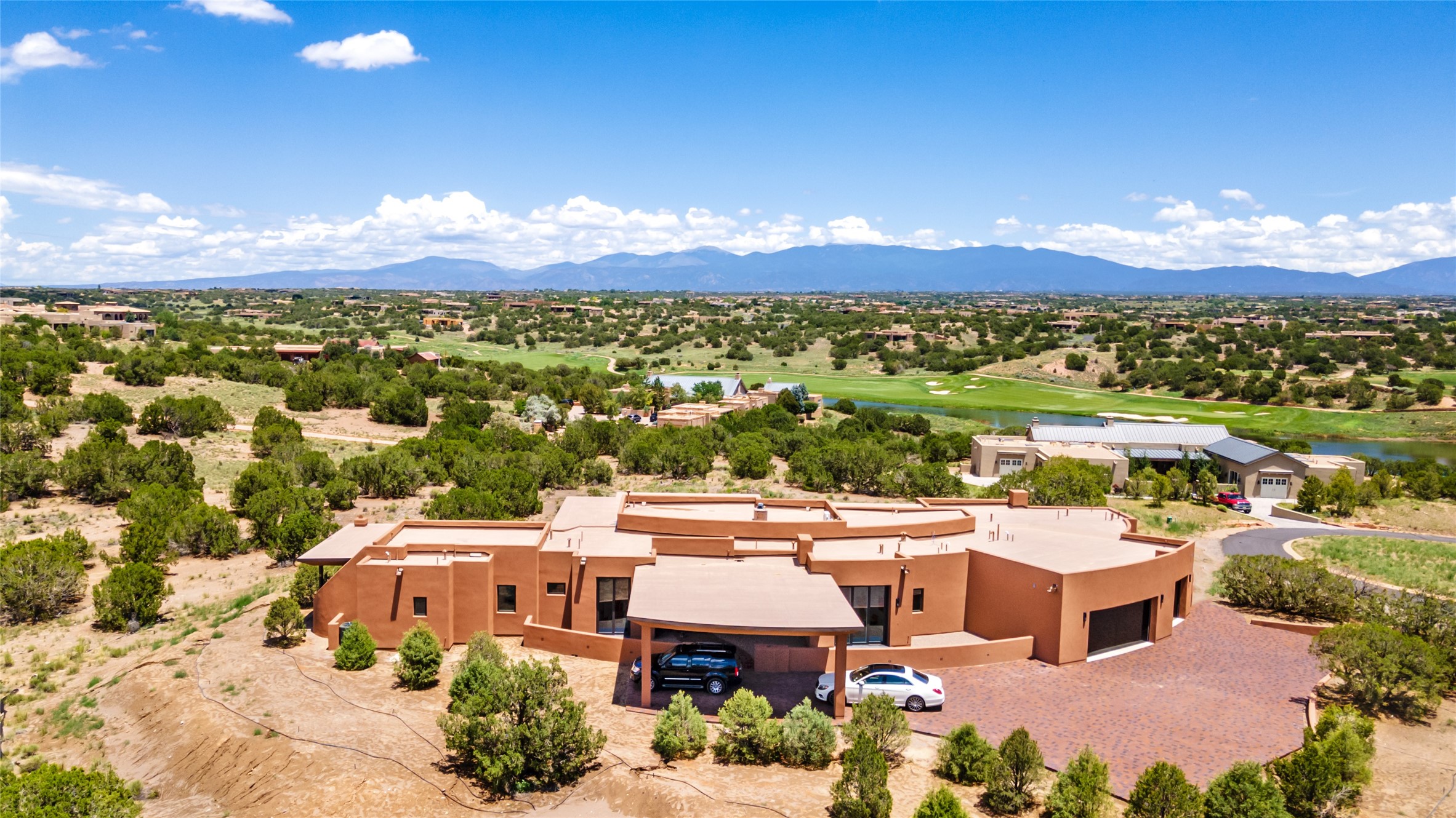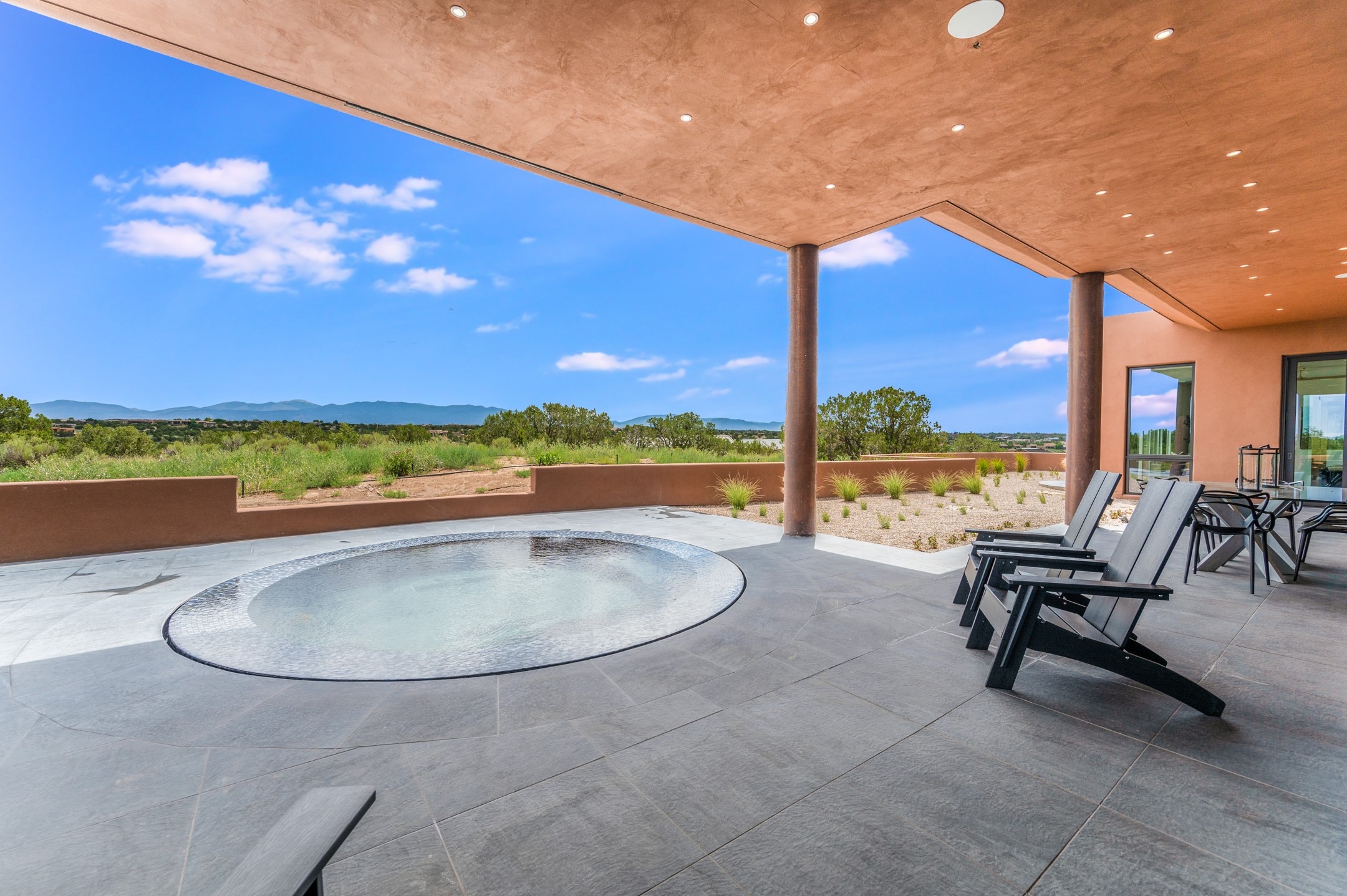 Price Improvement! Casa Tranquila an exquisite Contemporary Pueblo built by Native Son Builders in the gated community of Las Campanas. With over 4200 square feet of indoor living space paired with over 1600 square feet of perfect outdoor living including covered portals, kiva fireplace and a 12-14 person infinity spa. The floor plan generously flows from room to room with unobstructed views of the Sangre de Cristo mountains at every turn. Entertain with ease in the open yet intimate great room with a custom gas fireplace and finishes that elevate the mood for all to enjoy. Specialty brick floors and expansive motorized sliding walls seamlessly connect for outdoor/indoor living. The impressive porte-cochere welcomes your guests with grandeur. Attached casita provides privacy and flexibility for guests with a lovely kitchenette, living space and private portal with Kiva fireplace. Interior finishes have been carefully curated by a design team that blends form and function and walls that accommodate the most discerning art collector. A bespoke kitchen to delight any chef, accompanied with a custom refrigerated wine rack, Quartzite back lit countertops, Wolf appliances, Subzero refrigerator/freezer, two Asko dishwashers, plus a walk in pantry. A large mud room-laundry area is off the 3 car garage featuring elegant Envy garage doors with glass panels. This stunning home adds ease and comfort to your day to day living. Las Campanas offers many amenities: 2 Jack Nicklaus golf courses, clubhouse, restaurants, indoor/outdoor pools, spa, fitness center, racquet sports, equestrian center and 24 hour security plus EMT services. Membership is optional and can be purchased separately. Don't miss seeing this Santa Fe modern masterpiece!