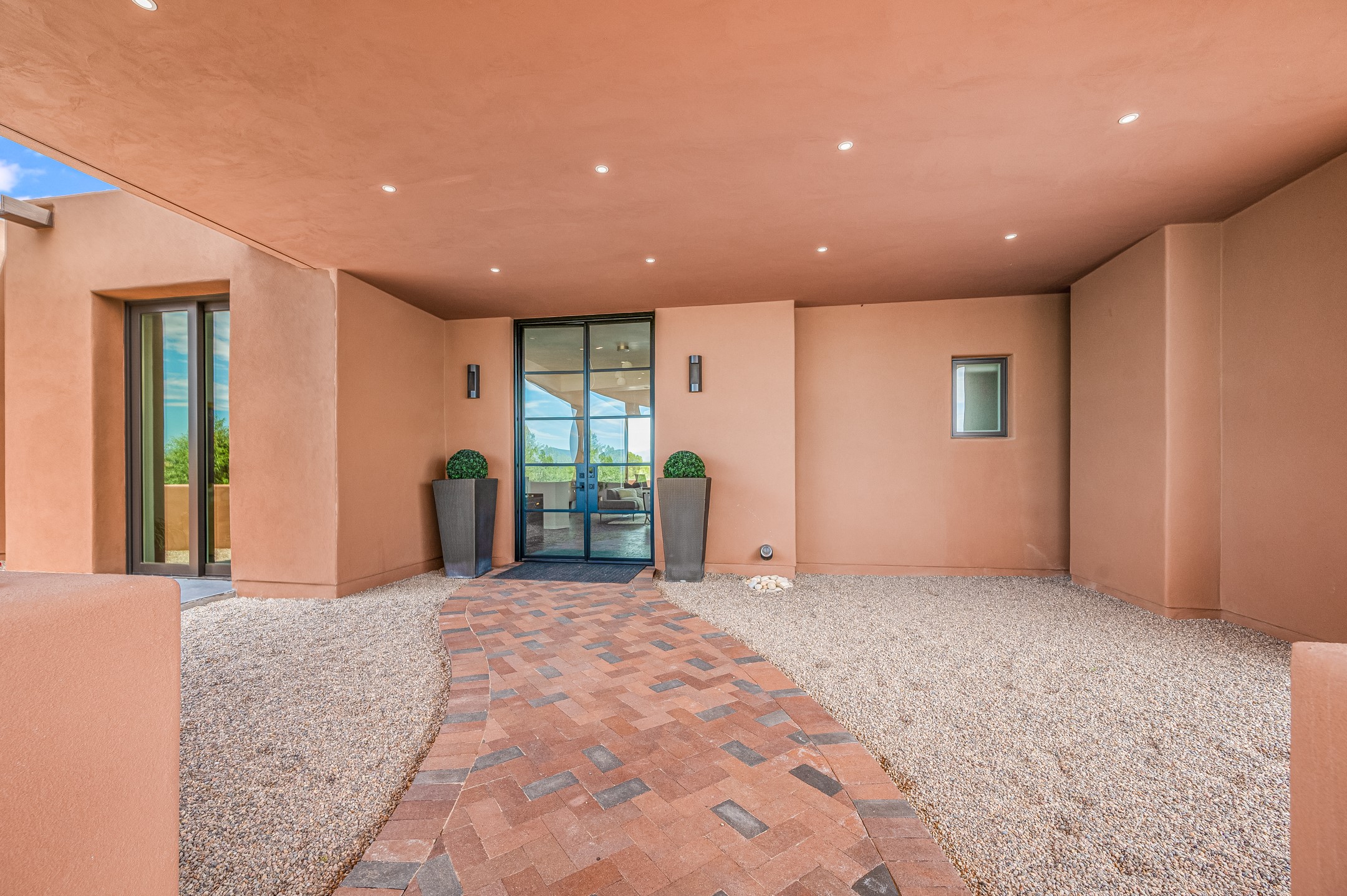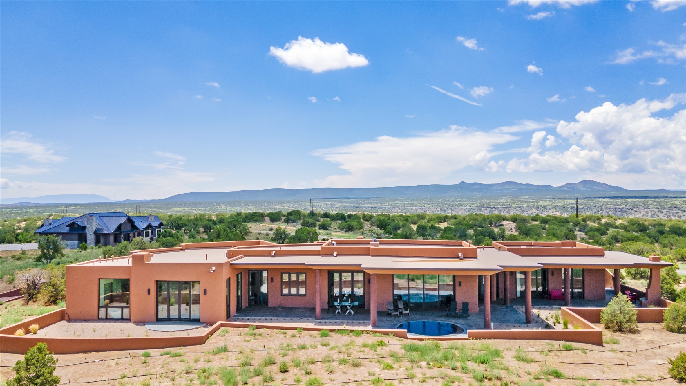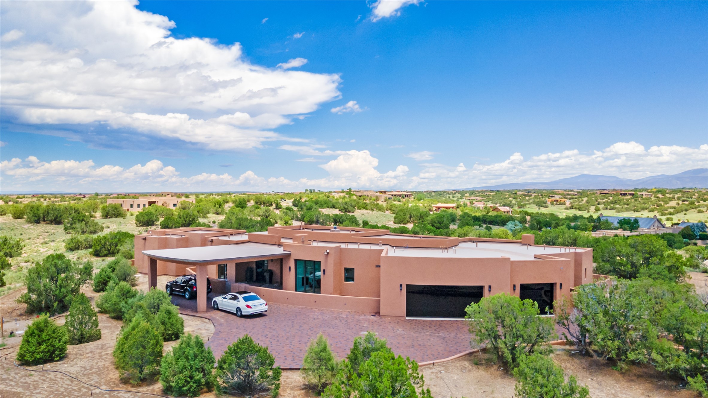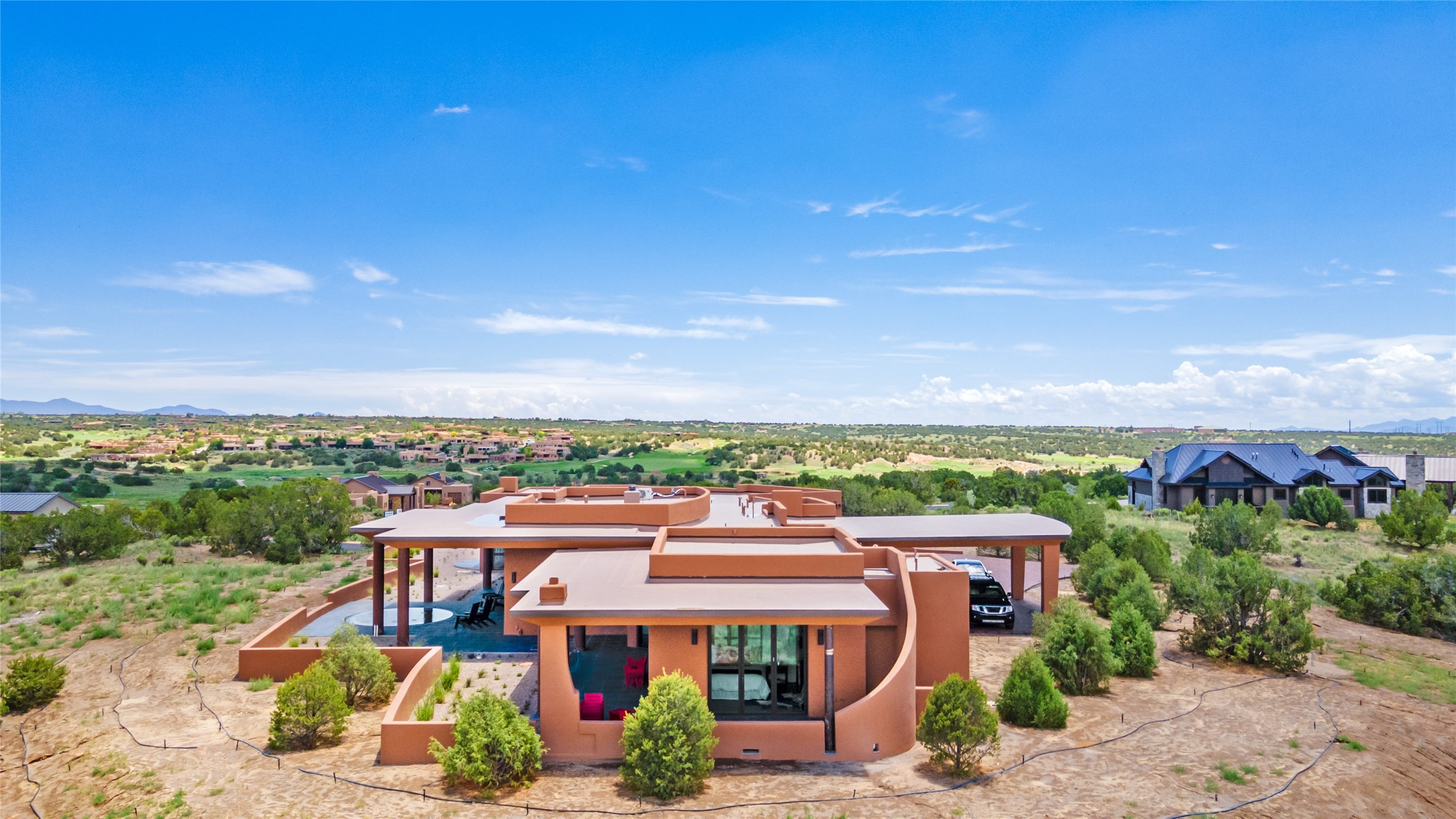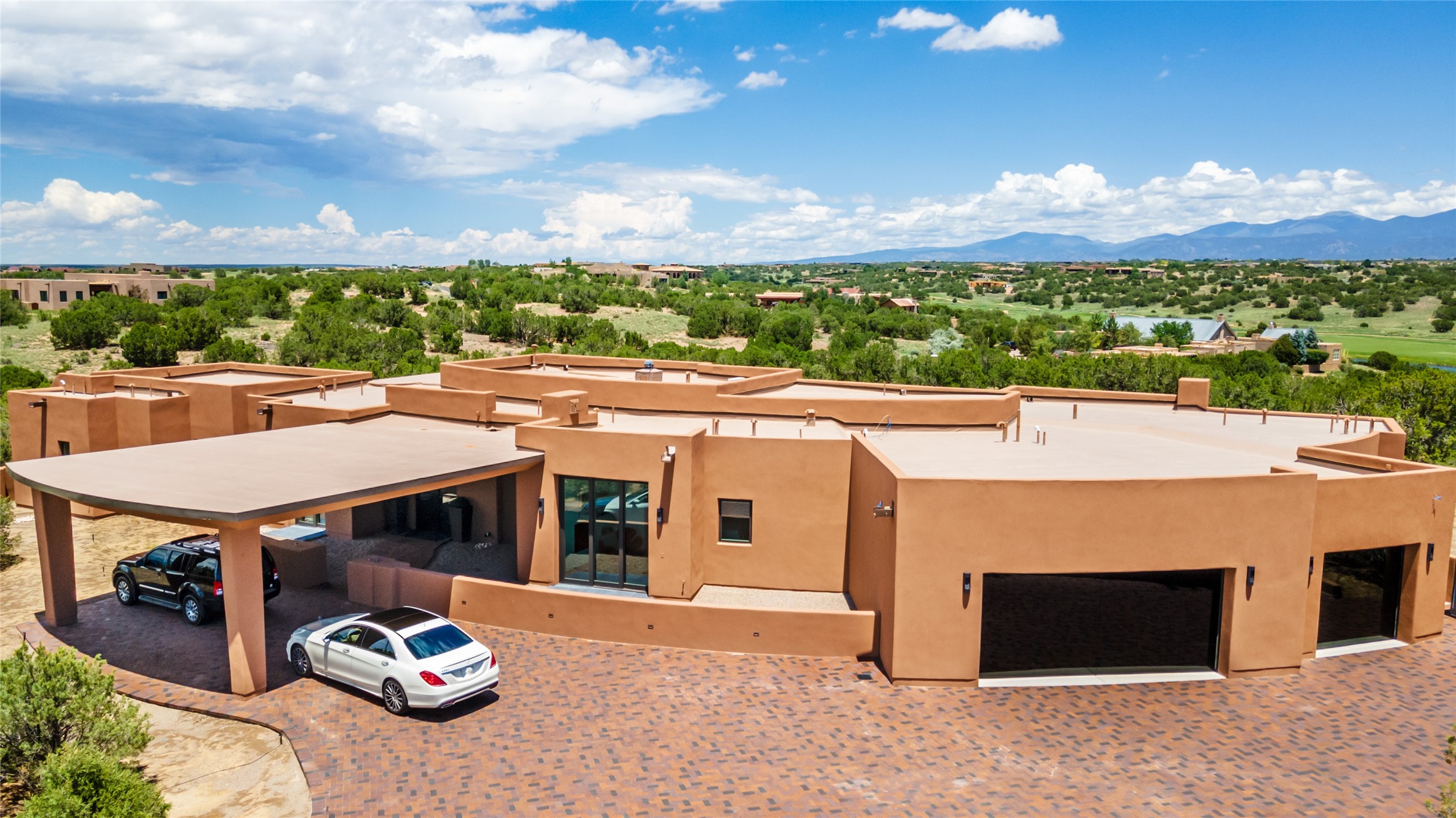 Price Improvement! Casa Tranquila an exquisite Contemporary Pueblo built by Native Son Builders in the gated community of Las Campanas. With over 4200 square feet of indoor living space paired with over 1600 square feet of perfect outdoor living including covered portals, kiva fireplace and a 12-14 person infinity spa. The floor plan generously flows from room to room with unobstructed views of the Sangre de Cristo mountains at every turn. Entertain with ease in the open yet intimate great room with a custom gas fireplace and finishes that elevate the mood for all to enjoy. Specialty brick floors and expansive motorized sliding walls seamlessly connect for outdoor/indoor living. The impressive porte-cochere welcomes your guests with grandeur. Attached casita provides privacy and flexibility for guests with a lovely kitchenette, living space and private portal with Kiva fireplace. Interior finishes have been carefully curated by a design team that blends form and function and walls that accommodate the most discerning art collector. A bespoke kitchen to delight any chef, accompanied with a custom refrigerated wine rack, Quartzite back lit countertops, Wolf appliances, Subzero refrigerator/freezer, two Asko dishwashers, plus a walk in pantry. A large mud room-laundry area is off the 3 car garage featuring elegant Envy garage doors with glass panels. This stunning home adds ease and comfort to your day to day living. Las Campanas offers many amenities: 2 Jack Nicklaus golf courses, clubhouse, restaurants, indoor/outdoor pools, spa, fitness center, racquet sports, equestrian center and 24 hour security plus EMT services. Membership is optional and can be purchased separately. Don't miss seeing this Santa Fe modern masterpiece!