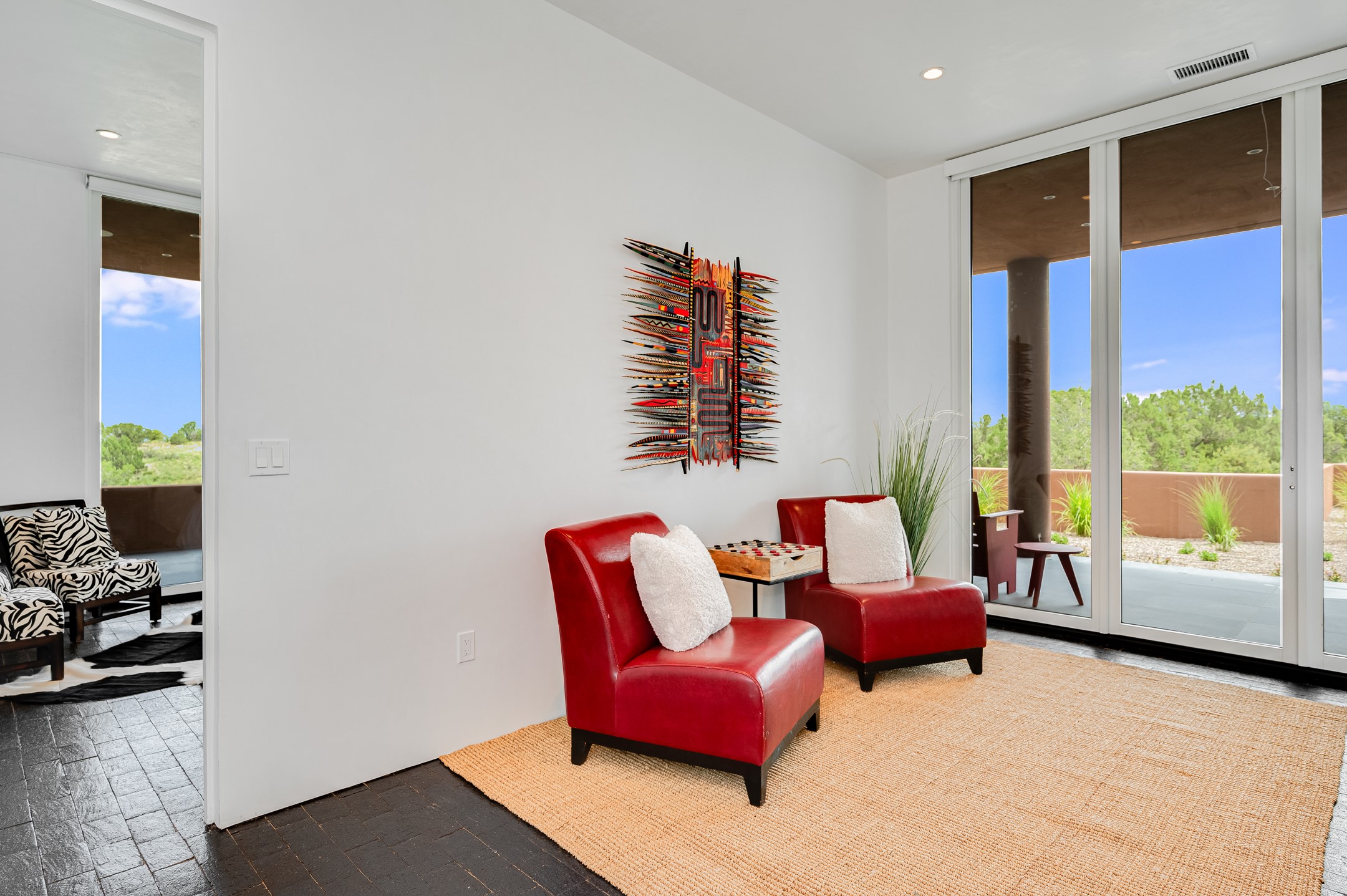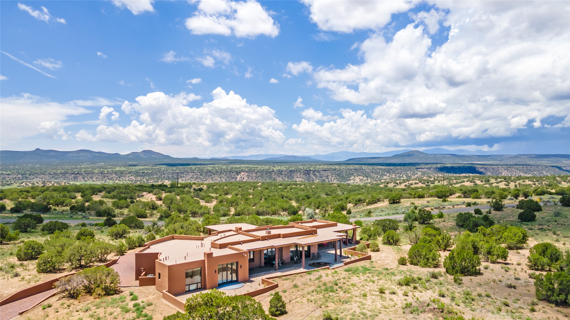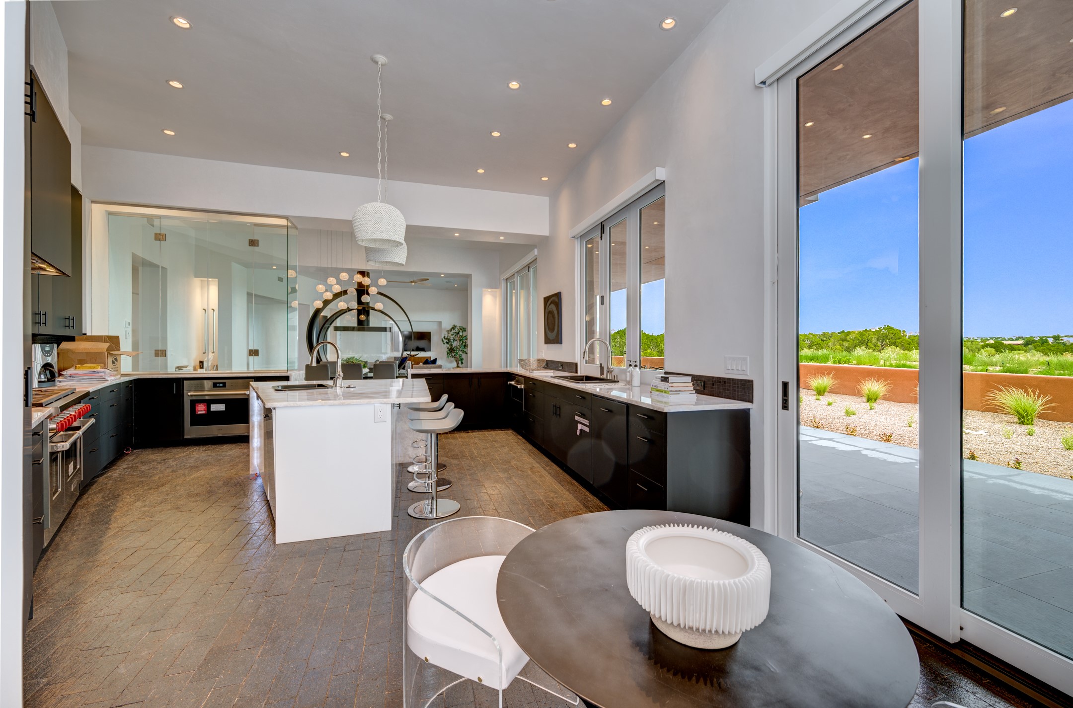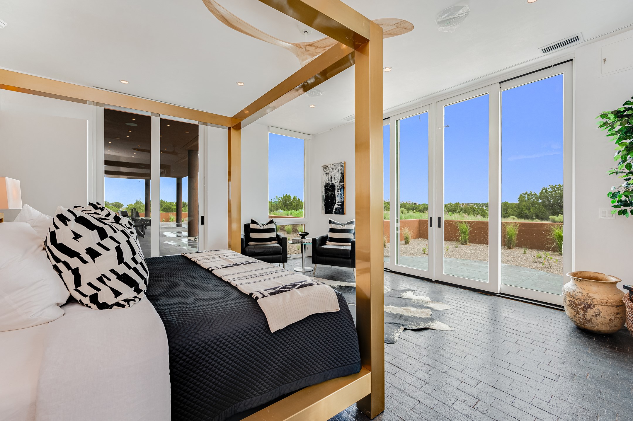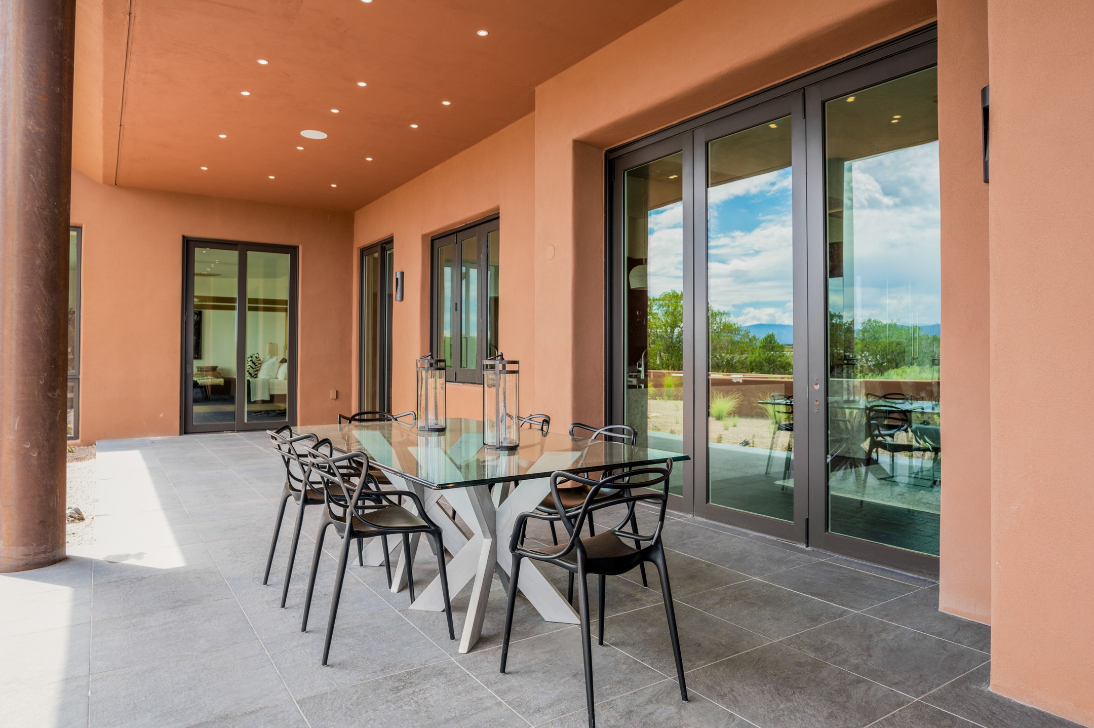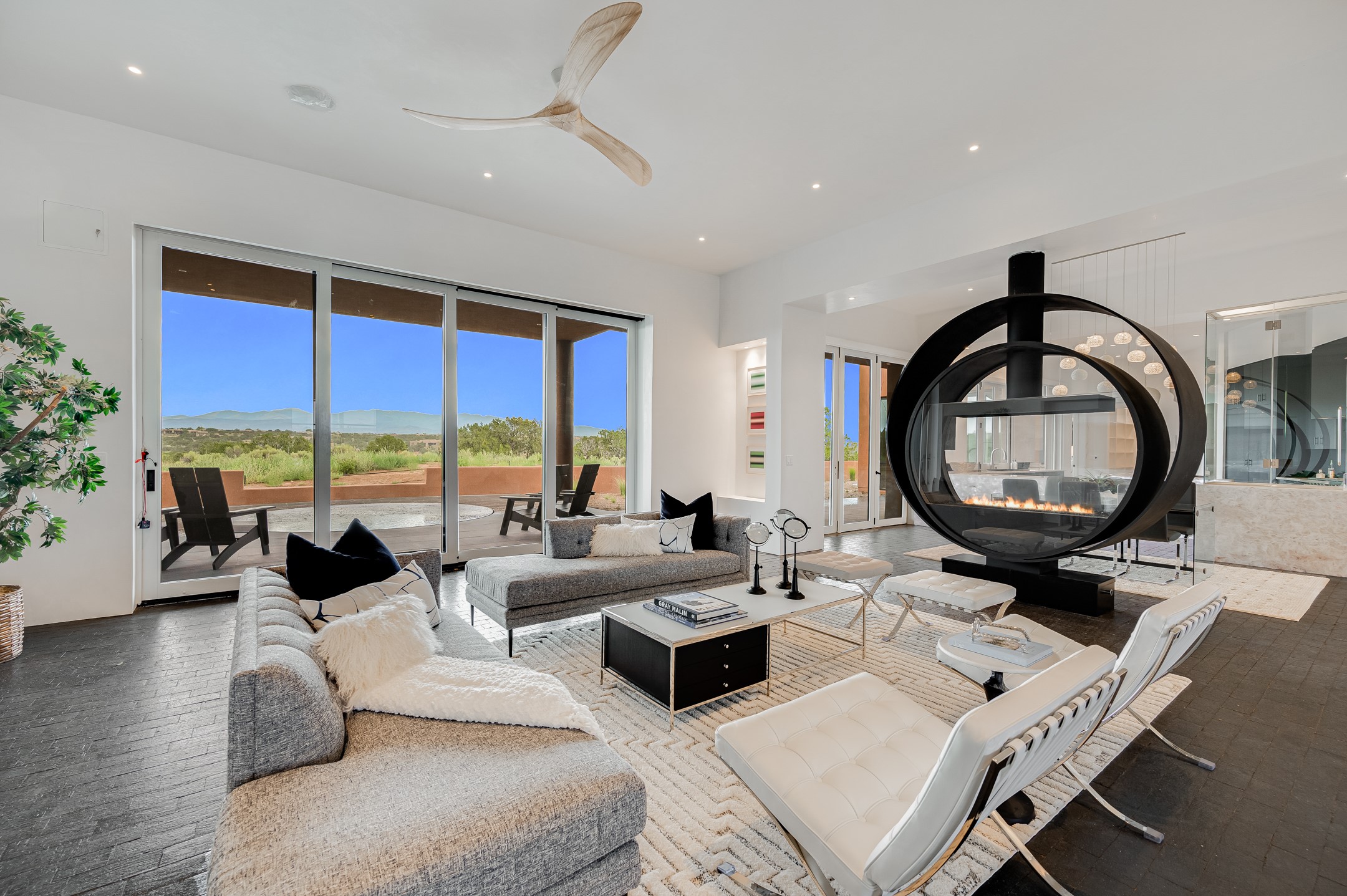 Price Improvement! Casa Tranquila an exquisite Contemporary Pueblo built by Native Son Builders in the gated community of Las Campanas. With over 4200 square feet of indoor living space paired with over 1600 square feet of perfect outdoor living including covered portals, kiva fireplace and a 12-14 person infinity spa. The floor plan generously flows from room to room with unobstructed views of the Sangre de Cristo mountains at every turn. Entertain with ease in the open yet intimate great room with a custom gas fireplace and finishes that elevate the mood for all to enjoy. Specialty brick floors and expansive motorized sliding walls seamlessly connect for outdoor/indoor living. The impressive porte-cochere welcomes your guests with grandeur. Attached casita provides privacy and flexibility for guests with a lovely kitchenette, living space and private portal with Kiva fireplace. Interior finishes have been carefully curated by a design team that blends form and function and walls that accommodate the most discerning art collector. A bespoke kitchen to delight any chef, accompanied with a custom refrigerated wine rack, Quartzite back lit countertops, Wolf appliances, Subzero refrigerator/freezer, two Asko dishwashers, plus a walk in pantry. A large mud room-laundry area is off the 3 car garage featuring elegant Envy garage doors with glass panels. This stunning home adds ease and comfort to your day to day living. Las Campanas offers many amenities: 2 Jack Nicklaus golf courses, clubhouse, restaurants, indoor/outdoor pools, spa, fitness center, racquet sports, equestrian center and 24 hour security plus EMT services. Membership is optional and can be purchased separately. Don't miss seeing this Santa Fe modern masterpiece!