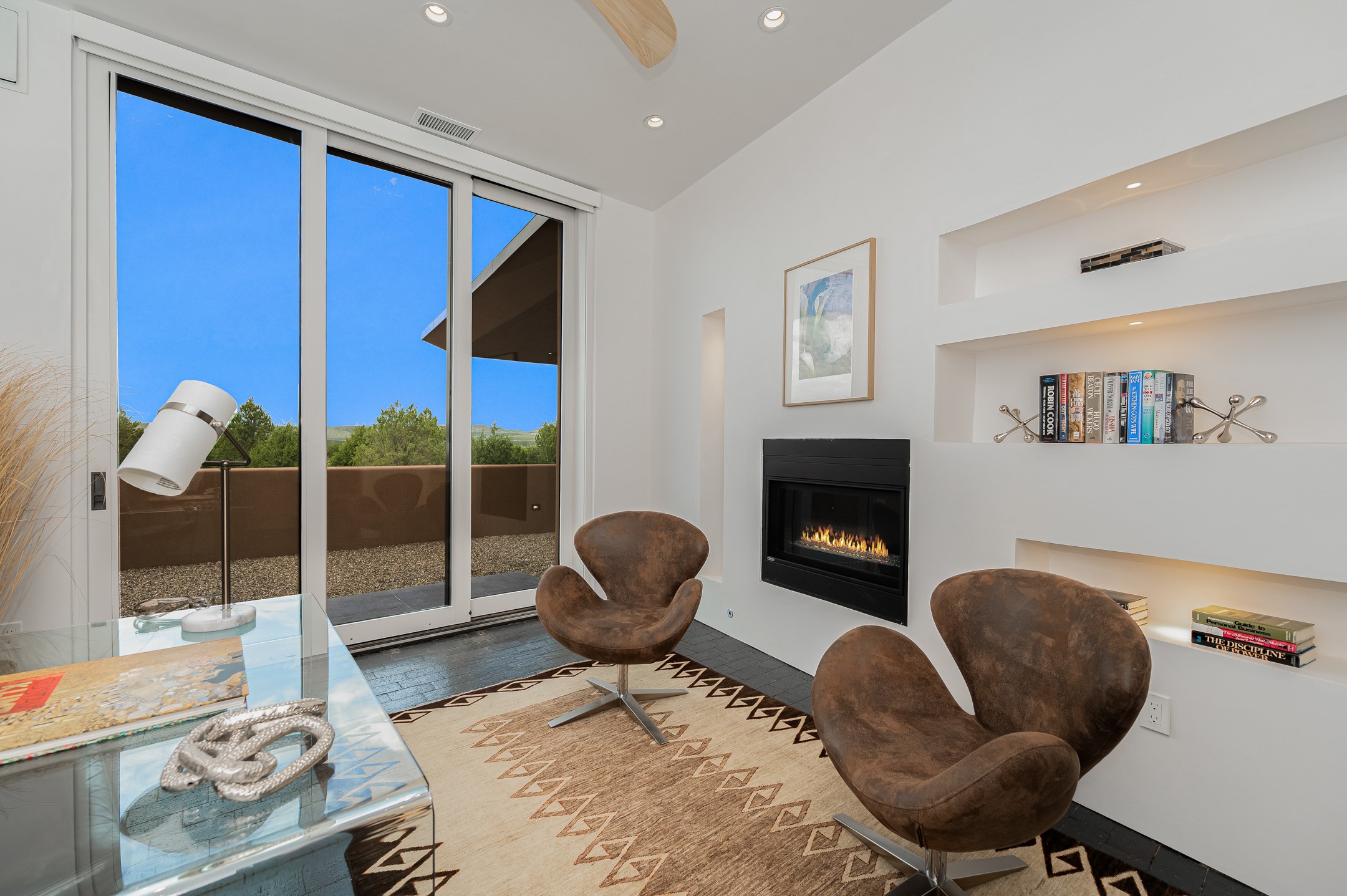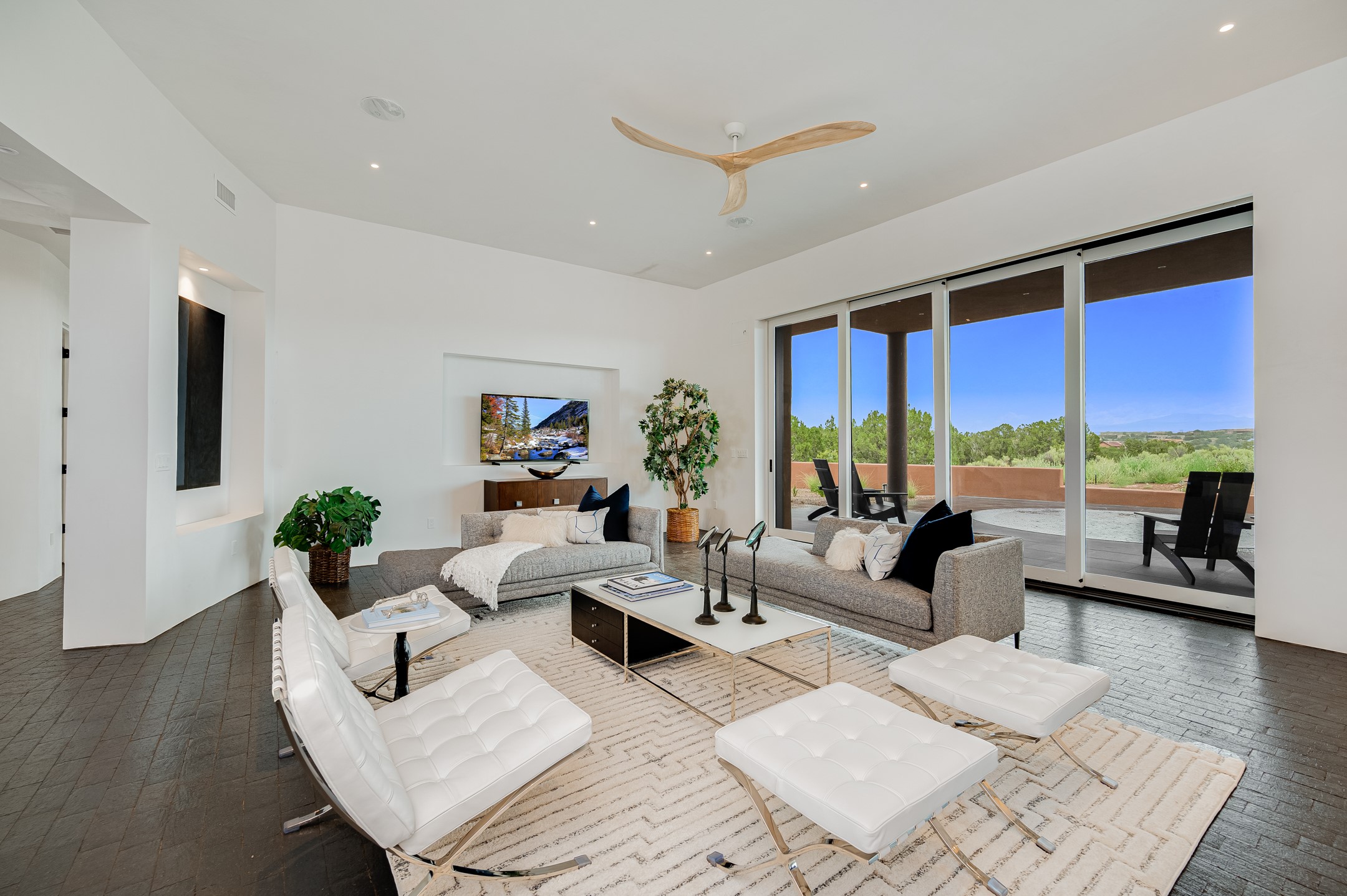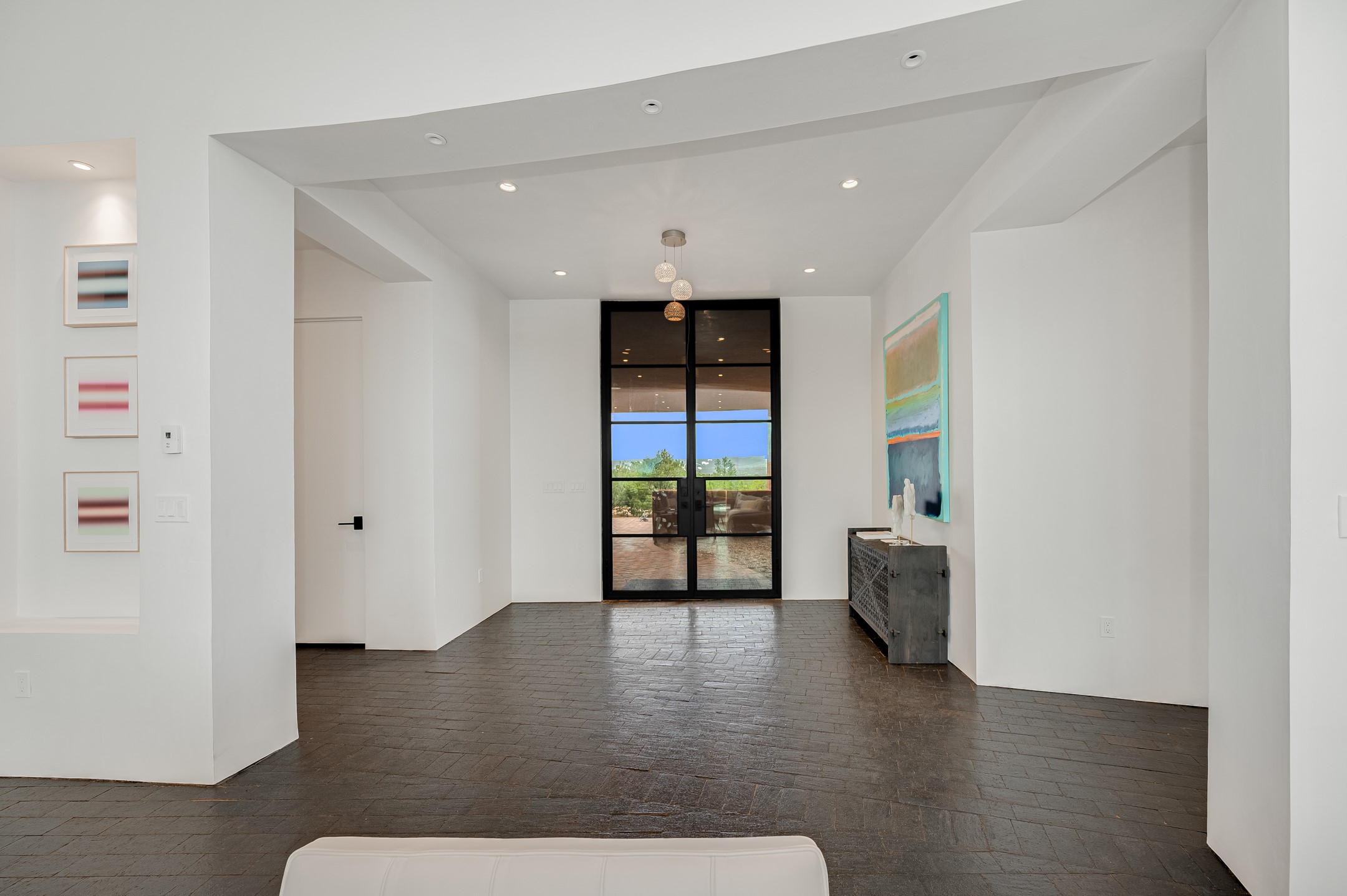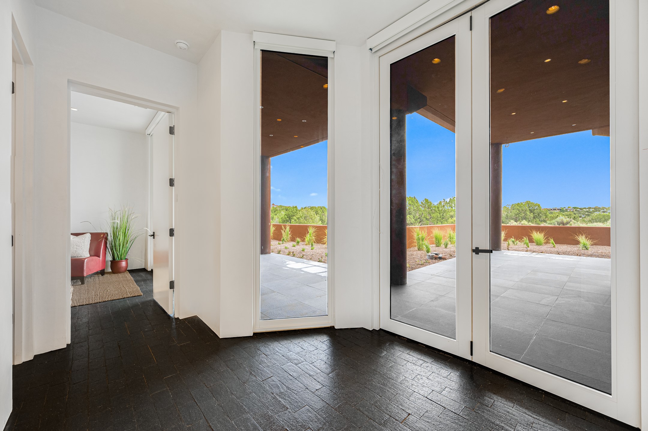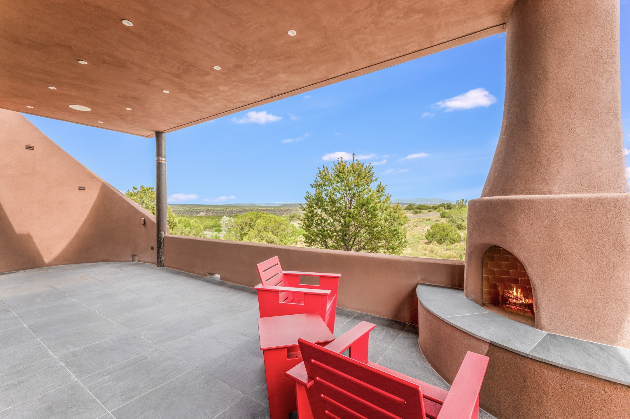 Price Improvement! Casa Tranquila an exquisite Contemporary Pueblo built by Native Son Builders in the gated community of Las Campanas. With over 4200 square feet of indoor living space paired with over 1600 square feet of perfect outdoor living including covered portals, kiva fireplace and a 12-14 person infinity spa. The floor plan generously flows from room to room with unobstructed views of the Sangre de Cristo mountains at every turn. Entertain with ease in the open yet intimate great room with a custom gas fireplace and finishes that elevate the mood for all to enjoy. Specialty brick floors and expansive motorized sliding walls seamlessly connect for outdoor/indoor living. The impressive porte-cochere welcomes your guests with grandeur. Attached casita provides privacy and flexibility for guests with a lovely kitchenette, living space and private portal with Kiva fireplace. Interior finishes have been carefully curated by a design team that blends form and function and walls that accommodate the most discerning art collector. A bespoke kitchen to delight any chef, accompanied with a custom refrigerated wine rack, Quartzite back lit countertops, Wolf appliances, Subzero refrigerator/freezer, two Asko dishwashers, plus a walk in pantry. A large mud room-laundry area is off the 3 car garage featuring elegant Envy garage doors with glass panels. This stunning home adds ease and comfort to your day to day living. Las Campanas offers many amenities: 2 Jack Nicklaus golf courses, clubhouse, restaurants, indoor/outdoor pools, spa, fitness center, racquet sports, equestrian center and 24 hour security plus EMT services. Membership is optional and can be purchased separately. Don't miss seeing this Santa Fe modern masterpiece!