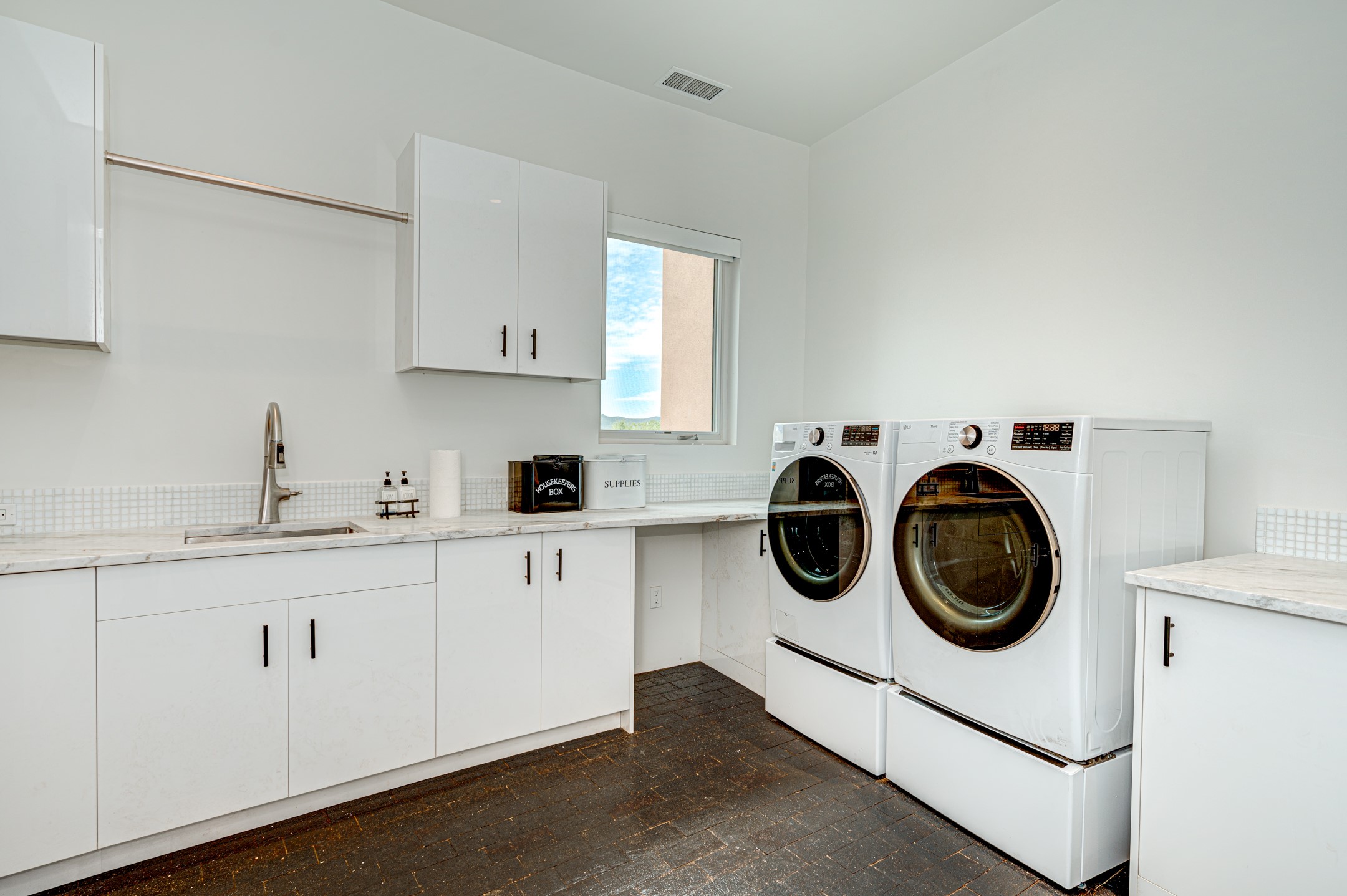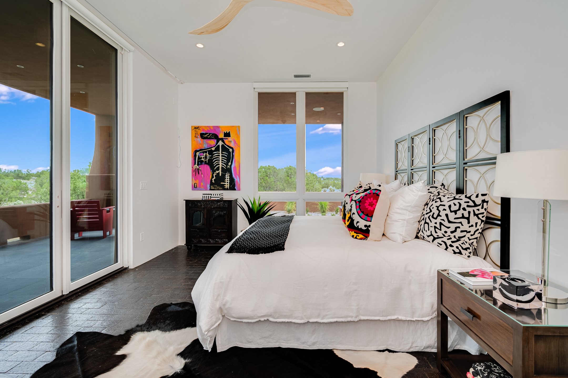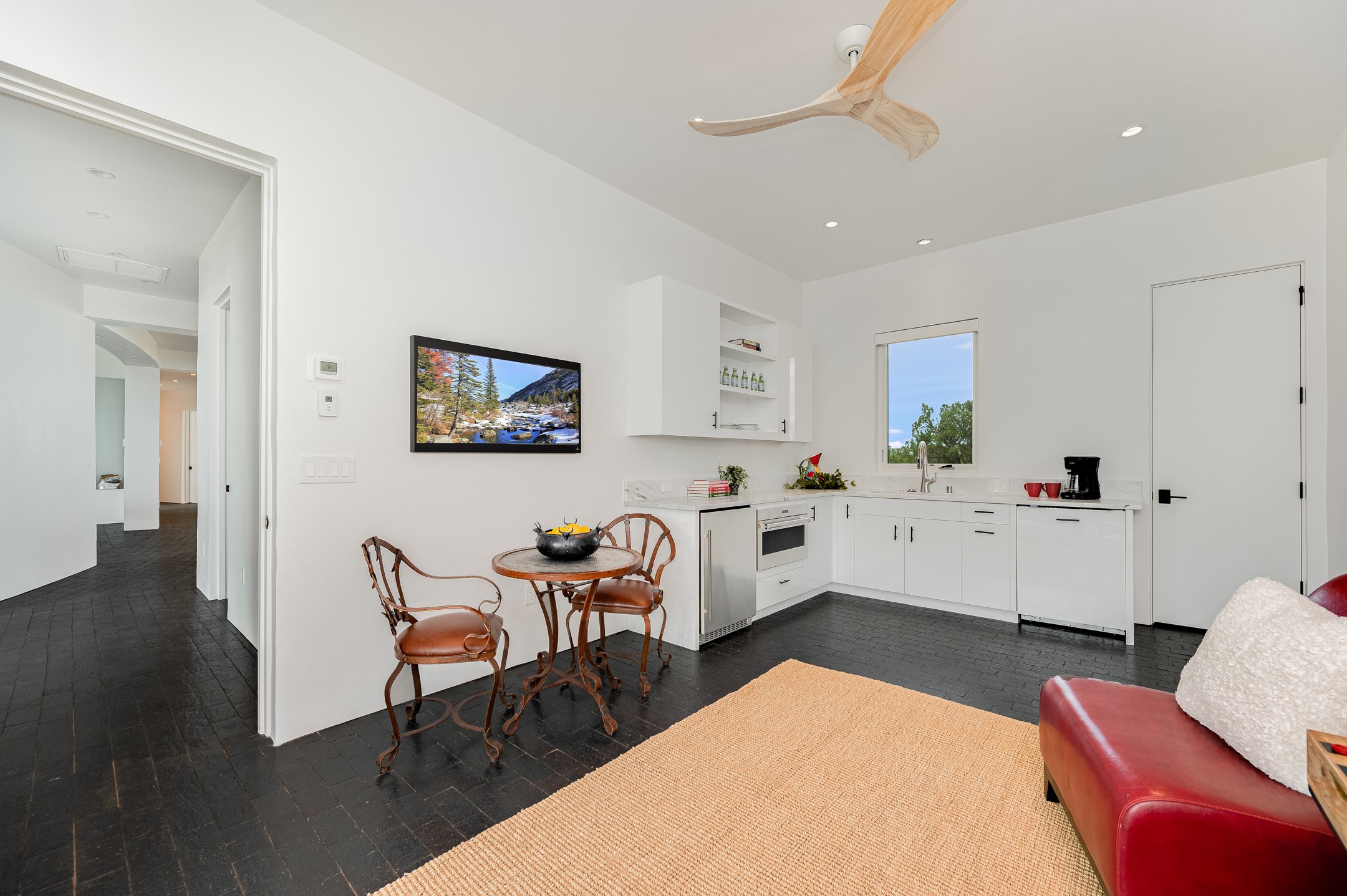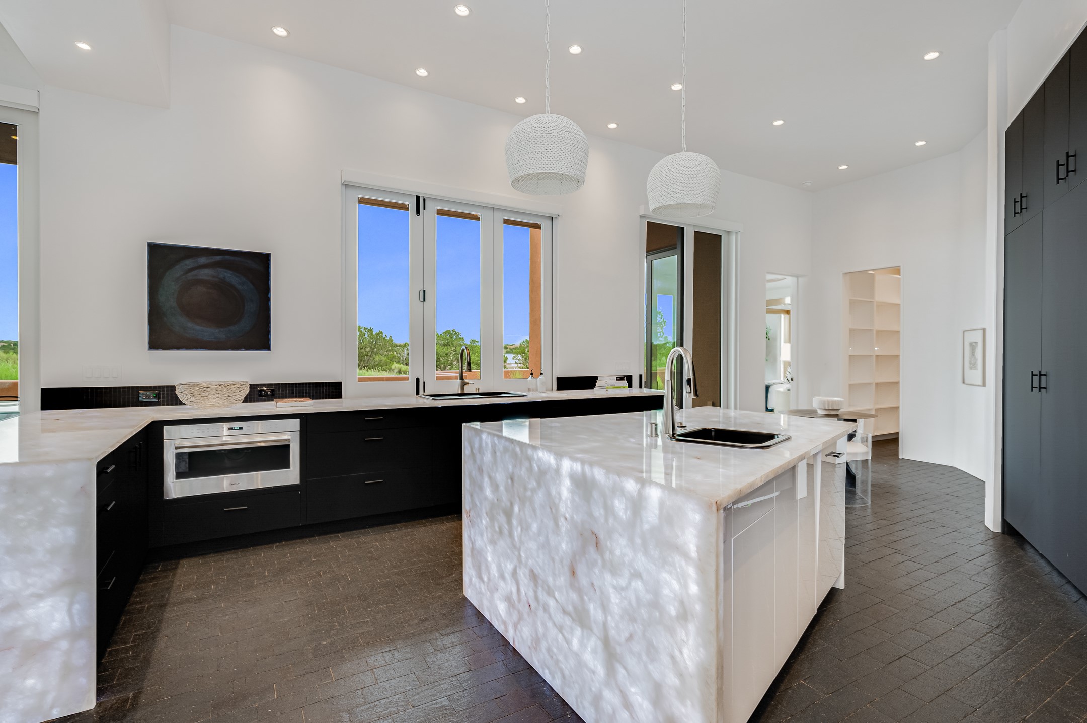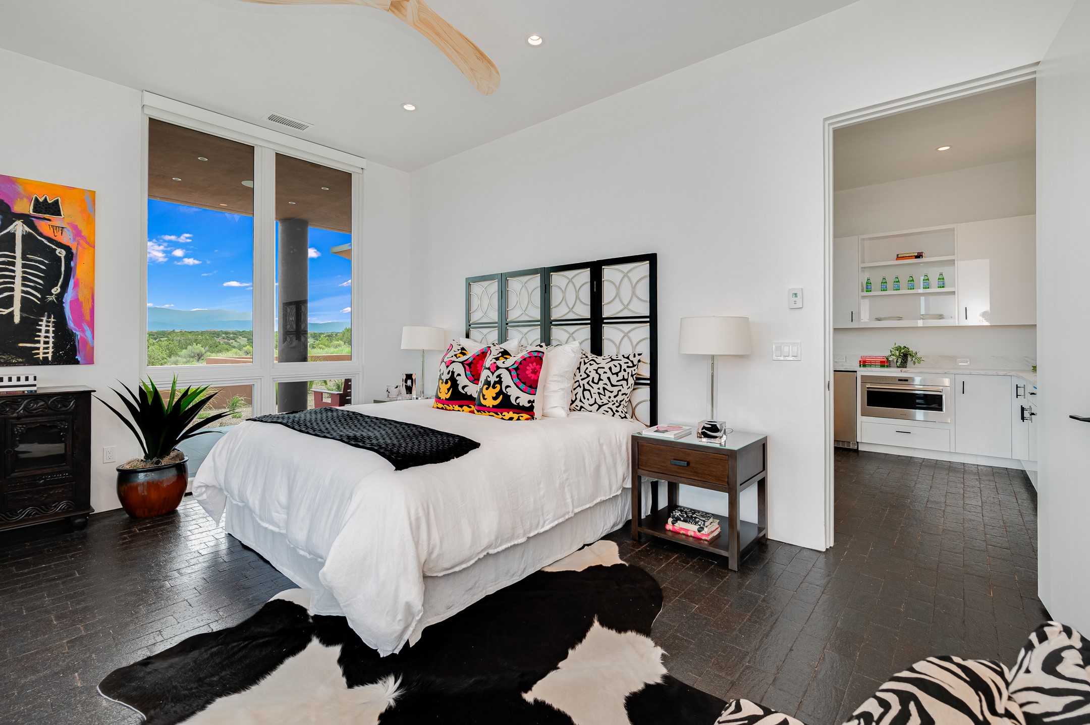 Price Improvement! Casa Tranquila an exquisite Contemporary Pueblo built by Native Son Builders in the gated community of Las Campanas. With over 4200 square feet of indoor living space paired with over 1600 square feet of perfect outdoor living including covered portals, kiva fireplace and a 12-14 person infinity spa. The floor plan generously flows from room to room with unobstructed views of the Sangre de Cristo mountains at every turn. Entertain with ease in the open yet intimate great room with a custom gas fireplace and finishes that elevate the mood for all to enjoy. Specialty brick floors and expansive motorized sliding walls seamlessly connect for outdoor/indoor living. The impressive porte-cochere welcomes your guests with grandeur. Attached casita provides privacy and flexibility for guests with a lovely kitchenette, living space and private portal with Kiva fireplace. Interior finishes have been carefully curated by a design team that blends form and function and walls that accommodate the most discerning art collector. A bespoke kitchen to delight any chef, accompanied with a custom refrigerated wine rack, Quartzite back lit countertops, Wolf appliances, Subzero refrigerator/freezer, two Asko dishwashers, plus a walk in pantry. A large mud room-laundry area is off the 3 car garage featuring elegant Envy garage doors with glass panels. This stunning home adds ease and comfort to your day to day living. Las Campanas offers many amenities: 2 Jack Nicklaus golf courses, clubhouse, restaurants, indoor/outdoor pools, spa, fitness center, racquet sports, equestrian center and 24 hour security plus EMT services. Membership is optional and can be purchased separately. Don't miss seeing this Santa Fe modern masterpiece!
