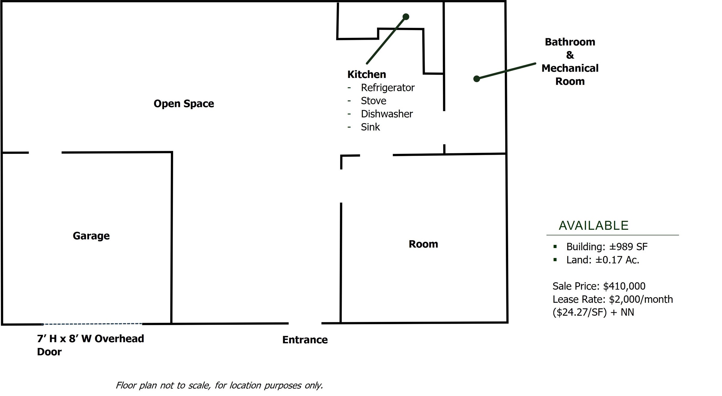 AVAILABLE: Building: 989 SF, Land: 0.17Ac. | SALE PRICE: $410,000 | LEASE RATE: $2,000/Month ($24.27/SF) + NN | ZONING: I-2 | General Industrial | HIGHLIGHTS: A hard-to-find zoning property, Centrally located, Accessible by major roads, Lots of natural lights, 7' H x 8' W overhead door, 10' ceiling height, Possible uses: Warehousing, Storage facility, Manufacturing, Auto repair/Body shop, Commercial kitchen, Light or heavy industrial uses