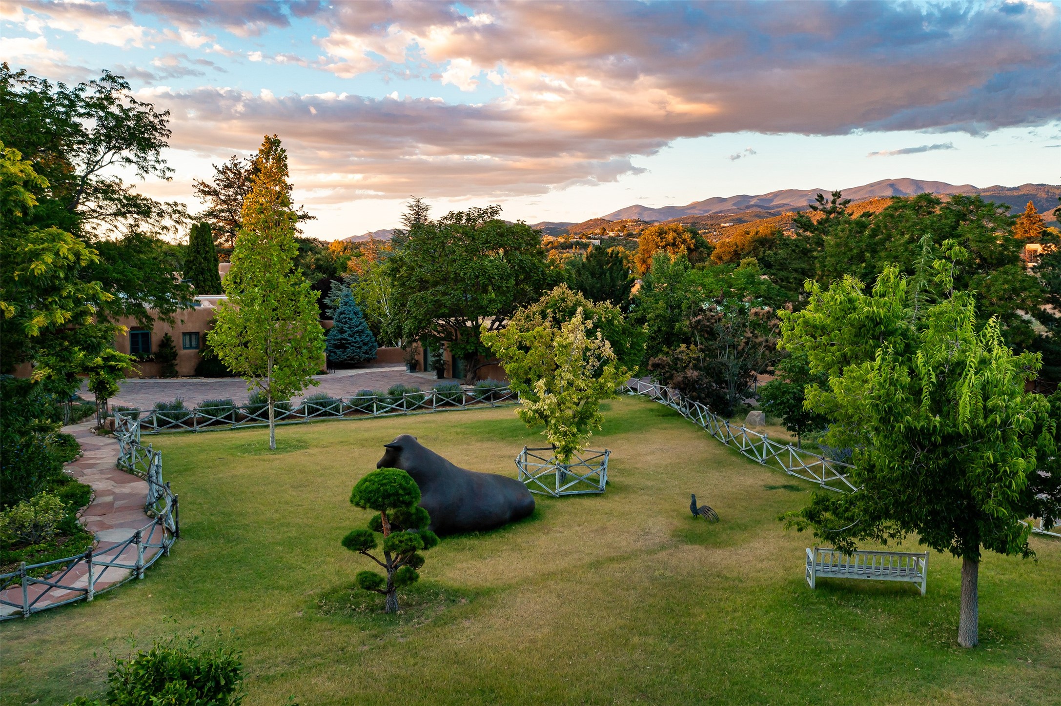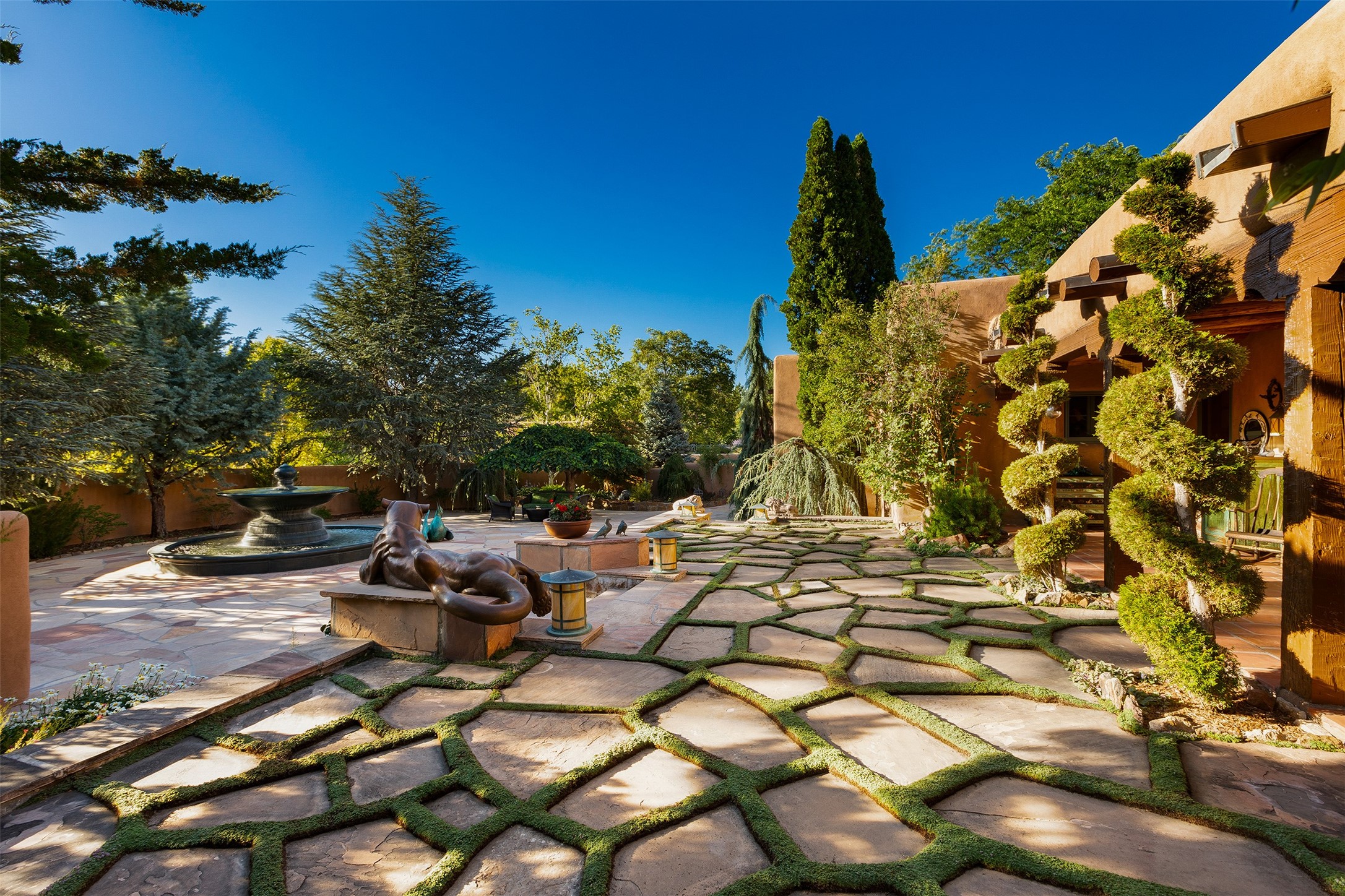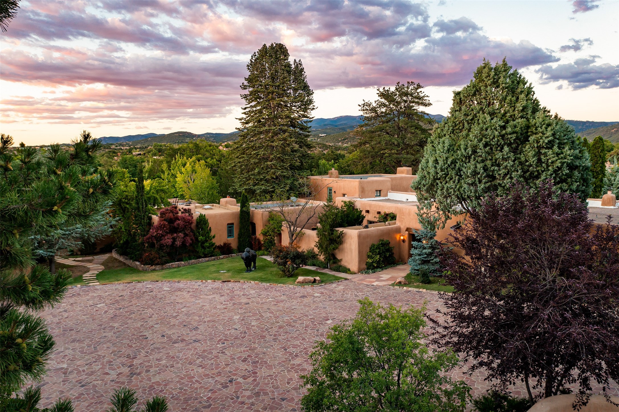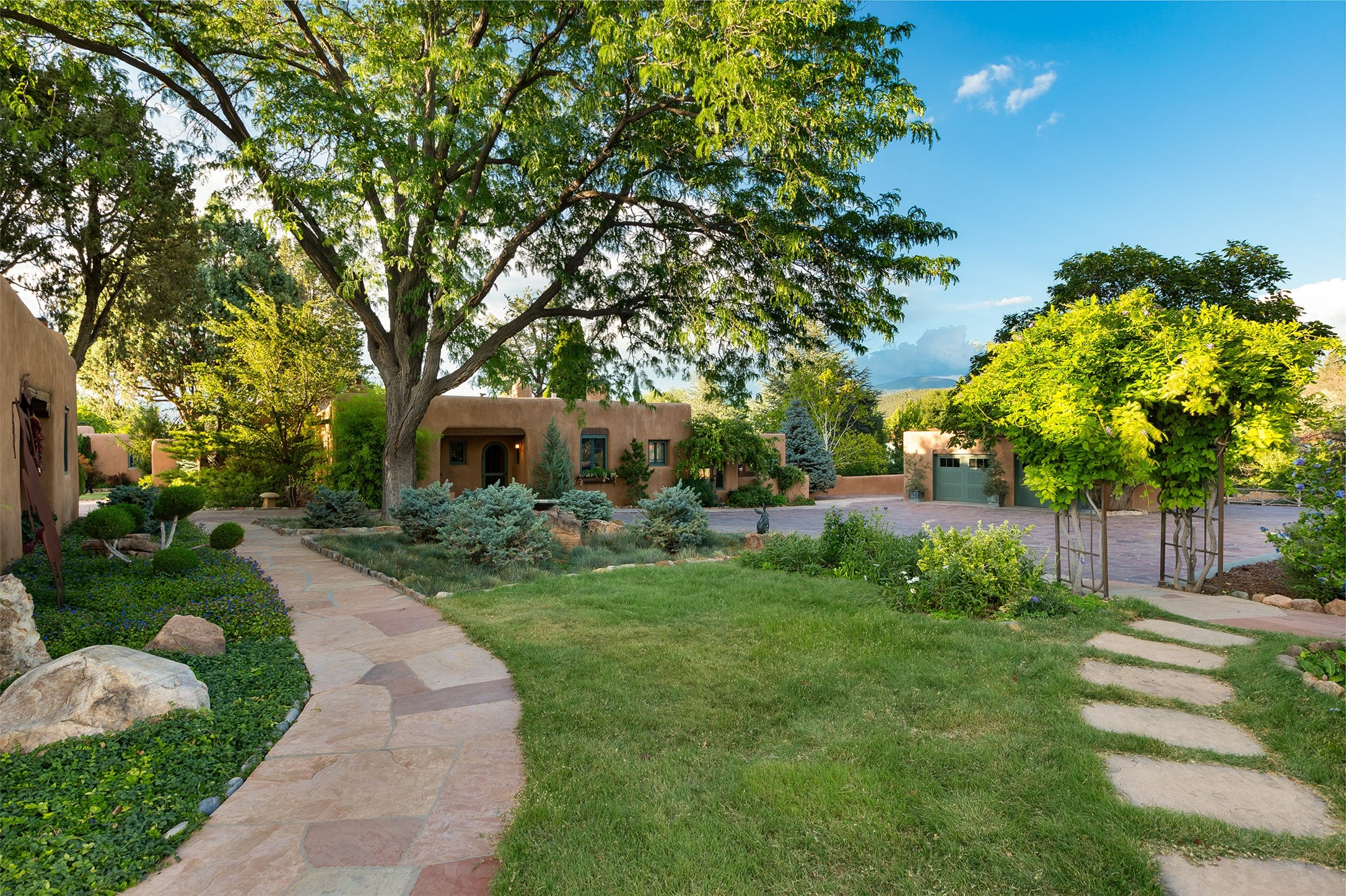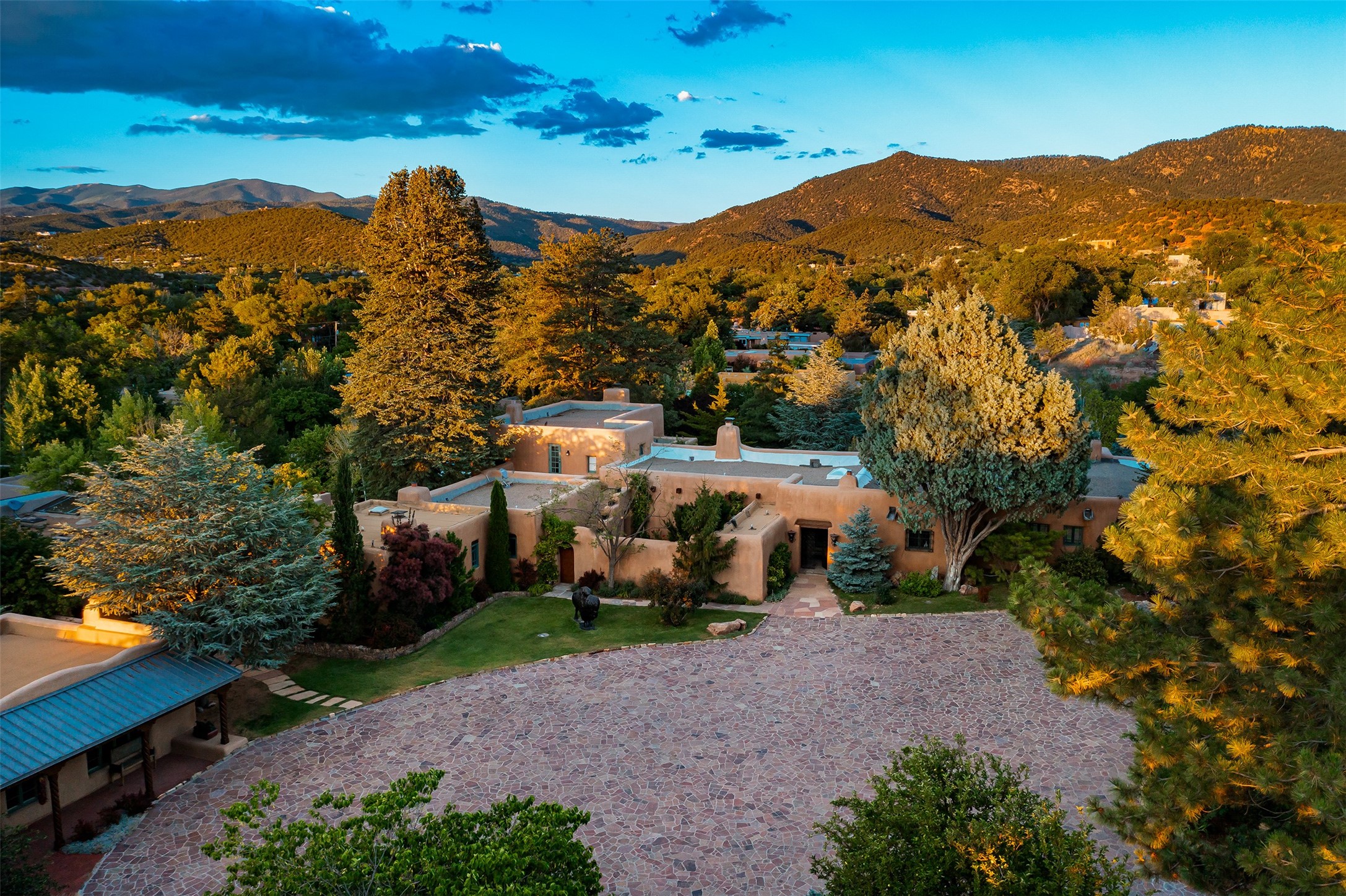 Historic Compound being offered for the first time in 40 years!Strolling up the historic Camino del Monte Sol in the heart of Santa Fe, you come upon the entrance of a quintessential example of sophisticated Santa Fe style, a historic versatile compound surrounded by magnificent grounds, trees, and stone walls. As you enter the gates and leave the world behind... you step back in time and are embraced by the immediately tranquil privacy of a secret oasis of gardens and meadows with views of the Sangre de Cristo Mountains. The multiple dwelling compound is the finest example of Pueblo style Spanish Colonial architecture in Santa Fe, built in 1918 and fully restored with original doors, windows, lintels, vigas, and extraordinary coved and carved ceilings, with spacious volume throughout. The serene portal with mature topiaries overlooks the elegant terrace and magical fountain. The charming gatehouse is a quiet, calm refuge enveloped in nature. The historic casitas are nestled between winding walkways, exploding with flowering gardens and a field of specimen trees. This unique estate was the epicenter of collaboration of Los Cinco Pintores and the Taos School Artists. Resting on 2.21 acres, the expansive estate is zoned R5, offering a multitude of exceptional development opportunities to elevate the property. It is, in every sense, incomparable.