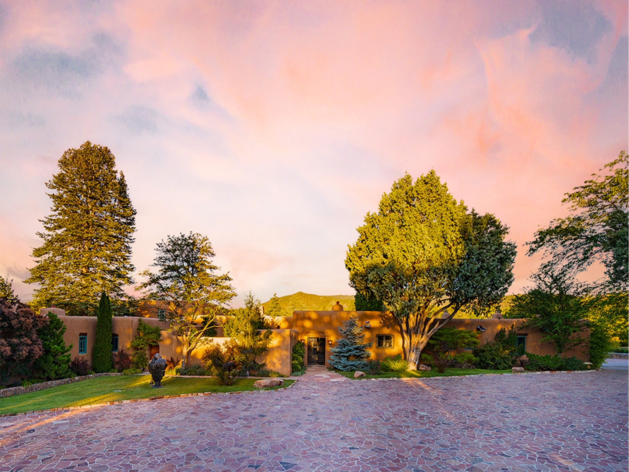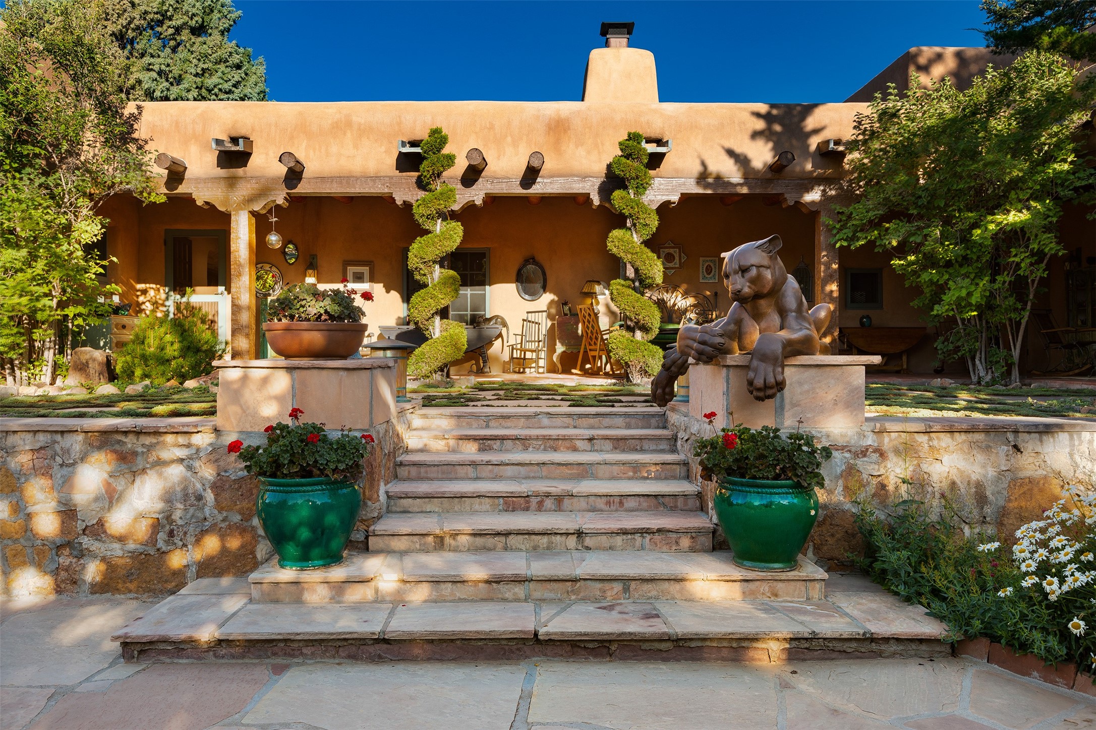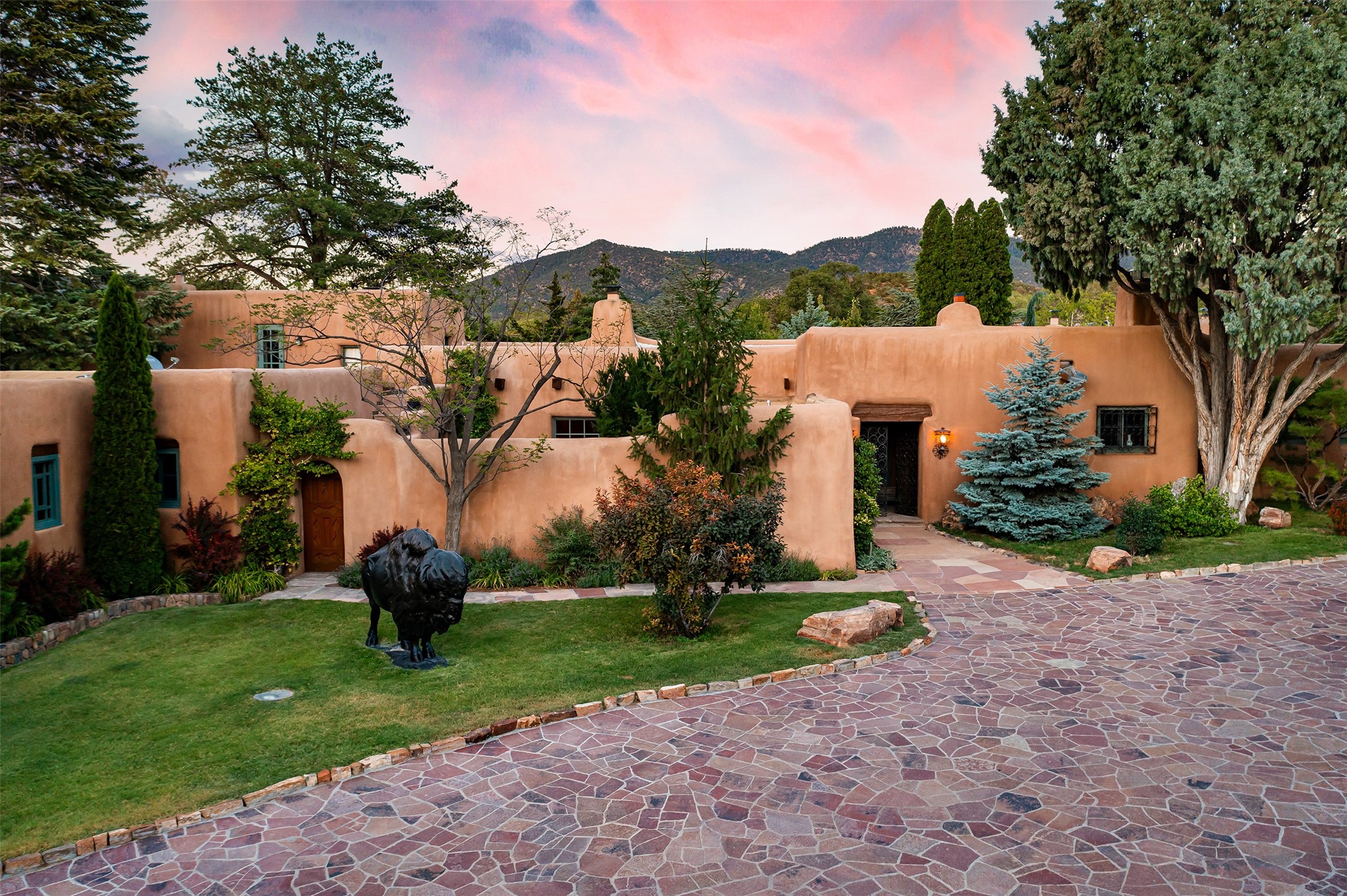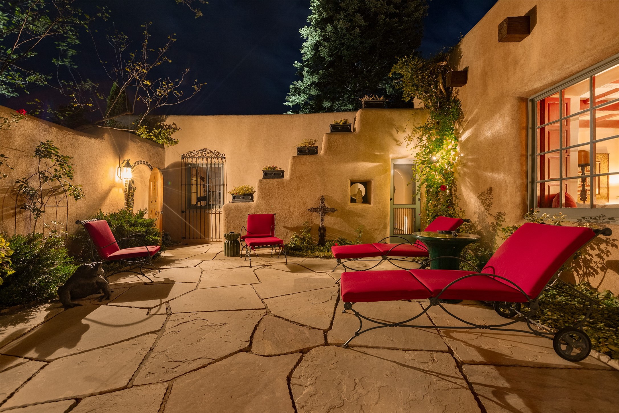 Historic Compound being offered for the first time in 40 years!Strolling up the historic Camino del Monte Sol in the heart of Santa Fe, you come upon the entrance of a quintessential example of sophisticated Santa Fe style, a historic versatile compound surrounded by magnificent grounds, trees, and stone walls. As you enter the gates and leave the world behind... you step back in time and are embraced by the immediately tranquil privacy of a secret oasis of gardens and meadows with views of the Sangre de Cristo Mountains. The multiple dwelling compound is the finest example of Pueblo style Spanish Colonial architecture in Santa Fe, built in 1918 and fully restored with original doors, windows, lintels, vigas, and extraordinary coved and carved ceilings, with spacious volume throughout. The serene portal with mature topiaries overlooks the elegant terrace and magical fountain. The charming gatehouse is a quiet, calm refuge enveloped in nature. The historic casitas are nestled between winding walkways, exploding with flowering gardens and a field of specimen trees. This unique estate was the epicenter of collaboration of Los Cinco Pintores and the Taos School Artists. Resting on 2.21 acres, the expansive estate is zoned R5, offering a multitude of exceptional development opportunities to elevate the property. It is, in every sense, incomparable.