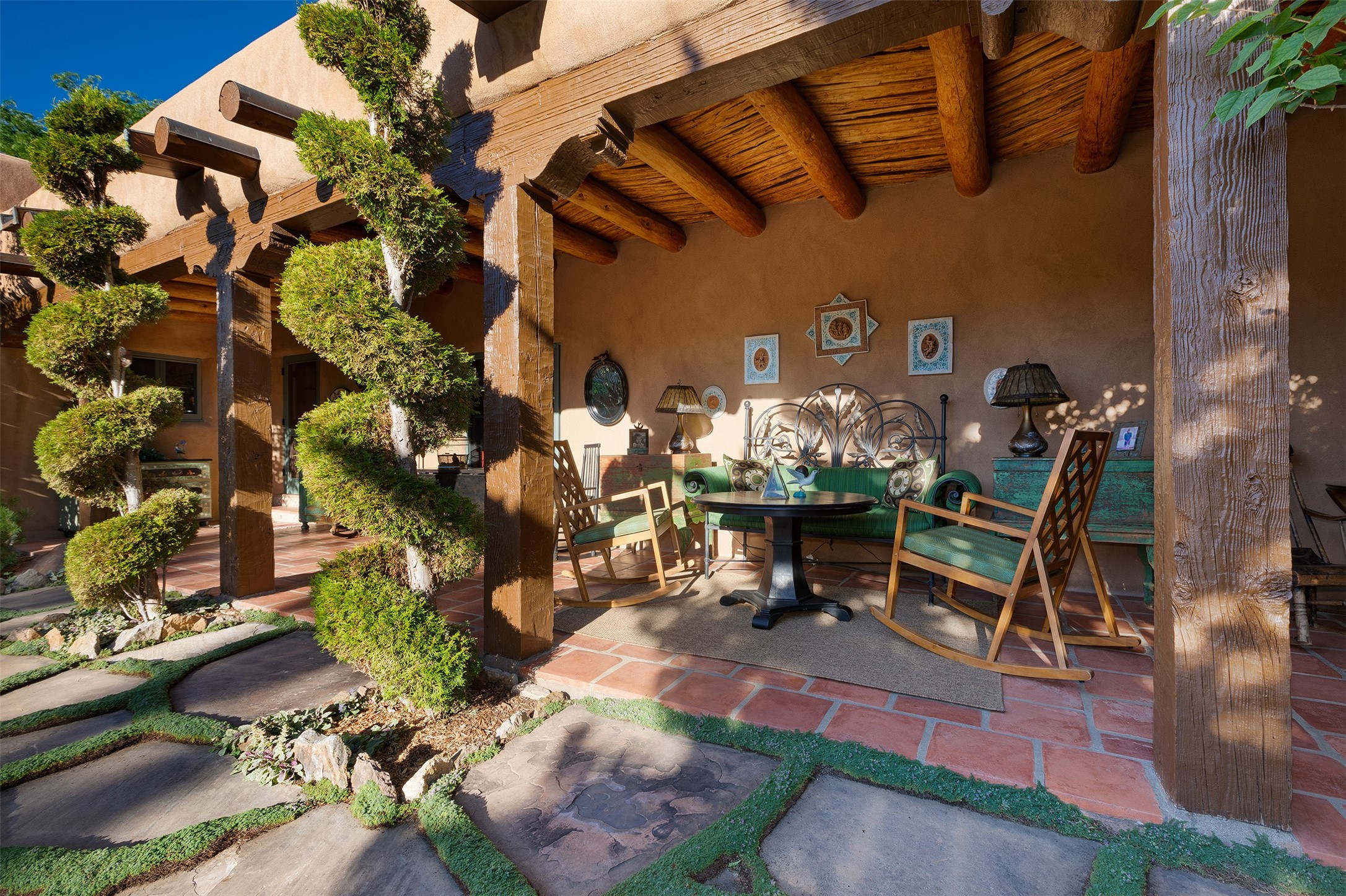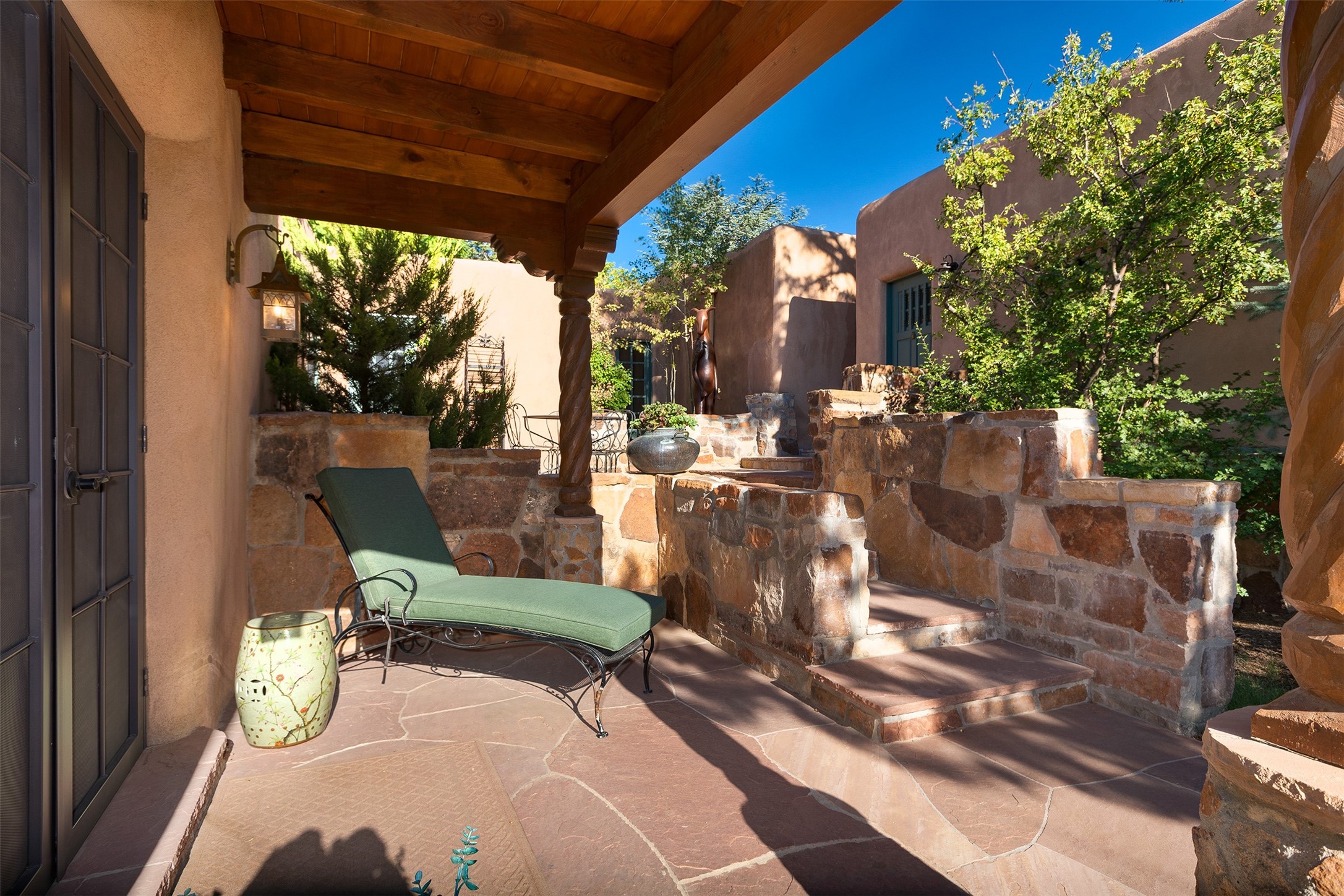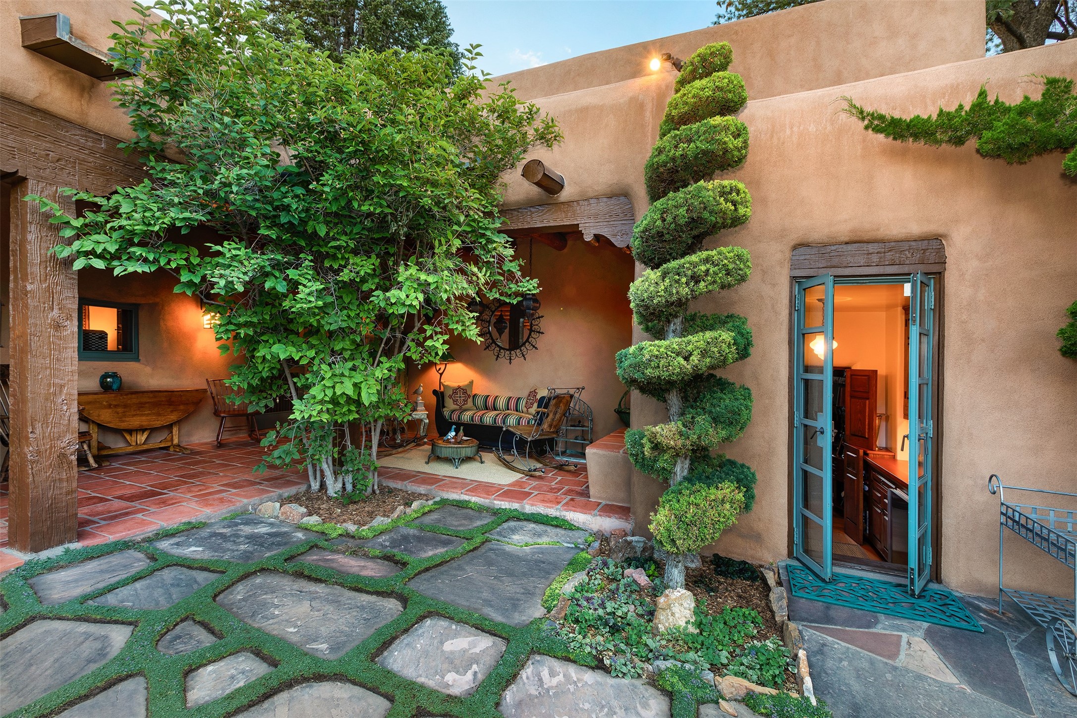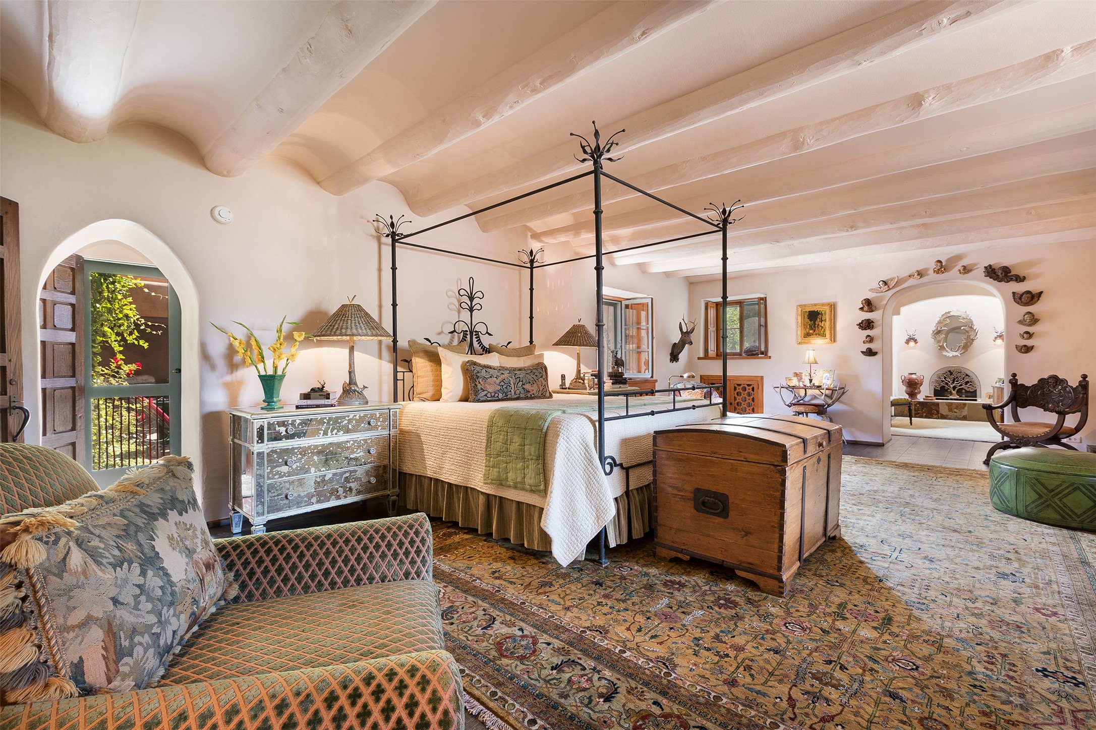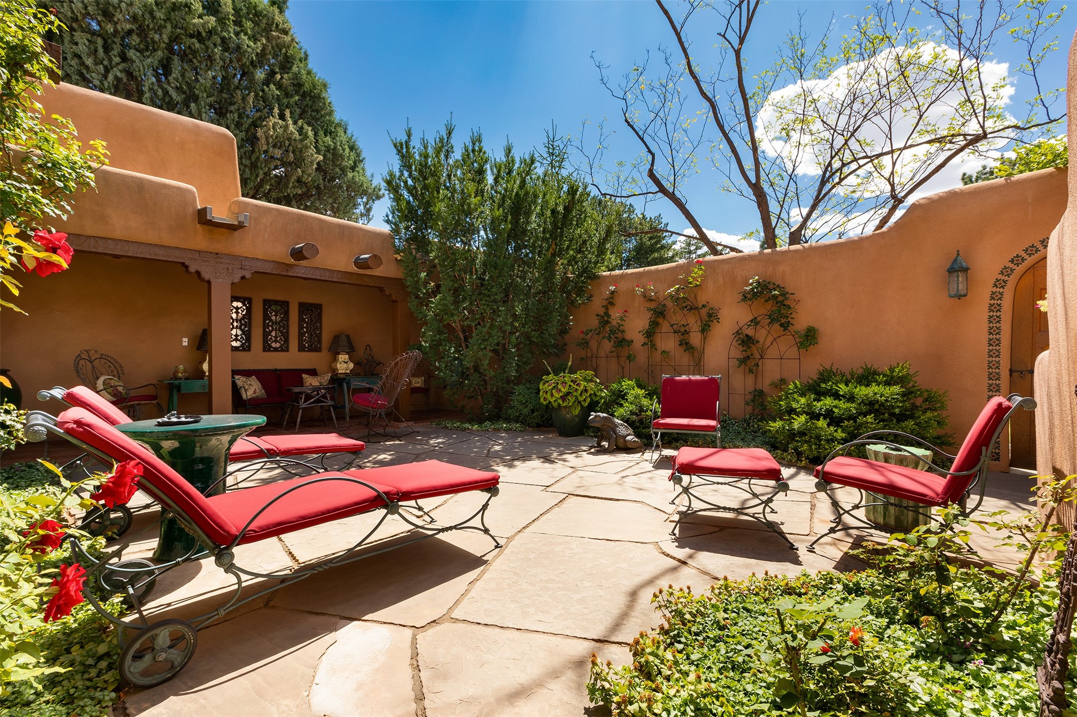 Historic Compound being offered for the first time in 40 years!Strolling up the historic Camino del Monte Sol in the heart of Santa Fe, you come upon the entrance of a quintessential example of sophisticated Santa Fe style, a historic versatile compound surrounded by magnificent grounds, trees, and stone walls. As you enter the gates and leave the world behind... you step back in time and are embraced by the immediately tranquil privacy of a secret oasis of gardens and meadows with views of the Sangre de Cristo Mountains. The multiple dwelling compound is the finest example of Pueblo style Spanish Colonial architecture in Santa Fe, built in 1918 and fully restored with original doors, windows, lintels, vigas, and extraordinary coved and carved ceilings, with spacious volume throughout. The serene portal with mature topiaries overlooks the elegant terrace and magical fountain. The charming gatehouse is a quiet, calm refuge enveloped in nature. The historic casitas are nestled between winding walkways, exploding with flowering gardens and a field of specimen trees. This unique estate was the epicenter of collaboration of Los Cinco Pintores and the Taos School Artists. Resting on 2.21 acres, the expansive estate is zoned R5, offering a multitude of exceptional development opportunities to elevate the property. It is, in every sense, incomparable.