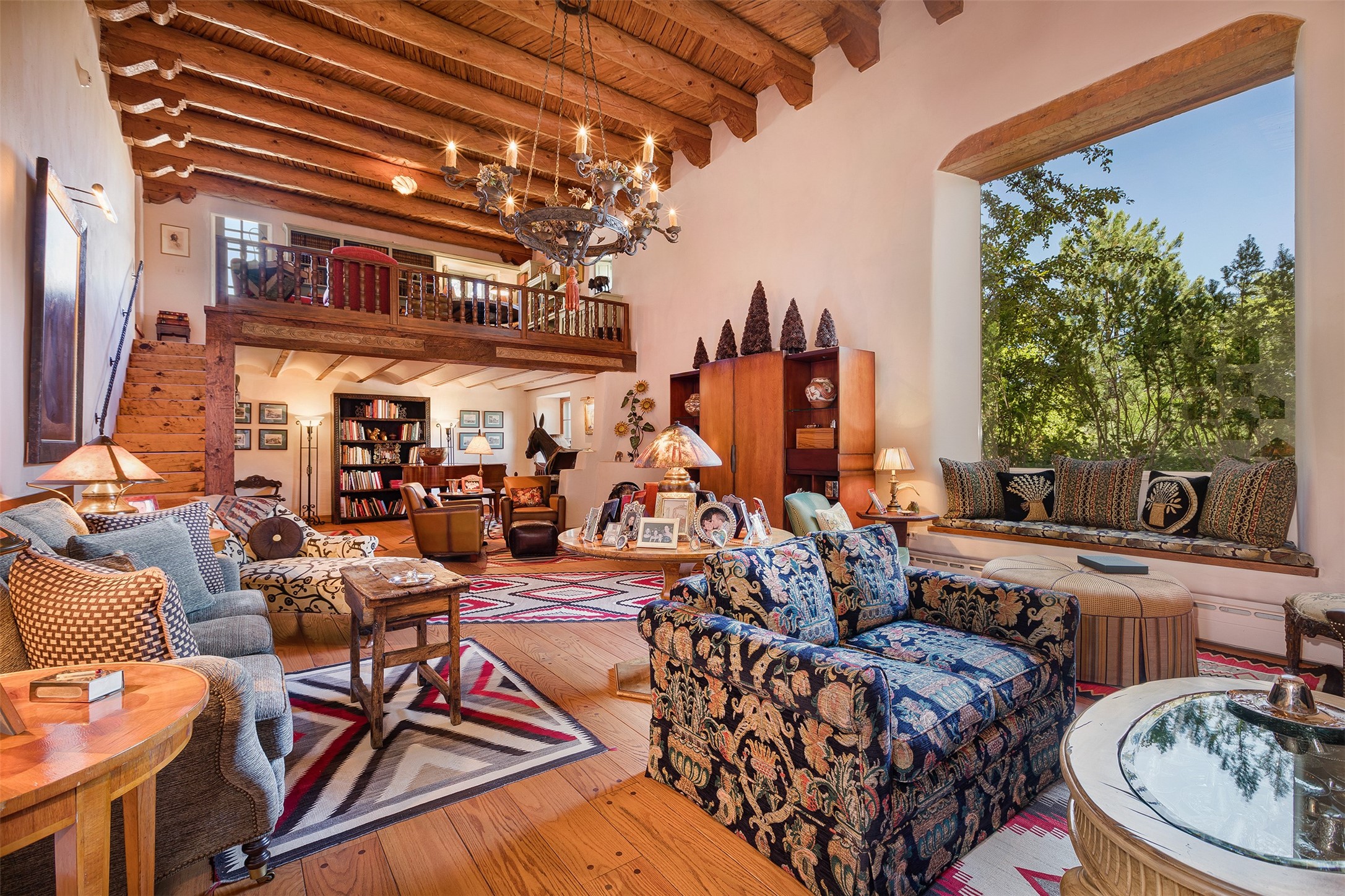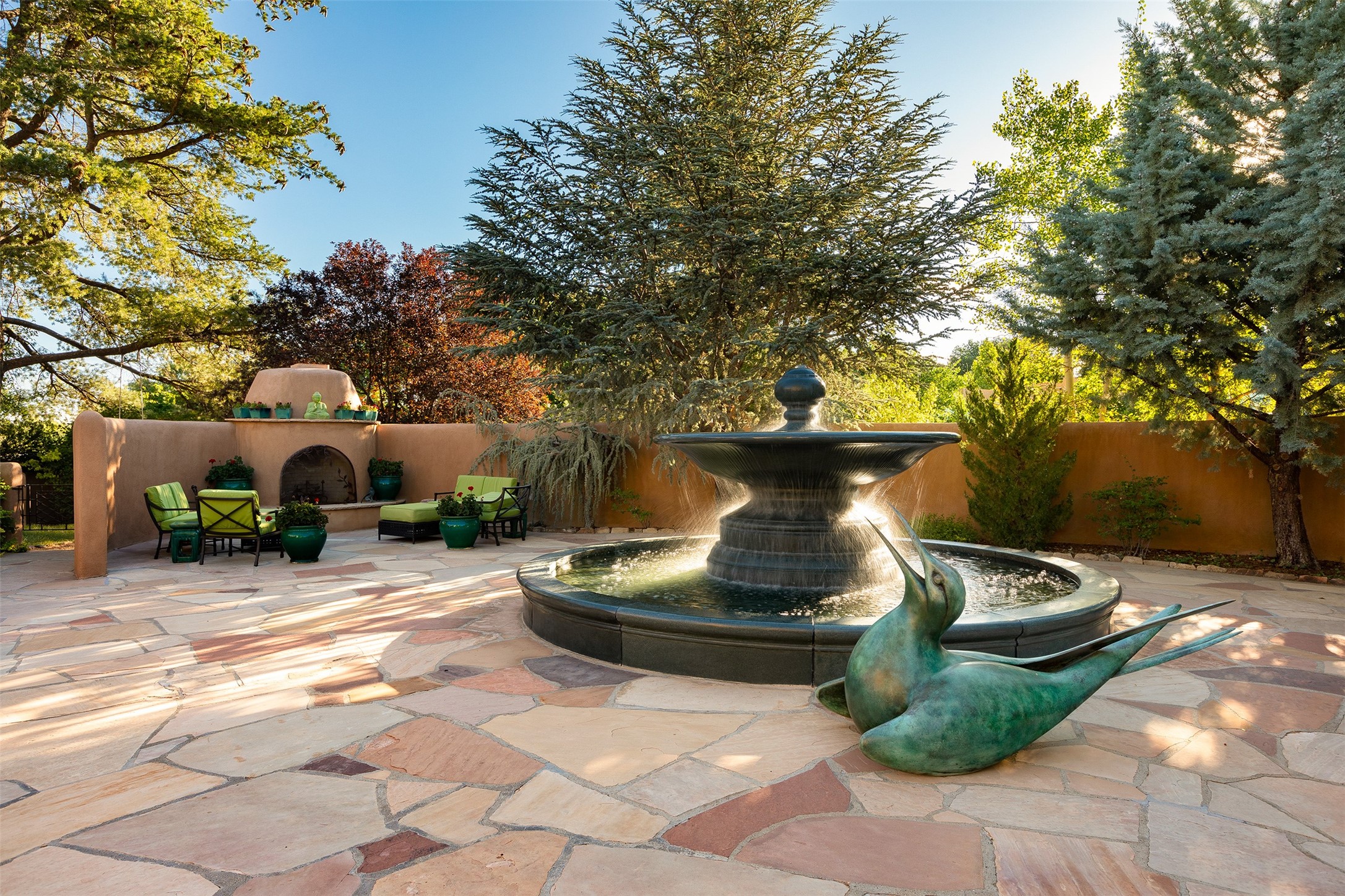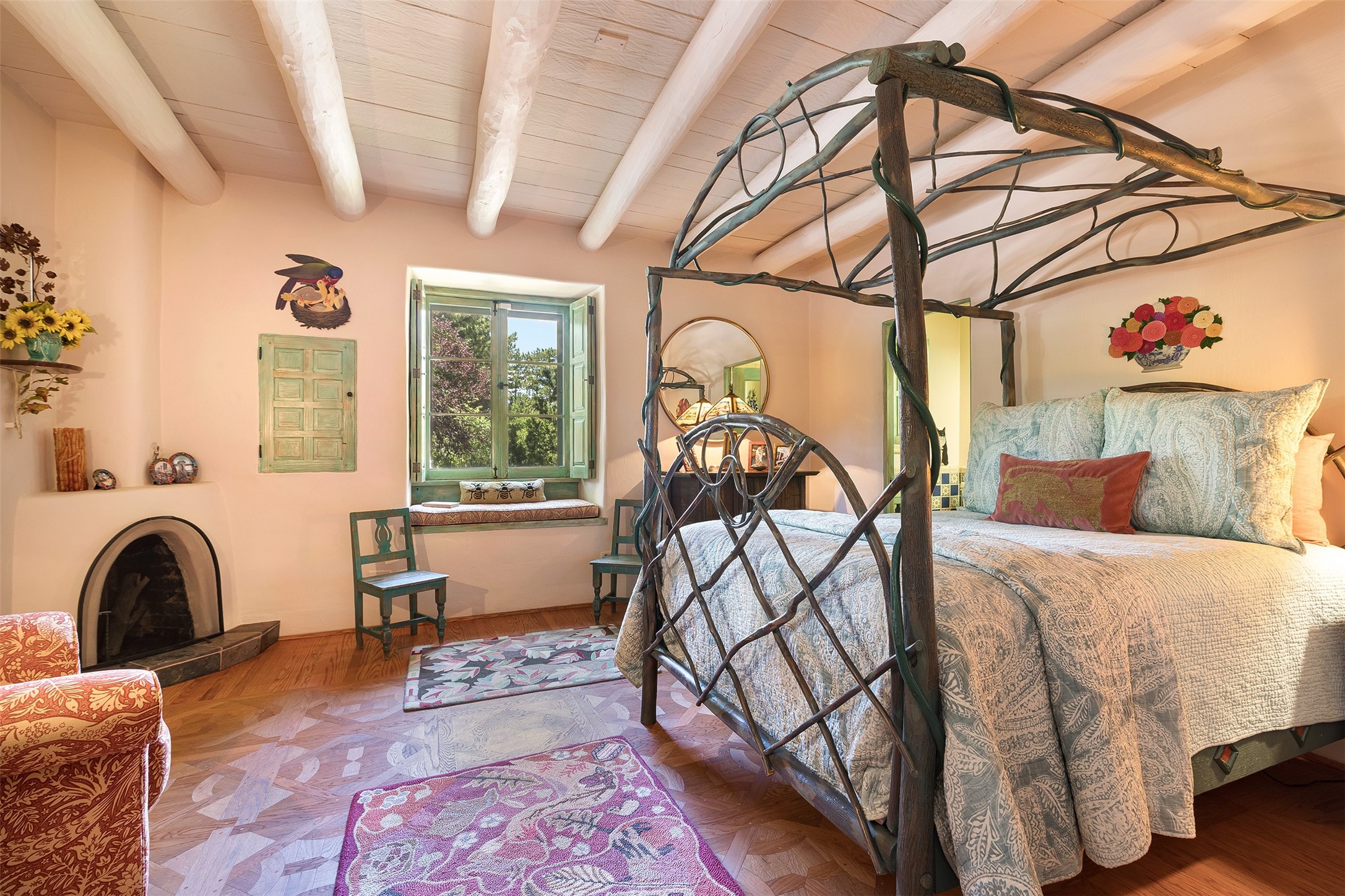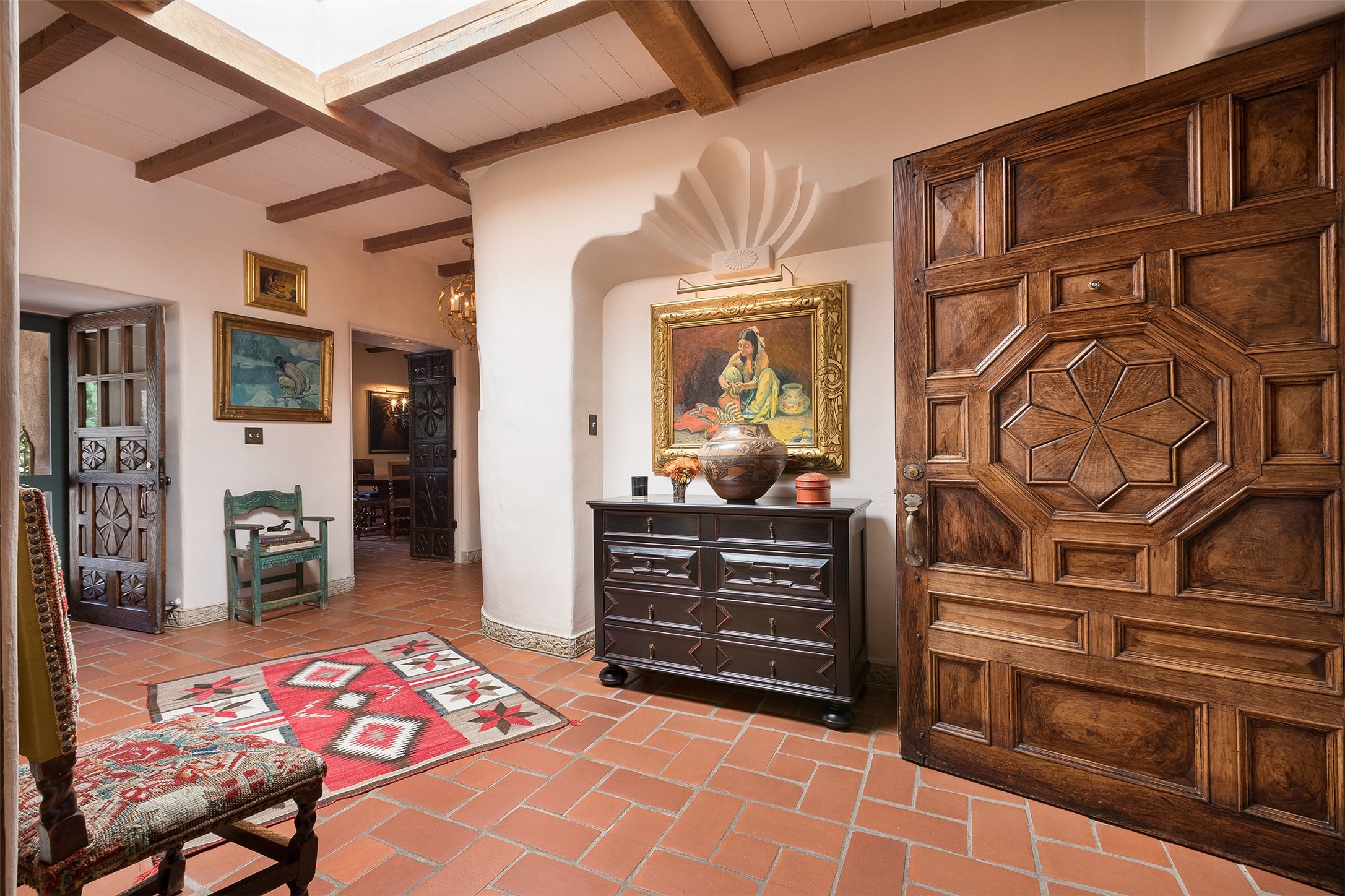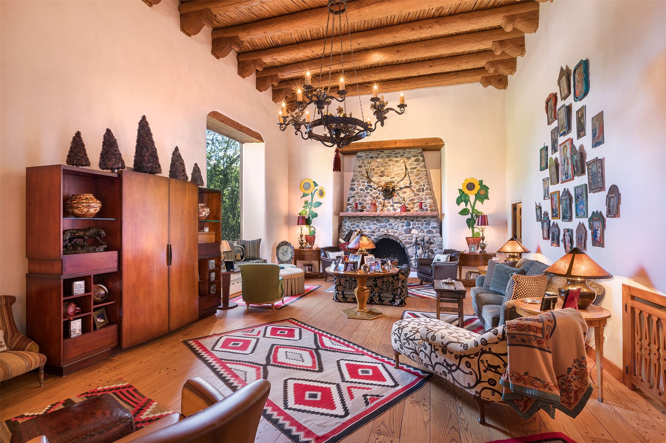 Historic Compound being offered for the first time in 40 years!Strolling up the historic Camino del Monte Sol in the heart of Santa Fe, you come upon the entrance of a quintessential example of sophisticated Santa Fe style, a historic versatile compound surrounded by magnificent grounds, trees, and stone walls. As you enter the gates and leave the world behind... you step back in time and are embraced by the immediately tranquil privacy of a secret oasis of gardens and meadows with views of the Sangre de Cristo Mountains. The multiple dwelling compound is the finest example of Pueblo style Spanish Colonial architecture in Santa Fe, built in 1918 and fully restored with original doors, windows, lintels, vigas, and extraordinary coved and carved ceilings, with spacious volume throughout. The serene portal with mature topiaries overlooks the elegant terrace and magical fountain. The charming gatehouse is a quiet, calm refuge enveloped in nature. The historic casitas are nestled between winding walkways, exploding with flowering gardens and a field of specimen trees. This unique estate was the epicenter of collaboration of Los Cinco Pintores and the Taos School Artists. Resting on 2.21 acres, the expansive estate is zoned R5, offering a multitude of exceptional development opportunities to elevate the property. It is, in every sense, incomparable.