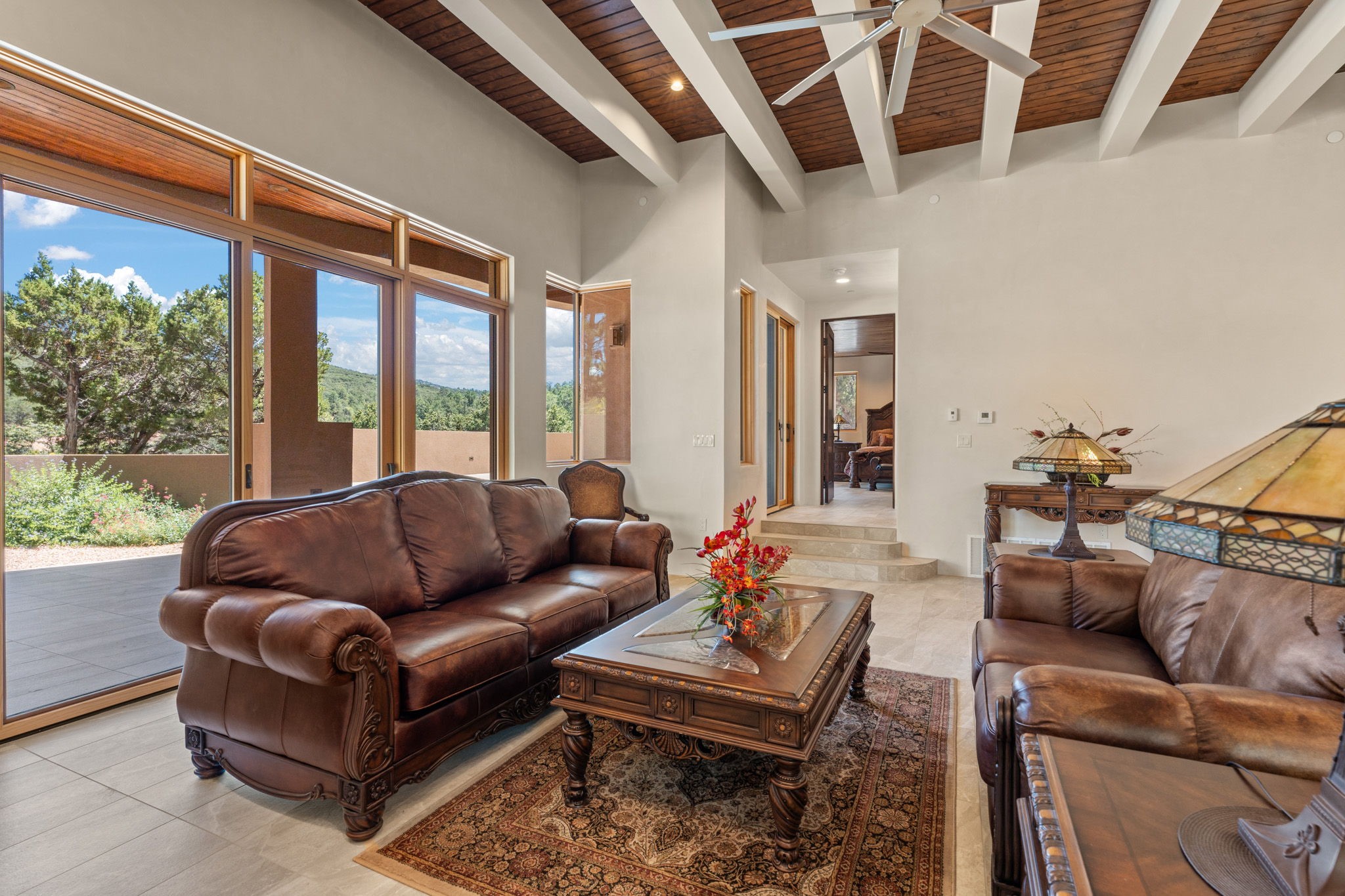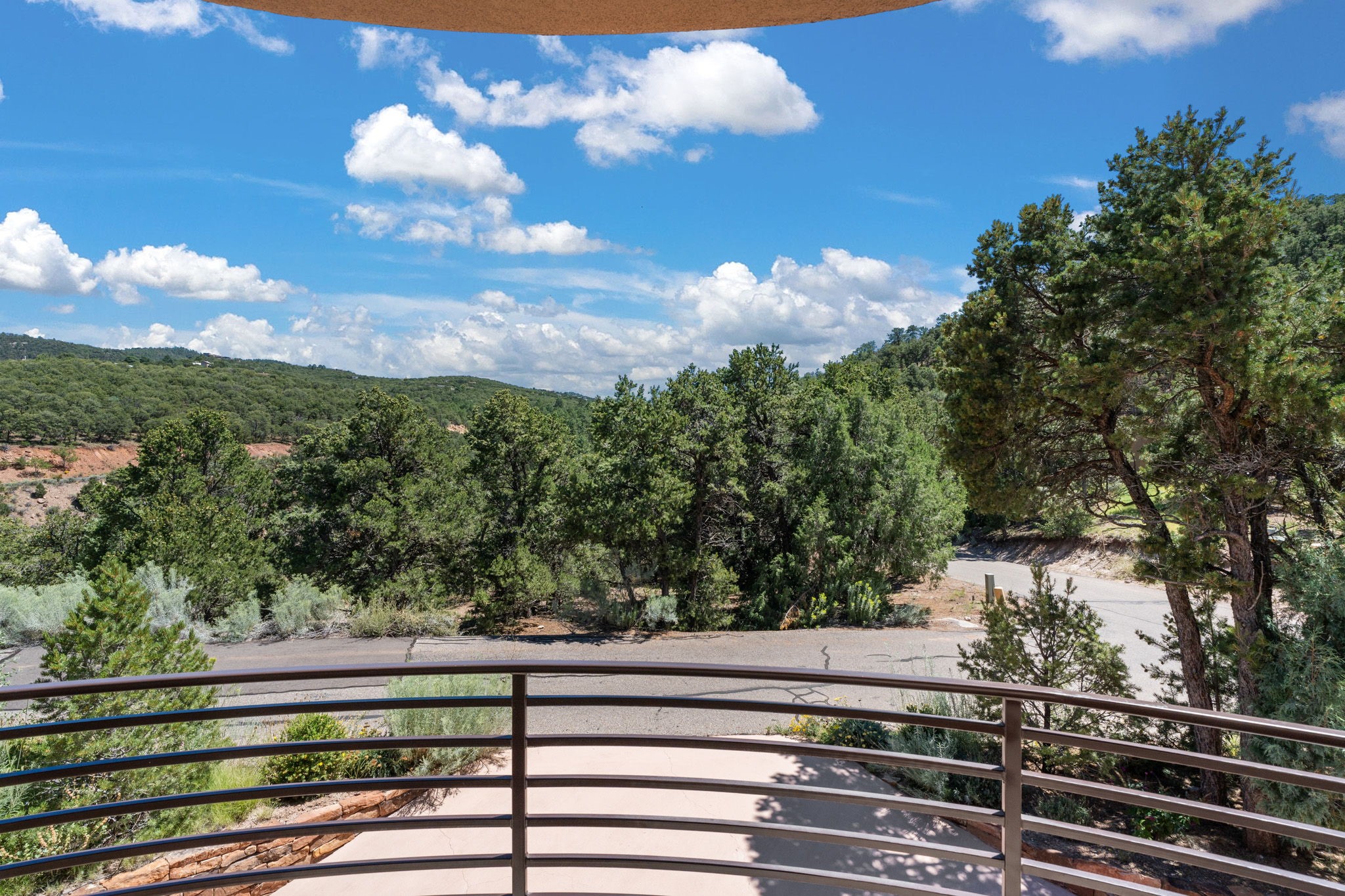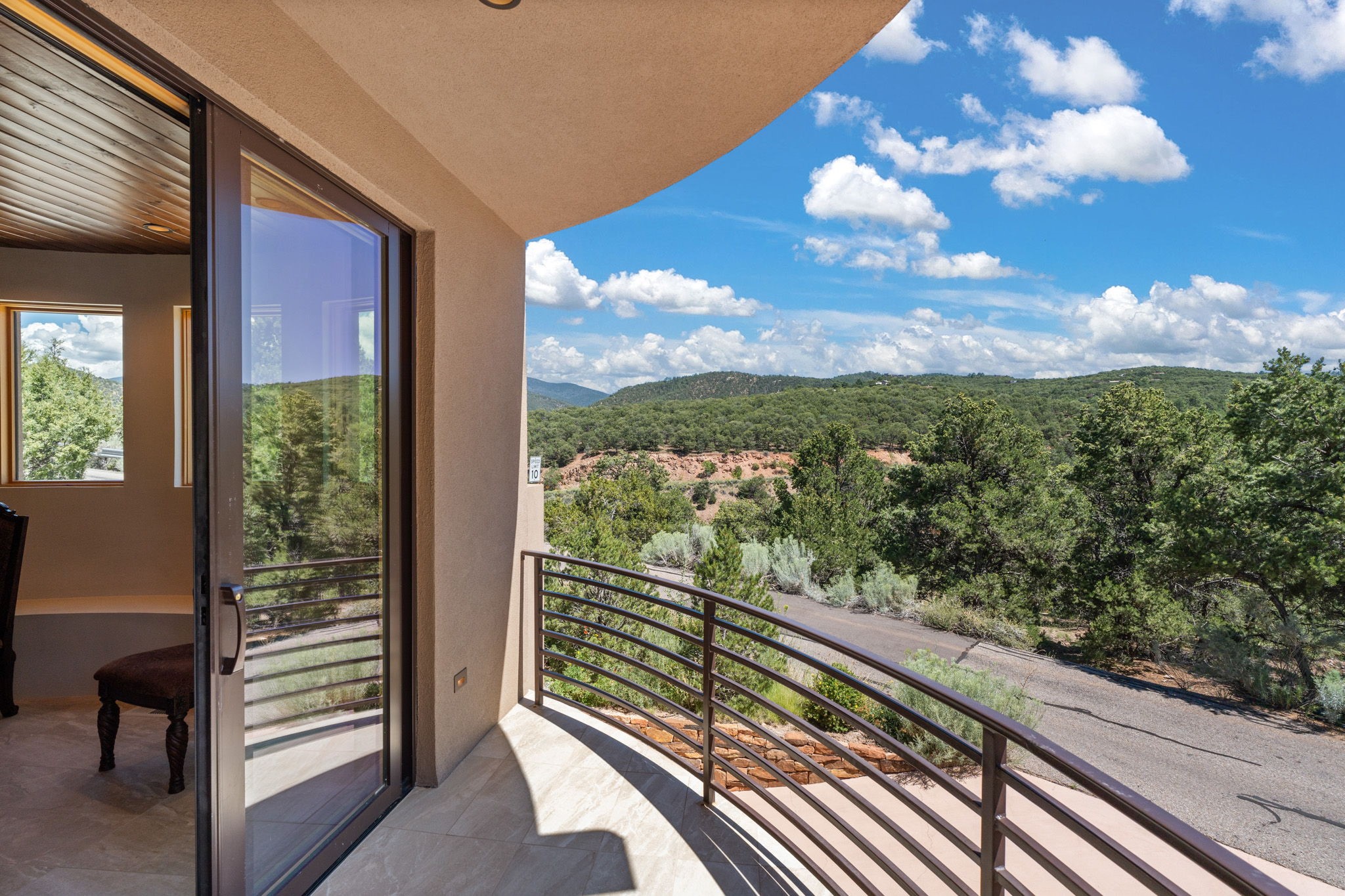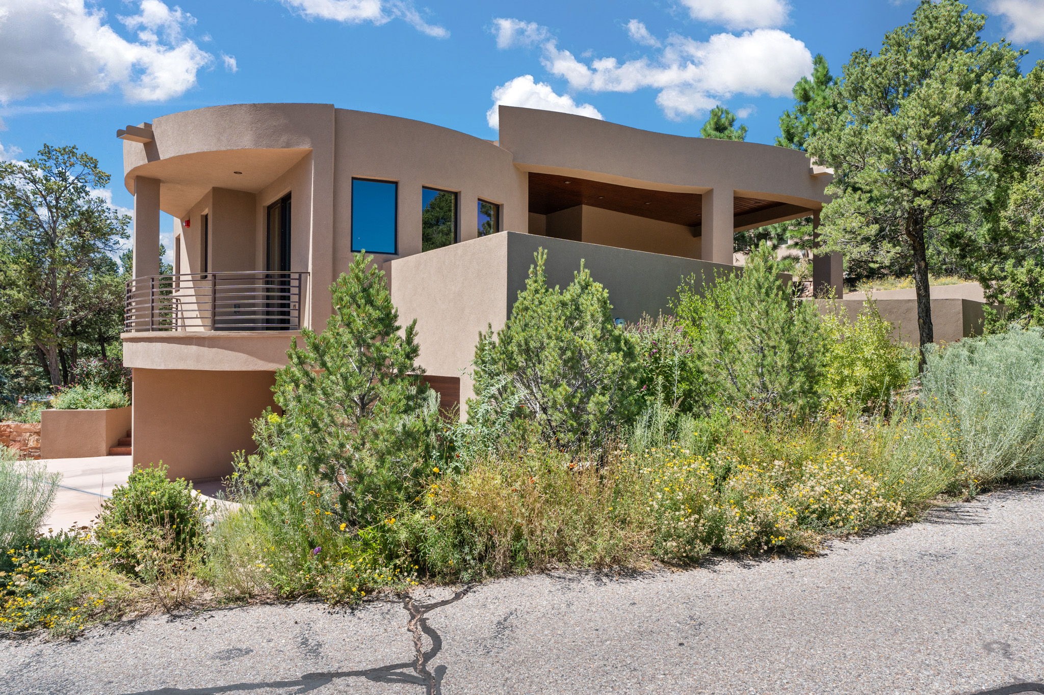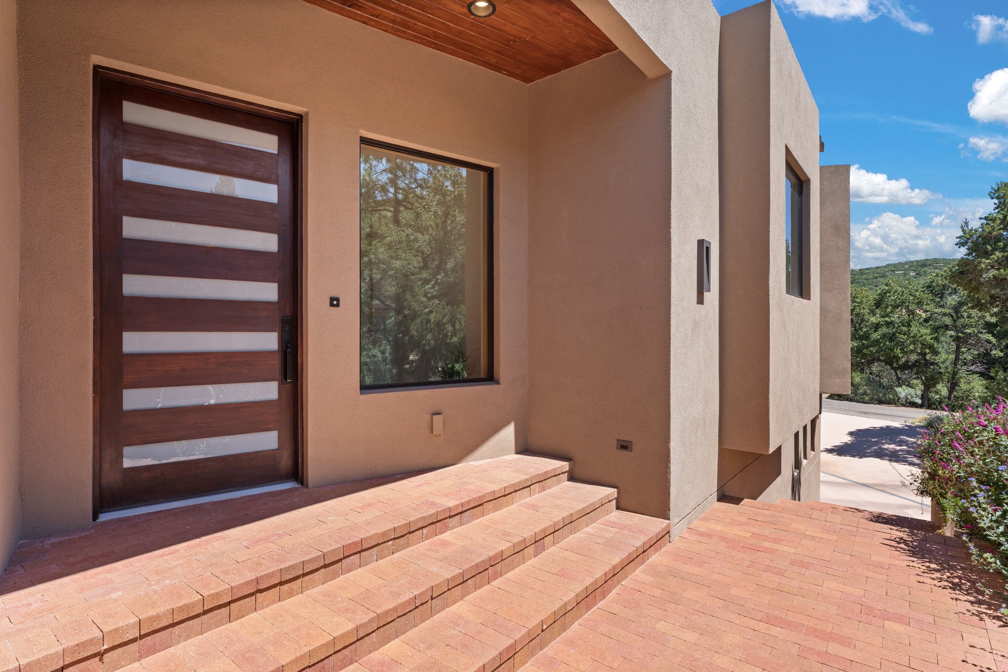 Outstanding contemporary home in the gated, private and paved Santa Fe Summit Subdivision located just minutes from Santa Fe's historic plaza, Canyon Road and the Santa Fe Ski basin. Sophisticated high-end property featuring a sleek and modern design with a 3-car finished garage, an open concept living room with 13' high beamed ceilings, a lineal fireplace and fabulous views. The spacious kitchen features a large center island, granite countertops, maple cabinets, and Wolf/Sub-Zero appliances. The elegant master suite has a wood ceiling, covered view deck, a sitting area with a lineal fireplace, and a well-appointed master bathroom with a jetted whirlpool. All of the living areas have plastered interior walls (diamond finish), 12" thick exterior walls (finished), 8'-10' tall contemporary Pella sliding doors and windows, stylish lighting and polished nickel fixtures, floating vanities, Italian porcelain flooring, thick maple doors, in-floor radiant heat, and refrigerated air conditioning (2 systems). This home was sited and designed to maximize views of the spectacular Sangre de Cristo mountains with a large exterior rear deck plus 3 covered portals. The circular driveway is surrounded with custom rockwork and the entire lot is fully landscaped with a drip-irrigation system, 4 planters, and numerous perennials, pinon and pine trees.