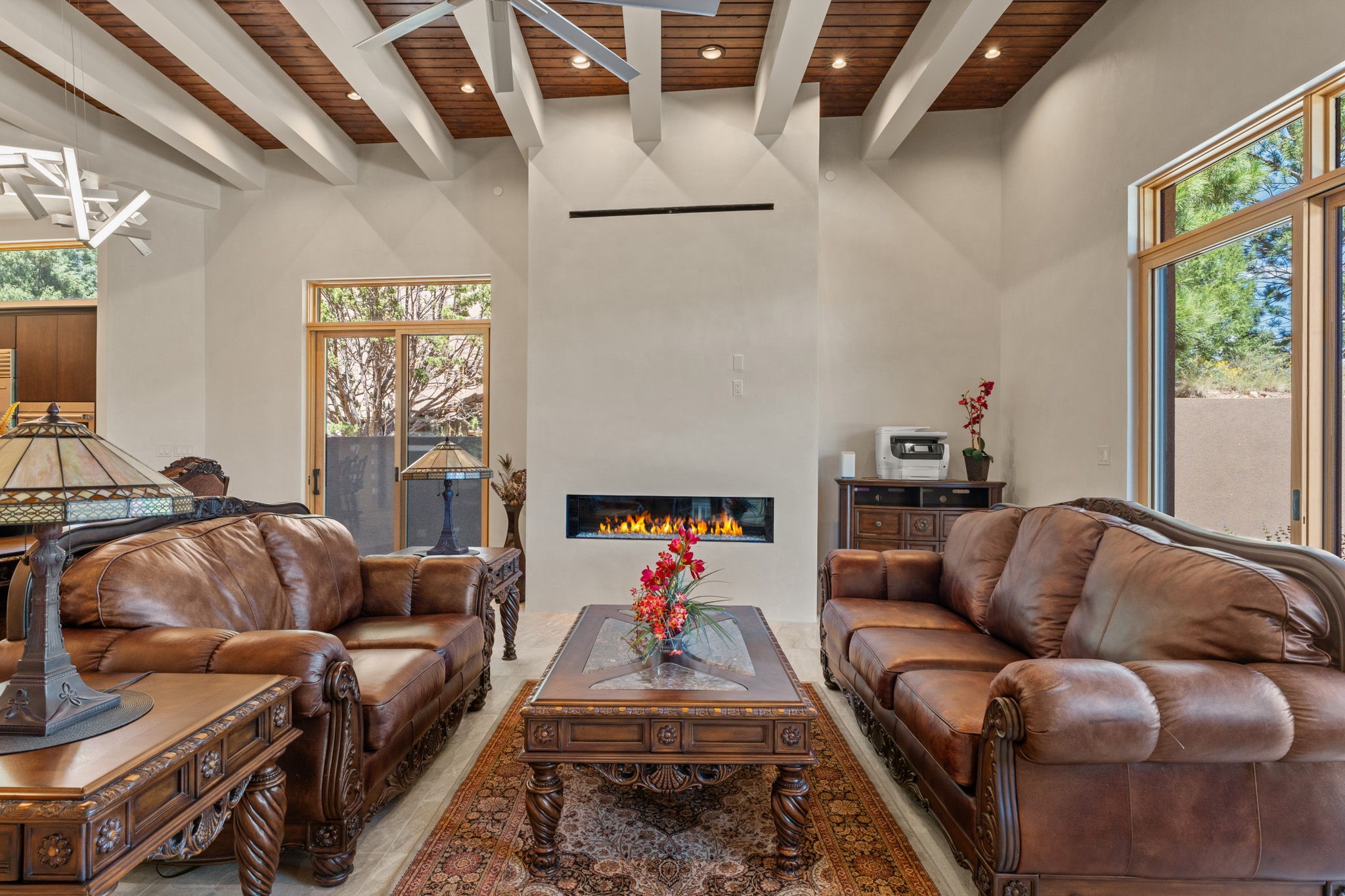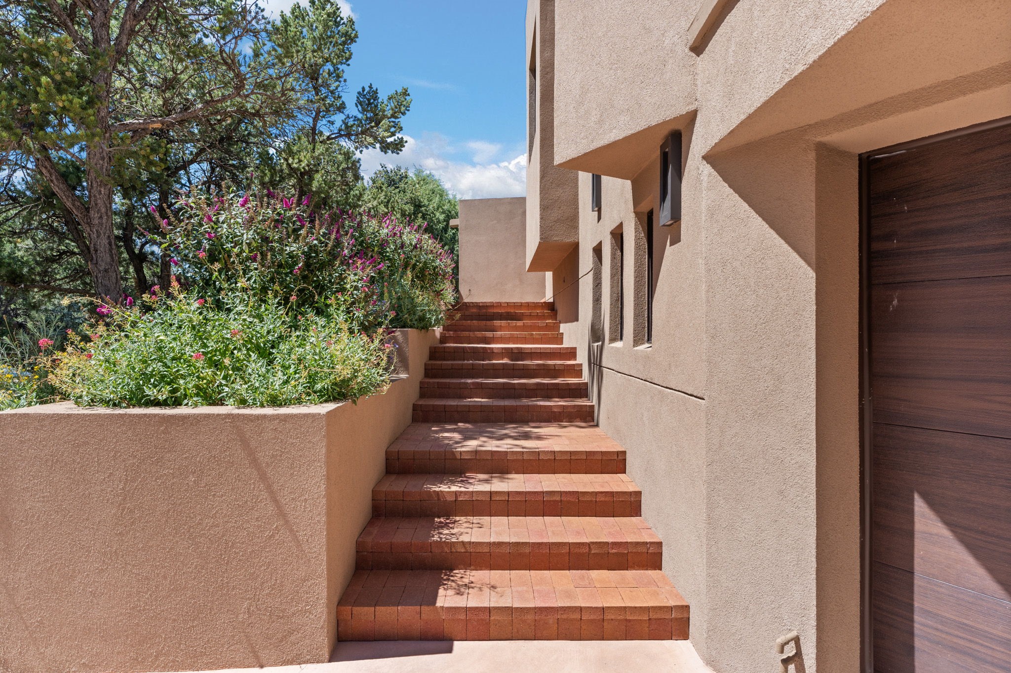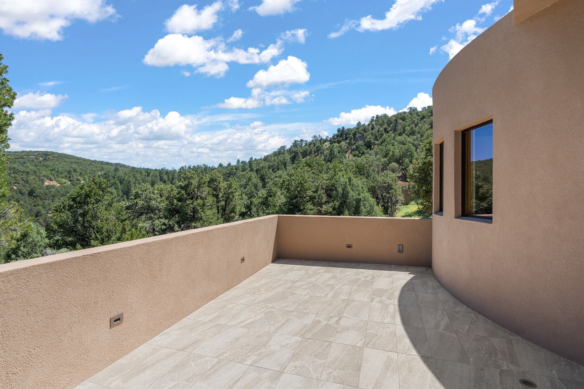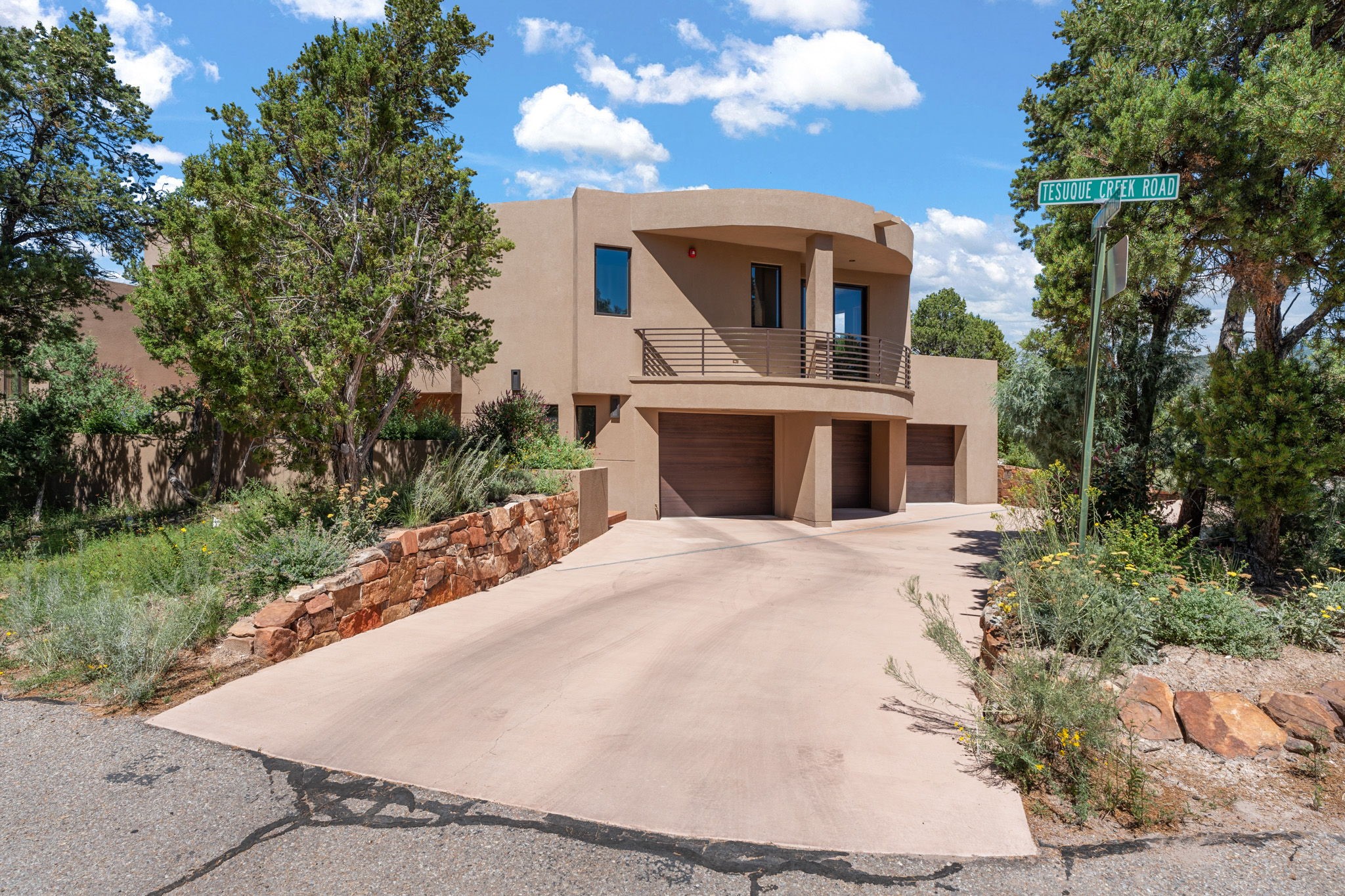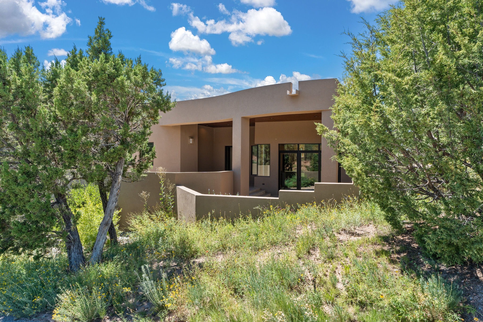 Outstanding contemporary home in the gated, private and paved Santa Fe Summit Subdivision located just minutes from Santa Fe's historic plaza, Canyon Road and the Santa Fe Ski basin. Sophisticated high-end property featuring a sleek and modern design with a 3-car finished garage, an open concept living room with 13' high beamed ceilings, a lineal fireplace and fabulous views. The spacious kitchen features a large center island, granite countertops, maple cabinets, and Wolf/Sub-Zero appliances. The elegant master suite has a wood ceiling, covered view deck, a sitting area with a lineal fireplace, and a well-appointed master bathroom with a jetted whirlpool. All of the living areas have plastered interior walls (diamond finish), 12" thick exterior walls (finished), 8'-10' tall contemporary Pella sliding doors and windows, stylish lighting and polished nickel fixtures, floating vanities, Italian porcelain flooring, thick maple doors, in-floor radiant heat, and refrigerated air conditioning (2 systems). This home was sited and designed to maximize views of the spectacular Sangre de Cristo mountains with a large exterior rear deck plus 3 covered portals. The circular driveway is surrounded with custom rockwork and the entire lot is fully landscaped with a drip-irrigation system, 4 planters, and numerous perennials, pinon and pine trees.