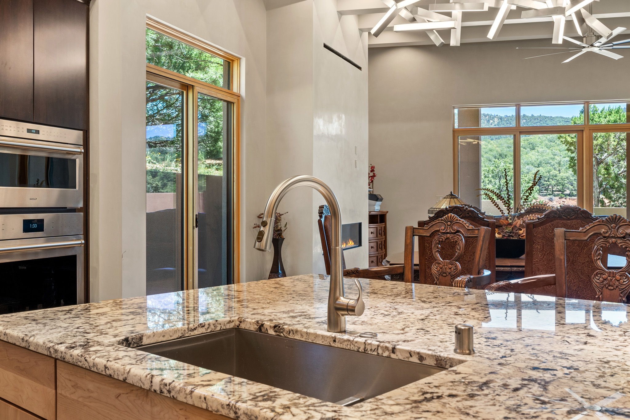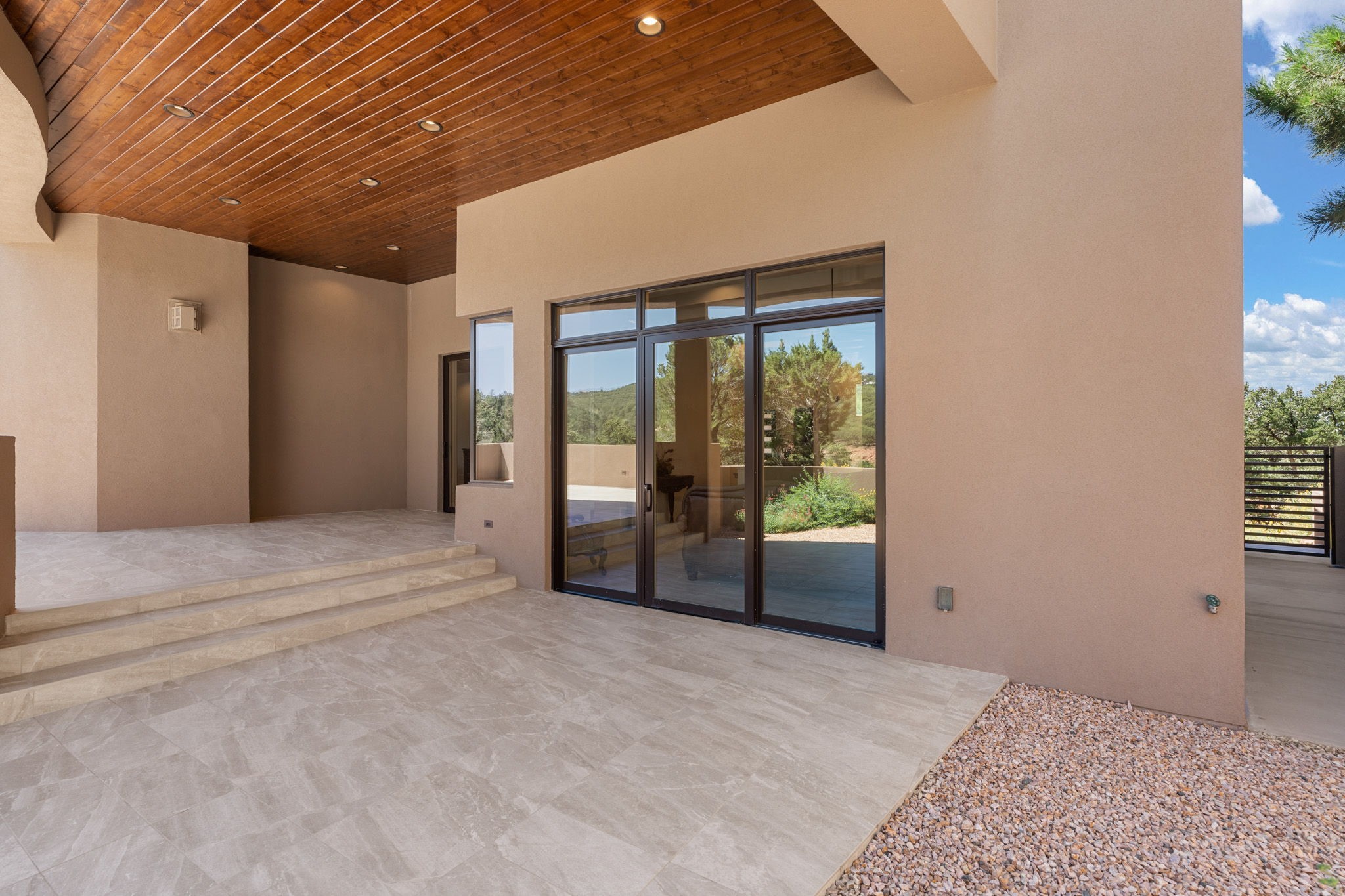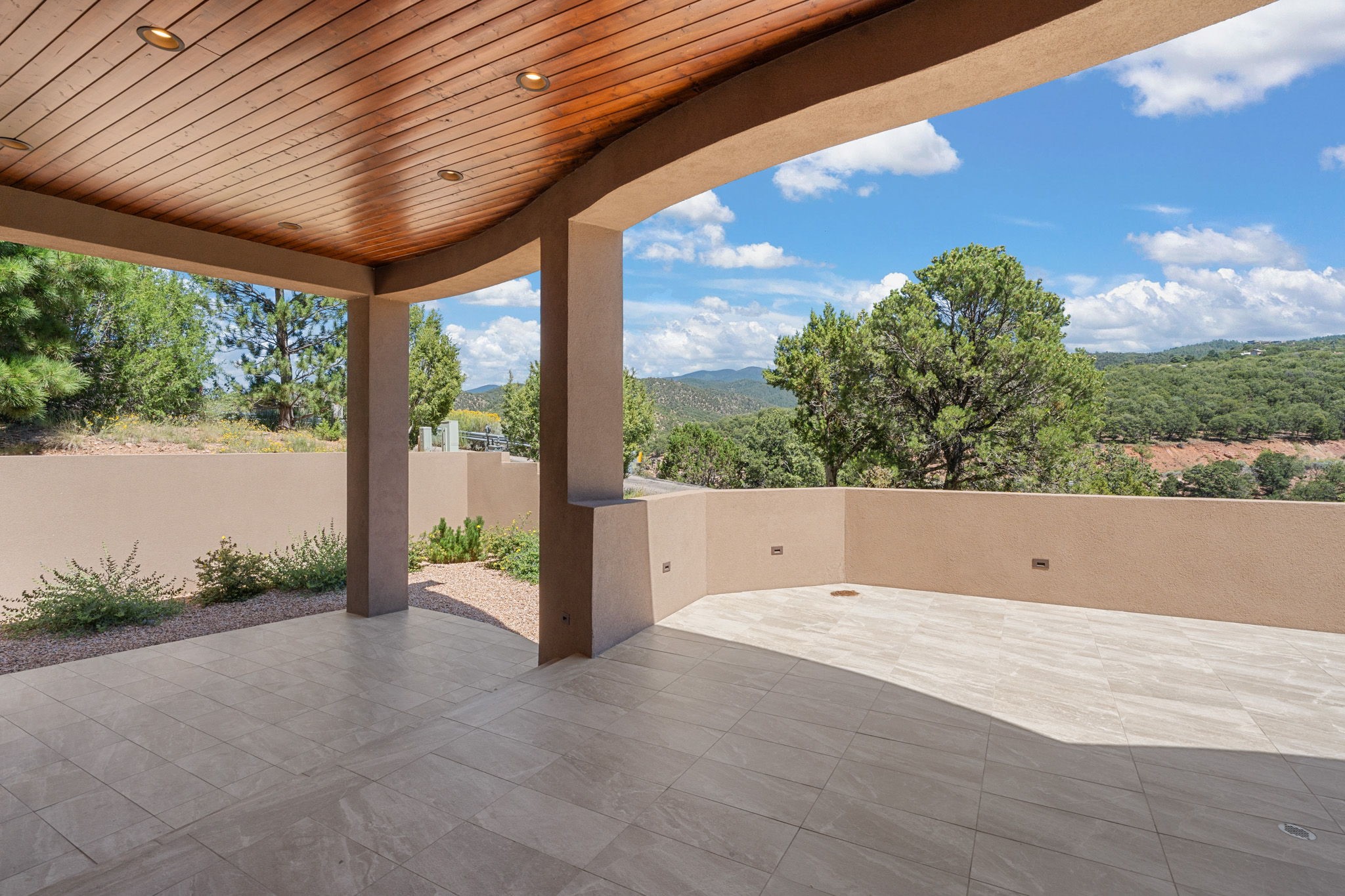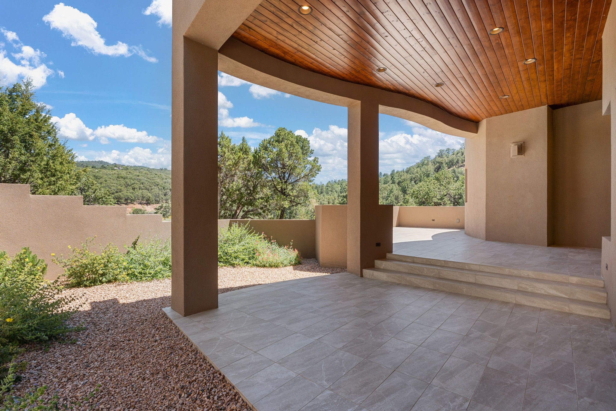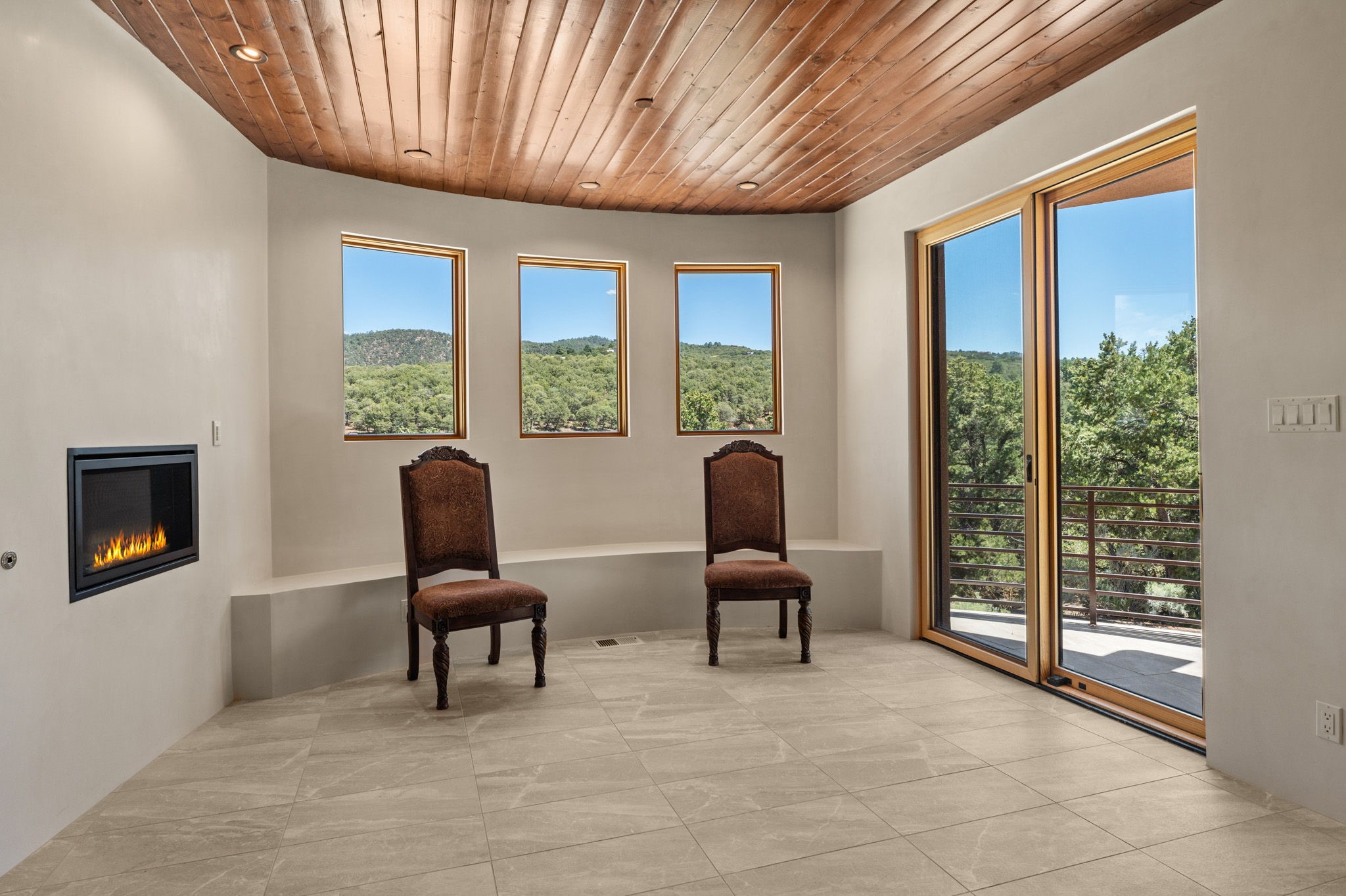 Outstanding contemporary home in the gated, private and paved Santa Fe Summit Subdivision located just minutes from Santa Fe's historic plaza, Canyon Road and the Santa Fe Ski basin. Sophisticated high-end property featuring a sleek and modern design with a 3-car finished garage, an open concept living room with 13' high beamed ceilings, a lineal fireplace and fabulous views. The spacious kitchen features a large center island, granite countertops, maple cabinets, and Wolf/Sub-Zero appliances. The elegant master suite has a wood ceiling, covered view deck, a sitting area with a lineal fireplace, and a well-appointed master bathroom with a jetted whirlpool. All of the living areas have plastered interior walls (diamond finish), 12" thick exterior walls (finished), 8'-10' tall contemporary Pella sliding doors and windows, stylish lighting and polished nickel fixtures, floating vanities, Italian porcelain flooring, thick maple doors, in-floor radiant heat, and refrigerated air conditioning (2 systems). This home was sited and designed to maximize views of the spectacular Sangre de Cristo mountains with a large exterior rear deck plus 3 covered portals. The circular driveway is surrounded with custom rockwork and the entire lot is fully landscaped with a drip-irrigation system, 4 planters, and numerous perennials, pinon and pine trees.