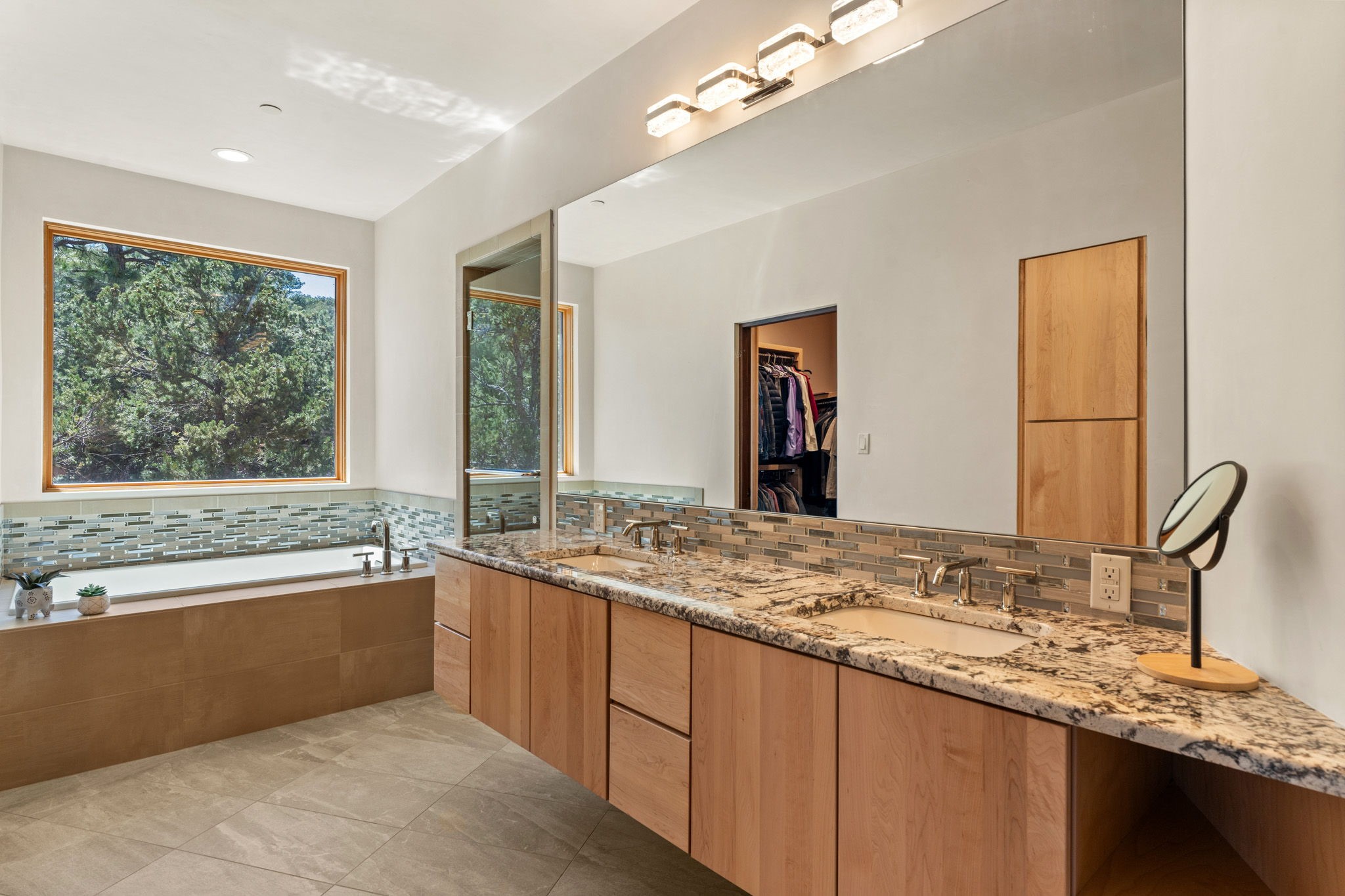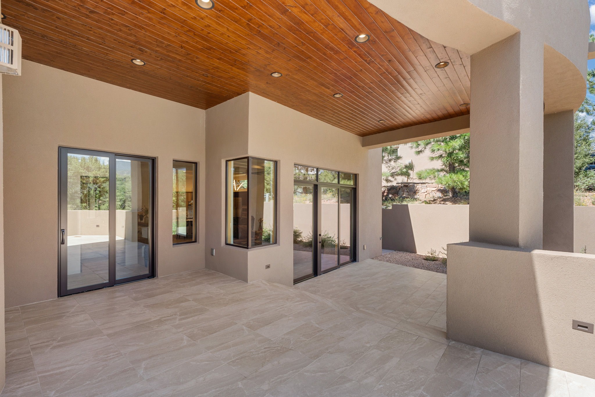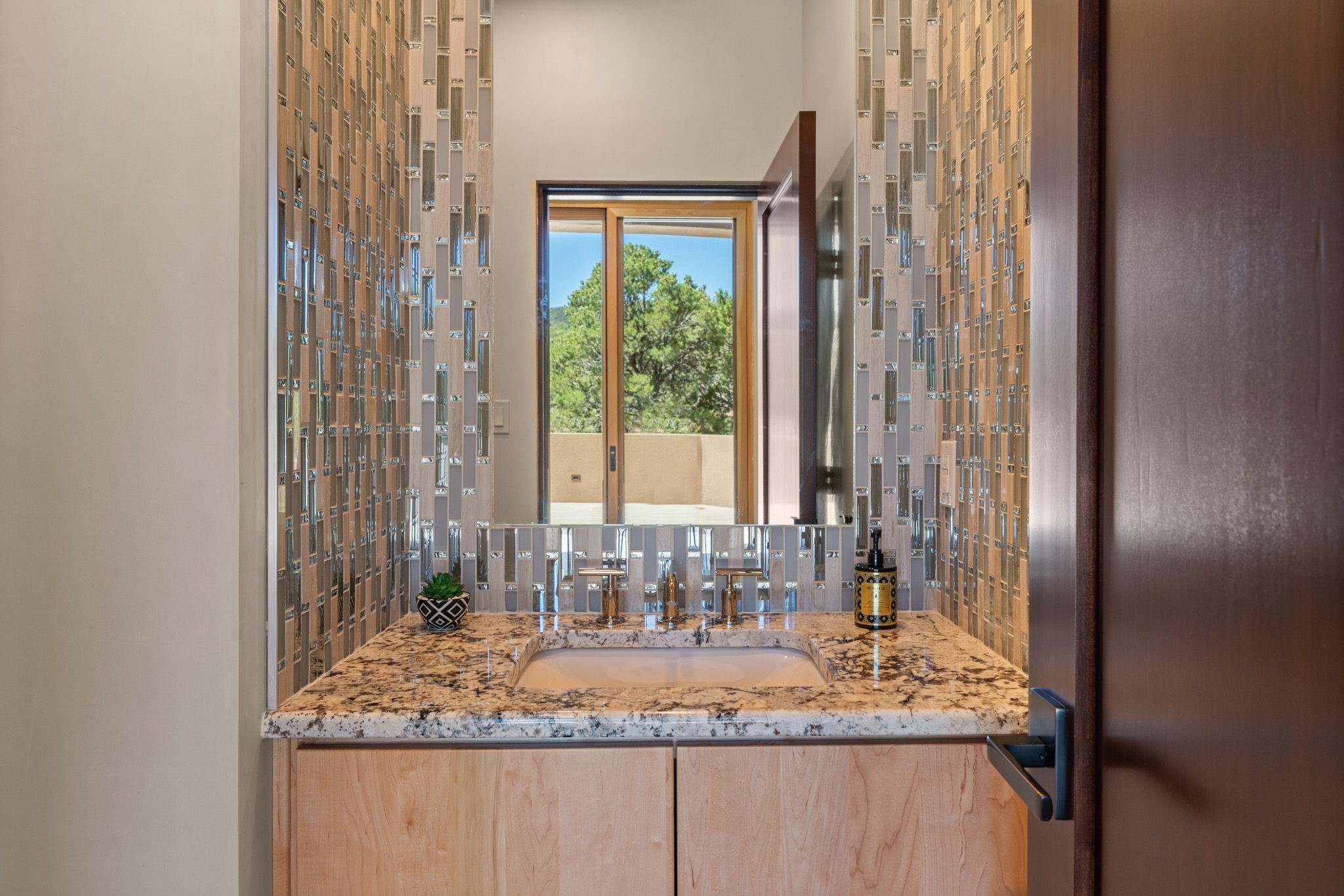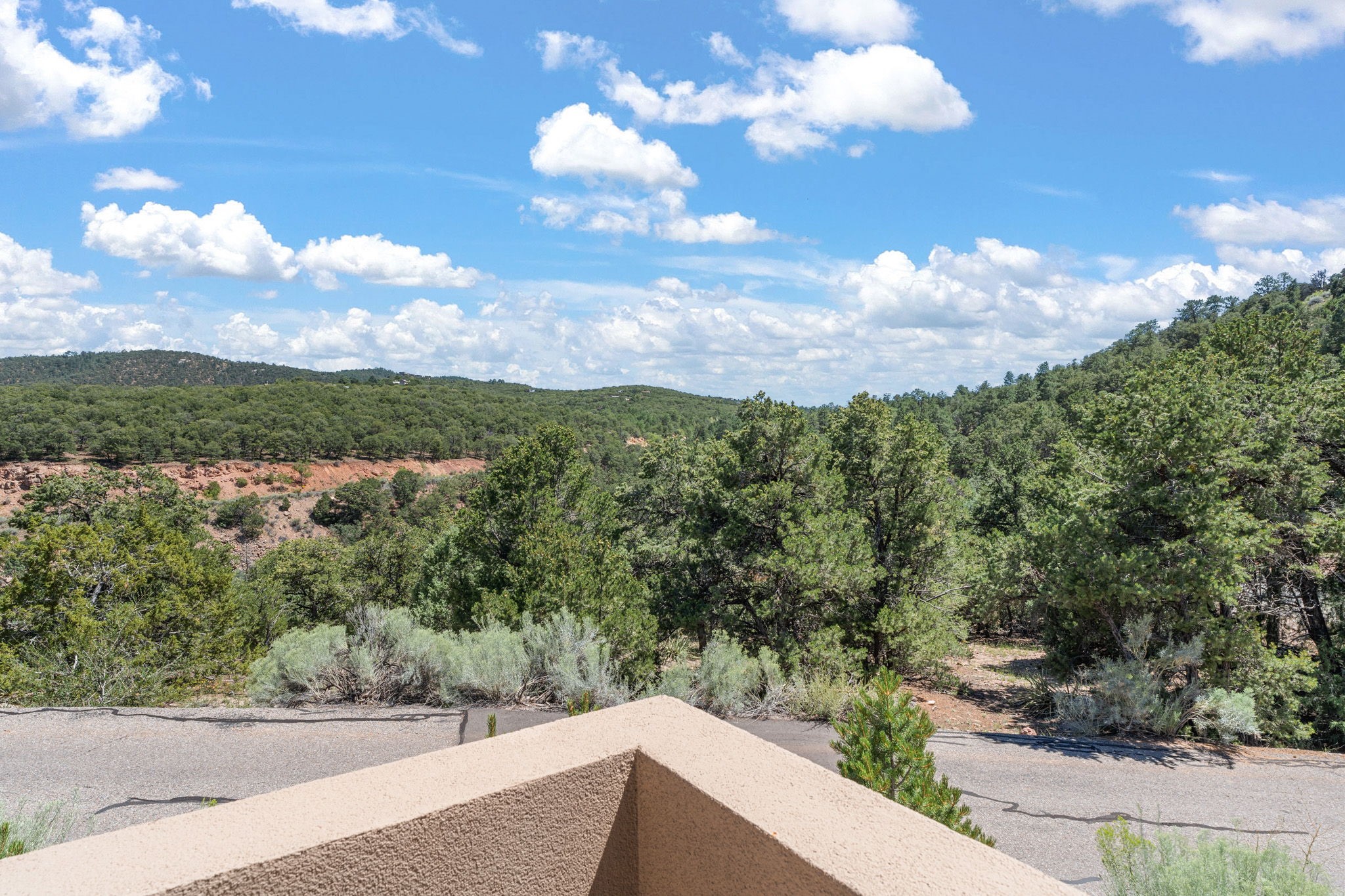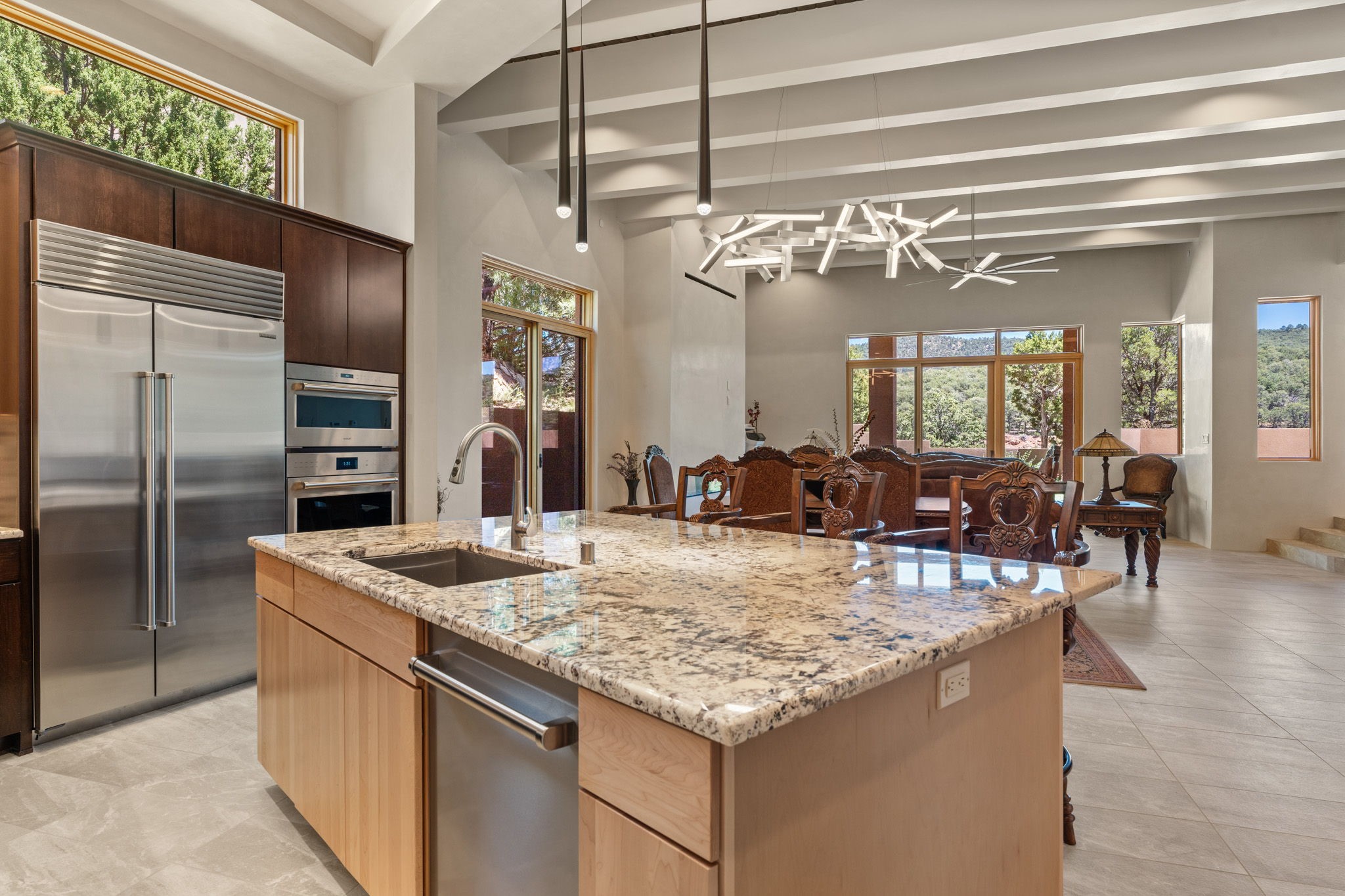 Outstanding contemporary home in the gated, private and paved Santa Fe Summit Subdivision located just minutes from Santa Fe's historic plaza, Canyon Road and the Santa Fe Ski basin. Sophisticated high-end property featuring a sleek and modern design with a 3-car finished garage, an open concept living room with 13' high beamed ceilings, a lineal fireplace and fabulous views. The spacious kitchen features a large center island, granite countertops, maple cabinets, and Wolf/Sub-Zero appliances. The elegant master suite has a wood ceiling, covered view deck, a sitting area with a lineal fireplace, and a well-appointed master bathroom with a jetted whirlpool. All of the living areas have plastered interior walls (diamond finish), 12" thick exterior walls (finished), 8'-10' tall contemporary Pella sliding doors and windows, stylish lighting and polished nickel fixtures, floating vanities, Italian porcelain flooring, thick maple doors, in-floor radiant heat, and refrigerated air conditioning (2 systems). This home was sited and designed to maximize views of the spectacular Sangre de Cristo mountains with a large exterior rear deck plus 3 covered portals. The circular driveway is surrounded with custom rockwork and the entire lot is fully landscaped with a drip-irrigation system, 4 planters, and numerous perennials, pinon and pine trees.