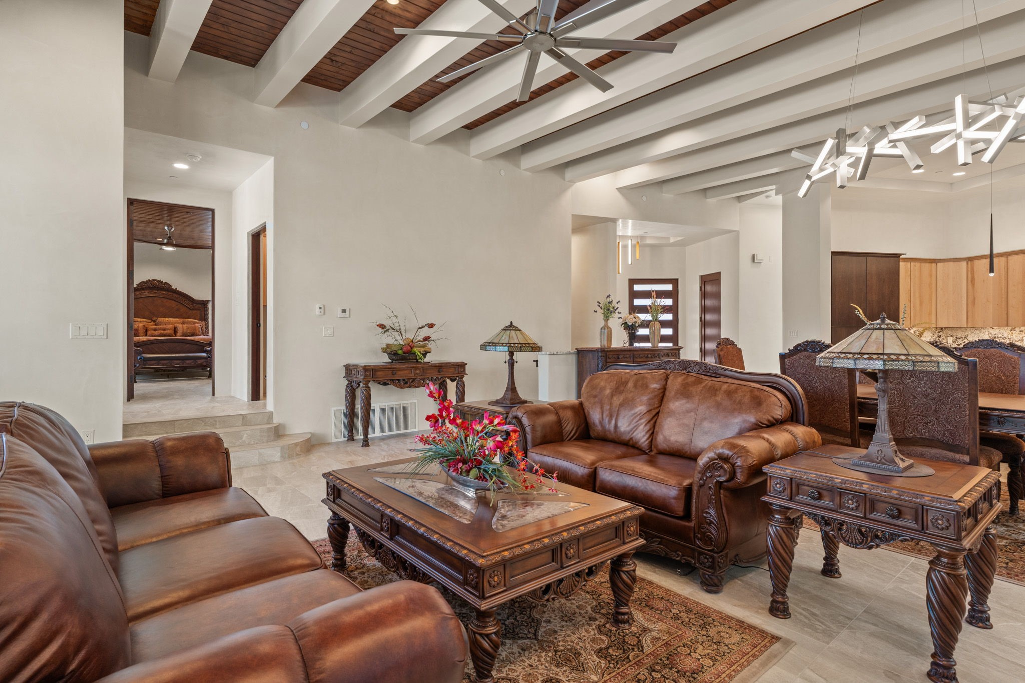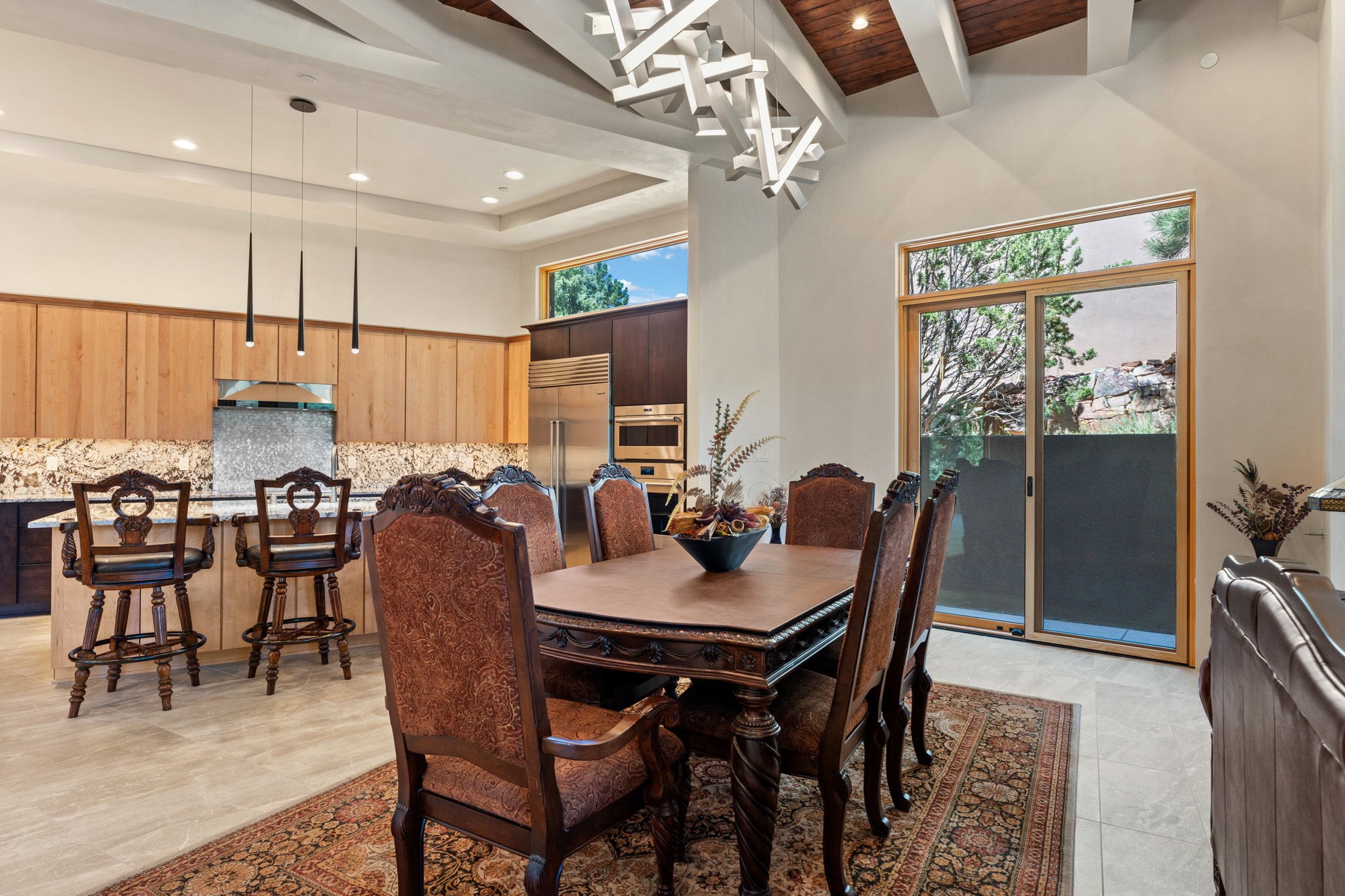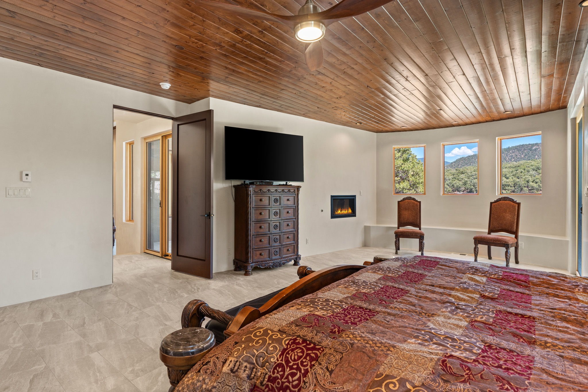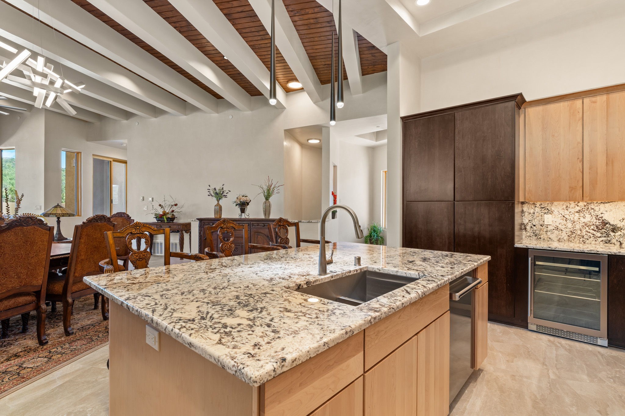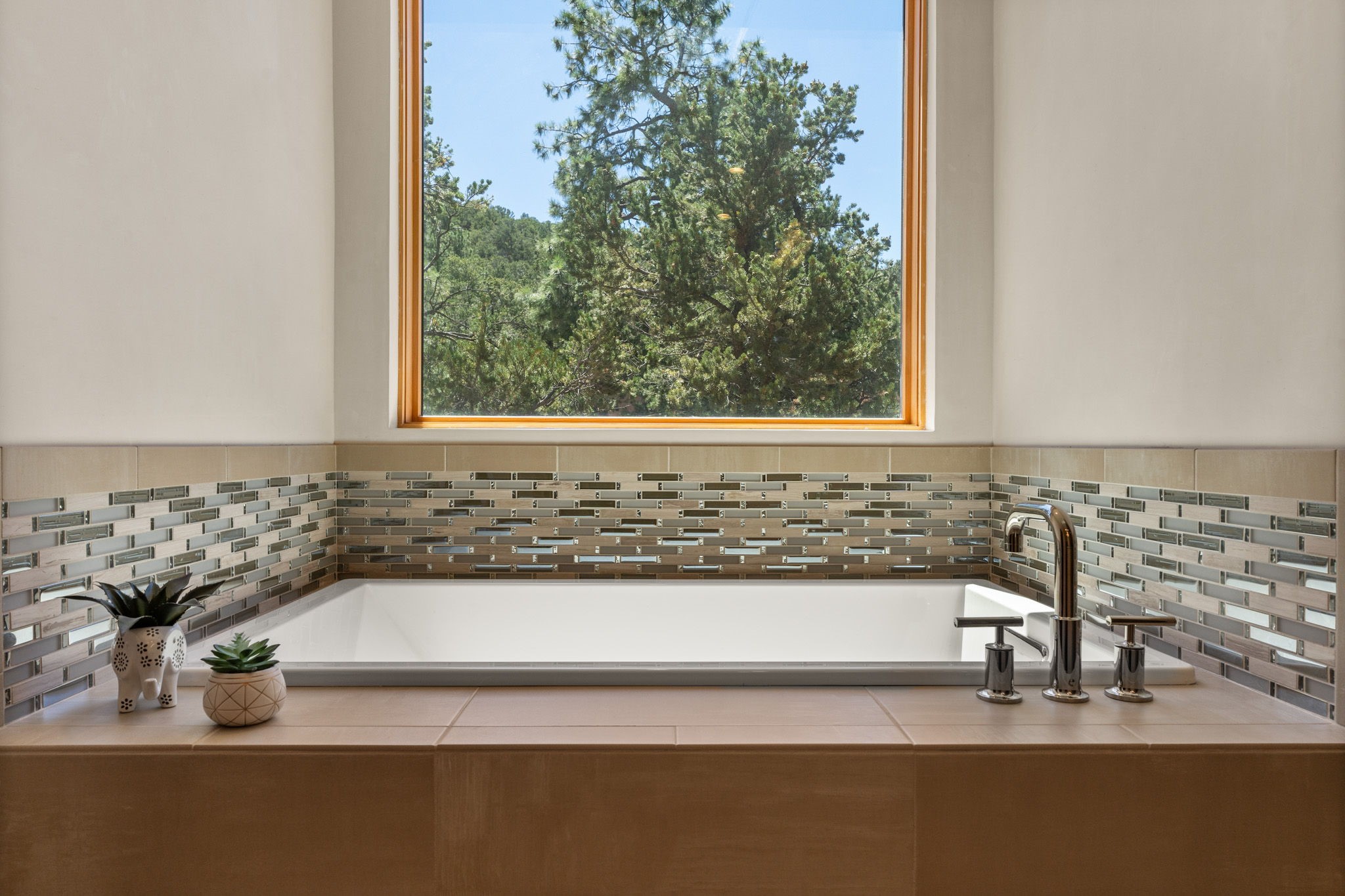 Outstanding contemporary home in the gated, private and paved Santa Fe Summit Subdivision located just minutes from Santa Fe's historic plaza, Canyon Road and the Santa Fe Ski basin. Sophisticated high-end property featuring a sleek and modern design with a 3-car finished garage, an open concept living room with 13' high beamed ceilings, a lineal fireplace and fabulous views. The spacious kitchen features a large center island, granite countertops, maple cabinets, and Wolf/Sub-Zero appliances. The elegant master suite has a wood ceiling, covered view deck, a sitting area with a lineal fireplace, and a well-appointed master bathroom with a jetted whirlpool. All of the living areas have plastered interior walls (diamond finish), 12" thick exterior walls (finished), 8'-10' tall contemporary Pella sliding doors and windows, stylish lighting and polished nickel fixtures, floating vanities, Italian porcelain flooring, thick maple doors, in-floor radiant heat, and refrigerated air conditioning (2 systems). This home was sited and designed to maximize views of the spectacular Sangre de Cristo mountains with a large exterior rear deck plus 3 covered portals. The circular driveway is surrounded with custom rockwork and the entire lot is fully landscaped with a drip-irrigation system, 4 planters, and numerous perennials, pinon and pine trees.