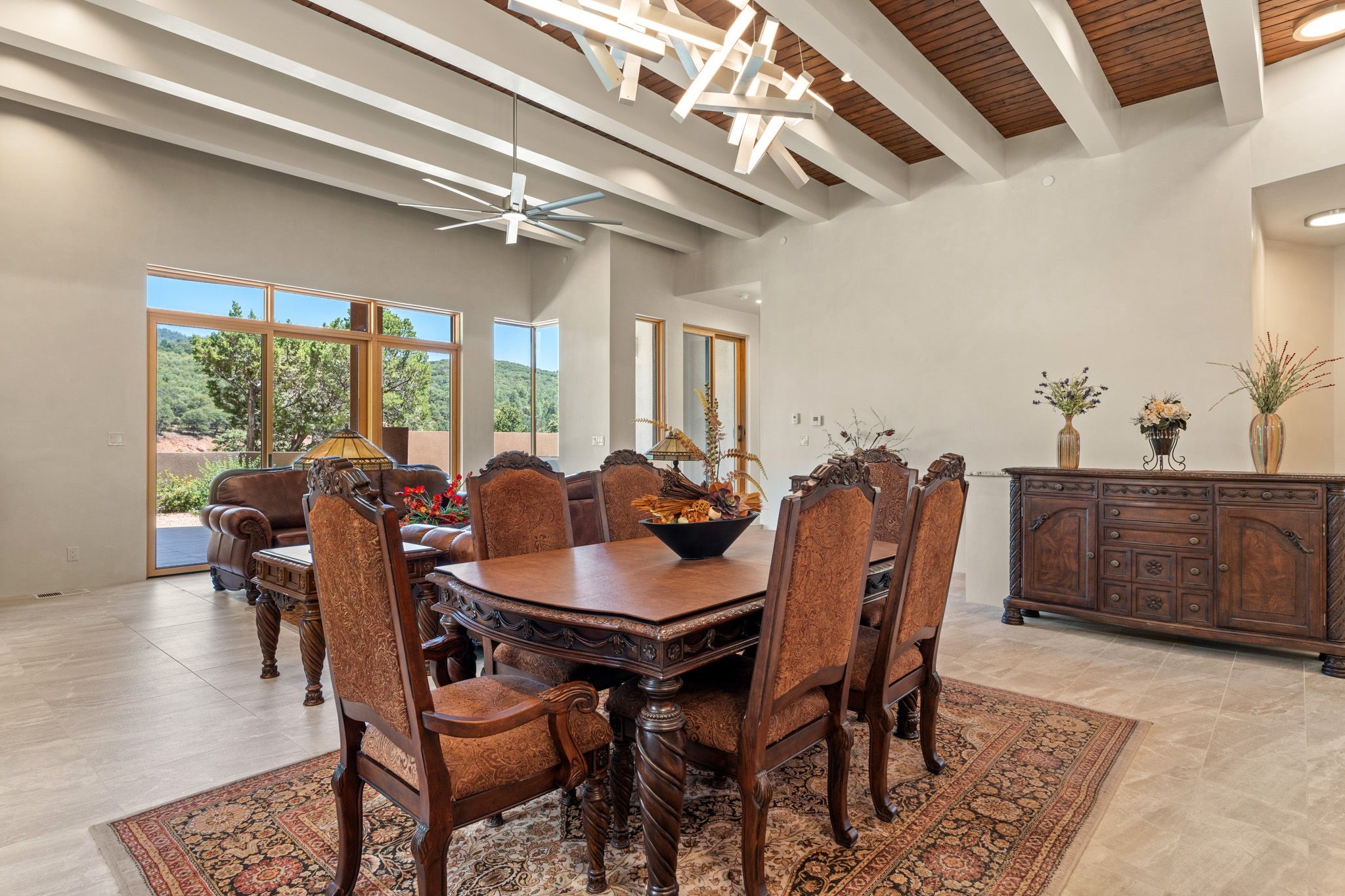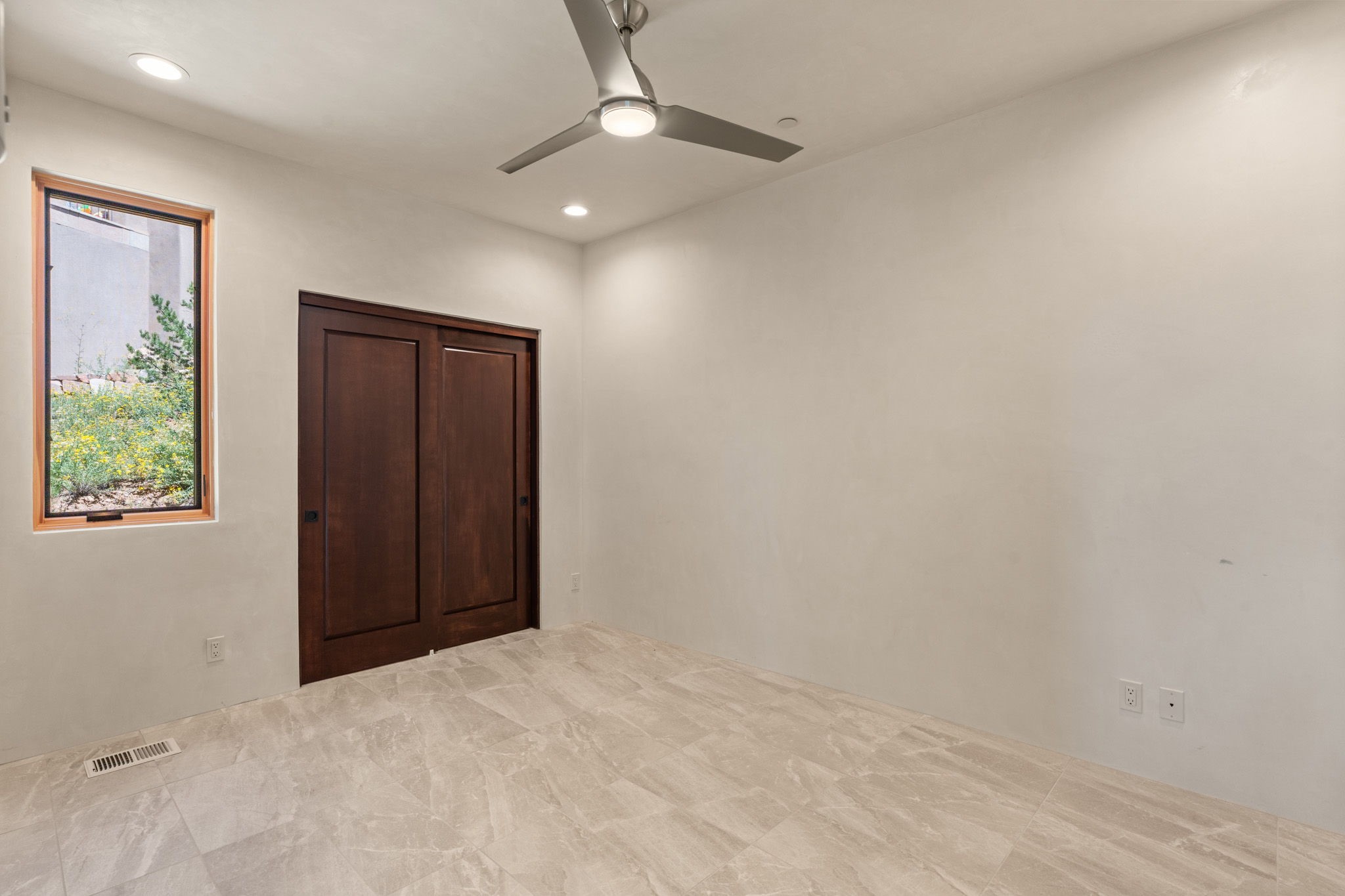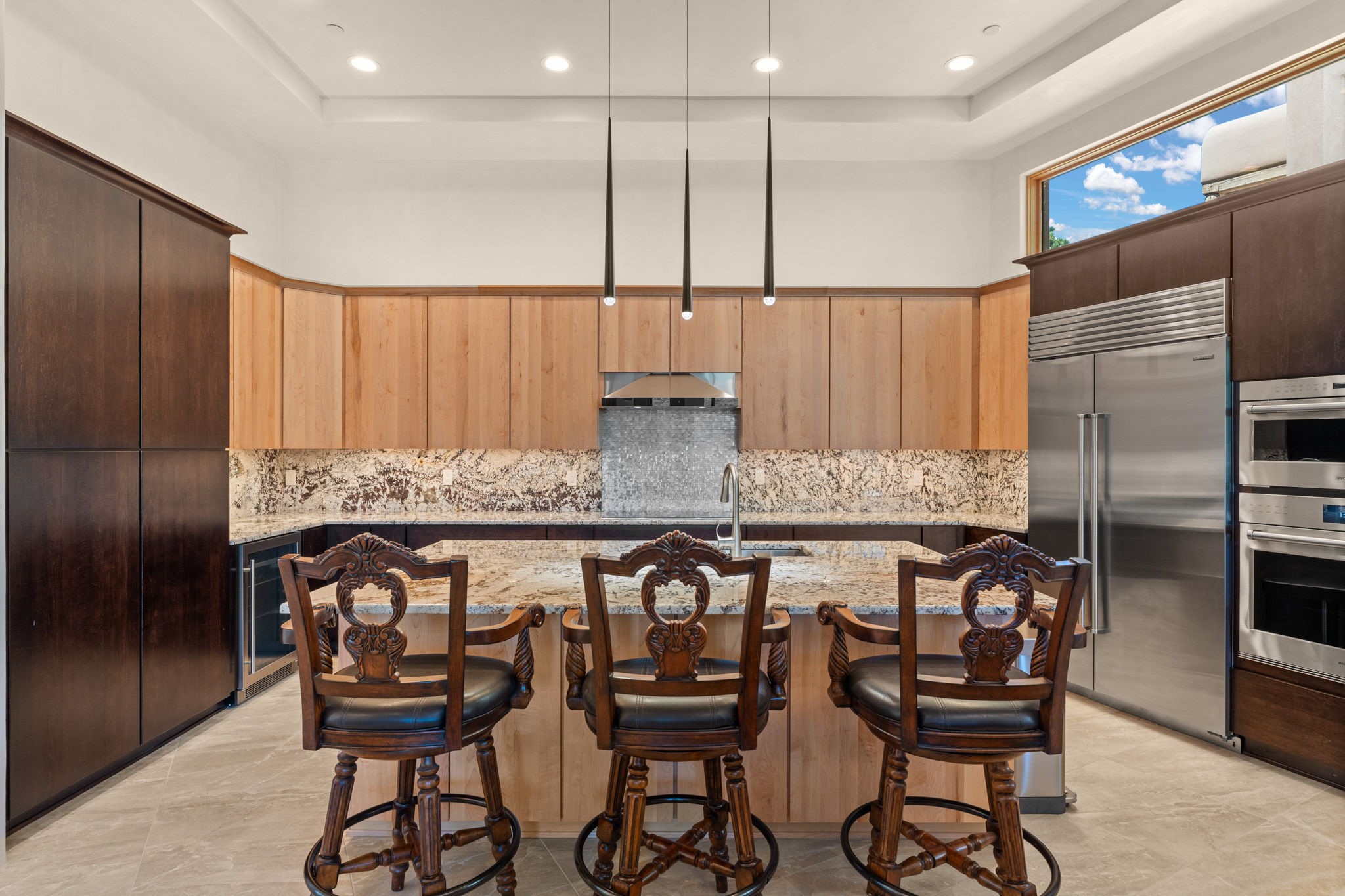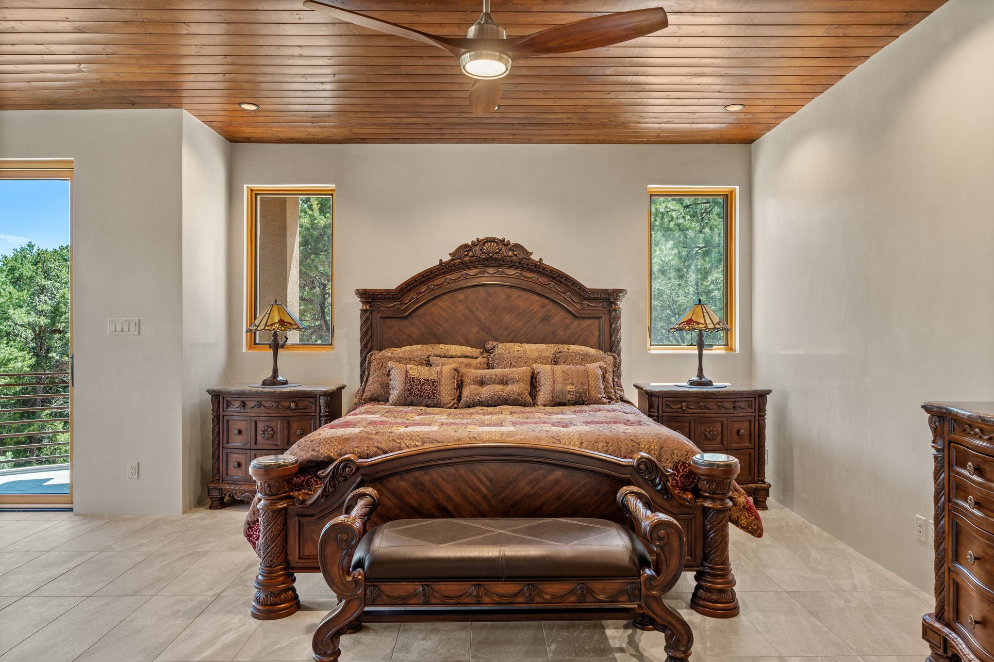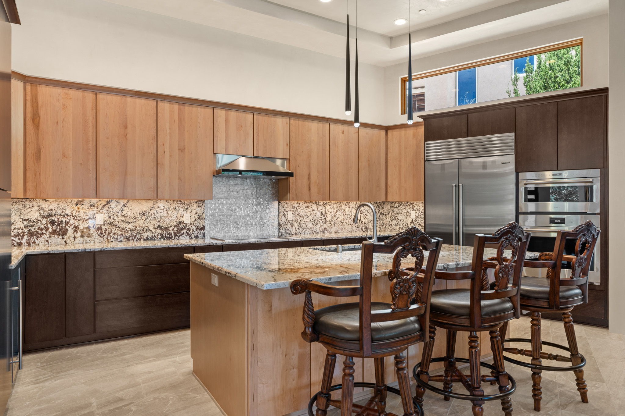 Outstanding contemporary home in the gated, private and paved Santa Fe Summit Subdivision located just minutes from Santa Fe's historic plaza, Canyon Road and the Santa Fe Ski basin. Sophisticated high-end property featuring a sleek and modern design with a 3-car finished garage, an open concept living room with 13' high beamed ceilings, a lineal fireplace and fabulous views. The spacious kitchen features a large center island, granite countertops, maple cabinets, and Wolf/Sub-Zero appliances. The elegant master suite has a wood ceiling, covered view deck, a sitting area with a lineal fireplace, and a well-appointed master bathroom with a jetted whirlpool. All of the living areas have plastered interior walls (diamond finish), 12" thick exterior walls (finished), 8'-10' tall contemporary Pella sliding doors and windows, stylish lighting and polished nickel fixtures, floating vanities, Italian porcelain flooring, thick maple doors, in-floor radiant heat, and refrigerated air conditioning (2 systems). This home was sited and designed to maximize views of the spectacular Sangre de Cristo mountains with a large exterior rear deck plus 3 covered portals. The circular driveway is surrounded with custom rockwork and the entire lot is fully landscaped with a drip-irrigation system, 4 planters, and numerous perennials, pinon and pine trees.