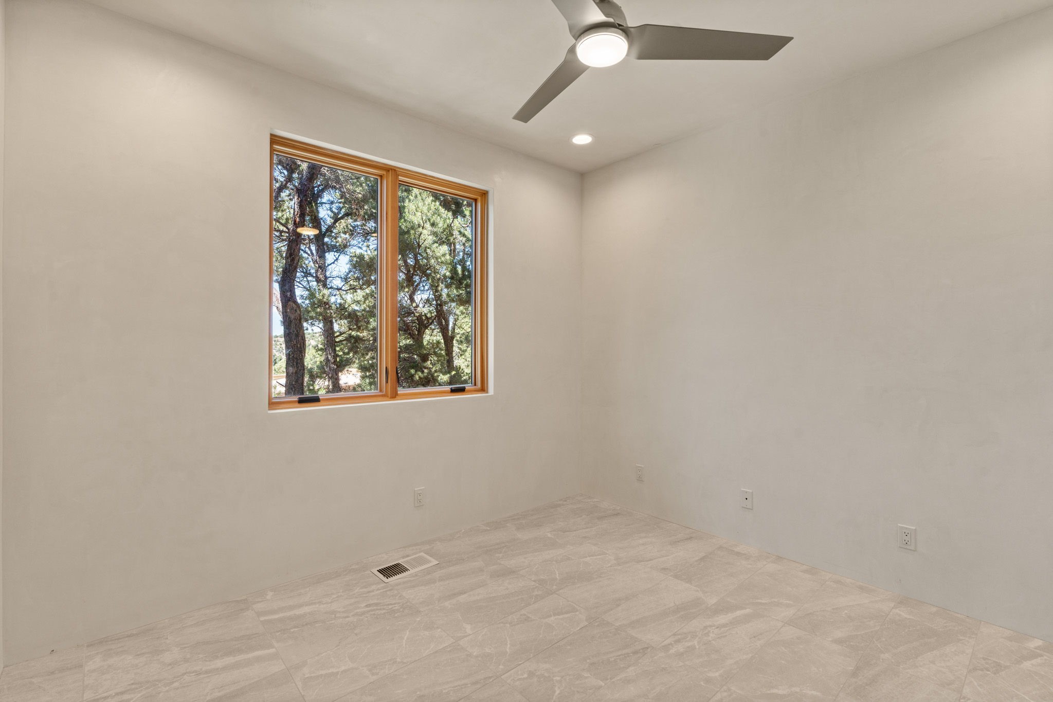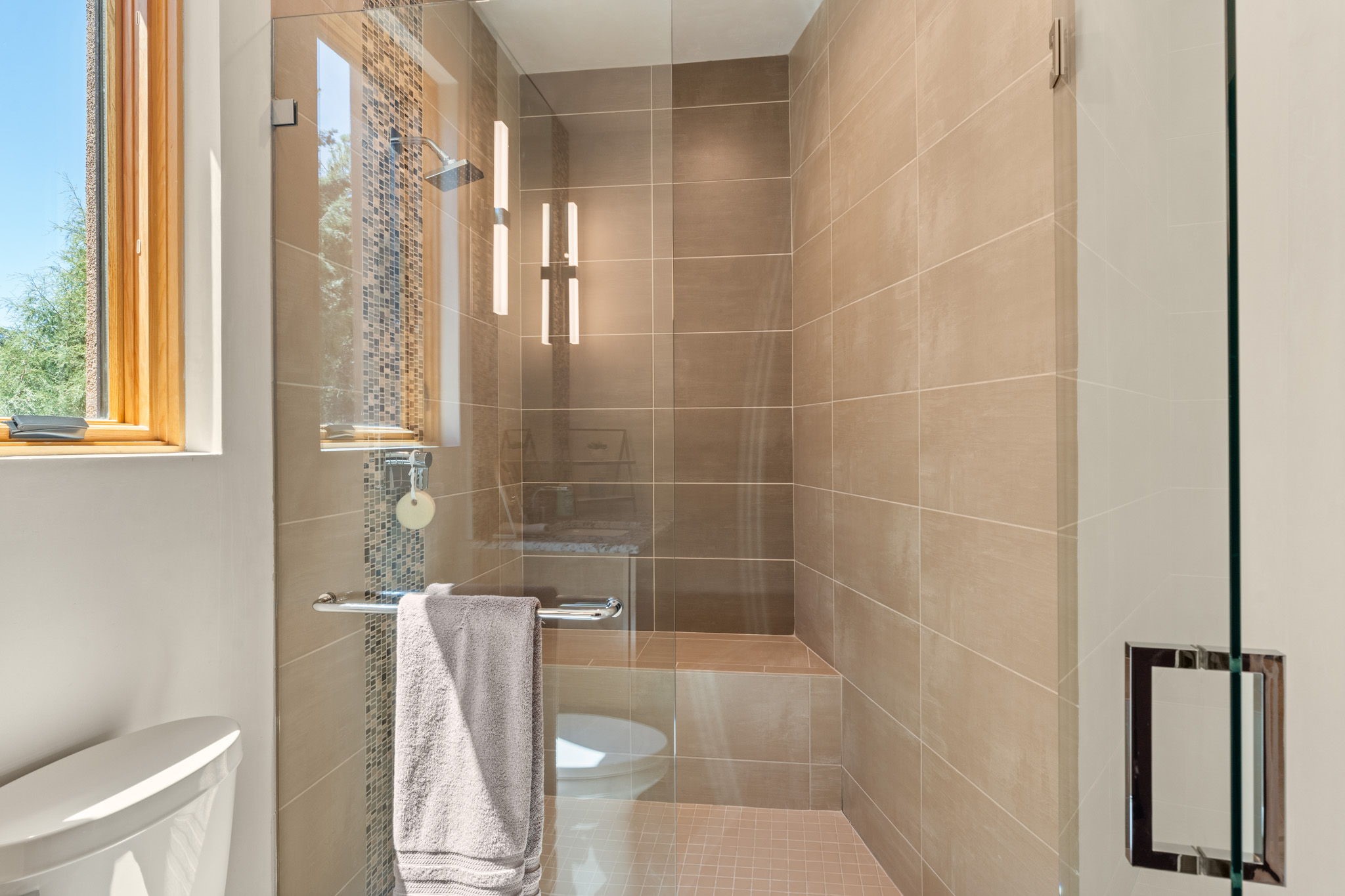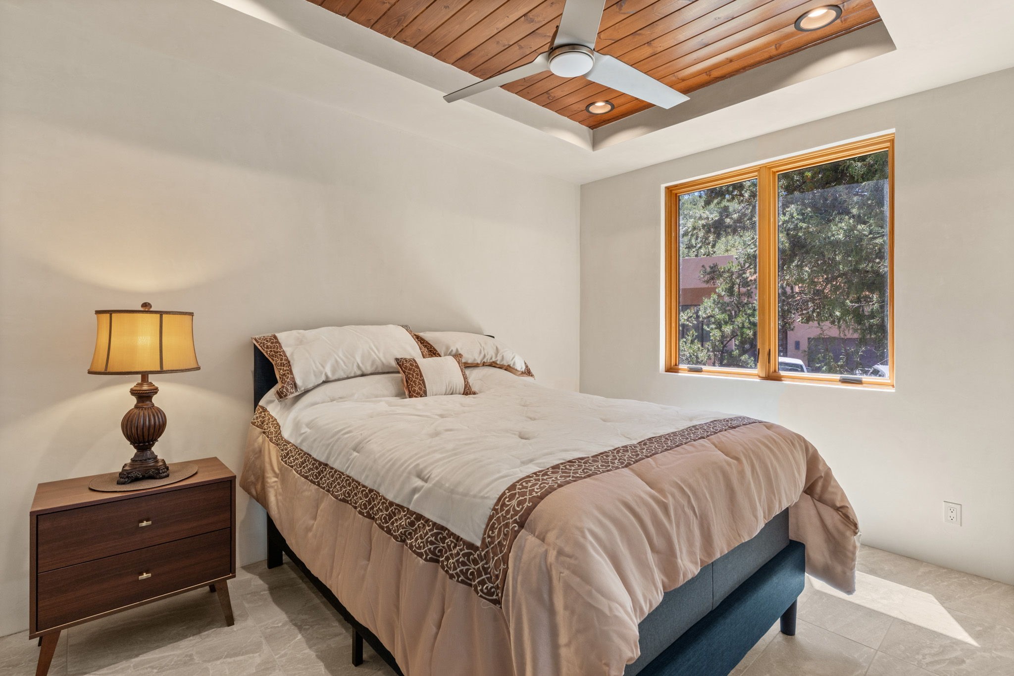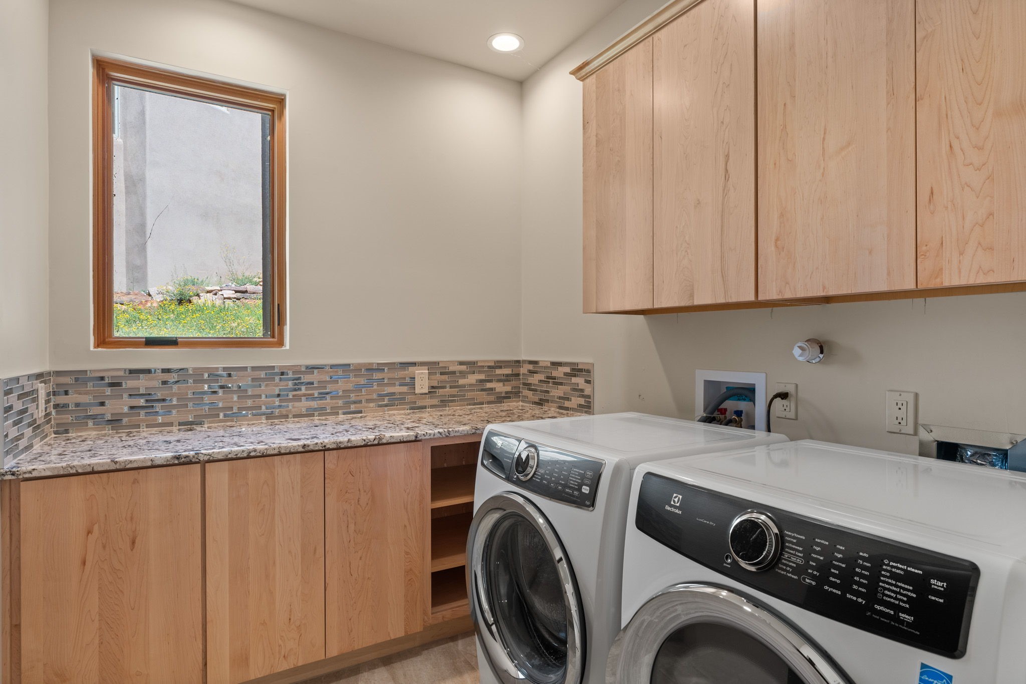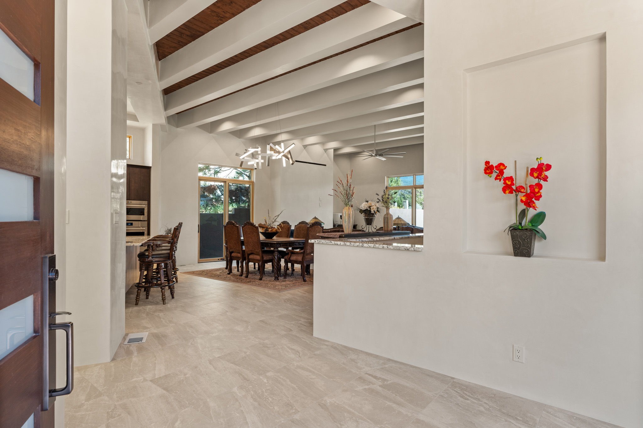 Outstanding contemporary home in the gated, private and paved Santa Fe Summit Subdivision located just minutes from Santa Fe's historic plaza, Canyon Road and the Santa Fe Ski basin. Sophisticated high-end property featuring a sleek and modern design with a 3-car finished garage, an open concept living room with 13' high beamed ceilings, a lineal fireplace and fabulous views. The spacious kitchen features a large center island, granite countertops, maple cabinets, and Wolf/Sub-Zero appliances. The elegant master suite has a wood ceiling, covered view deck, a sitting area with a lineal fireplace, and a well-appointed master bathroom with a jetted whirlpool. All of the living areas have plastered interior walls (diamond finish), 12" thick exterior walls (finished), 8'-10' tall contemporary Pella sliding doors and windows, stylish lighting and polished nickel fixtures, floating vanities, Italian porcelain flooring, thick maple doors, in-floor radiant heat, and refrigerated air conditioning (2 systems). This home was sited and designed to maximize views of the spectacular Sangre de Cristo mountains with a large exterior rear deck plus 3 covered portals. The circular driveway is surrounded with custom rockwork and the entire lot is fully landscaped with a drip-irrigation system, 4 planters, and numerous perennials, pinon and pine trees.