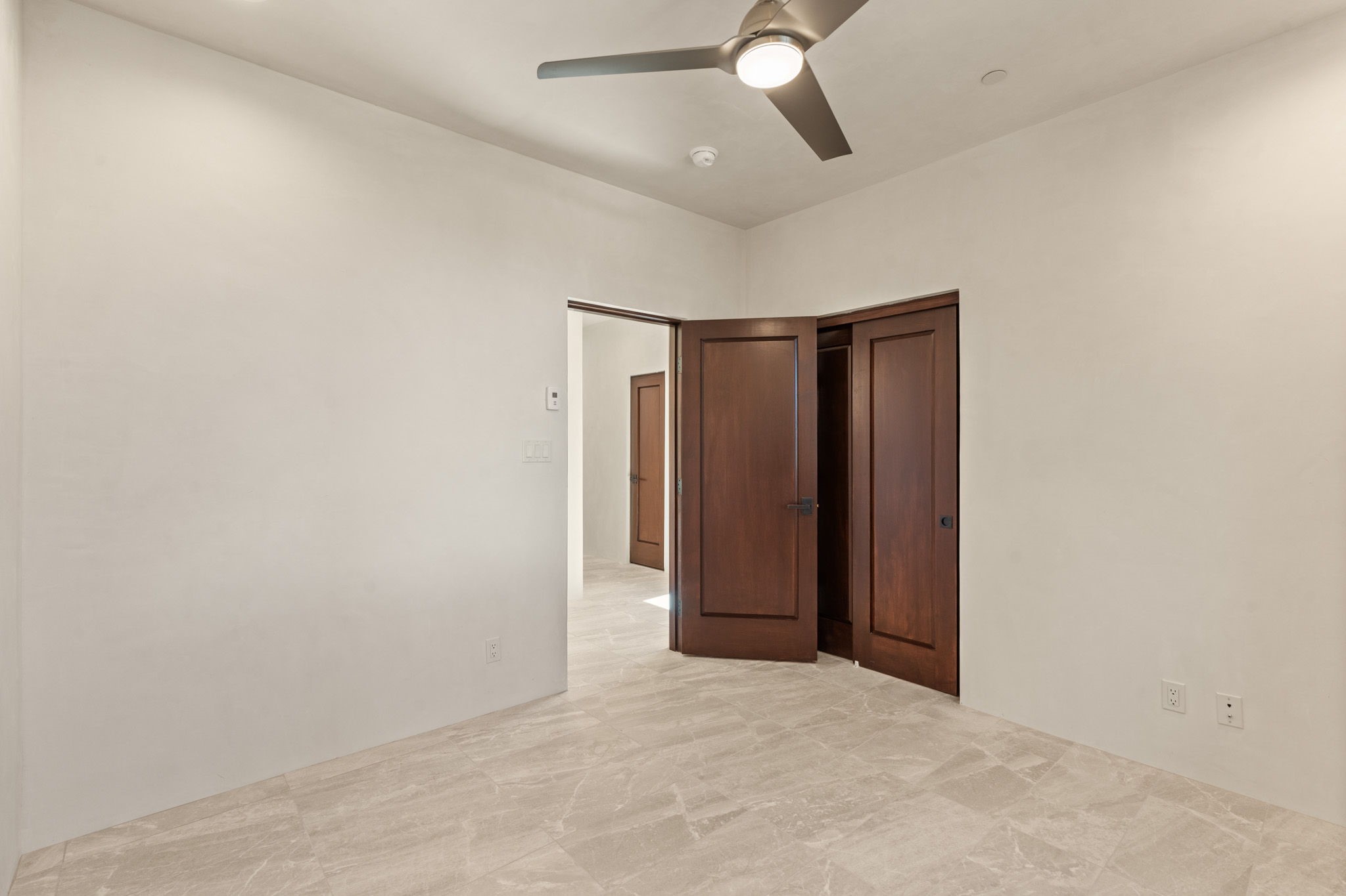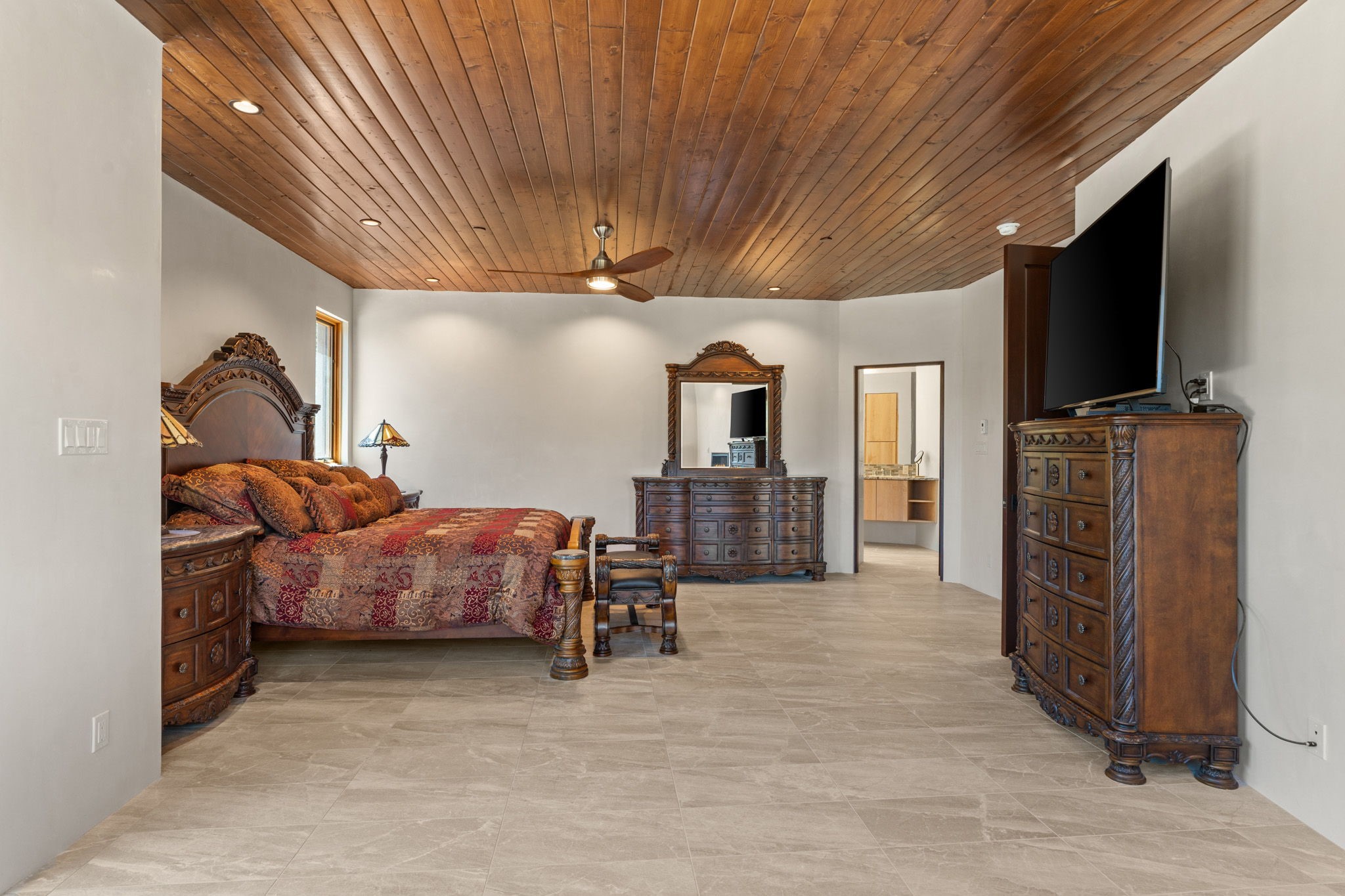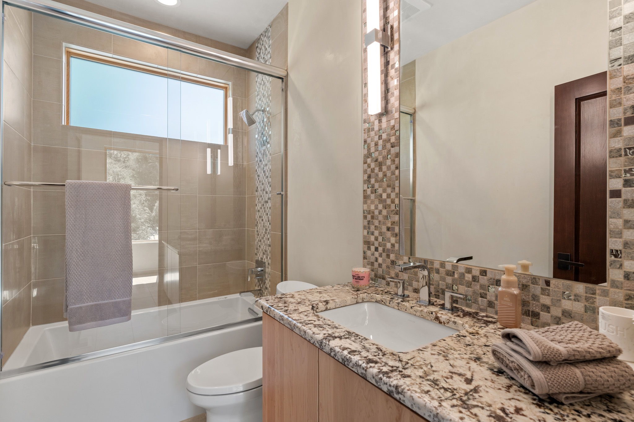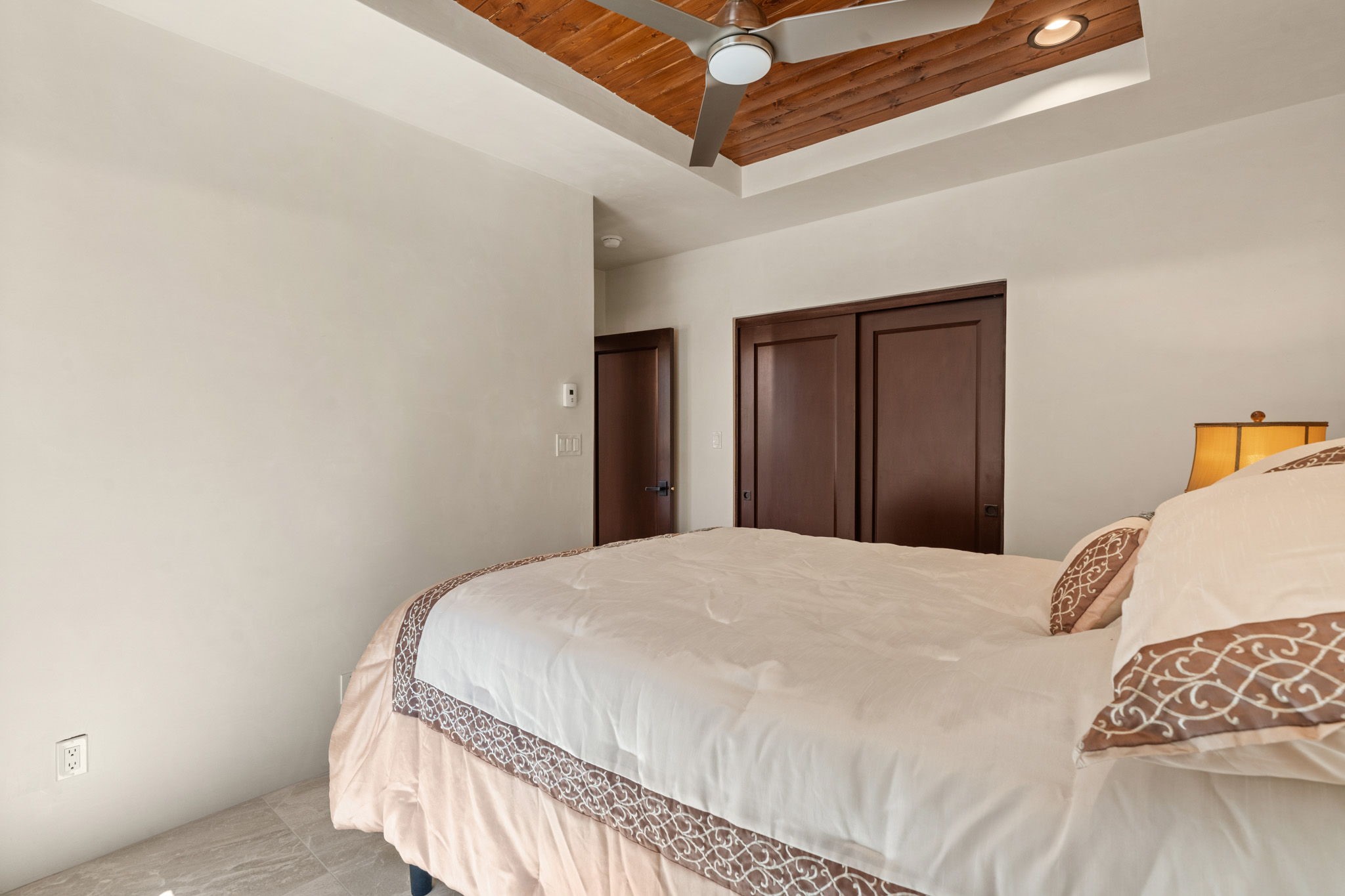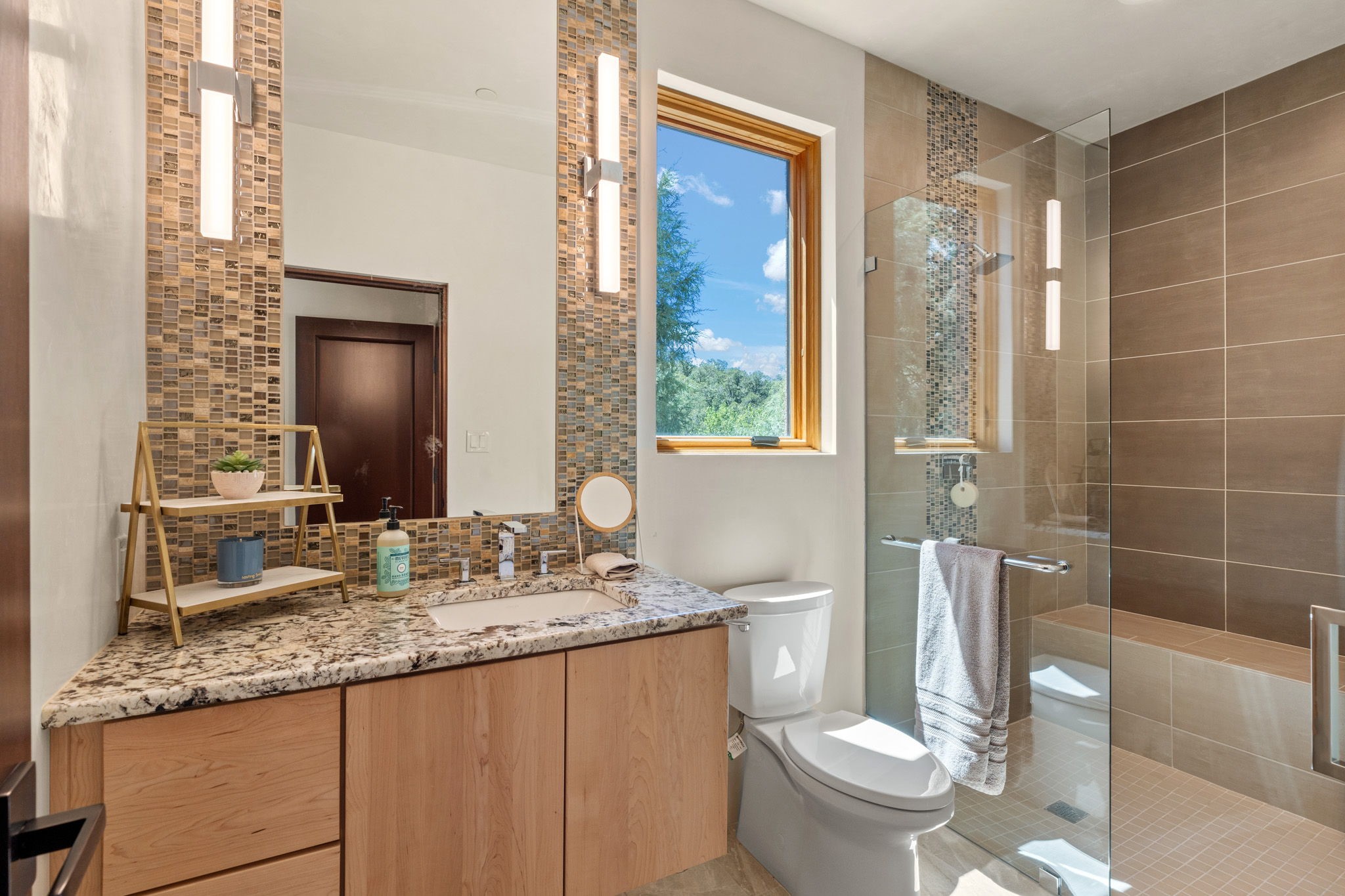 Outstanding contemporary home in the gated, private and paved Santa Fe Summit Subdivision located just minutes from Santa Fe's historic plaza, Canyon Road and the Santa Fe Ski basin. Sophisticated high-end property featuring a sleek and modern design with a 3-car finished garage, an open concept living room with 13' high beamed ceilings, a lineal fireplace and fabulous views. The spacious kitchen features a large center island, granite countertops, maple cabinets, and Wolf/Sub-Zero appliances. The elegant master suite has a wood ceiling, covered view deck, a sitting area with a lineal fireplace, and a well-appointed master bathroom with a jetted whirlpool. All of the living areas have plastered interior walls (diamond finish), 12" thick exterior walls (finished), 8'-10' tall contemporary Pella sliding doors and windows, stylish lighting and polished nickel fixtures, floating vanities, Italian porcelain flooring, thick maple doors, in-floor radiant heat, and refrigerated air conditioning (2 systems). This home was sited and designed to maximize views of the spectacular Sangre de Cristo mountains with a large exterior rear deck plus 3 covered portals. The circular driveway is surrounded with custom rockwork and the entire lot is fully landscaped with a drip-irrigation system, 4 planters, and numerous perennials, pinon and pine trees.