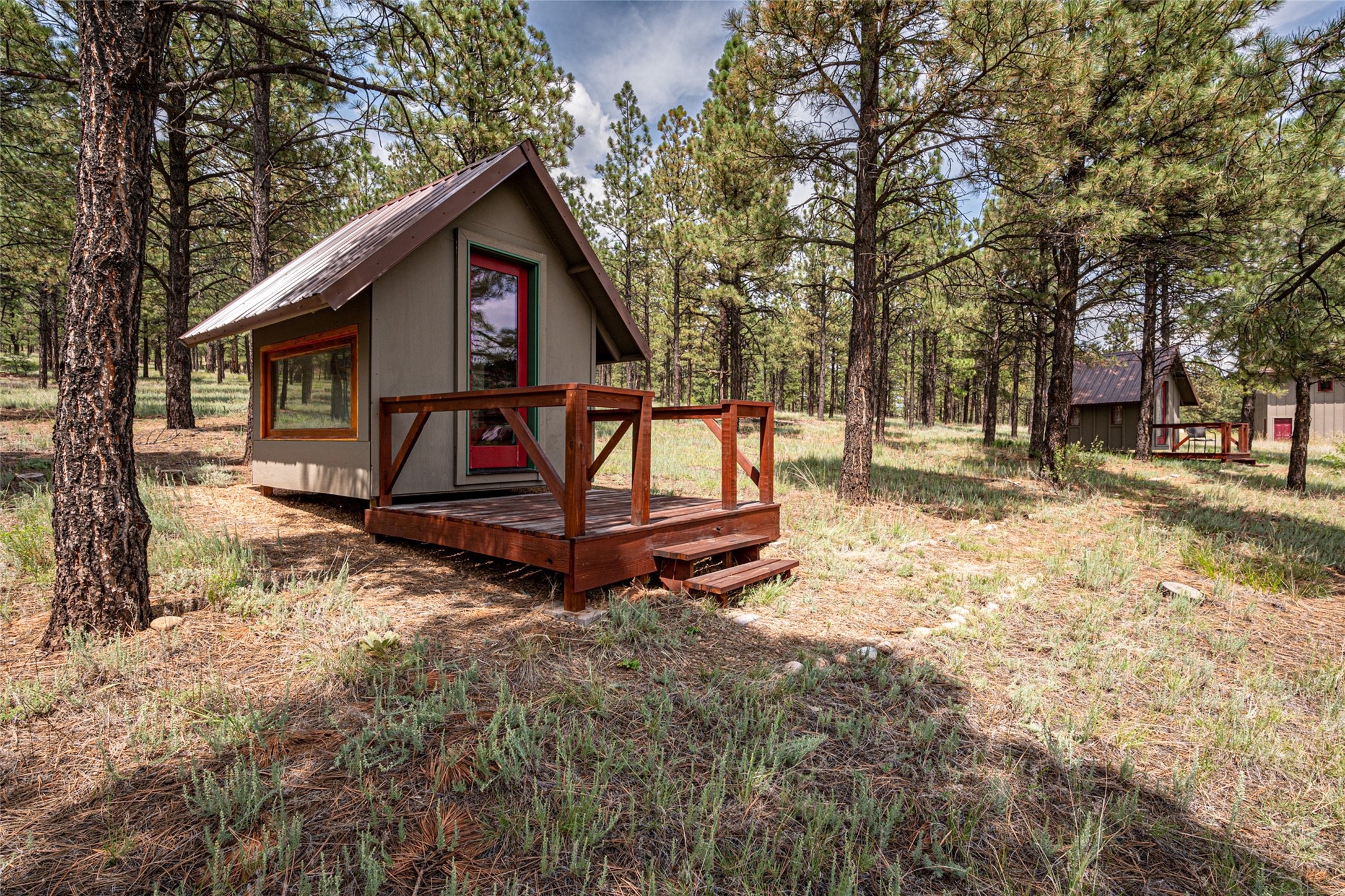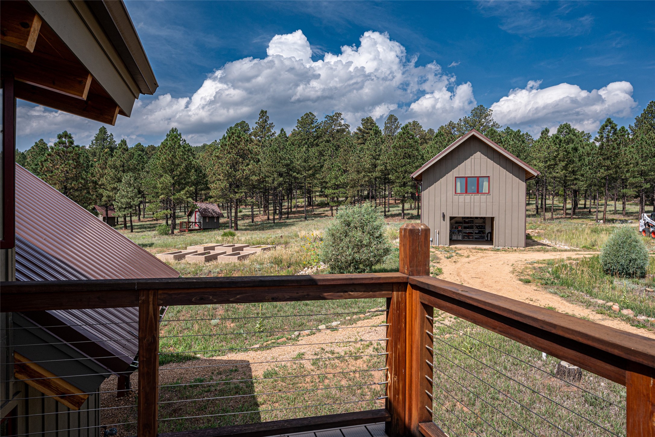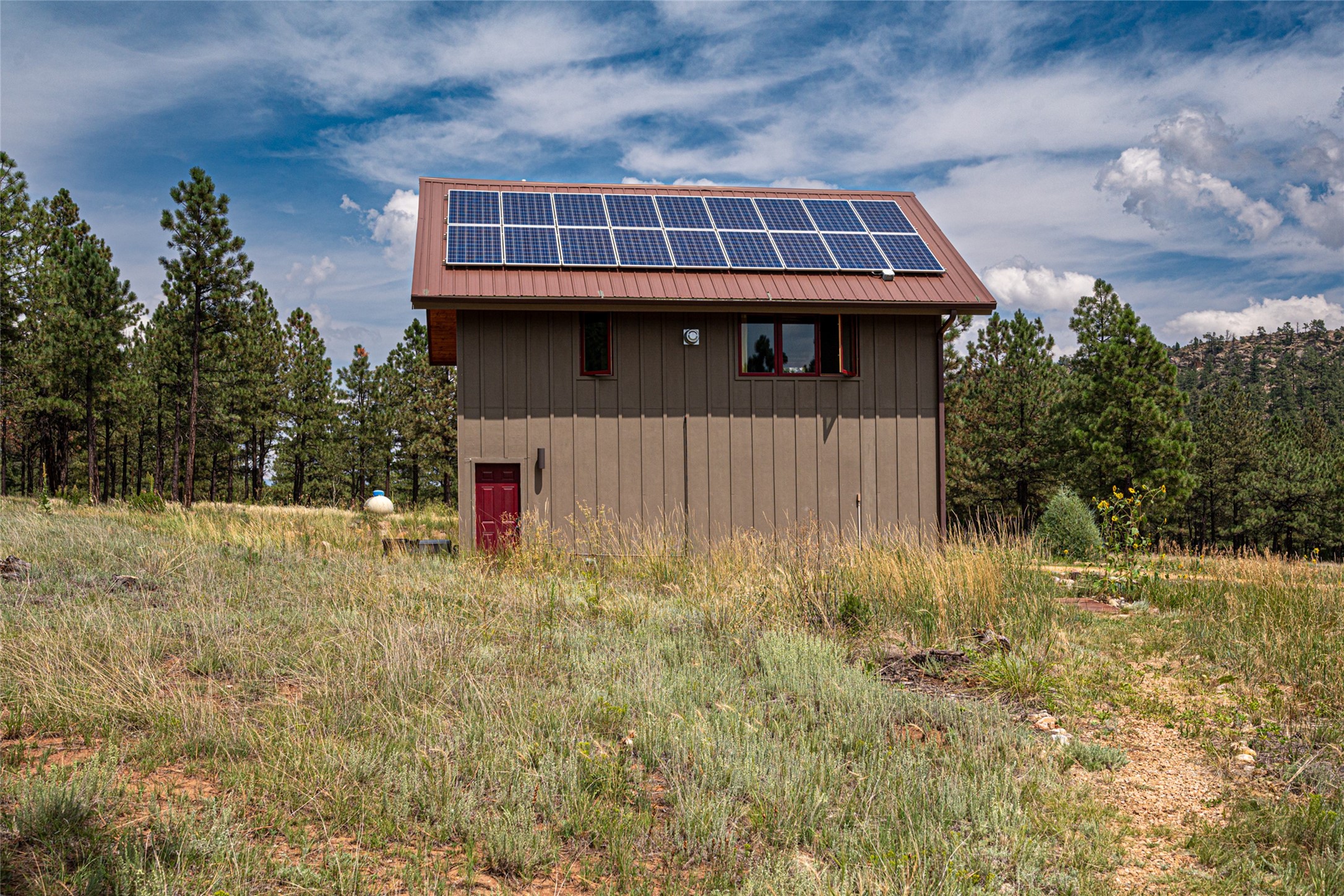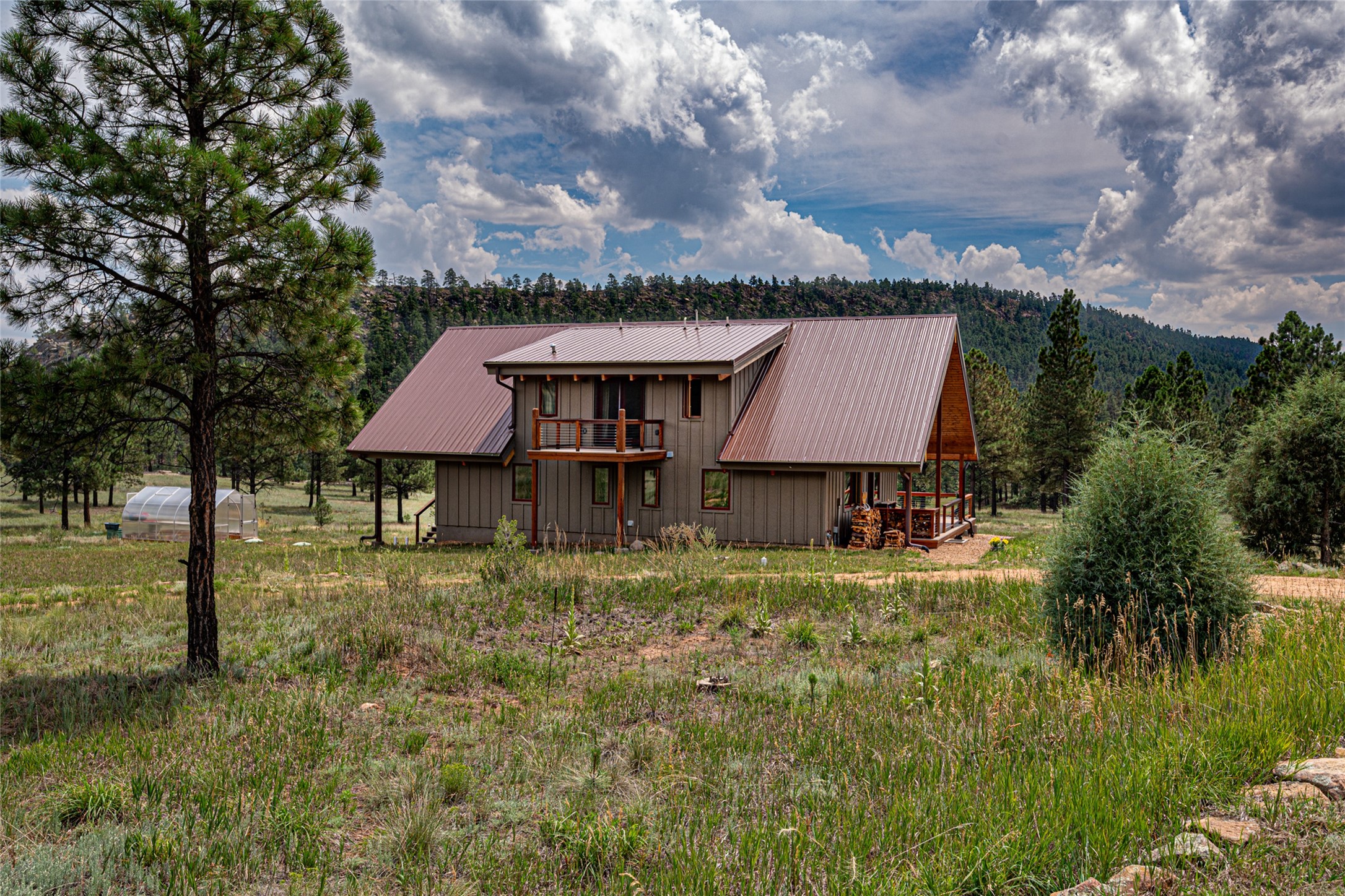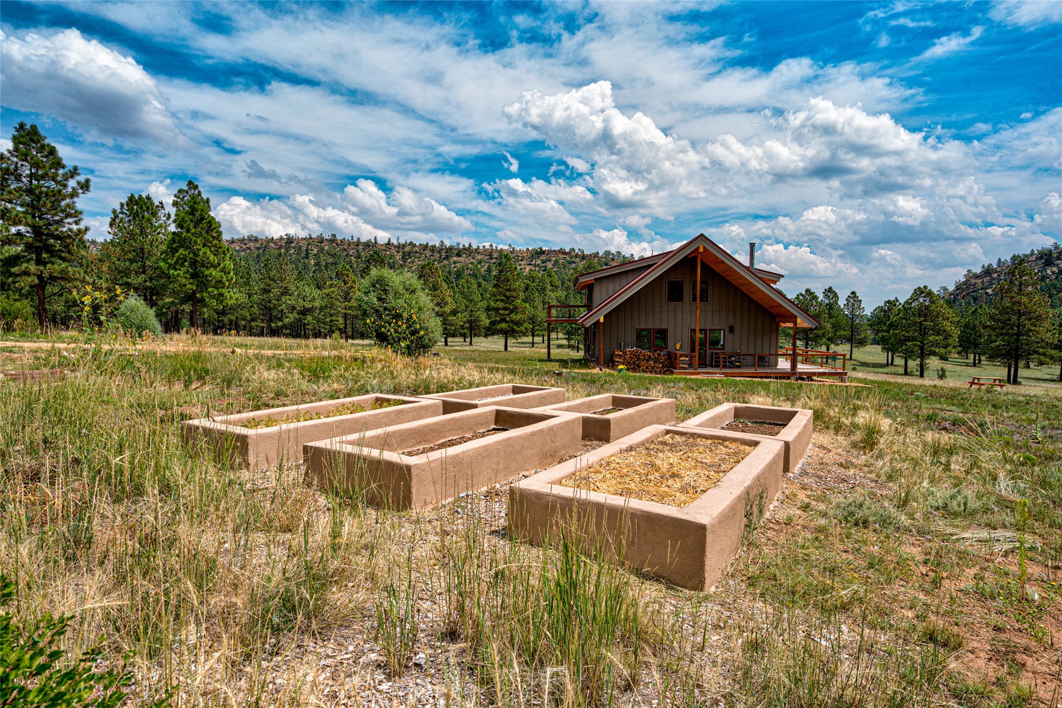 Located within the community of Blue Deer Ranch is a thoughtfully designed, off-the-grid, solar-powered, self-sufficient two-story house, garage with upstairs studio, two sleeping cabins, a greenhouse and raised beds for gardening. The main home is spacious with a vaulted tongue & groove fir ceiling and a loft that extends the full length of the house. At either end of the loft there is a 10 by 8.5-foot open space. The primary suite is upstairs with a full bathroom and balcony. Downstairs there is a guest bedroom with an ensuite bathroom, a second bedroom with 4 built-in bunk beds and a third bathroom with tiled walk-in shower. The kitchen, dining area and living room span an open floor plan. The expansive windows offer stunning views of the surrounding forest and ridge. The home is encircled on three sides by an 8-foot lifetime aluminum deck. The house is extremely well insulated with a passive solar design and maintains an excellent level of comfort even in the dead of winter on sunny days. There is a 3 cubic foot wood stove that burns up to 10 hours and in-floor propane radiant heating. During the warm months, no cooling is required, by opening several windows at night and shutting them in the morning to maintain a cool, fresh atmosphere all day. The property sits at 7,300 feet and the nights are always cool. Blue Deer Ranch comprises 703 acres in total and is shared with neighbors in a unique shared land ownership arrangement. There are 16 individual use area parcels, each approximately 10-acres. This property includes 4 individual use areas giving the owner a 25% indivisible interest in the entire 703-acre ranch. The house sits on individual use area #4. The three other individual use areas (5, 6 & 7) are undeveloped. The remaining 543 acres of the ranch is community land that is available for hiking and exploration.