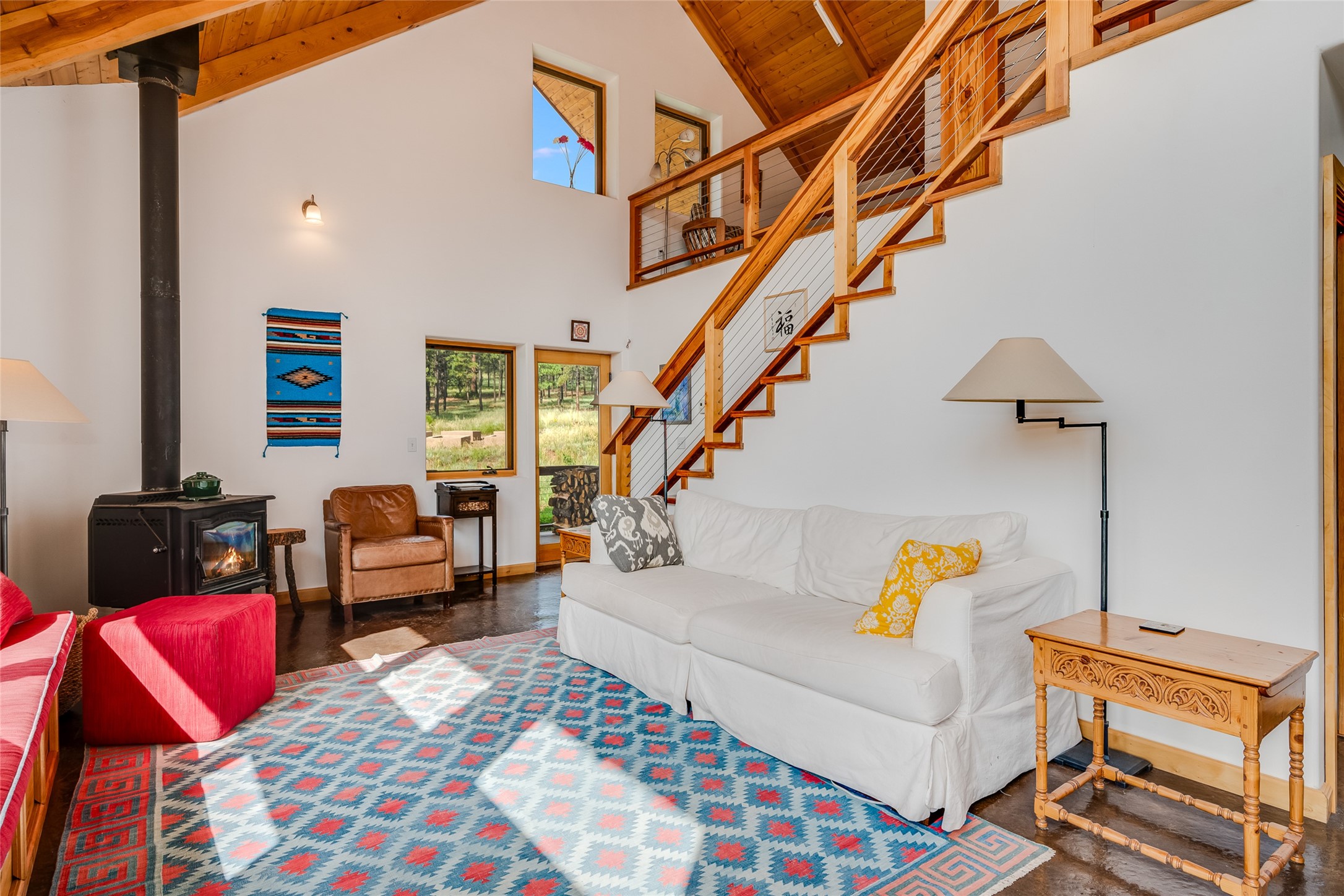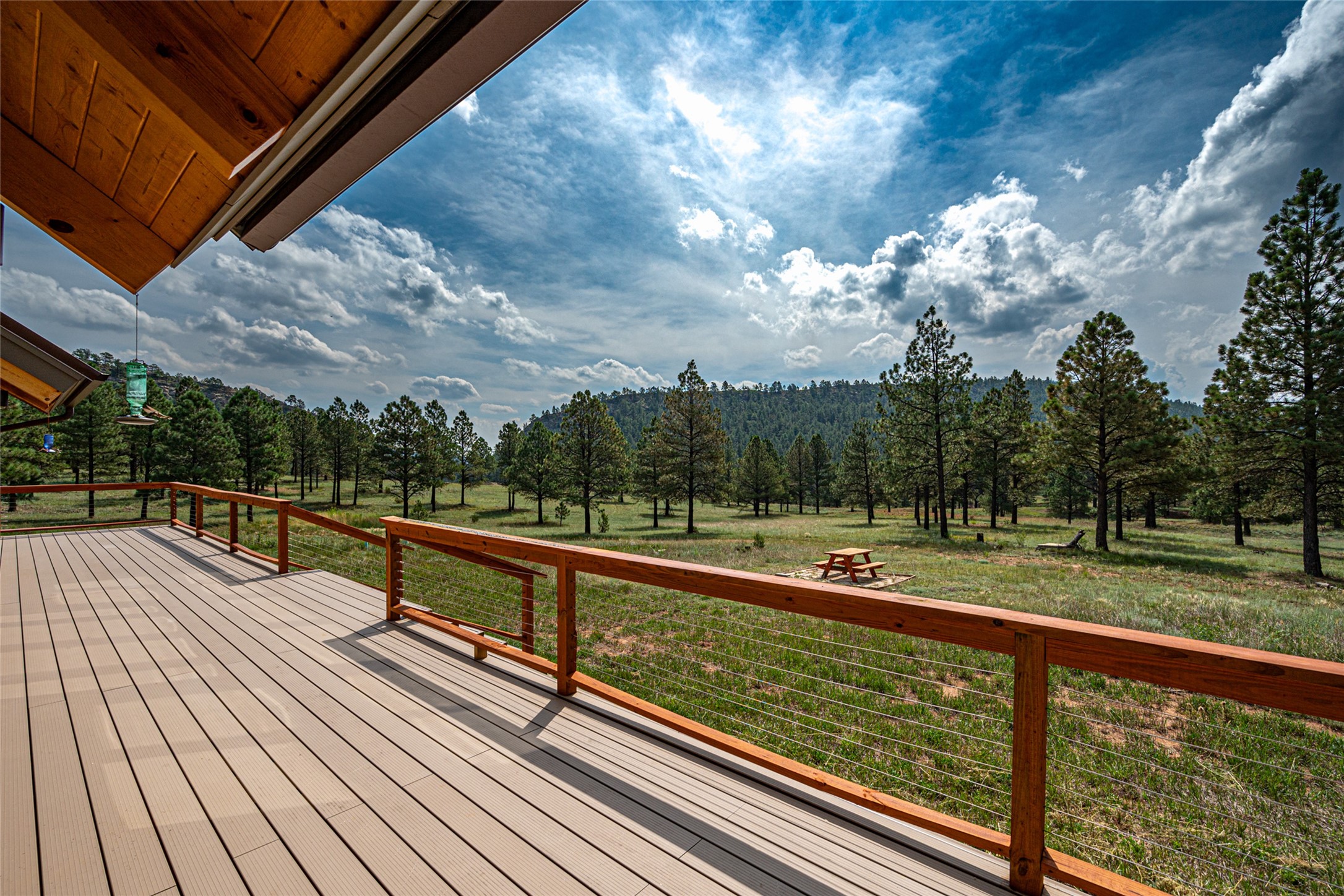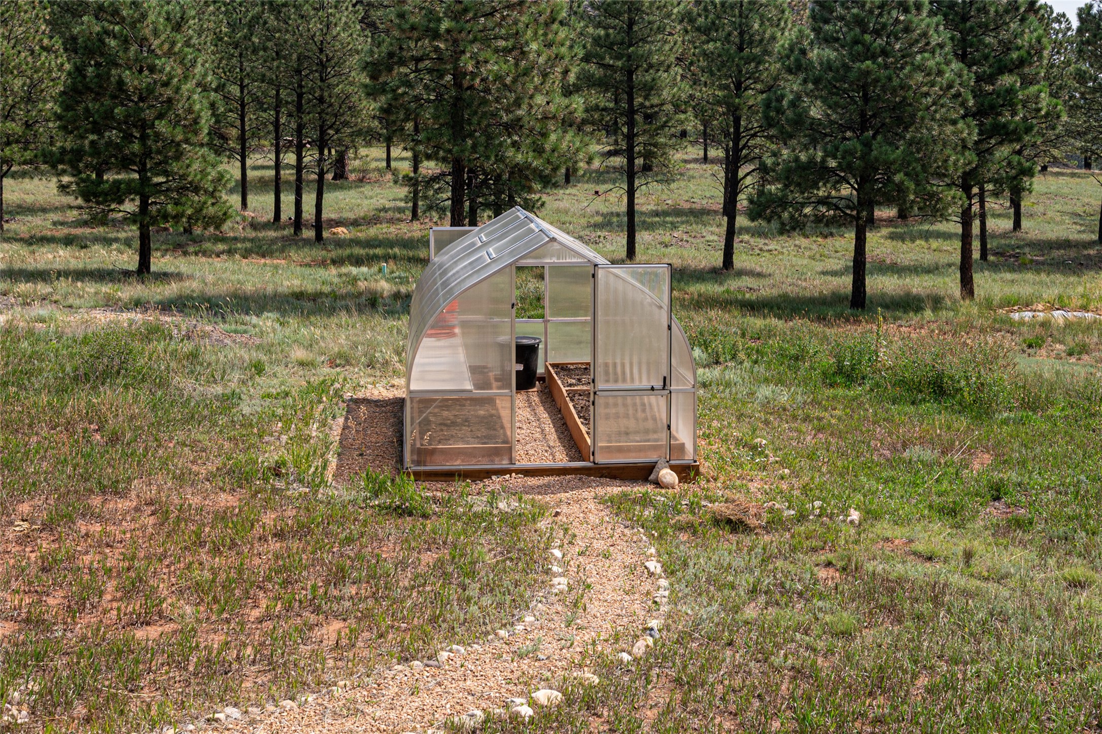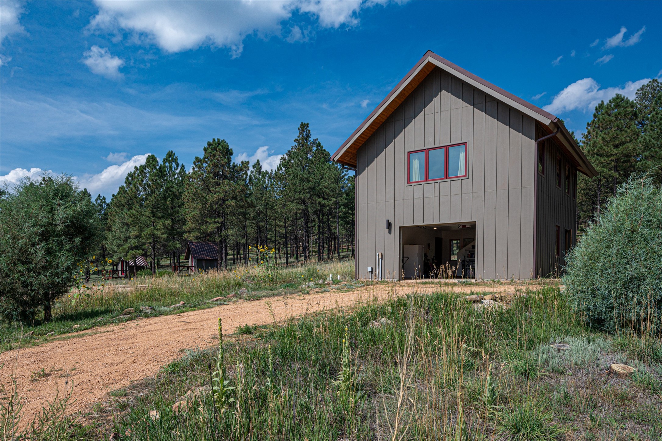 Located within the community of Blue Deer Ranch is a thoughtfully designed, off-the-grid, solar-powered, self-sufficient two-story house, garage with upstairs studio, two sleeping cabins, a greenhouse and raised beds for gardening. The main home is spacious with a vaulted tongue & groove fir ceiling and a loft that extends the full length of the house. At either end of the loft there is a 10 by 8.5-foot open space. The primary suite is upstairs with a full bathroom and balcony. Downstairs there is a guest bedroom with an ensuite bathroom, a second bedroom with 4 built-in bunk beds and a third bathroom with tiled walk-in shower. The kitchen, dining area and living room span an open floor plan. The expansive windows offer stunning views of the surrounding forest and ridge. The home is encircled on three sides by an 8-foot lifetime aluminum deck. The house is extremely well insulated with a passive solar design and maintains an excellent level of comfort even in the dead of winter on sunny days. There is a 3 cubic foot wood stove that burns up to 10 hours and in-floor propane radiant heating. During the warm months, no cooling is required, by opening several windows at night and shutting them in the morning to maintain a cool, fresh atmosphere all day. The property sits at 7,300 feet and the nights are always cool. Blue Deer Ranch comprises 703 acres in total and is shared with neighbors in a unique shared land ownership arrangement. There are 16 individual use area parcels, each approximately 10-acres. This property includes 4 individual use areas giving the owner a 25% indivisible interest in the entire 703-acre ranch. The house sits on individual use area #4. The three other individual use areas (5, 6 & 7) are undeveloped. The remaining 543 acres of the ranch is community land that is available for hiking and exploration.