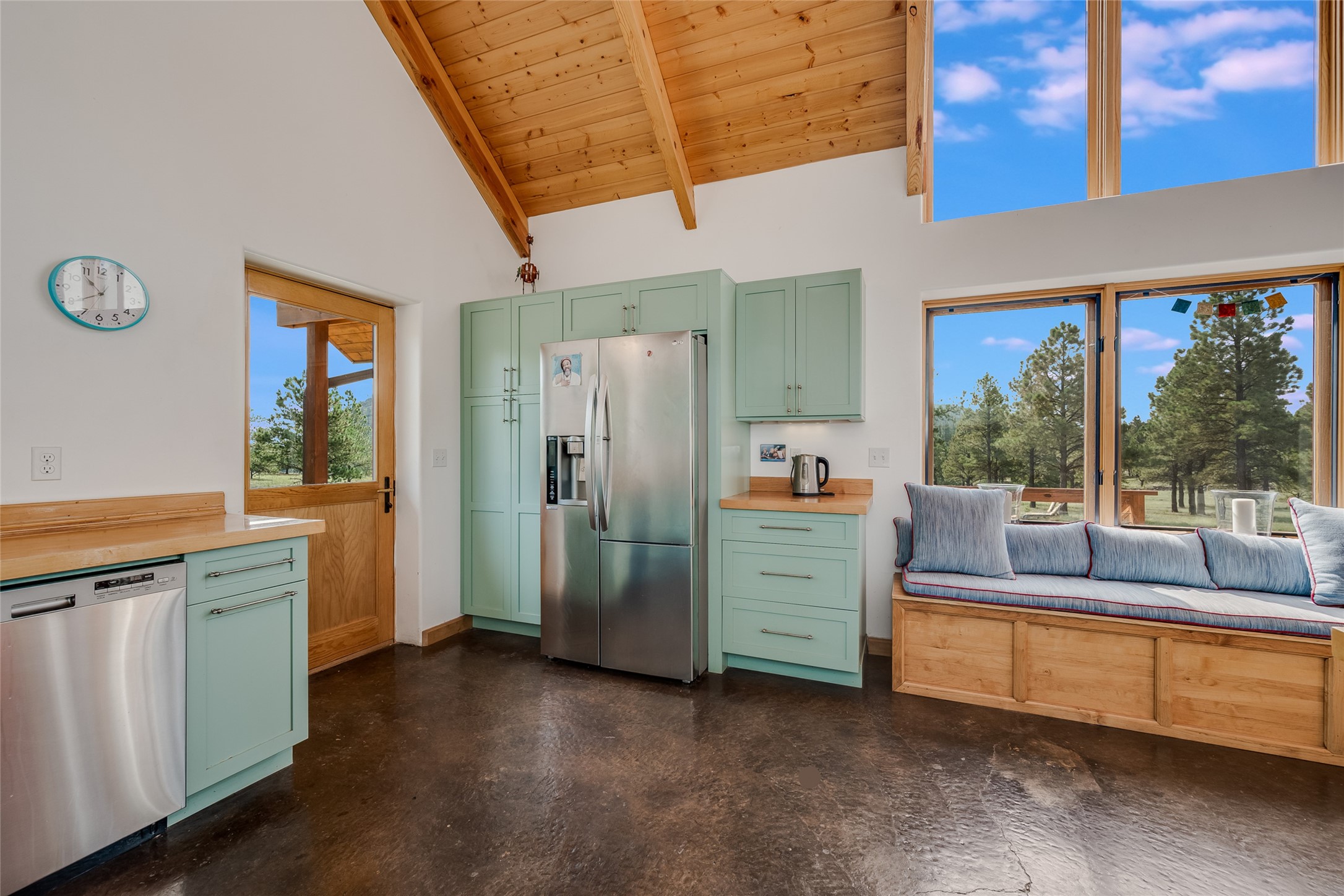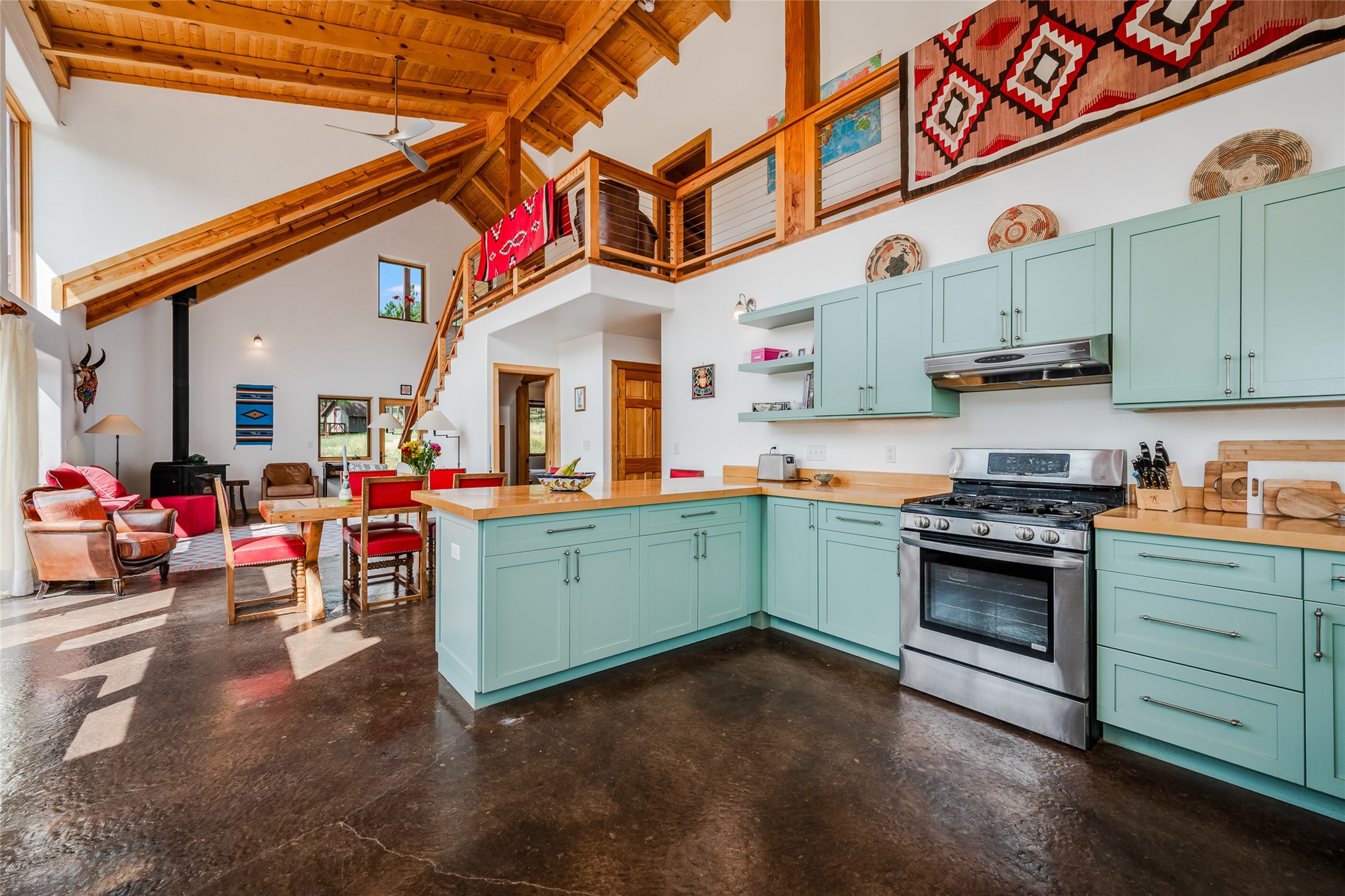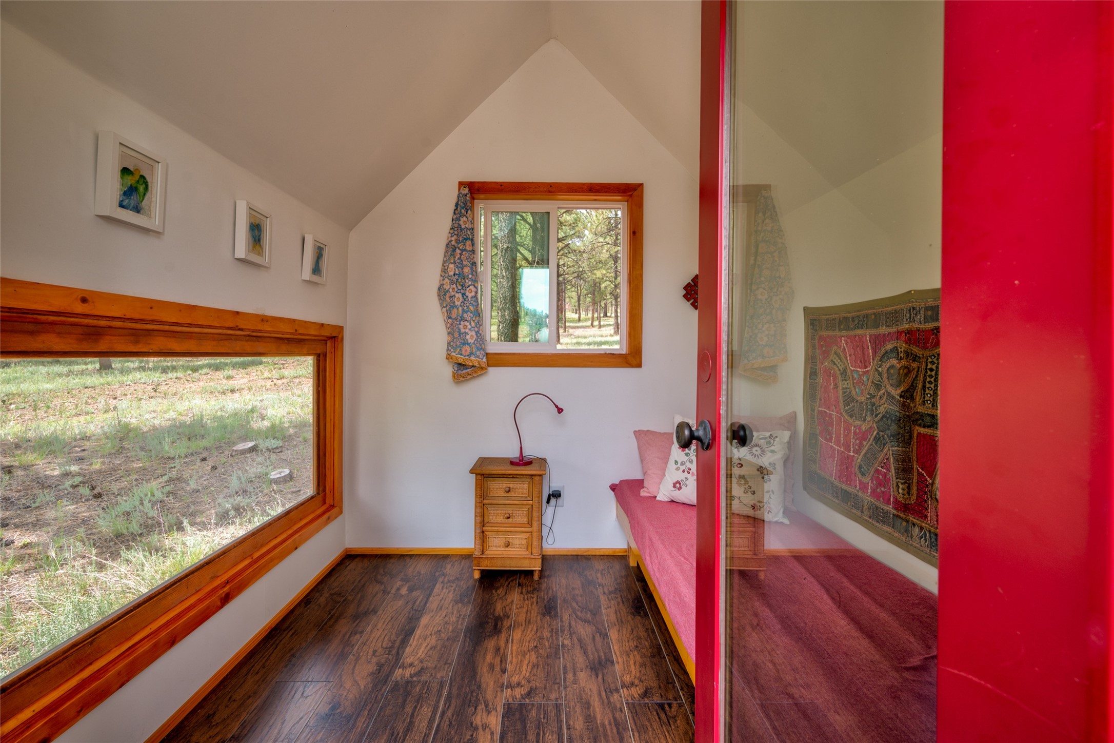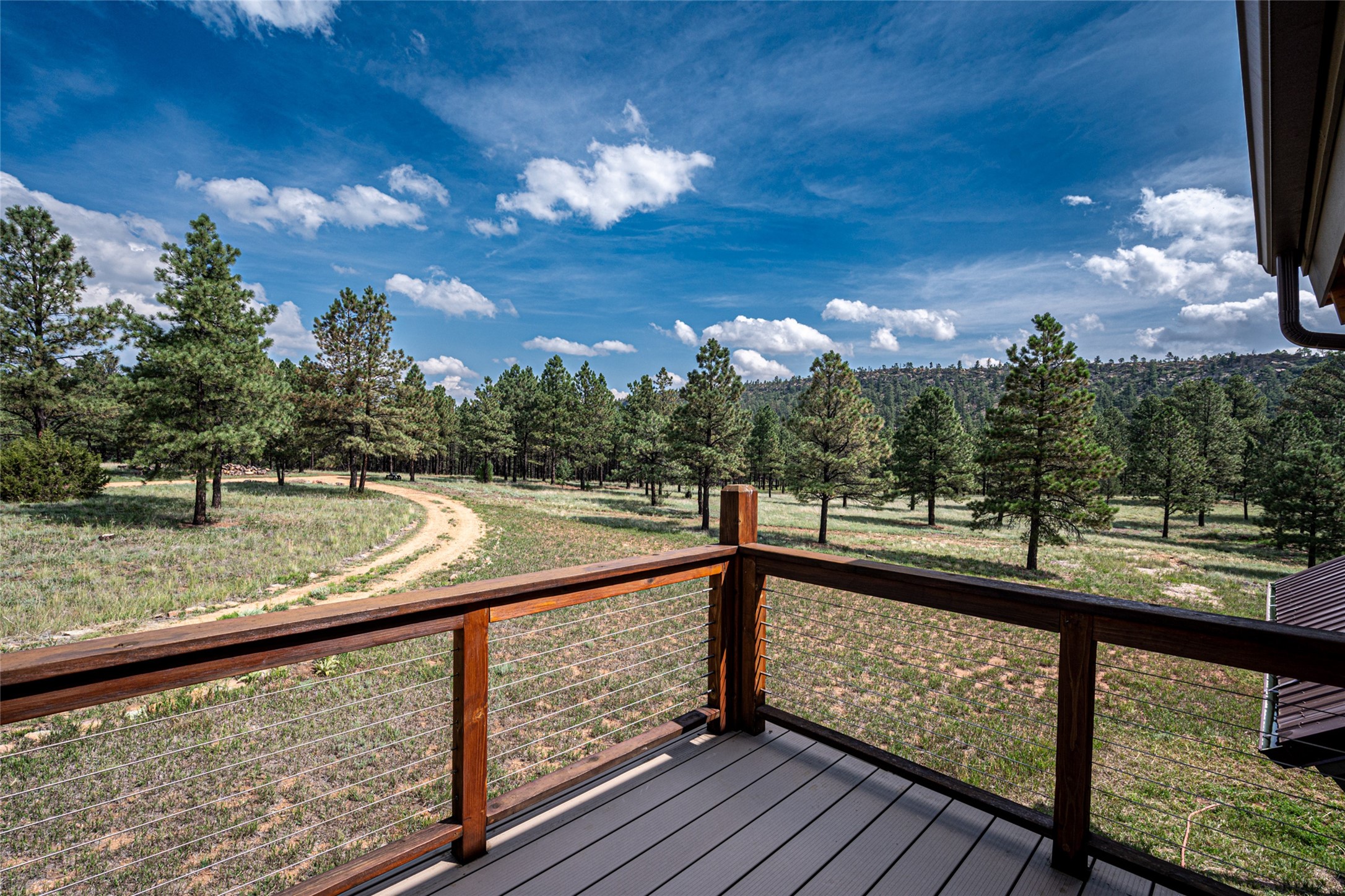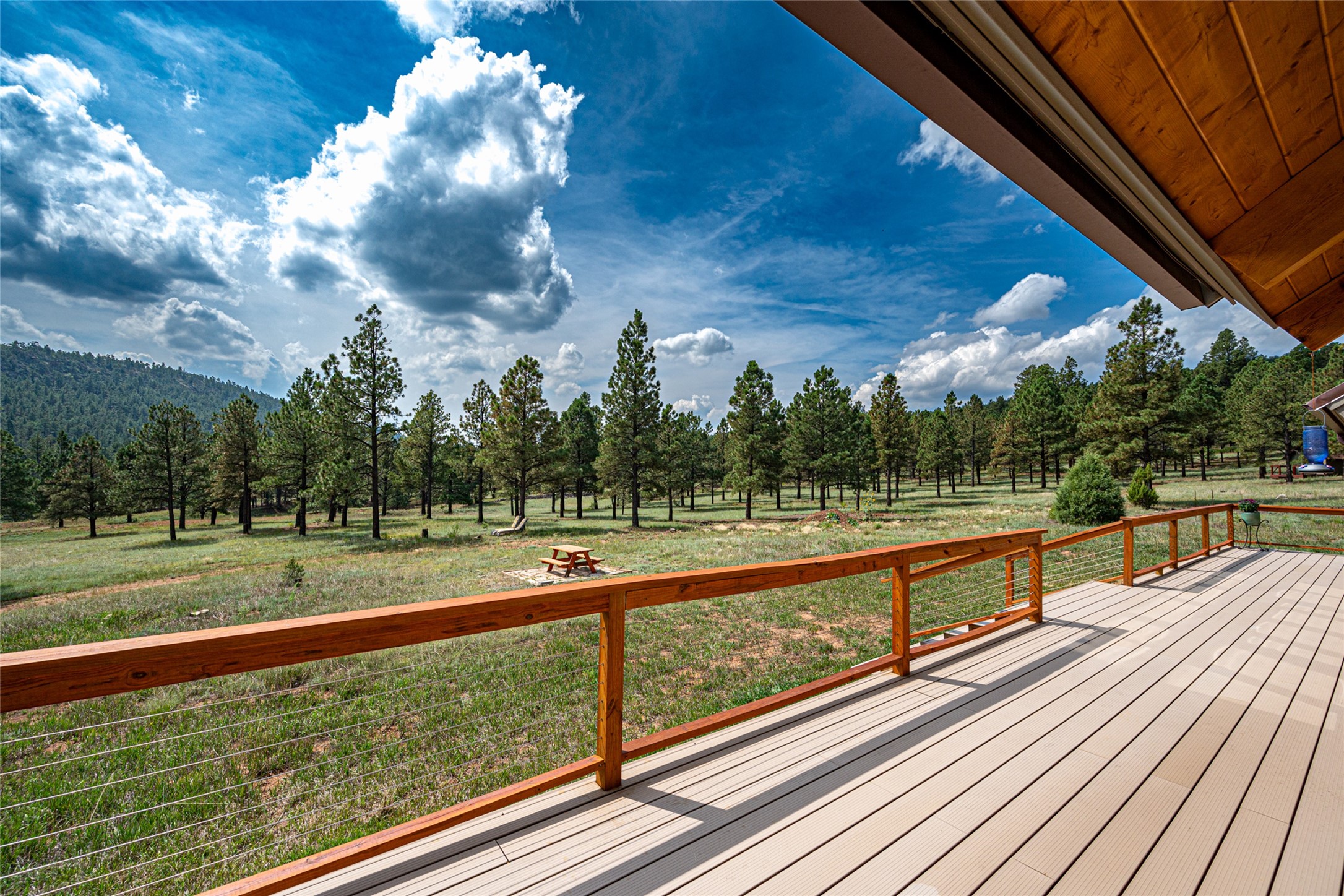 Located within the community of Blue Deer Ranch is a thoughtfully designed, off-the-grid, solar-powered, self-sufficient two-story house, garage with upstairs studio, two sleeping cabins, a greenhouse and raised beds for gardening. The main home is spacious with a vaulted tongue & groove fir ceiling and a loft that extends the full length of the house. At either end of the loft there is a 10 by 8.5-foot open space. The primary suite is upstairs with a full bathroom and balcony. Downstairs there is a guest bedroom with an ensuite bathroom, a second bedroom with 4 built-in bunk beds and a third bathroom with tiled walk-in shower. The kitchen, dining area and living room span an open floor plan. The expansive windows offer stunning views of the surrounding forest and ridge. The home is encircled on three sides by an 8-foot lifetime aluminum deck. The house is extremely well insulated with a passive solar design and maintains an excellent level of comfort even in the dead of winter on sunny days. There is a 3 cubic foot wood stove that burns up to 10 hours and in-floor propane radiant heating. During the warm months, no cooling is required, by opening several windows at night and shutting them in the morning to maintain a cool, fresh atmosphere all day. The property sits at 7,300 feet and the nights are always cool. Blue Deer Ranch comprises 703 acres in total and is shared with neighbors in a unique shared land ownership arrangement. There are 16 individual use area parcels, each approximately 10-acres. This property includes 4 individual use areas giving the owner a 25% indivisible interest in the entire 703-acre ranch. The house sits on individual use area #4. The three other individual use areas (5, 6 & 7) are undeveloped. The remaining 543 acres of the ranch is community land that is available for hiking and exploration.