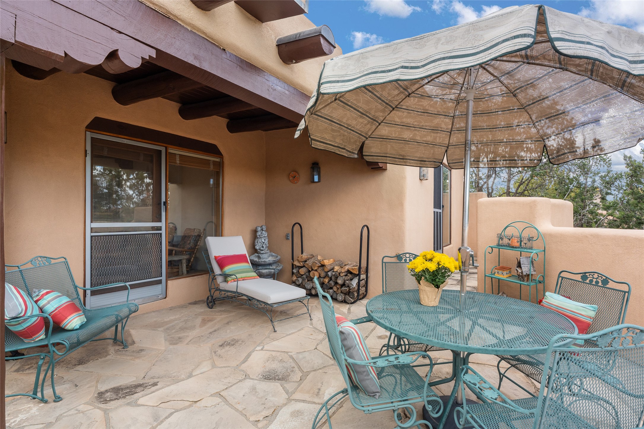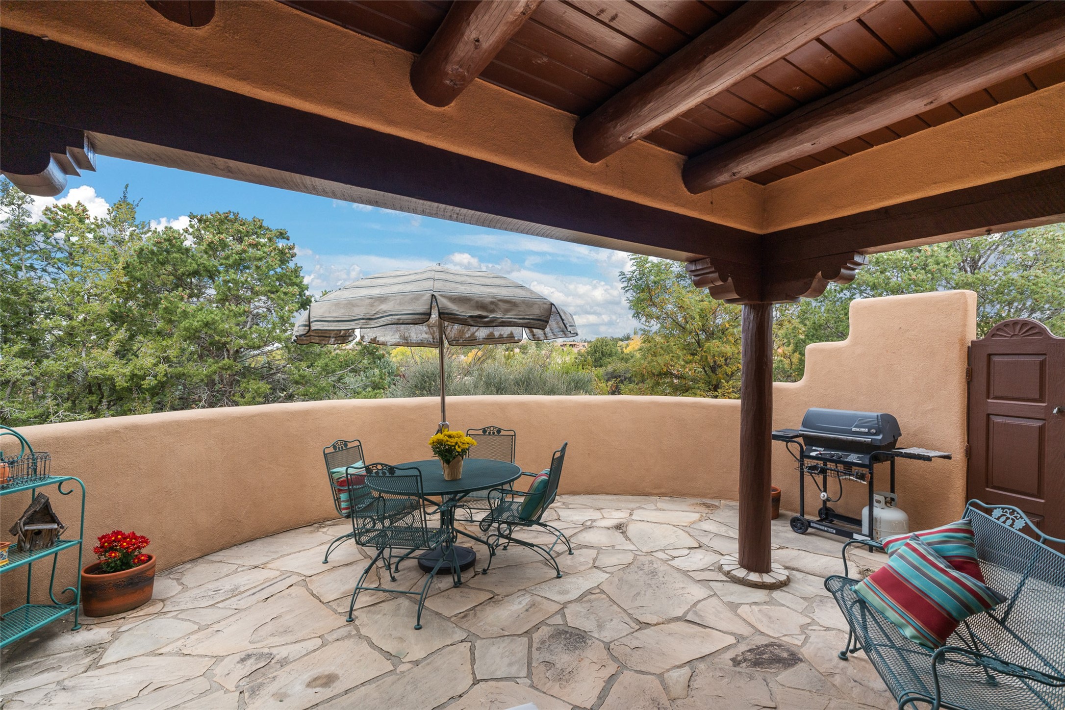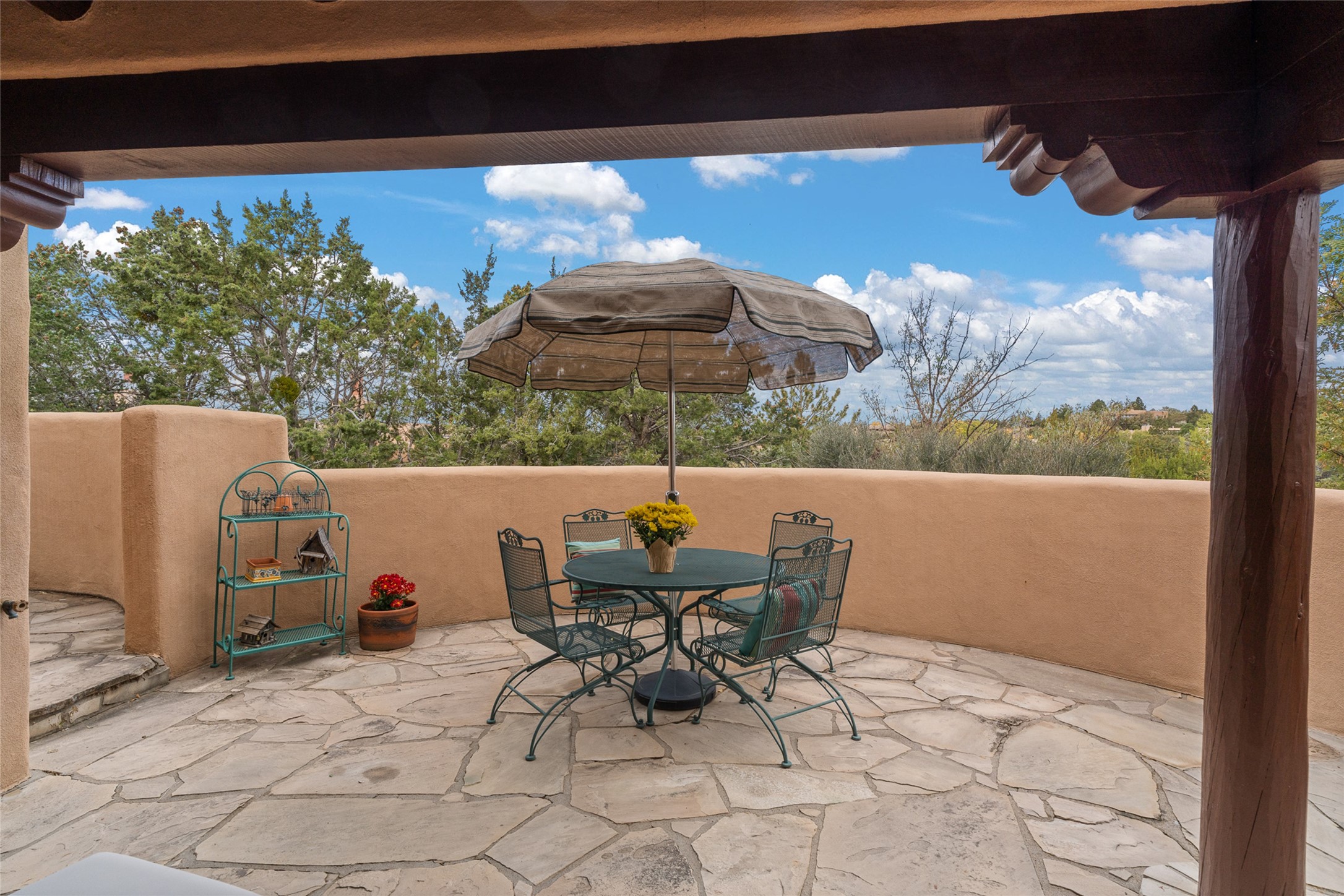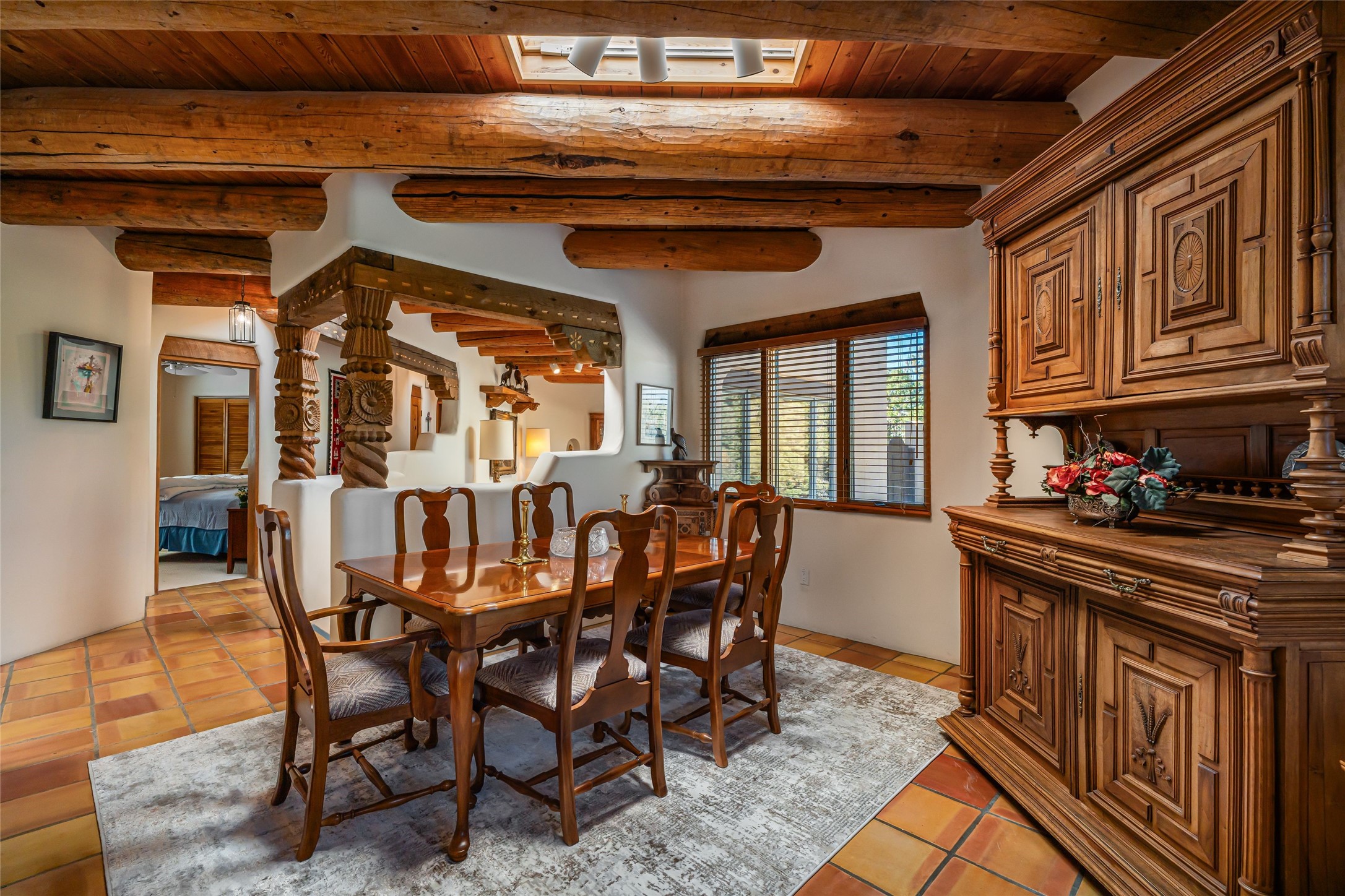 Are you looking for the ideal second home or home to retire to in Santa Fe? If so, look at this two-bedroom, three-bath home in Las Barrancas, just minutes from the Santa Fe Plaza. Sonny Otero built the house and offers all the beautiful Santa Fe finishes with Vigas, hand-carved Corbels and shelving and beams, Nichos, Saltillo Tile flooring, Talavara Tile counters, and courtyards. Features include an entry through a garden room that provides privacy, two walled courtyards for enjoying the Santa Fe weather, and a low-maintenance yard/garden. This home should not be missed!
