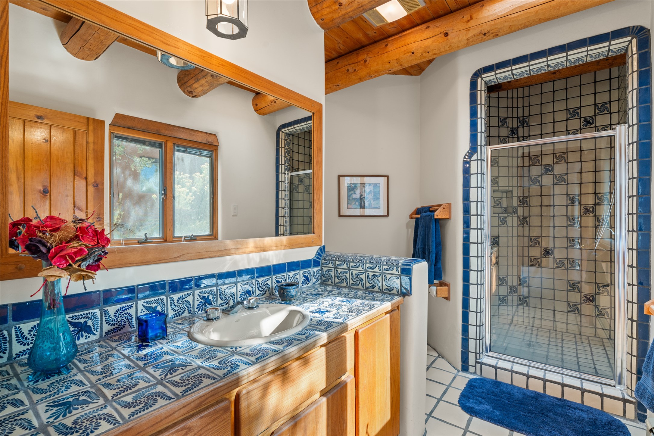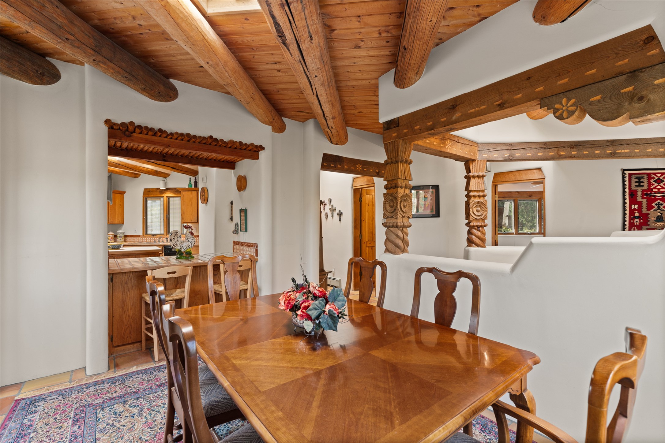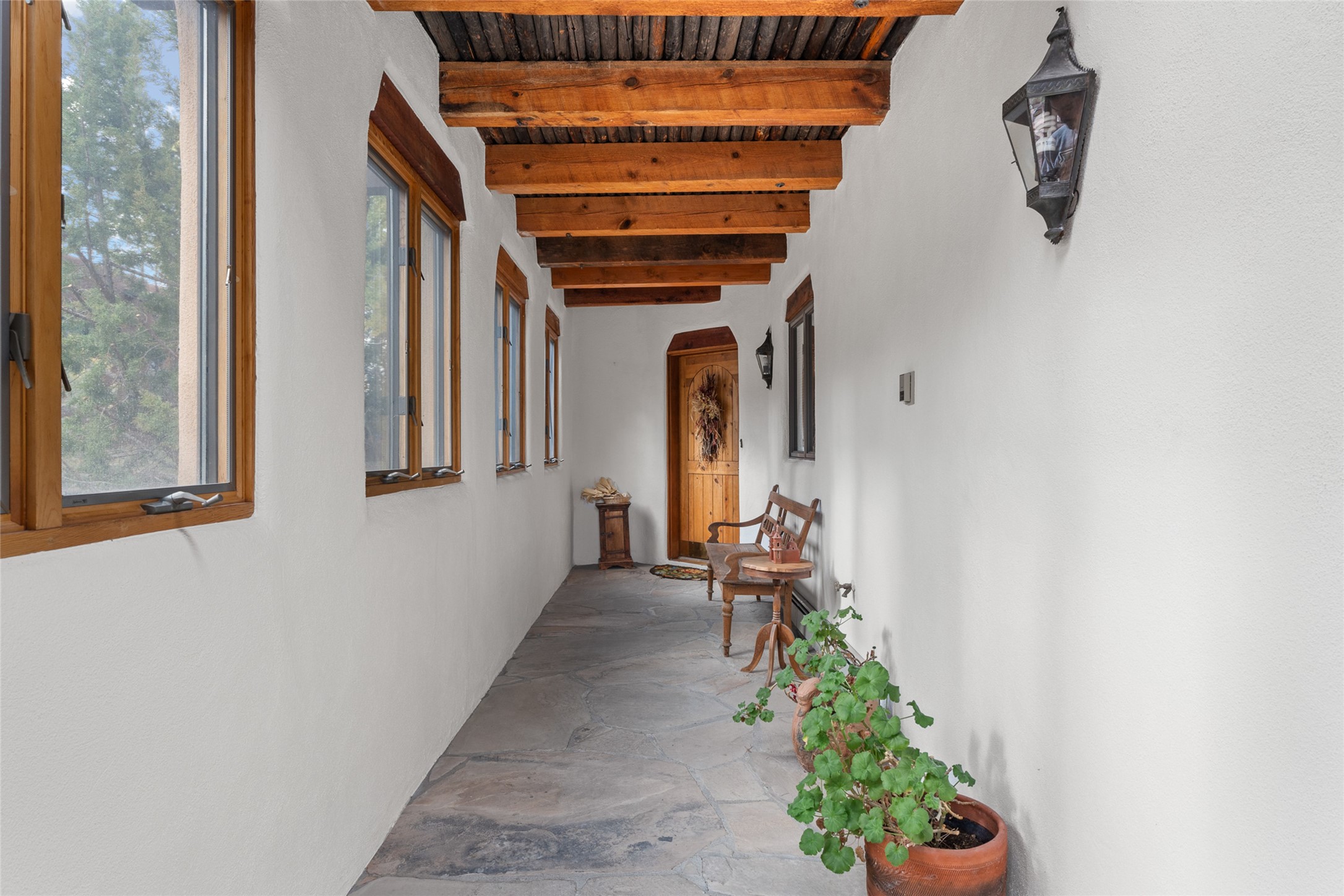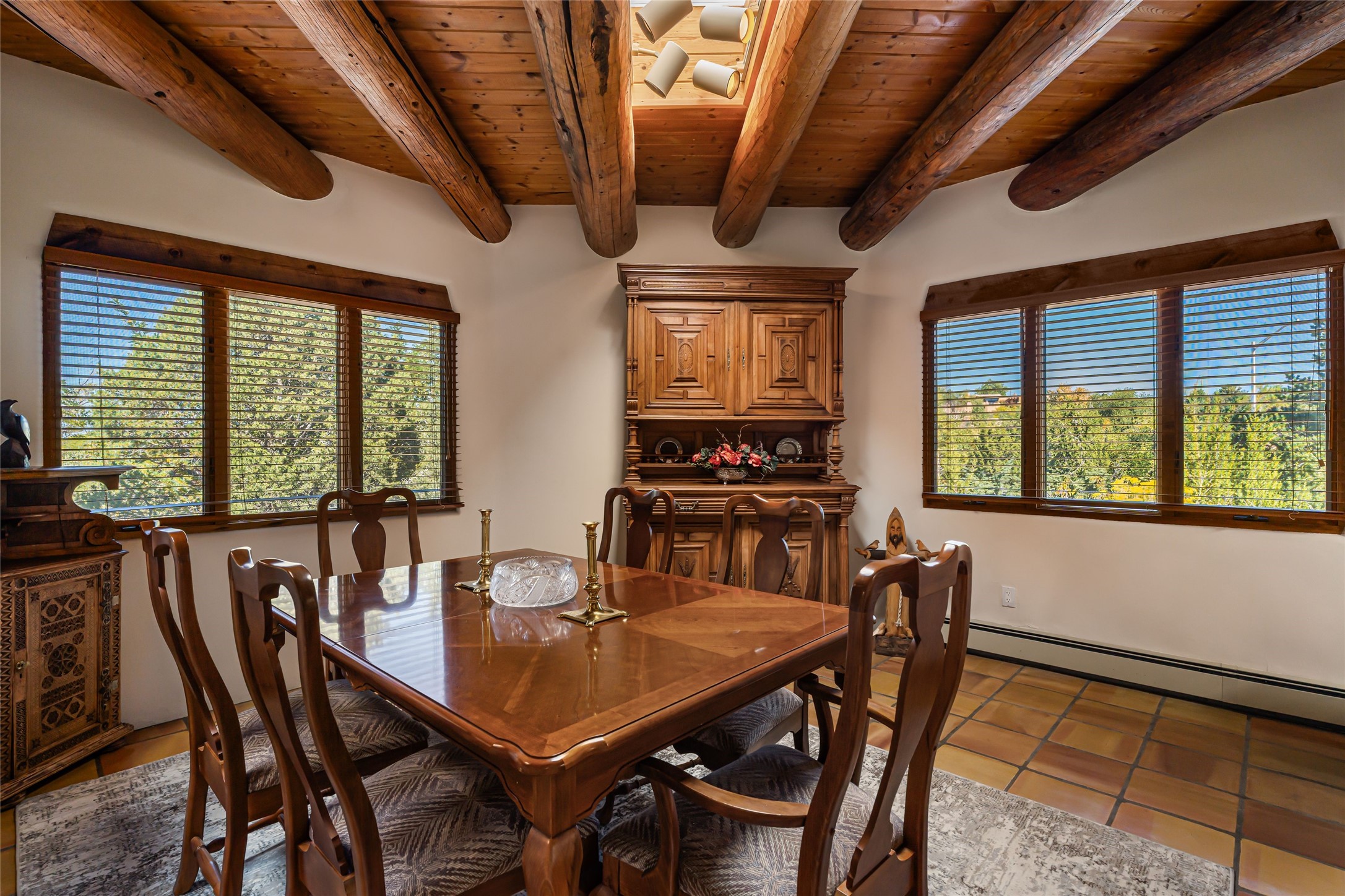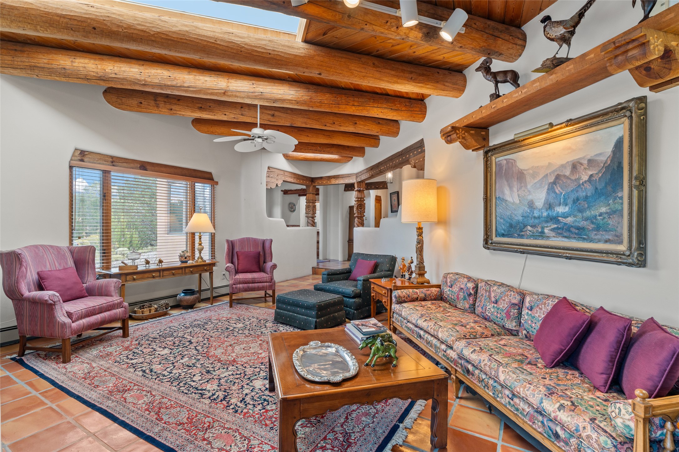 Are you looking for the ideal second home or home to retire to in Santa Fe? If so, look at this two-bedroom, three-bath home in Las Barrancas, just minutes from the Santa Fe Plaza. Sonny Otero built the house and offers all the beautiful Santa Fe finishes with Vigas, hand-carved Corbels and shelving and beams, Nichos, Saltillo Tile flooring, Talavara Tile counters, and courtyards. Features include an entry through a garden room that provides privacy, two walled courtyards for enjoying the Santa Fe weather, and a low-maintenance yard/garden. This home should not be missed!