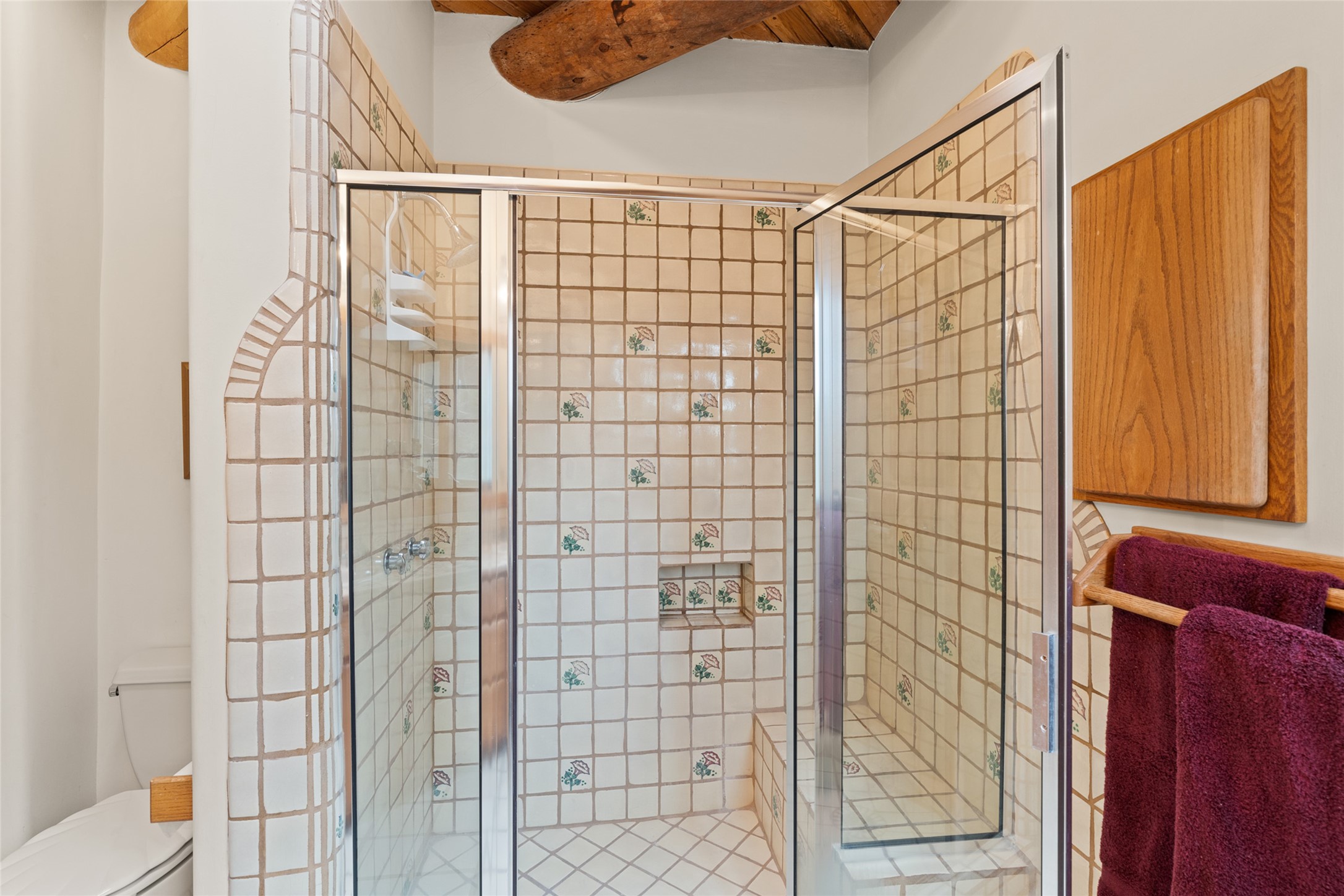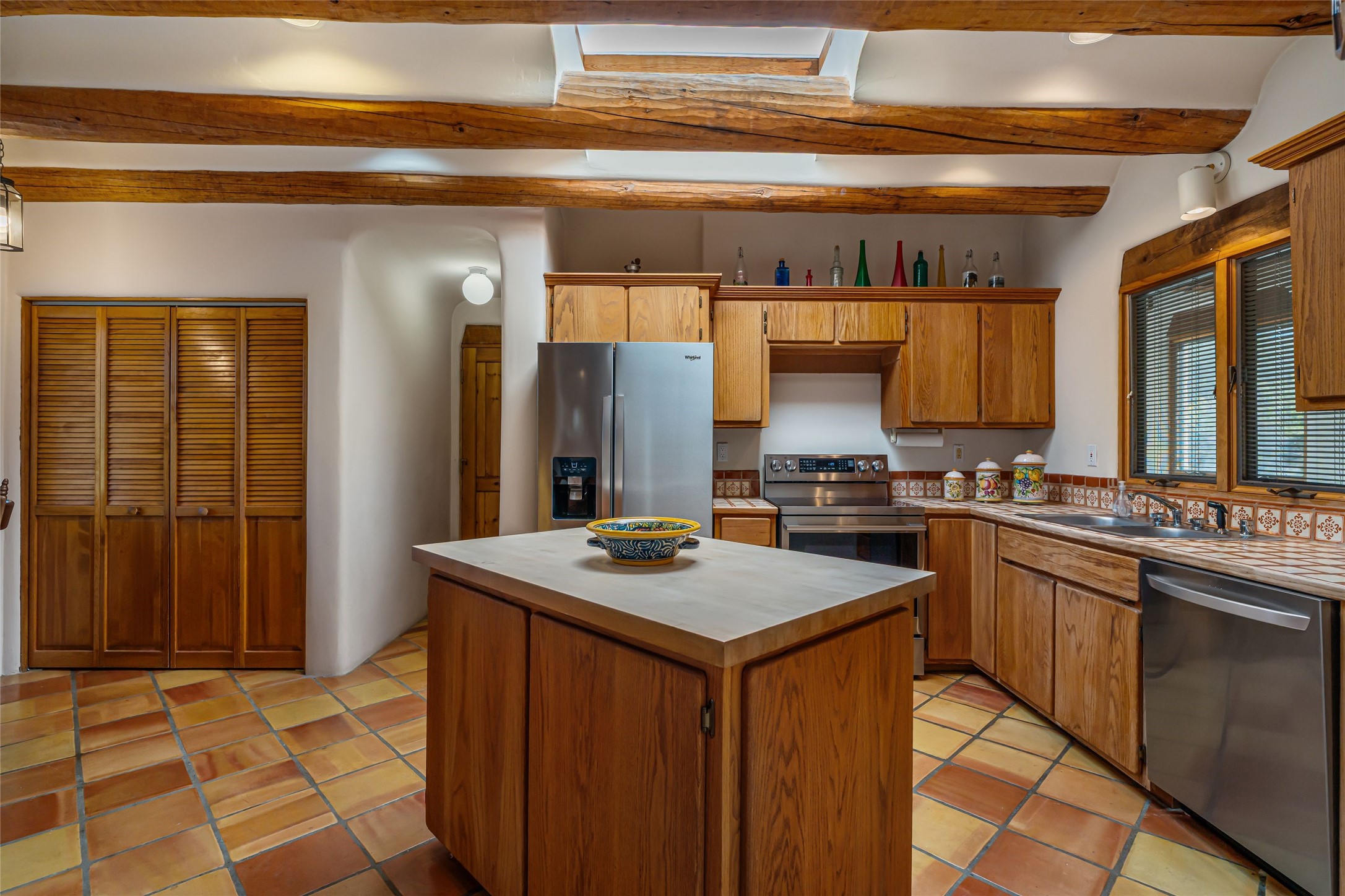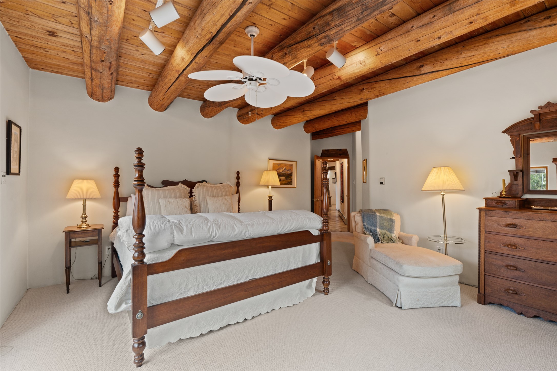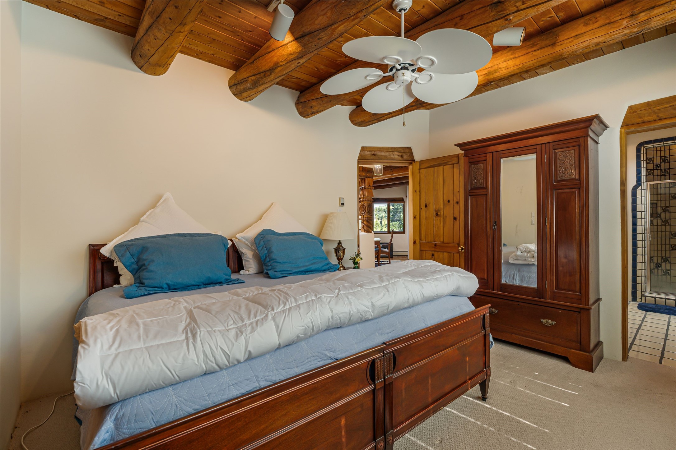 Are you looking for the ideal second home or home to retire to in Santa Fe? If so, look at this two-bedroom, three-bath home in Las Barrancas, just minutes from the Santa Fe Plaza. Sonny Otero built the house and offers all the beautiful Santa Fe finishes with Vigas, hand-carved Corbels and shelving and beams, Nichos, Saltillo Tile flooring, Talavara Tile counters, and courtyards. Features include an entry through a garden room that provides privacy, two walled courtyards for enjoying the Santa Fe weather, and a low-maintenance yard/garden. This home should not be missed!