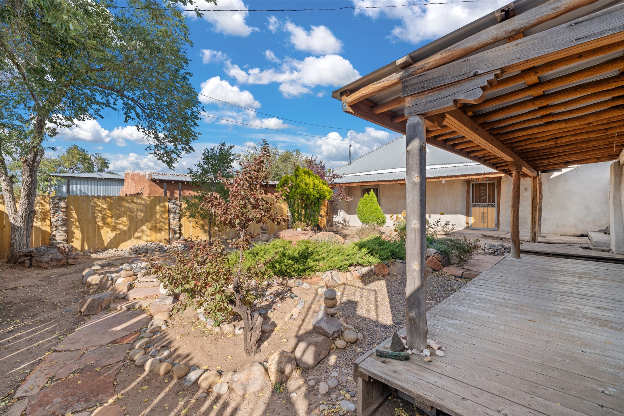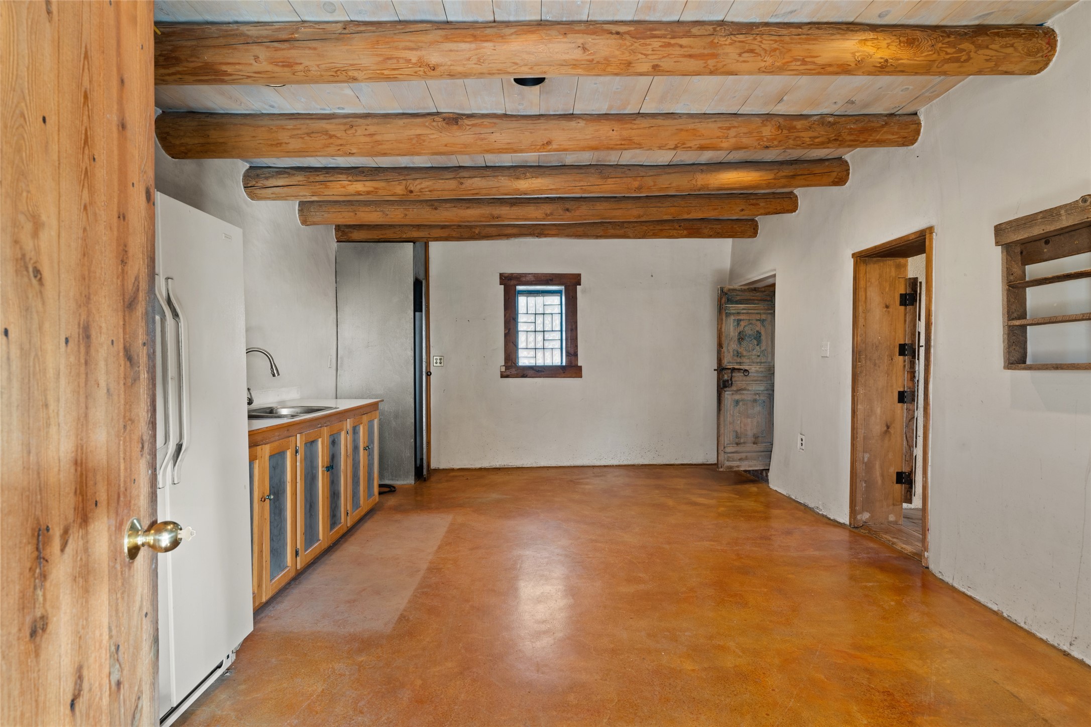 Embracing the architectural spirit of Truchas, this exquisite main residence captures the essence of traditional design with its organic adobe walls, hand-carved puertas, and recessed windows that bring depth and character to each room. Expansive picture windows frame substantial views of the Truchas Peaks, filling the three-bedroom, two-bath home with light and mountain vistas. The floors--an elegant mix of brick, stone, and wood and are complemented by tongue and groove ceilings, creating a warm and inviting atmosphere throughout. Connected through a secluded courtyard modeled after classic Spanish courtyards, the loft-style A-frame guest house offers its own unique charm. Here, towering windows open up to breathtaking views, blending rustic charm with a touch of modernity. With its quirky door frames and spacious, airy design, the guest house stands as a perfect retreat for visitors, echoing the authenticity and architectural character of the main home. Fully fenced, the property offers unmatched privacy and a serene connection to the surrounding landscape, making it a rare gem in the heart of Truchas.