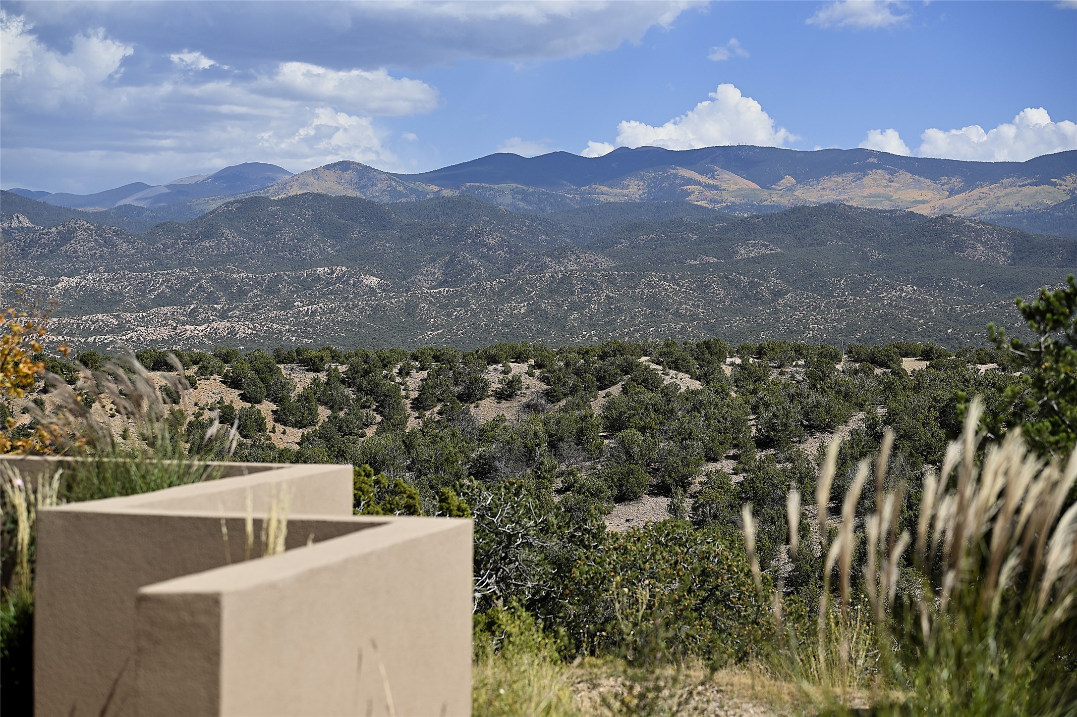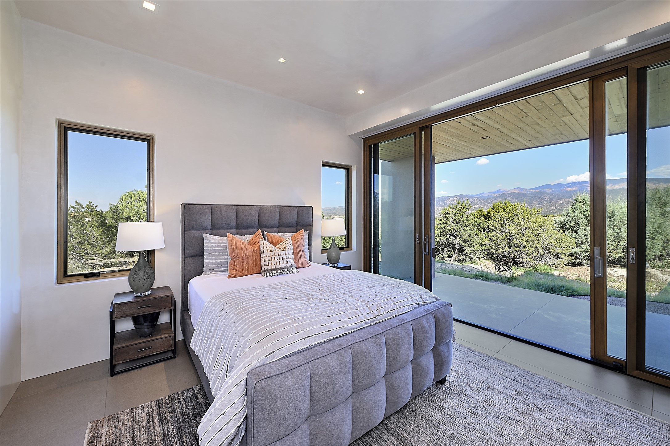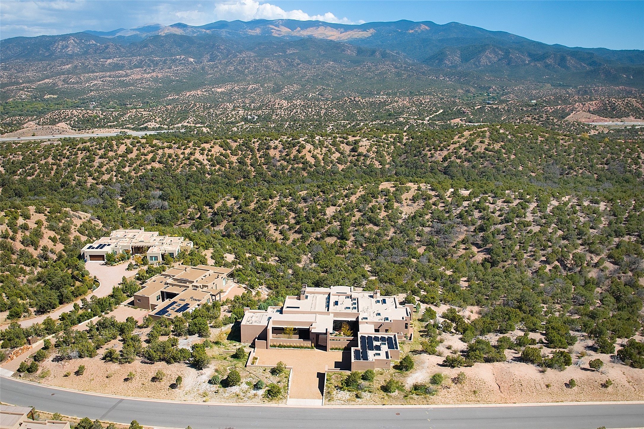 Perched on one of Monte Sereno's most desirable lots, this new contemporary home by Dressel Construction offers breathtaking Sangre de Cristo views from nearly every room. Walls of glass fill the stylish spaces with natural light and blur the line between indoors and out. The open floor plan provides an effortless flow for daily living and entertaining. At the heart of the home is a great room with a grand living area, dining room, contemporary gas fireplace, well-equipped wet bar, and a kitchen with superior appliances, counter seating, a breakfast nook, a scullery with a walk-in pantry, and ample storage. An office or library and a chic media room share a quiet wing with a powder room and a peaceful, private guest suite with a walk-in closet, luxurious bath, and mountain-view portal. The owner's suite is a secluded oasis with a lavish bath, two walk-in closets, and dedicated outdoor spaces. An additional room and bath adjoin the owner's suite and could serve as an office or additional guest suite. A mudroom with sliding glass doors leads to the spacious three-car garage. A photovoltaic solar system featuring sixteen 400W PV panels promotes a more sustainable lifestyle and minimal electric bills.