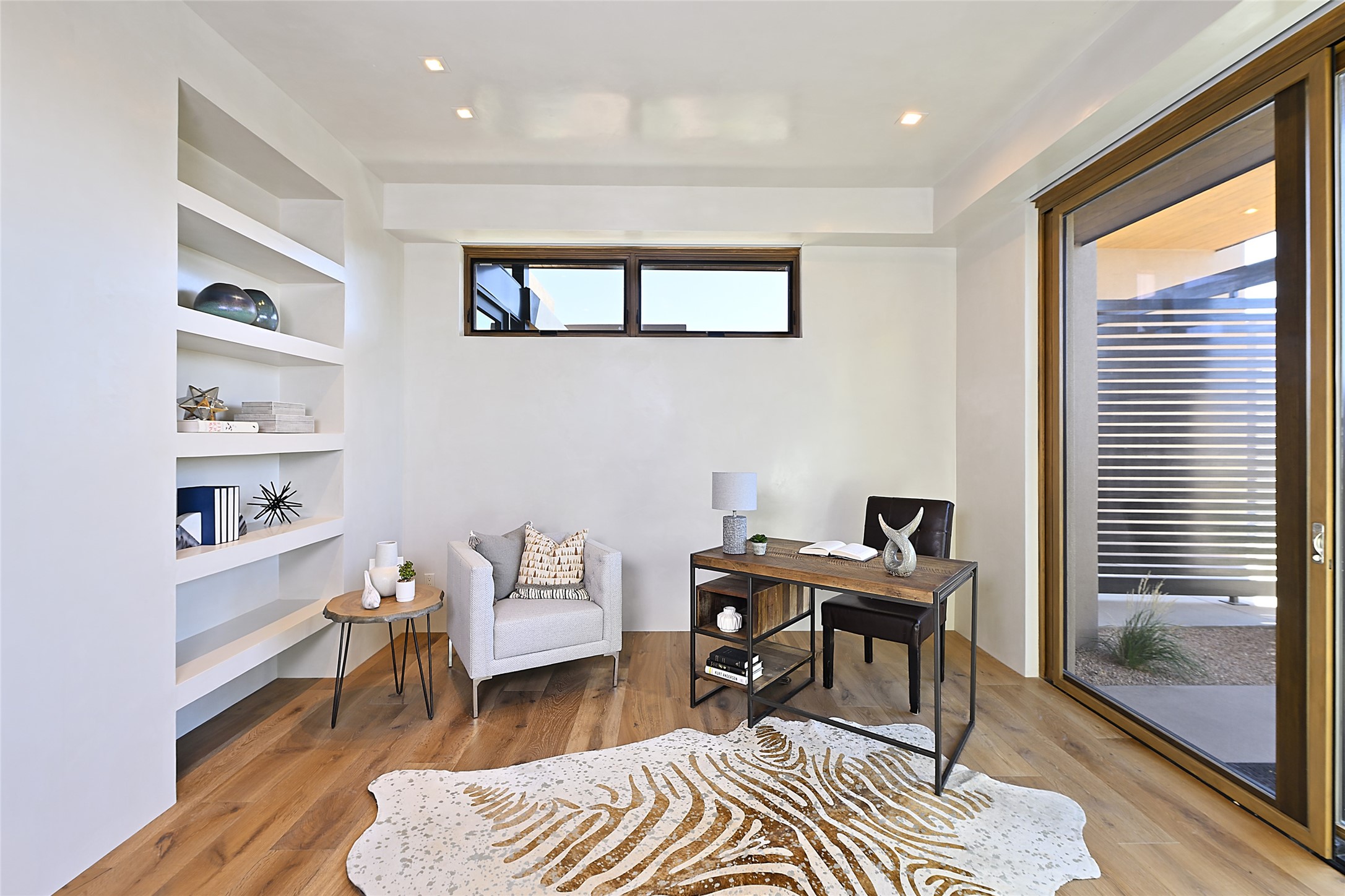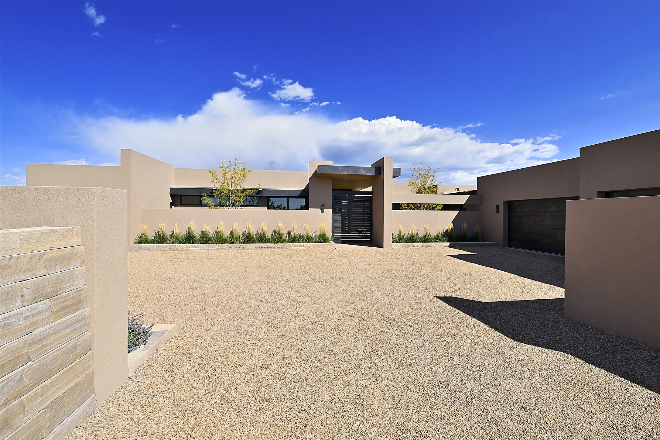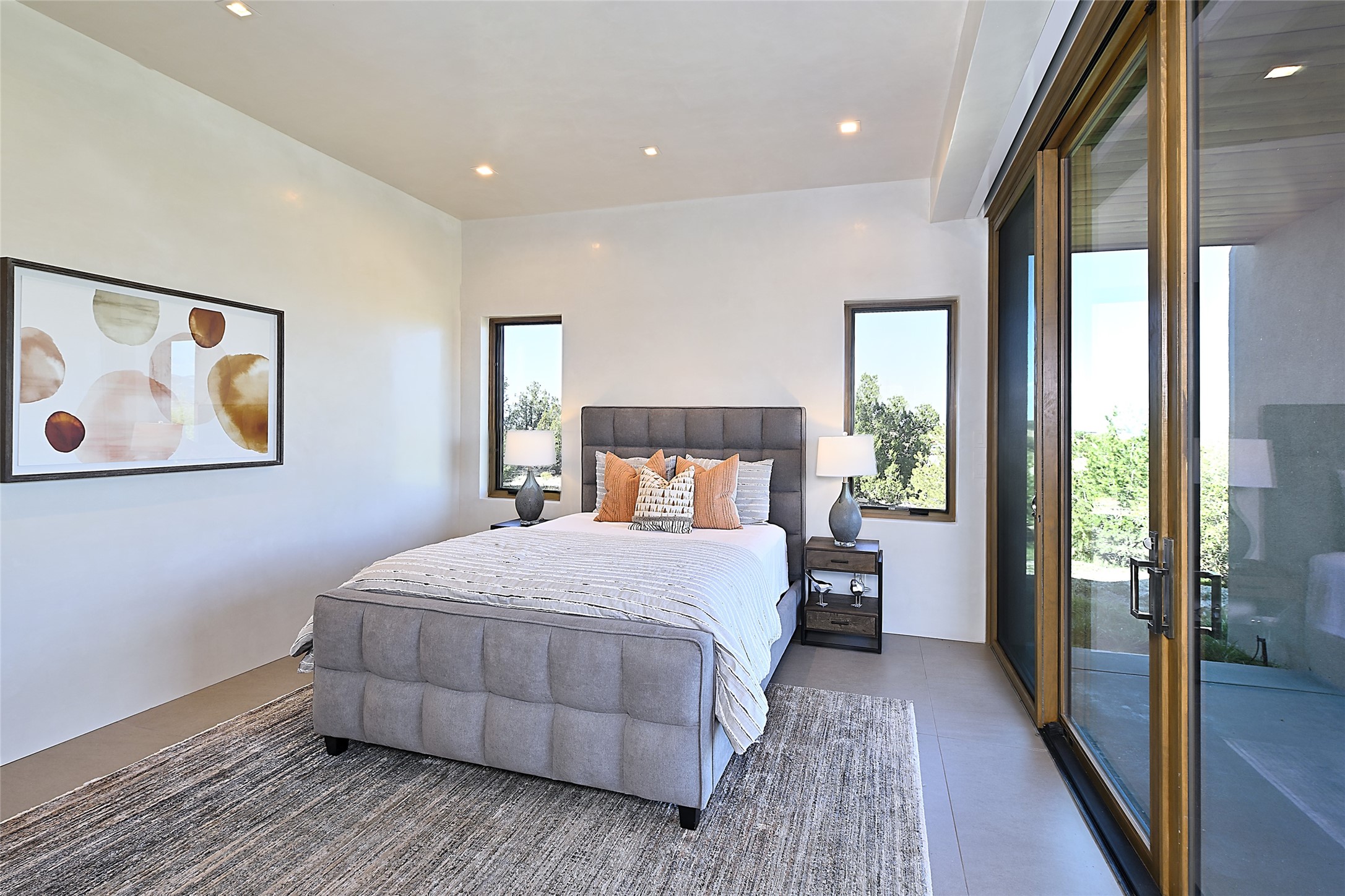Perched on one of Monte Sereno's most desirable lots, this new contemporary home by Dressel Construction offers breathtaking Sangre de Cristo views from nearly every room. Walls of glass fill the stylish spaces with natural light and blur the line between indoors and out. The open floor plan provides an effortless flow for daily living and entertaining. At the heart of the home is a great room with a grand living area, dining room, contemporary gas fireplace, well-equipped wet bar, and a kitchen with superior appliances, counter seating, a breakfast nook, a scullery with a walk-in pantry, and ample storage. An office or library and a chic media room share a quiet wing with a powder room and a peaceful, private guest suite with a walk-in closet, luxurious bath, and mountain-view portal. The owner's suite is a secluded oasis with a lavish bath, two walk-in closets, and dedicated outdoor spaces. An additional room and bath adjoin the owner's suite and could serve as an office or additional guest suite. A mudroom with sliding glass doors leads to the spacious three-car garage. A photovoltaic solar system featuring sixteen 400W PV panels promotes a more sustainable lifestyle and minimal electric bills.