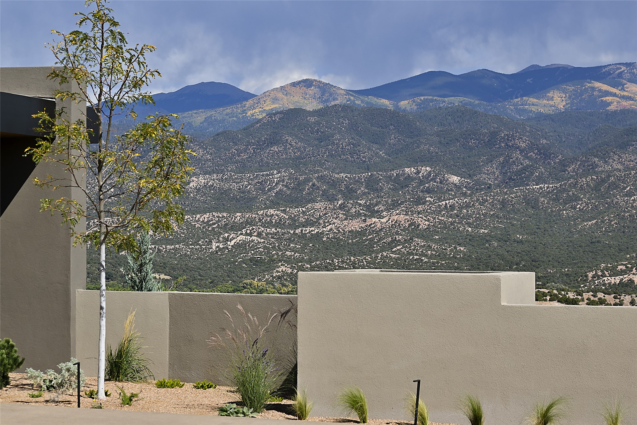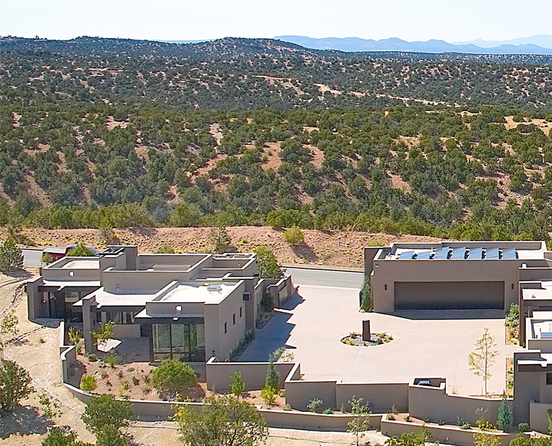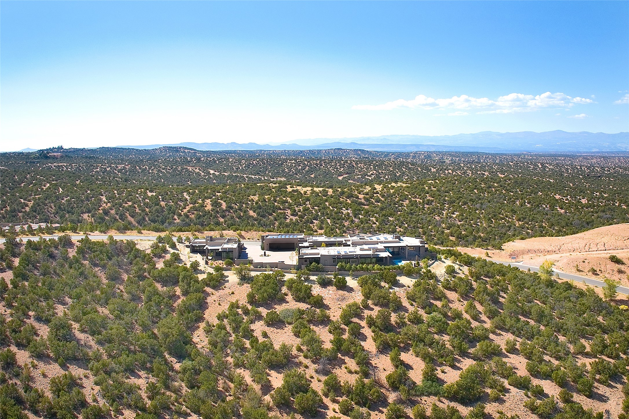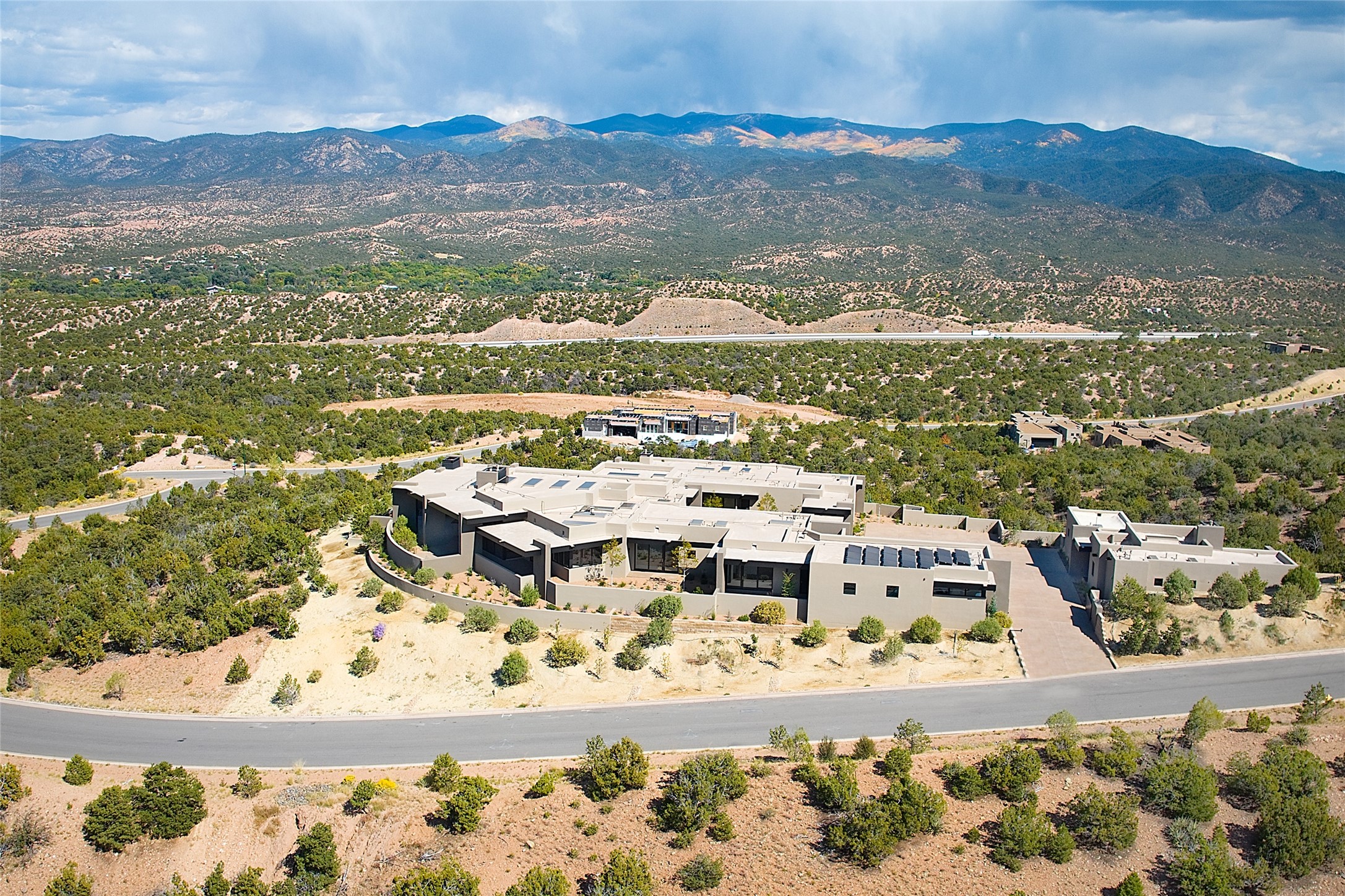 One of the most magnificent contemporary homes in Santa Fe, this new residence and guesthouse in the coveted northside enclave of Monte Sereno was designed and built by Dressel Construction. The heart of the main residence is a spectacular showplace for grand gatherings or quiet moments of private relaxation and reflection while appreciating Santa Fe's impossibly blue skies and the majesty of the Sangre de Cristo and Jemez Mountains and the Badlands. Open, airy, and inviting, it includes a strikingly dramatic wine room, a wet bar, and a vast living space with walls of glass affording a cinematic view and opening to an equally inspiring portal and patio with a pool. A media room and a library or office adjoin, offering more intimate spaces for day-to-day living and tasks. Nearby, an elegant kitchen includes a host of superior appliances and surface along with a well-equipped plating kitchen, a walk-in pantry, and a breakfast area with built-in seating and portal access. The owner's suite and a versatile additional room--ideal for an office or in-law suite--are secluded in their own wing, while a pair of guest bedroom suites enjoy the privacy of their own wing accessed by a sunlit hallway. A three-car garage completes the lavish picture. Across a dramatic motor court with a central fountain is a charming two-bedroom guesthouse with a well-equipped kitchen, laundry facilities, a fireplace, and spaces for outdoor enjoyment. The nearly three-acre property--consisting of a rare combination of two lots--is accessed via a regal gated drive, basks in stunning views from its enviable perch, and enjoys unprecedented peace and privacy. Native flora surrounds the estate, and the hallways of the main residence open to a dazzling landscaped courtyard with a modern water feature. Monte Sereno is a desirable community located near the world-renowned Santa Fe Opera and a short drive from the historic Plaza and other attractions. Images portrayed in this listing are virtually staged, and seller makes no representations that all elements in these images represent what is being sold. Fiber optic through Century Link as well as Comcast/Xfinity.