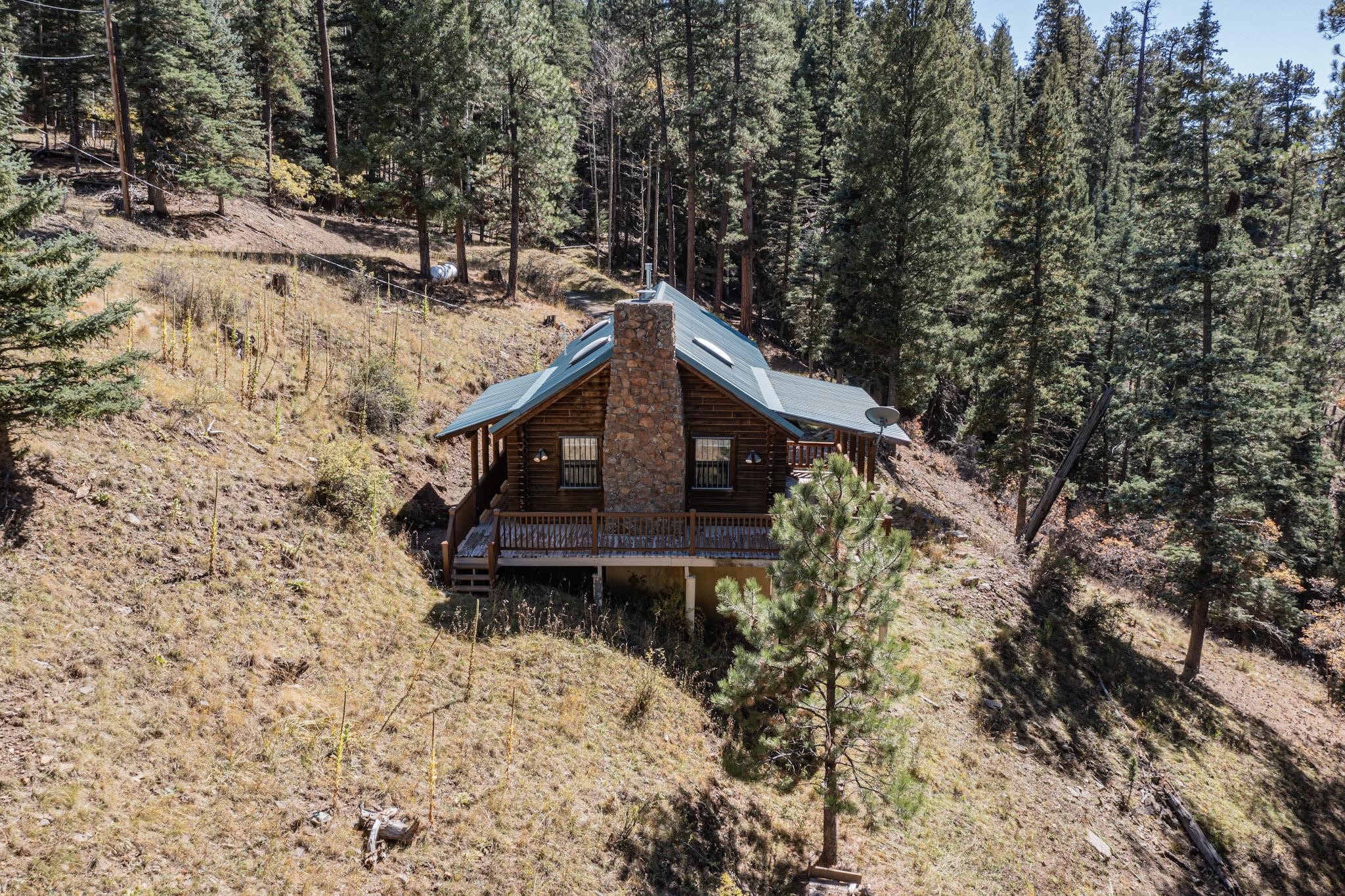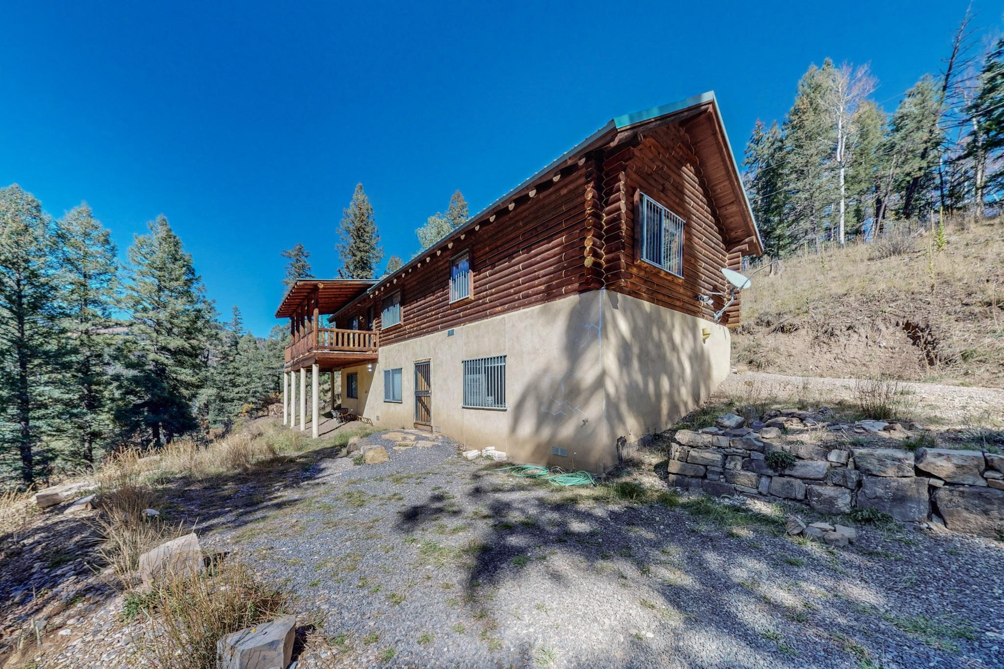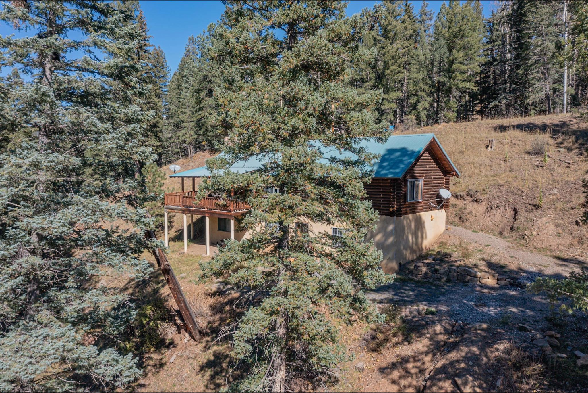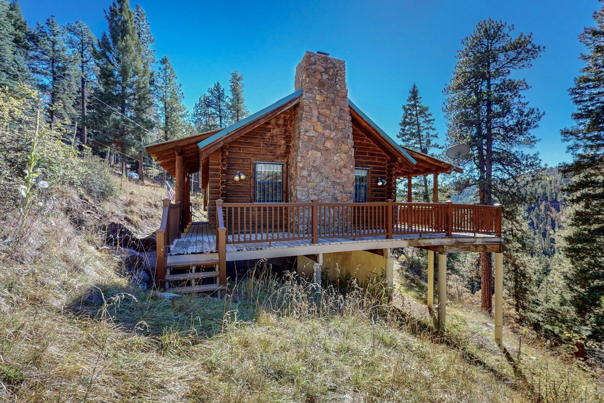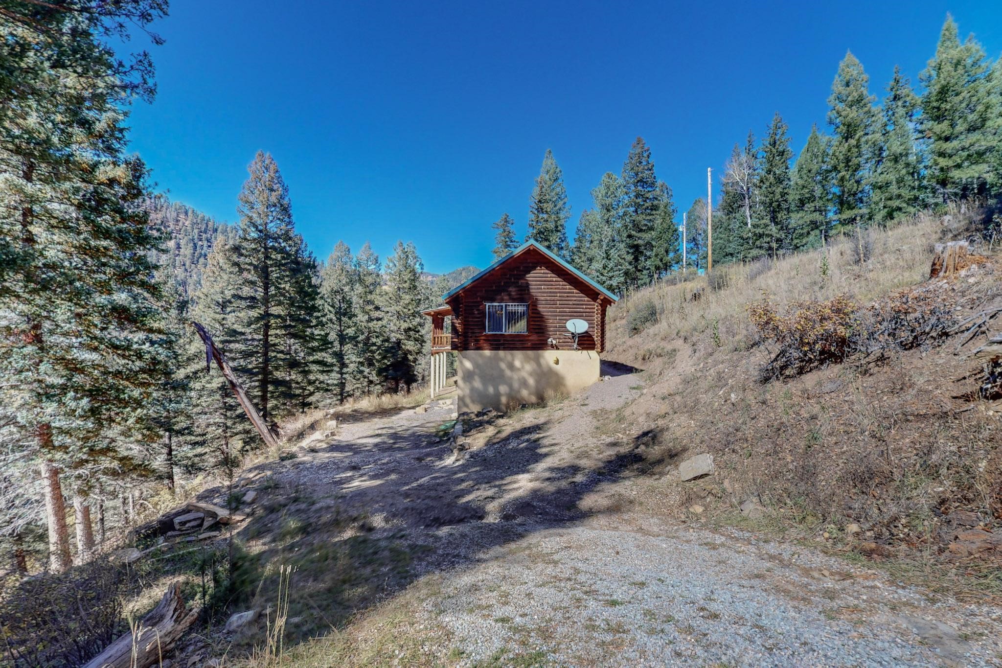 What folks say they want, Mountain cabin with stunning views at Pecos Canyon Estates, an hour east of Santa Fe just before the Pecos Wilderness accessed from Iron Gate Road. The listing includes 5 legal lots of record allowing for additional structures. The construction is log and block, 2 levels and includes private well, wrap around deck, rock fireplace, 1 bedroom and 2 baths. The upper portion is from well regarded Air-Lock Log Homes from Las Vegas, New Mexico. The home is 2/3rds completed, upper level with living room, kitchen, laundry area, primary bedroom and bath is finished and the lower level has finished bathroom and partially completed open spaces, priced at $369,000 accordingly. Additional features include land line telephone, internet with Wi-Fi, lift chair to lower level, propane heat above and baseboard electric heat below, and a private setting at the end of a country lane. There are no CCR's or a home owners association.