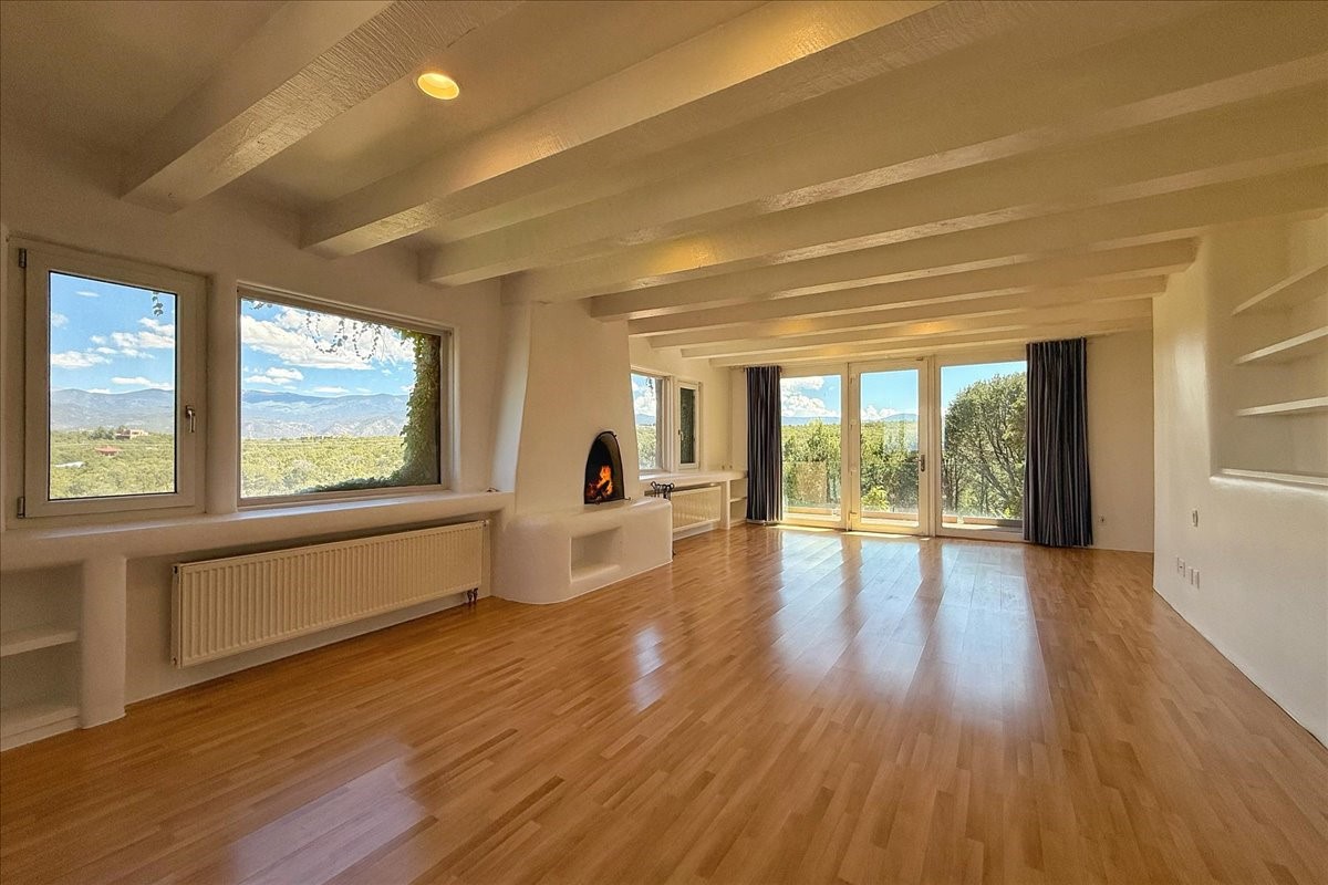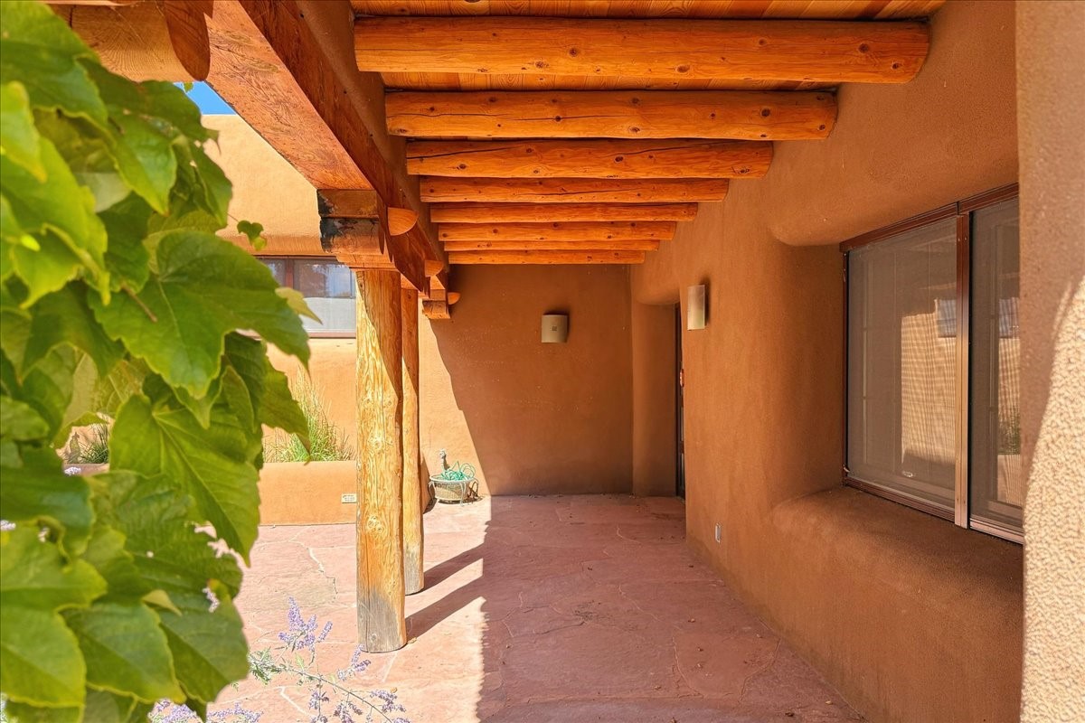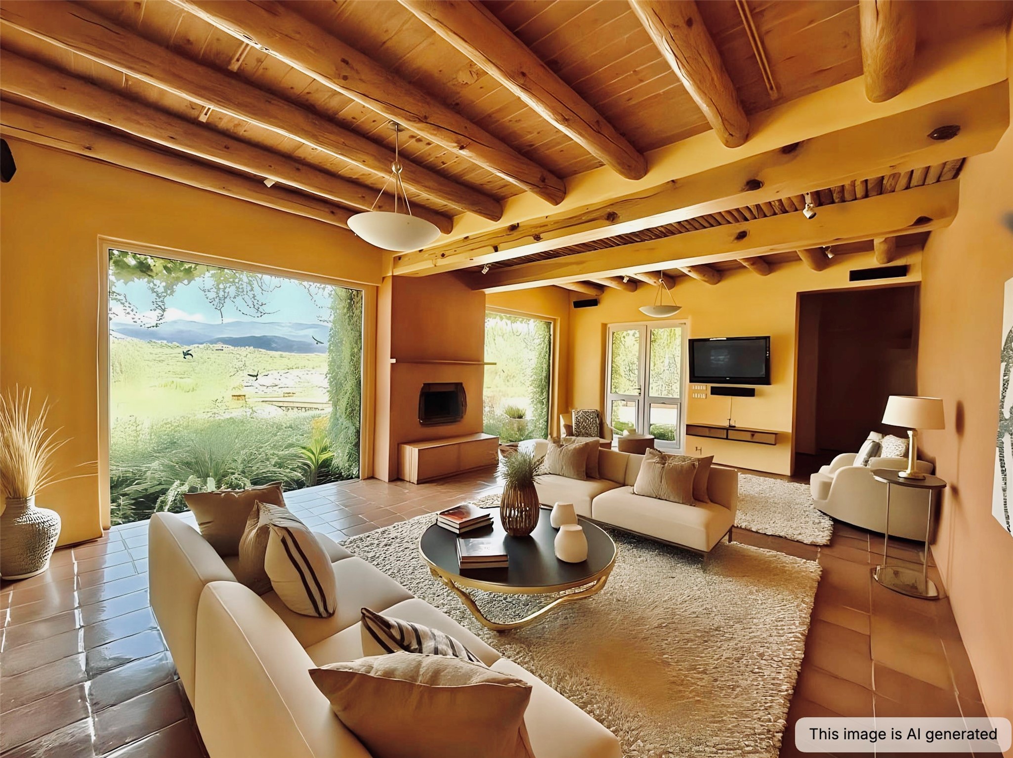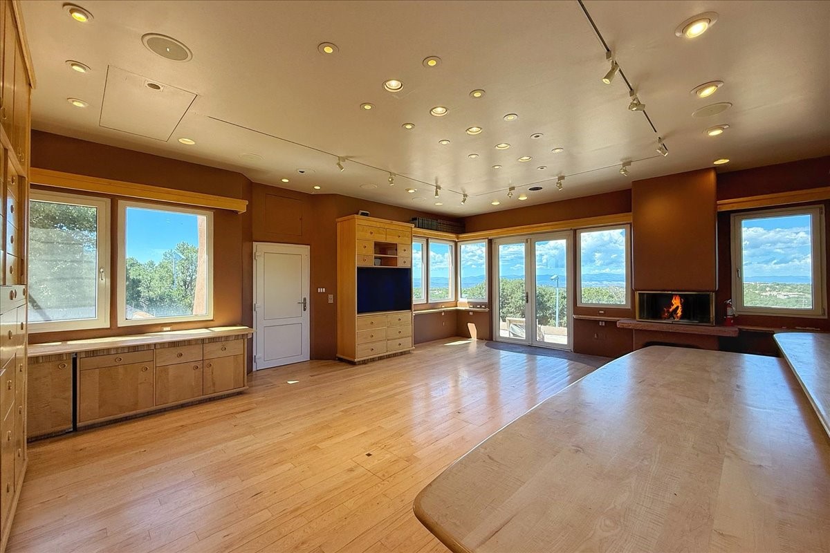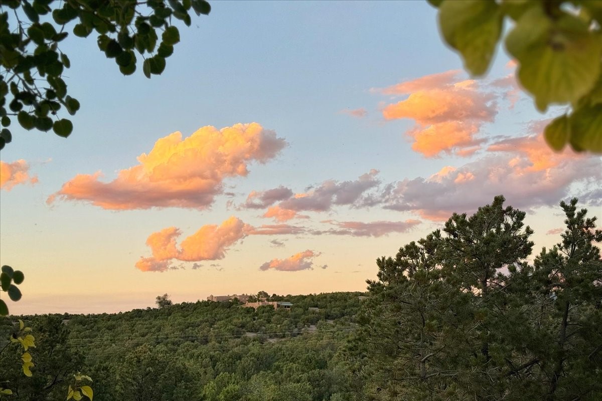 Welcome to Sleeping Beauty, a truly exceptional estate tucked away on 11.9 acres of serene, wooded land in Santa Fe. This enchanting adobe property features a 4-bedroom main house and a charming 2-bedroom guest house, offering the ultimate private sanctuary. The owner's retreat is located upstairs, where you'll enjoy breathtaking views of the lush green lawn, bordered by graceful aspen trees, a tranquil pond, and the majestic Sangre de Cristo Mountains beyond. Off the bedroom, you'll find a beautifully appointed bathroom and a spacious office/studio with wonderful natural light and expansive views to the north and south. The main level offers an inviting, social kitchen opening onto the portal with a cozy fireplace, an elegant living room with large picture windows offer exceptional views, an office, a den, and a guest wing with three bedrooms--perfect for family and friends. A short walk away, the charming guest casita provides additional space for visitors or quiet reflection. This property is brimming with potential and will inspire you at every turn. With love and vision, Sleeping Beauty is ready to be awakened. The offering adjoins two of tracts of land - 23 acre lot offered at $2,300,000 and a 5.2 acre lot offered at $600,000. There is a video link attached to this listing.