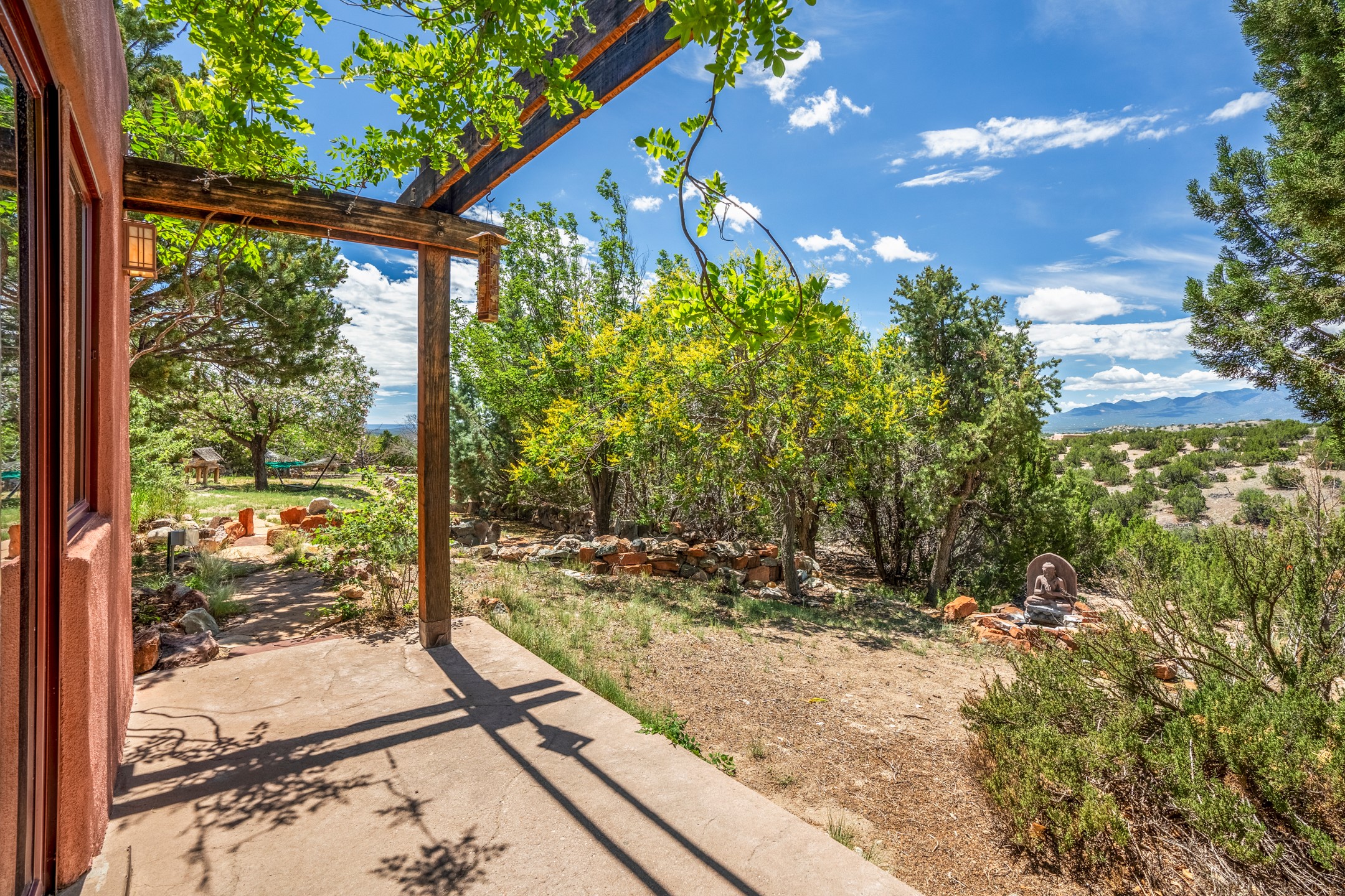 A dream property for horse lovers! This 13.5-acre high-desert sanctuary offers direct ride-out access to miles of BLM and State land, including the scenic Cerrillos Hills--no trailering needed. With wide-open spaces, panoramic views of the Sangre de Cristos and Ortiz Mountains, and absolute privacy, it's a rider's retreat just 20 minutes from Santa Fe.The thoughtfully designed horse facilities include a beautifully updated barn, large arena, tack room, extensive paddocks, and plenty of room to expand. Whether you're a trail enthusiast, trainer, or just want to ride out from your back door, this property delivers.At the heart of the land sits a sustainable, custom-built home crafted with green living in mind. Thick 10" cellulose-insulated walls, passive solar orientation, interior adobe, and non-toxic finishes keep the home efficient and comfortable. Solar-assisted hot water and a rainwater catchment system support a lifestyle in harmony with the environment. Recycled household water irrigates a fruit orchard via a 5,000-gallon tank, and the private well includes 3 acre-feet of water rights.Inside, warm, natural finishes and hand-crafted details create a calming space--rounded plaster walls, bamboo cabinetry, Viatera quartz countertops, clerestory windows, skylights, and cozy kiva fireplaces. A meditation nook centers the home, and the flexible third bedroom can easily serve as a studio or office.Outdoors, enjoy lily and fishponds, garden spaces, patios for al fresco living, and invisible pet fencing.This is more than a home--it's a self-sustaining equestrian haven that offers peace, privacy, and the freedom to ride for miles. Come experience it for yourself--you may never want to leave.