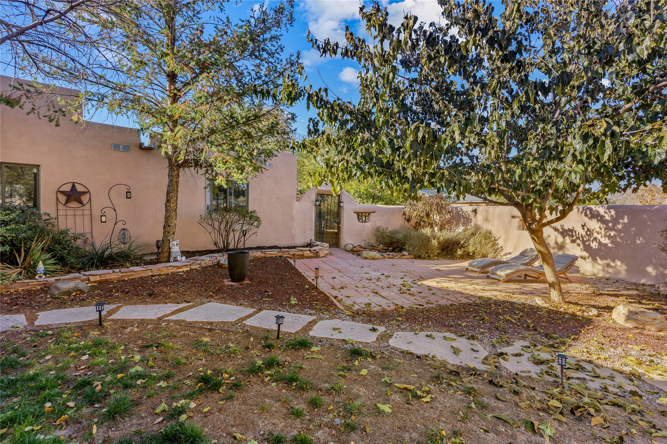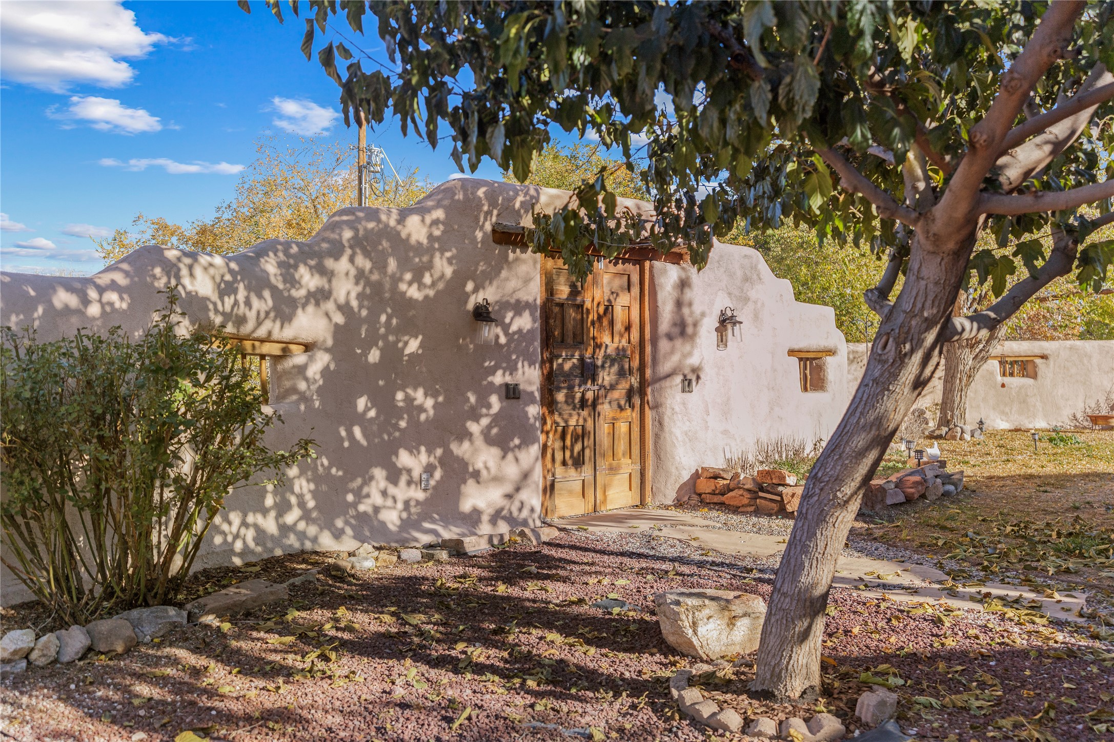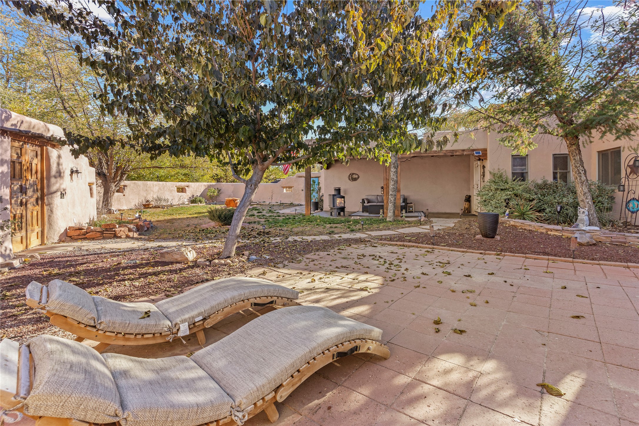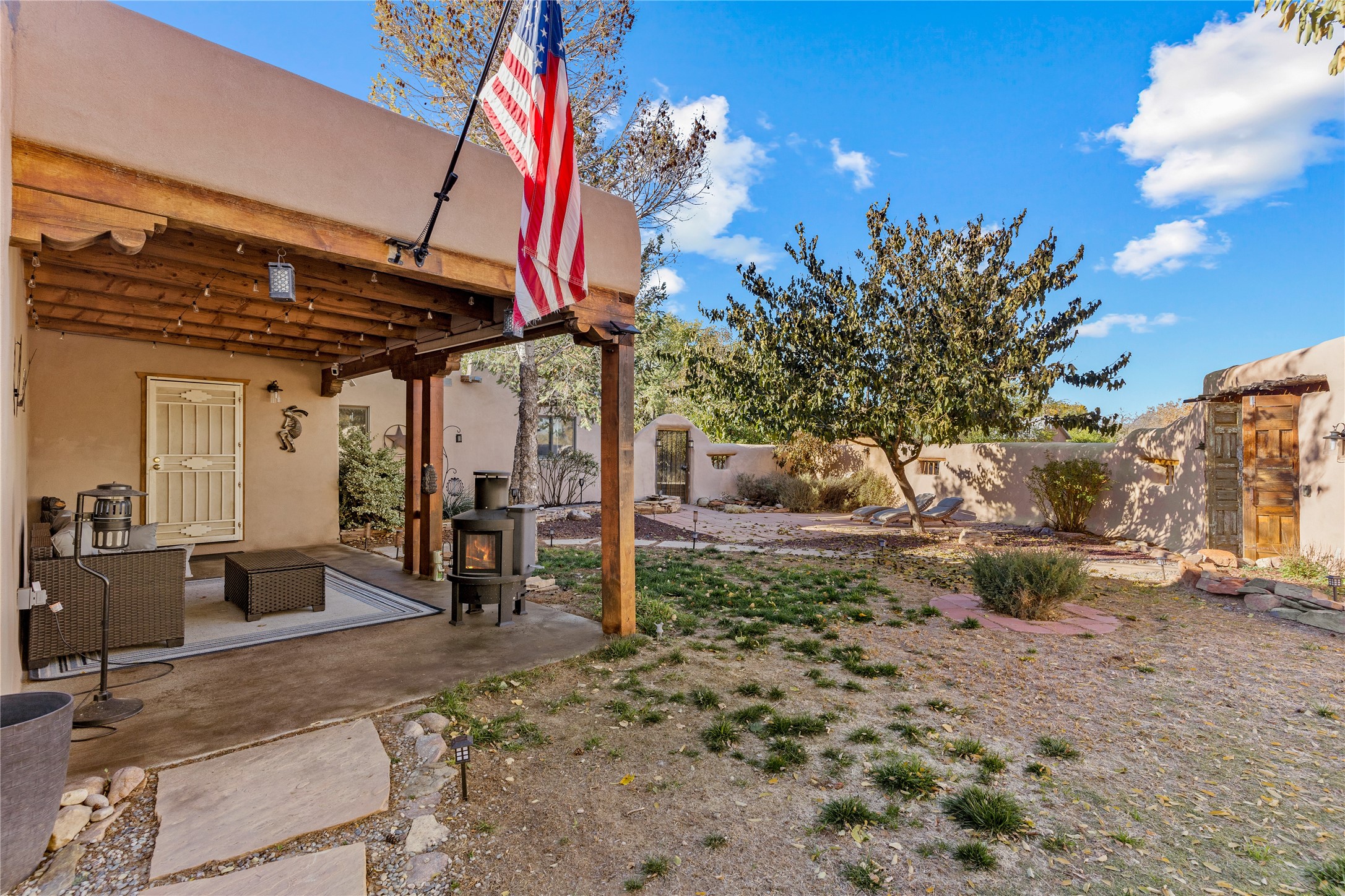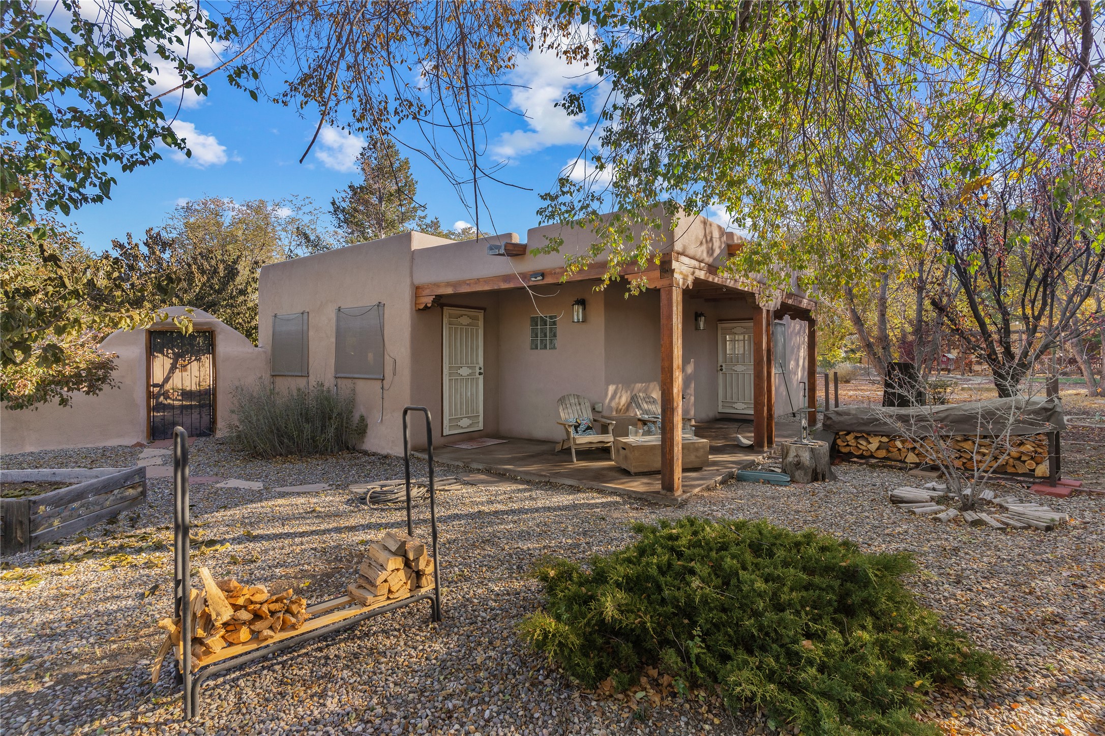 *Price Improvement* This charming New Mexico pueblo-style home is nestled on a private 0.75-acre setting at the end of a quiet, tree-lined private drive in La Mesilla. A stunning curved privacy wall surrounds the property, leading to a beautifully landscaped courtyard with established trees, flower beds, a lawn, drip irrigation, sprinklers, and even a small water featrure--perfect for relaxation and outdoor enjoyment. The home's spacious fenced backyard features, a gazebo, a back porch, and shade trees, ideal for entertaining or unwinding. Inside, the airy and bright open-concept layout boasts tall rustic beams, high ceilings, built-in bookshelves, saltillo tile, and wood grain ceramic flooring throughout. The living room, anchored by a wood-burning kiva fireplace with banco seating, flows seamlessly into the dining area and fully equipped kitchen, featuring stainless steel appliances, granite countertops, and a large pantry. The layout offers excellent bedroom separation, with the inviting primary suite on one side and two guest bedrooms, a spacious office, and a full bathroom on the other. Additional highlights include a large laundry room with cabinetry, an oversized two-car garage with ample storage, and surface water rights through the La Mesilla Community Ditch. Conveniently located approximately 25 miles from the Los Alamos and Santa Fe, this home offers peaceful rural living with modern amenities. Come experience the tranquility and beauty of this exceptional property!
