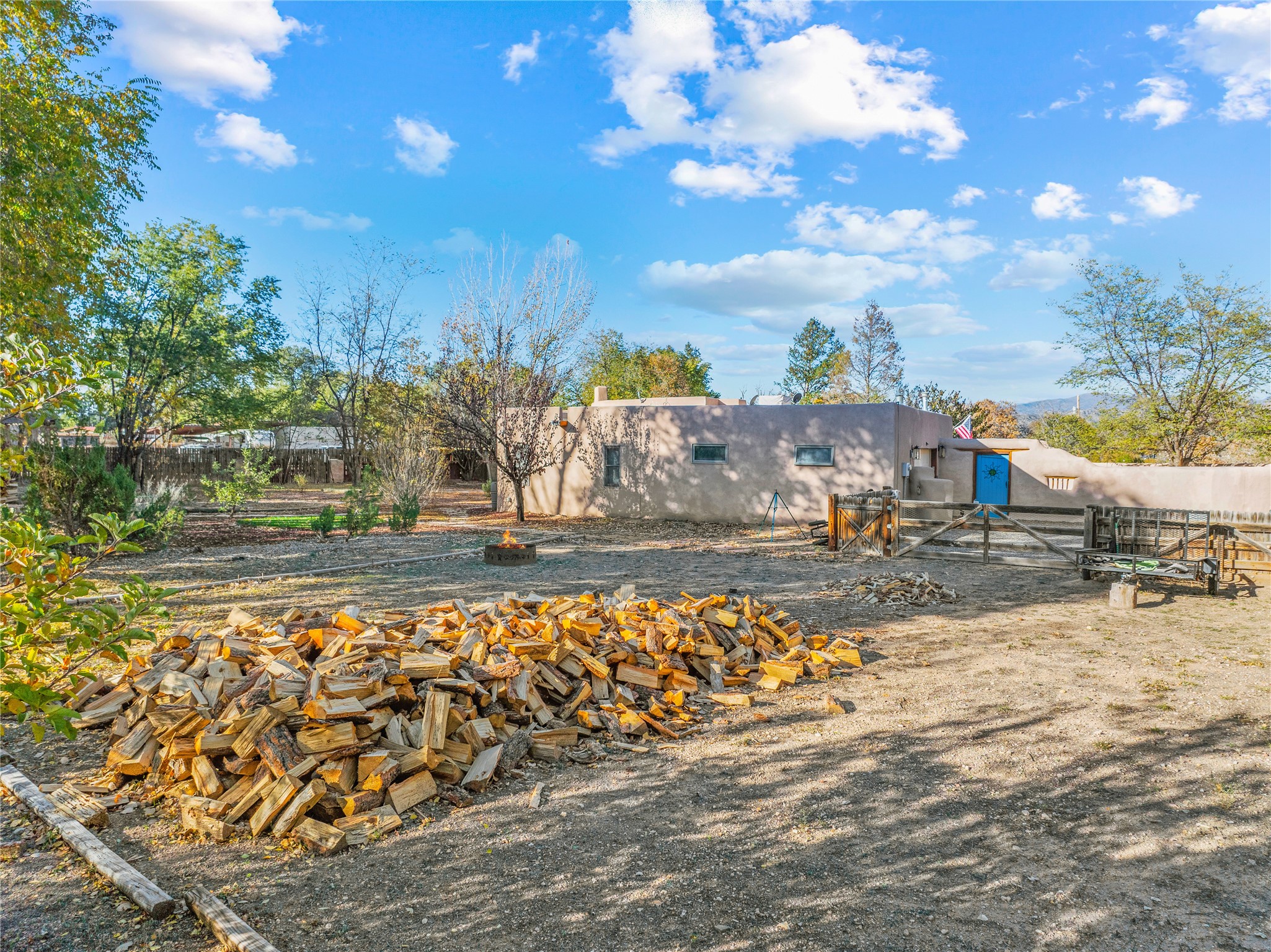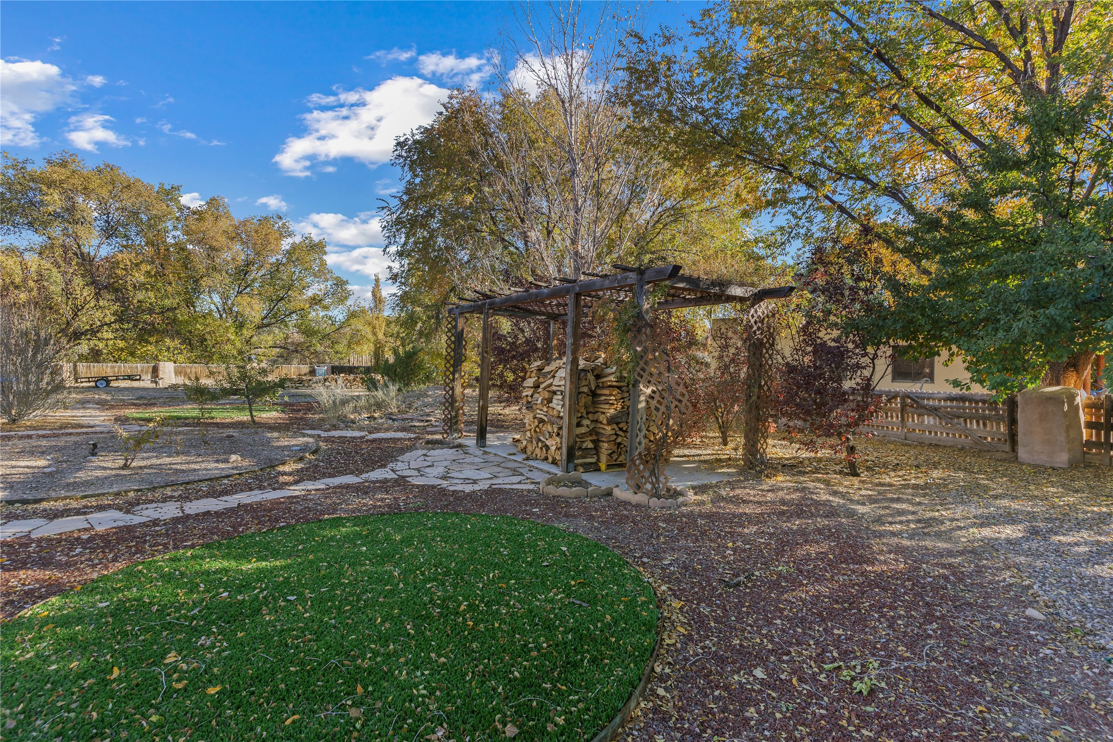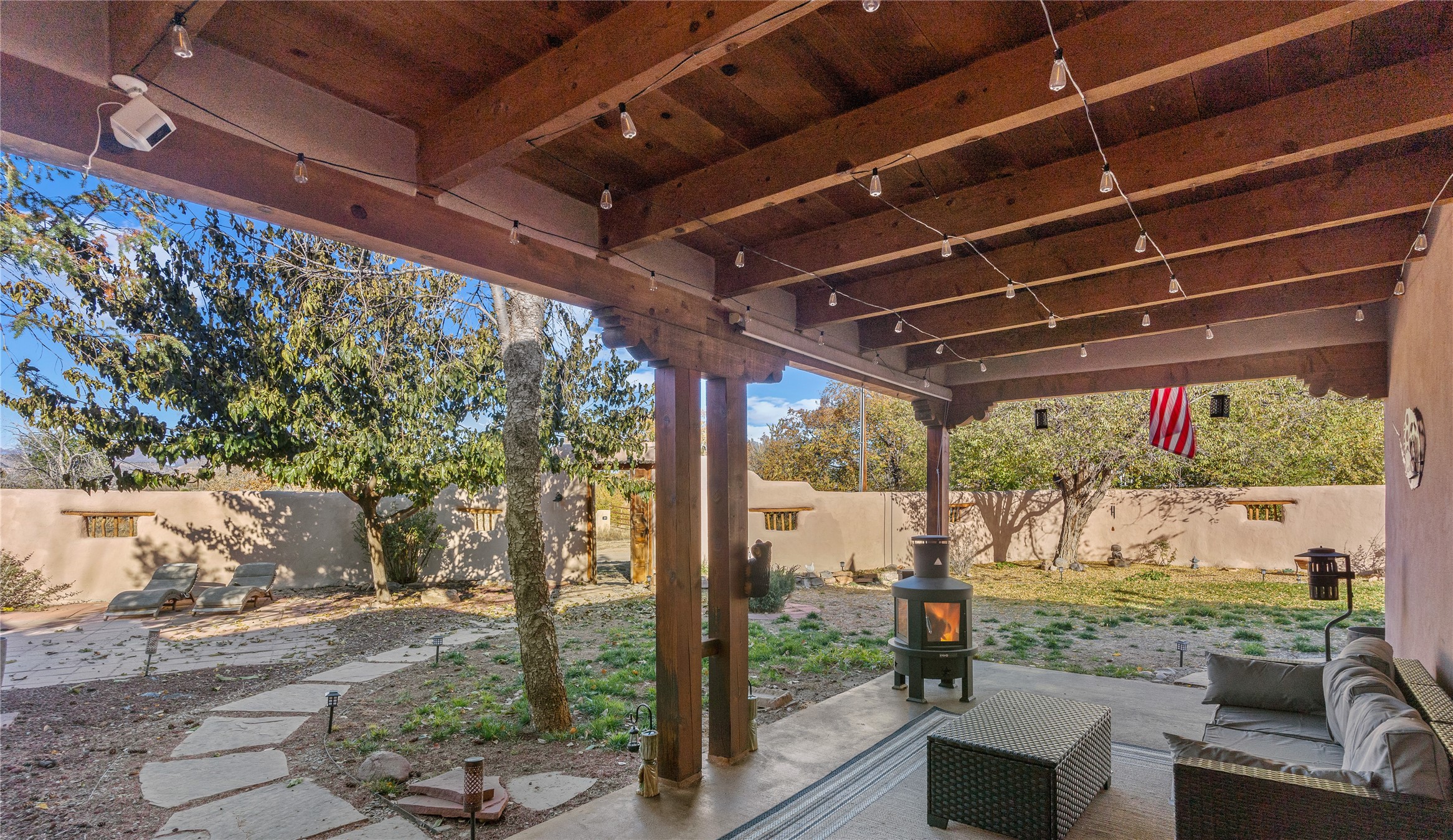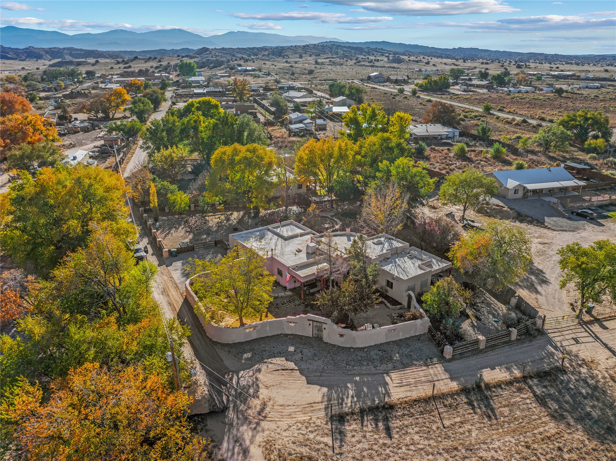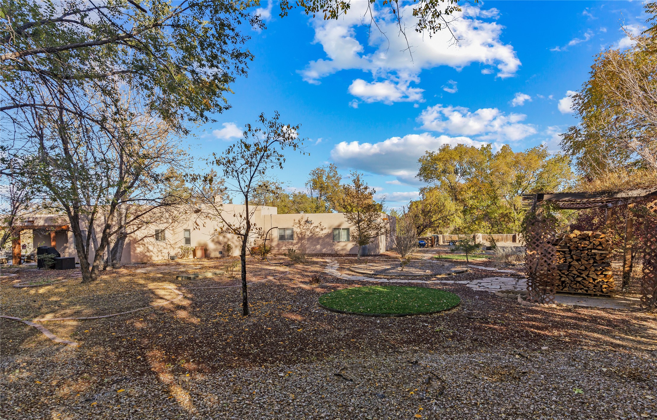 *Price Improvement* This charming New Mexico pueblo-style home is nestled on a private 0.75-acre setting at the end of a quiet, tree-lined private drive in La Mesilla. A stunning curved privacy wall surrounds the property, leading to a beautifully landscaped courtyard with established trees, flower beds, a lawn, drip irrigation, sprinklers, and even a small water featrure--perfect for relaxation and outdoor enjoyment. The home's spacious fenced backyard features, a gazebo, a back porch, and shade trees, ideal for entertaining or unwinding. Inside, the airy and bright open-concept layout boasts tall rustic beams, high ceilings, built-in bookshelves, saltillo tile, and wood grain ceramic flooring throughout. The living room, anchored by a wood-burning kiva fireplace with banco seating, flows seamlessly into the dining area and fully equipped kitchen, featuring stainless steel appliances, granite countertops, and a large pantry. The layout offers excellent bedroom separation, with the inviting primary suite on one side and two guest bedrooms, a spacious office, and a full bathroom on the other. Additional highlights include a large laundry room with cabinetry, an oversized two-car garage with ample storage, and surface water rights through the La Mesilla Community Ditch. Conveniently located approximately 25 miles from the Los Alamos and Santa Fe, this home offers peaceful rural living with modern amenities. Come experience the tranquility and beauty of this exceptional property!