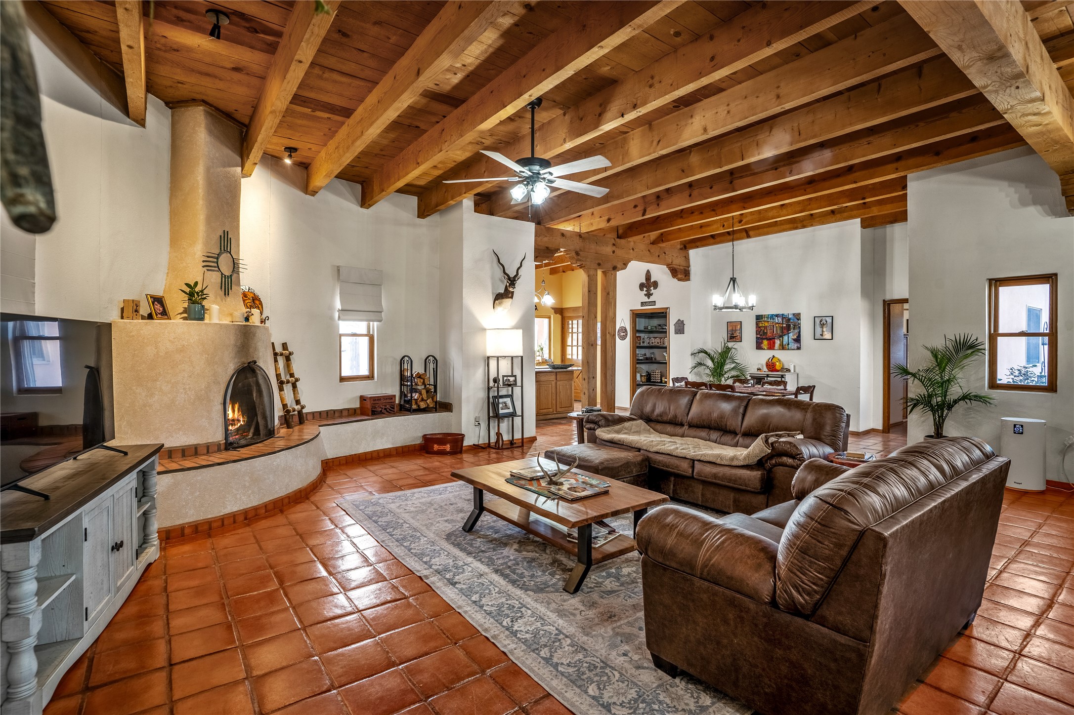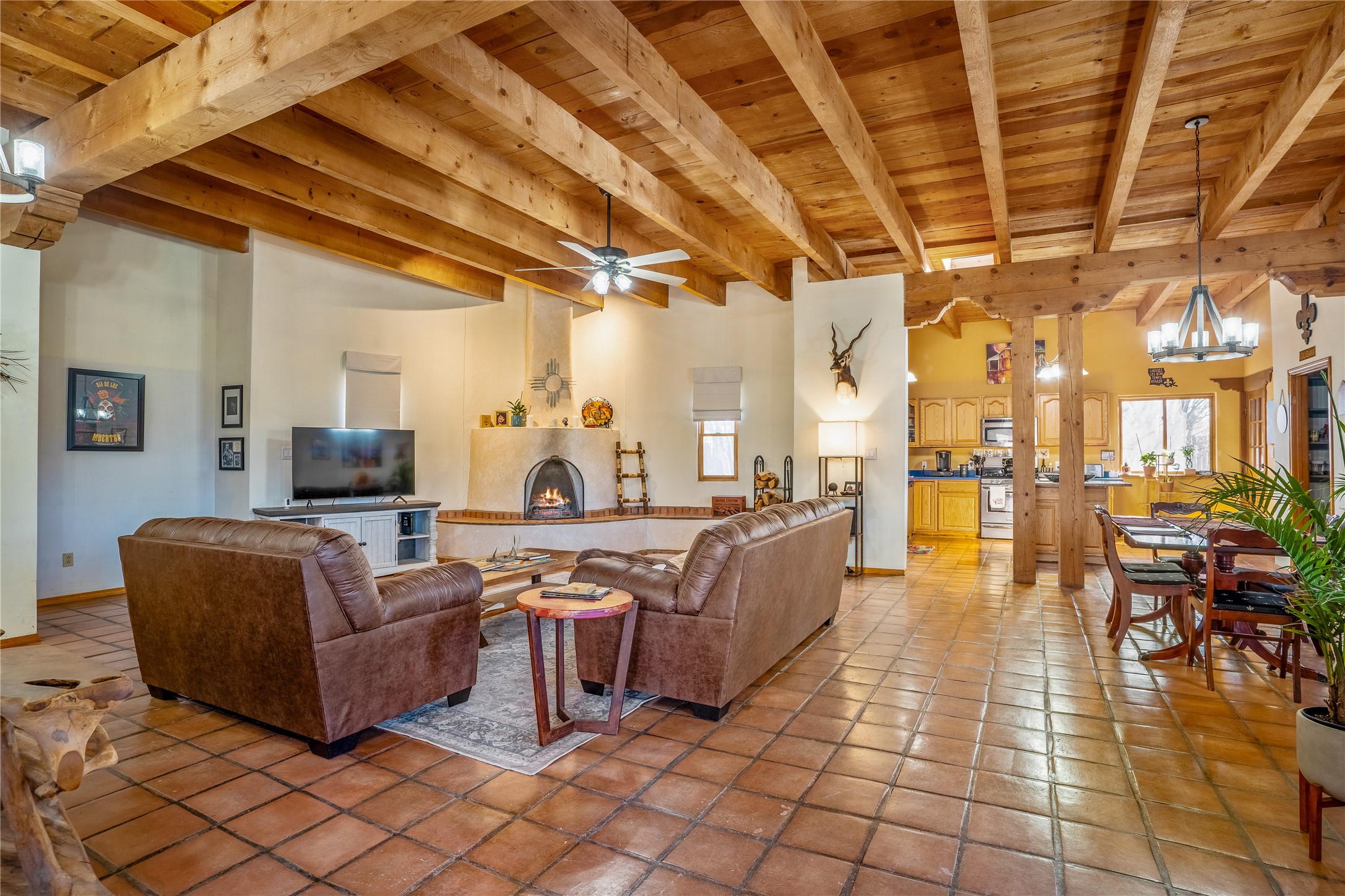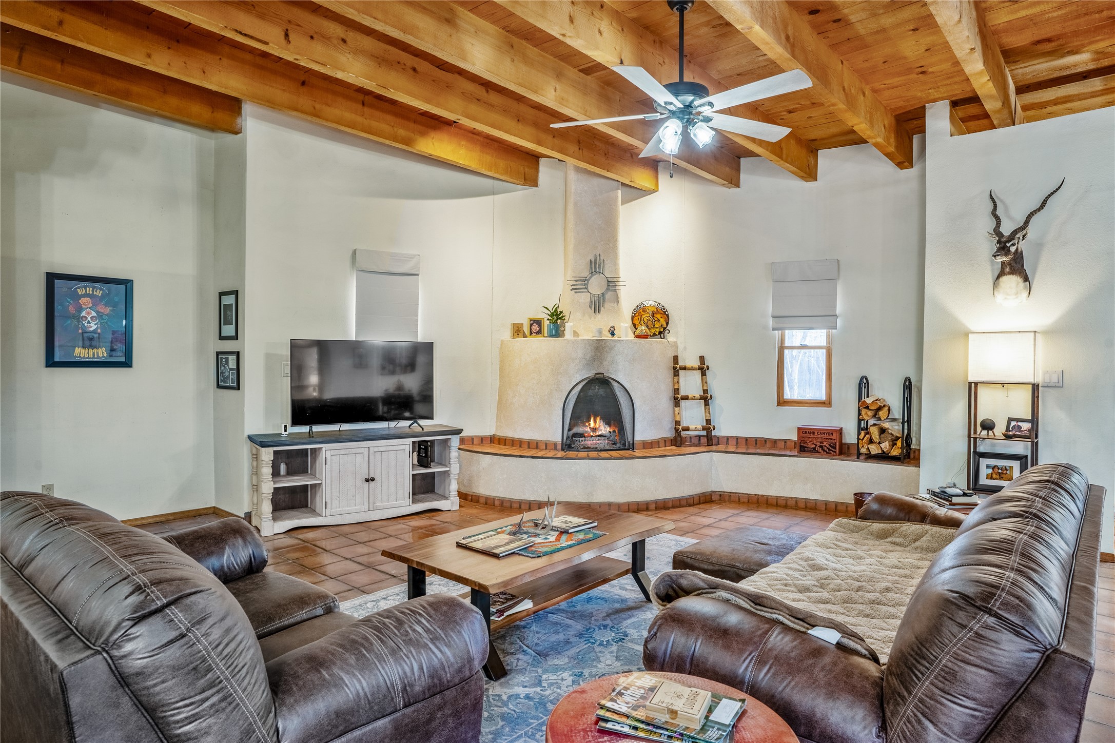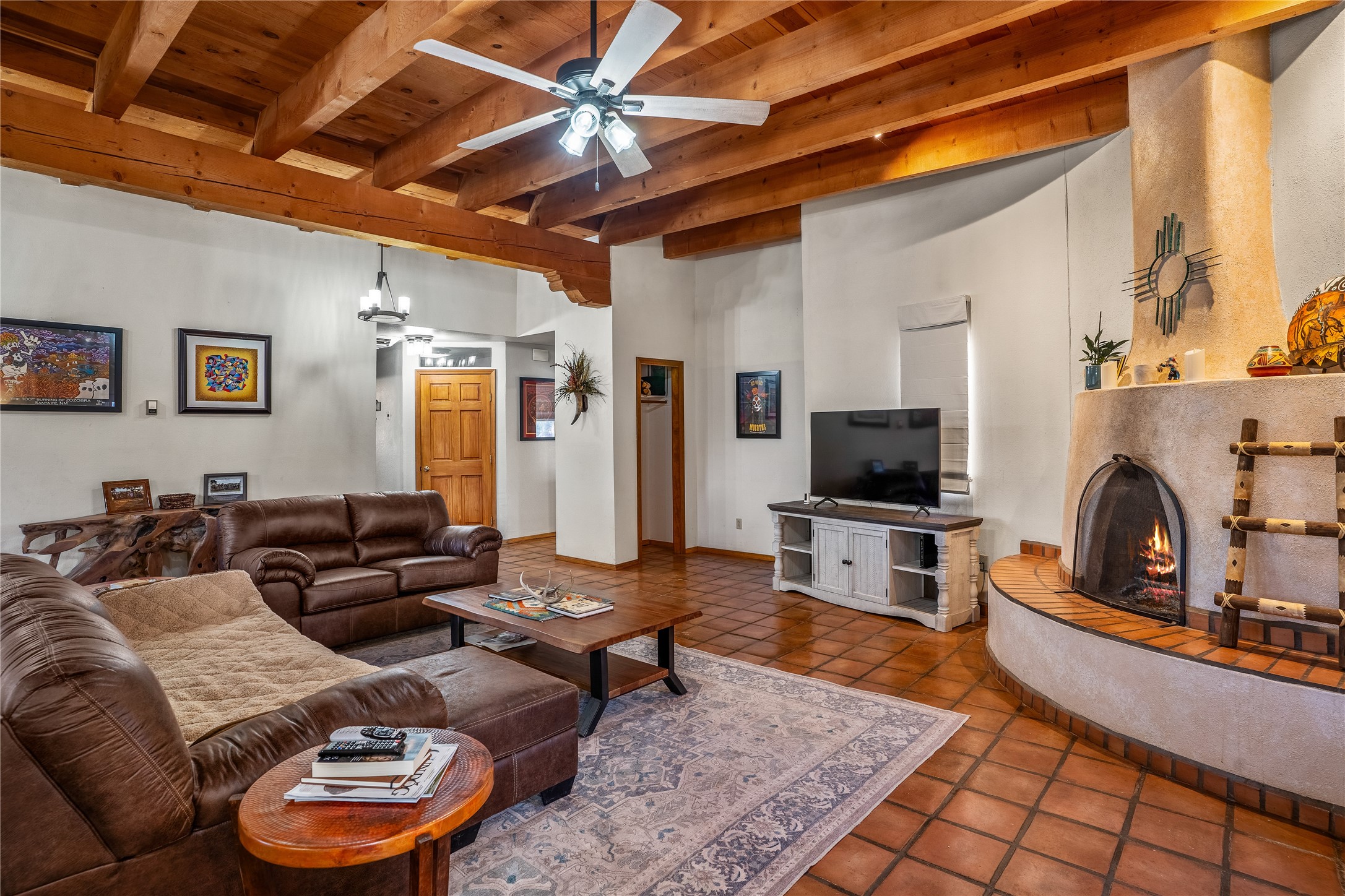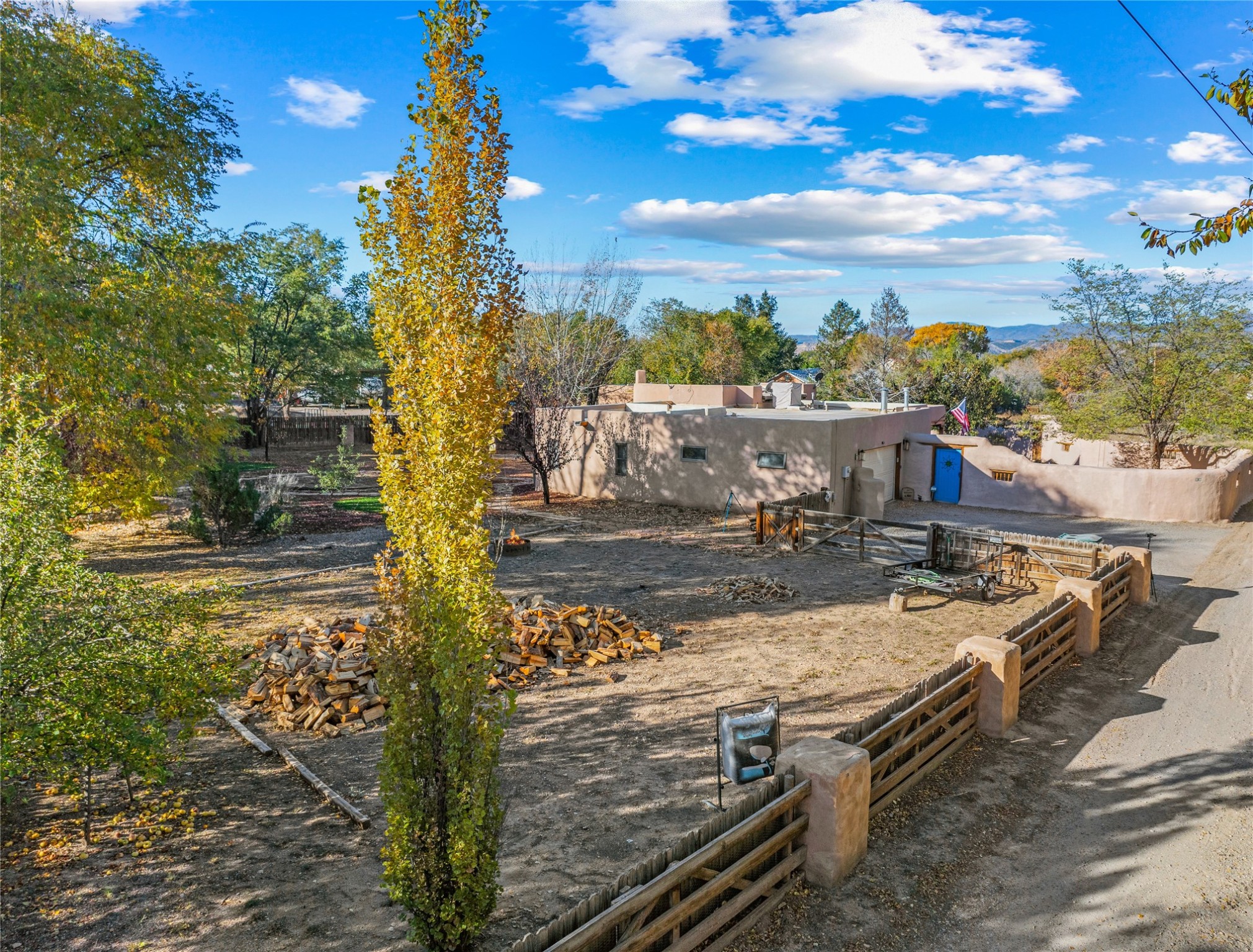 *Price Improvement* This charming New Mexico pueblo-style home is nestled on a private 0.75-acre setting at the end of a quiet, tree-lined private drive in La Mesilla. A stunning curved privacy wall surrounds the property, leading to a beautifully landscaped courtyard with established trees, flower beds, a lawn, drip irrigation, sprinklers, and even a small water featrure--perfect for relaxation and outdoor enjoyment. The home's spacious fenced backyard features, a gazebo, a back porch, and shade trees, ideal for entertaining or unwinding. Inside, the airy and bright open-concept layout boasts tall rustic beams, high ceilings, built-in bookshelves, saltillo tile, and wood grain ceramic flooring throughout. The living room, anchored by a wood-burning kiva fireplace with banco seating, flows seamlessly into the dining area and fully equipped kitchen, featuring stainless steel appliances, granite countertops, and a large pantry. The layout offers excellent bedroom separation, with the inviting primary suite on one side and two guest bedrooms, a spacious office, and a full bathroom on the other. Additional highlights include a large laundry room with cabinetry, an oversized two-car garage with ample storage, and surface water rights through the La Mesilla Community Ditch. Conveniently located approximately 25 miles from the Los Alamos and Santa Fe, this home offers peaceful rural living with modern amenities. Come experience the tranquility and beauty of this exceptional property!