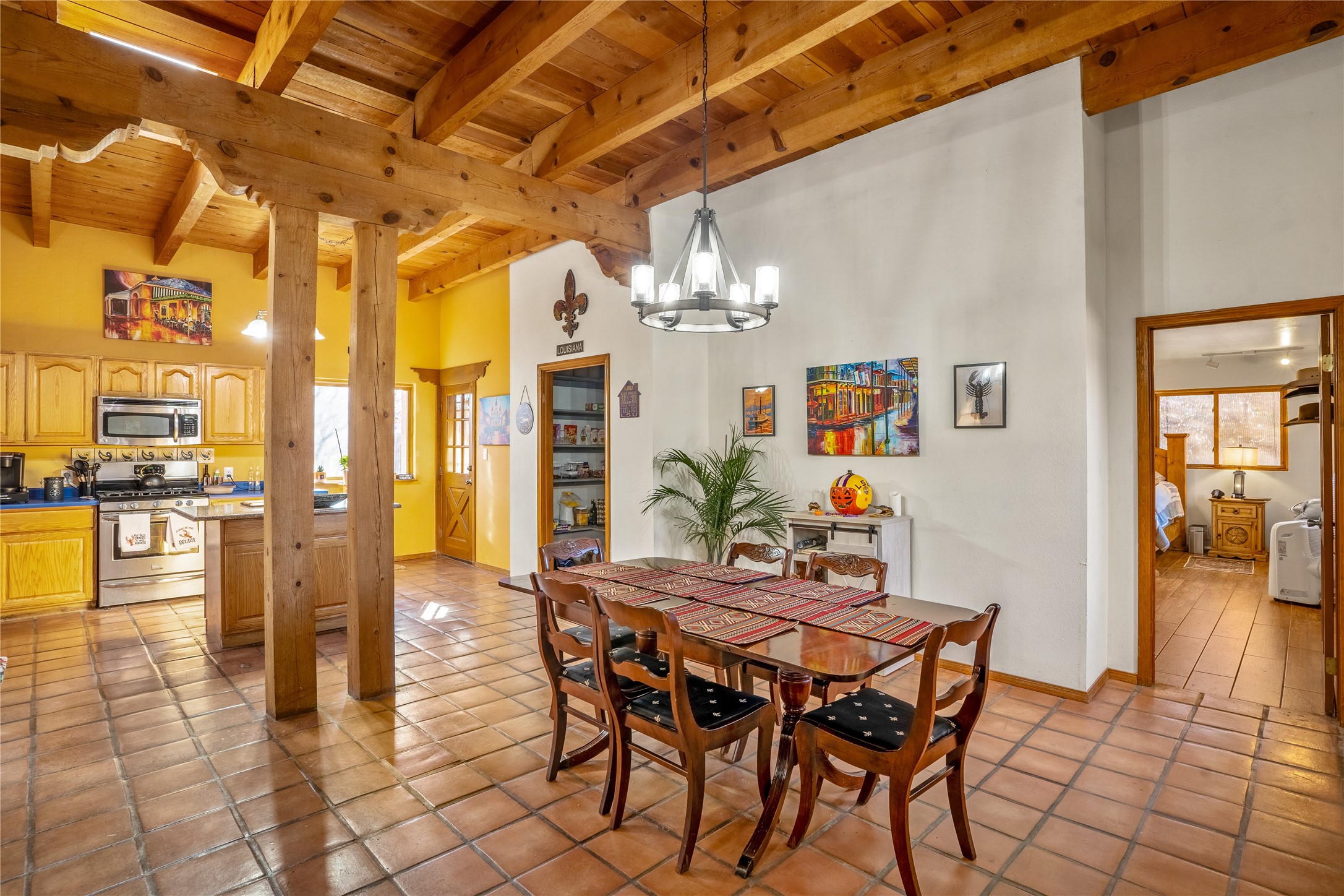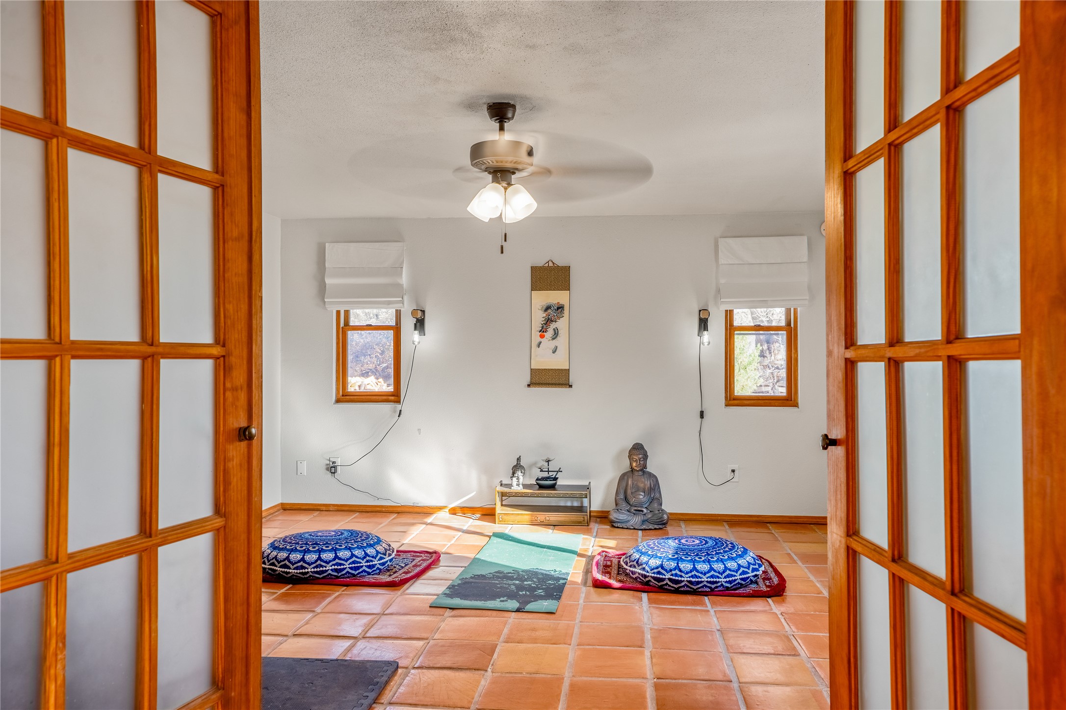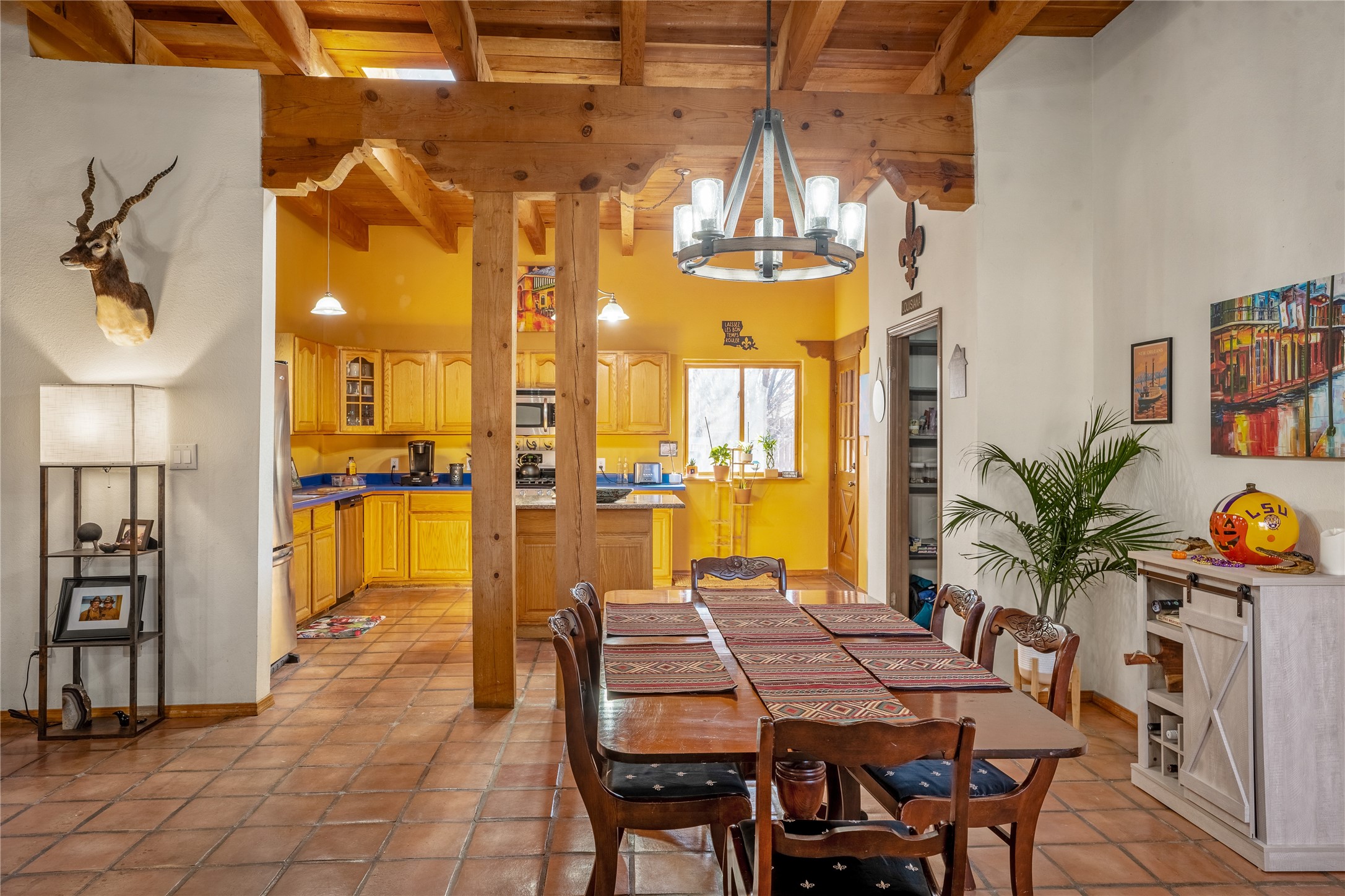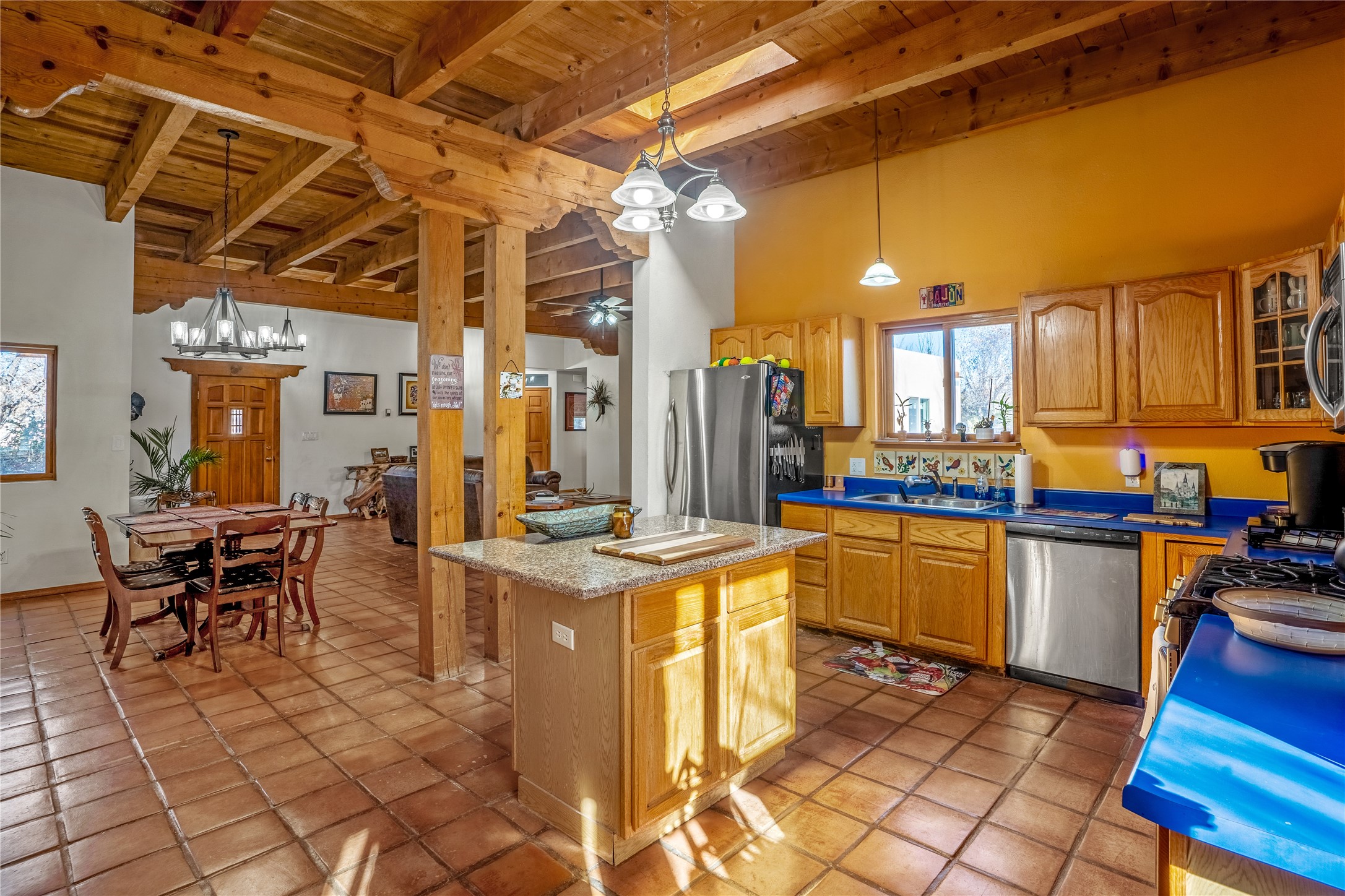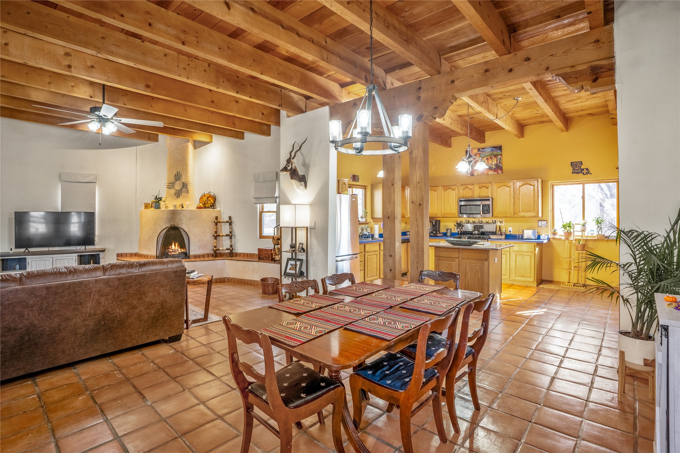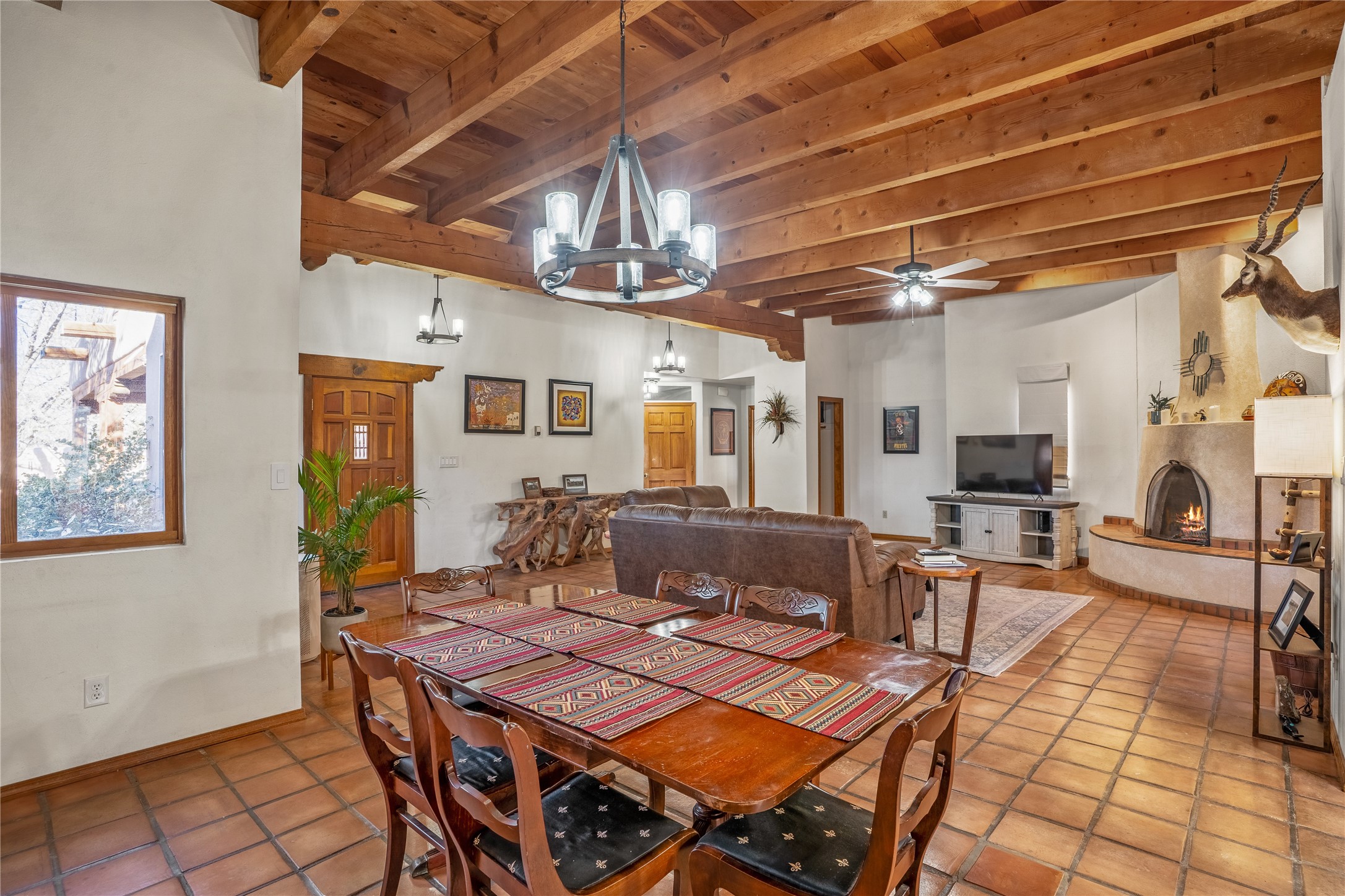 *Price Improvement* This charming New Mexico pueblo-style home is nestled on a private 0.75-acre setting at the end of a quiet, tree-lined private drive in La Mesilla. A stunning curved privacy wall surrounds the property, leading to a beautifully landscaped courtyard with established trees, flower beds, a lawn, drip irrigation, sprinklers, and even a small water featrure--perfect for relaxation and outdoor enjoyment. The home's spacious fenced backyard features, a gazebo, a back porch, and shade trees, ideal for entertaining or unwinding. Inside, the airy and bright open-concept layout boasts tall rustic beams, high ceilings, built-in bookshelves, saltillo tile, and wood grain ceramic flooring throughout. The living room, anchored by a wood-burning kiva fireplace with banco seating, flows seamlessly into the dining area and fully equipped kitchen, featuring stainless steel appliances, granite countertops, and a large pantry. The layout offers excellent bedroom separation, with the inviting primary suite on one side and two guest bedrooms, a spacious office, and a full bathroom on the other. Additional highlights include a large laundry room with cabinetry, an oversized two-car garage with ample storage, and surface water rights through the La Mesilla Community Ditch. Conveniently located approximately 25 miles from the Los Alamos and Santa Fe, this home offers peaceful rural living with modern amenities. Come experience the tranquility and beauty of this exceptional property!