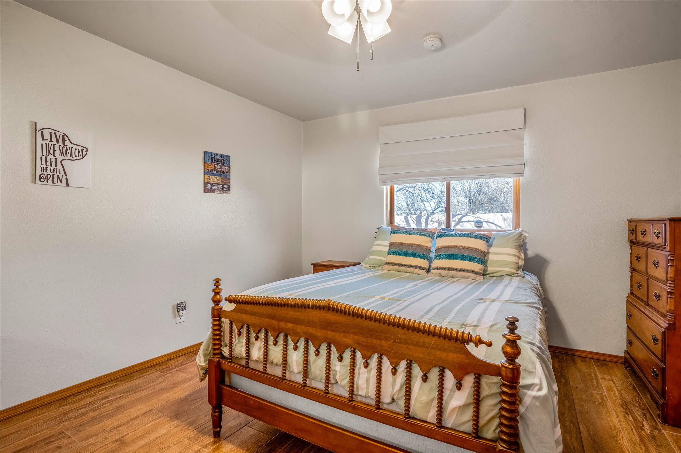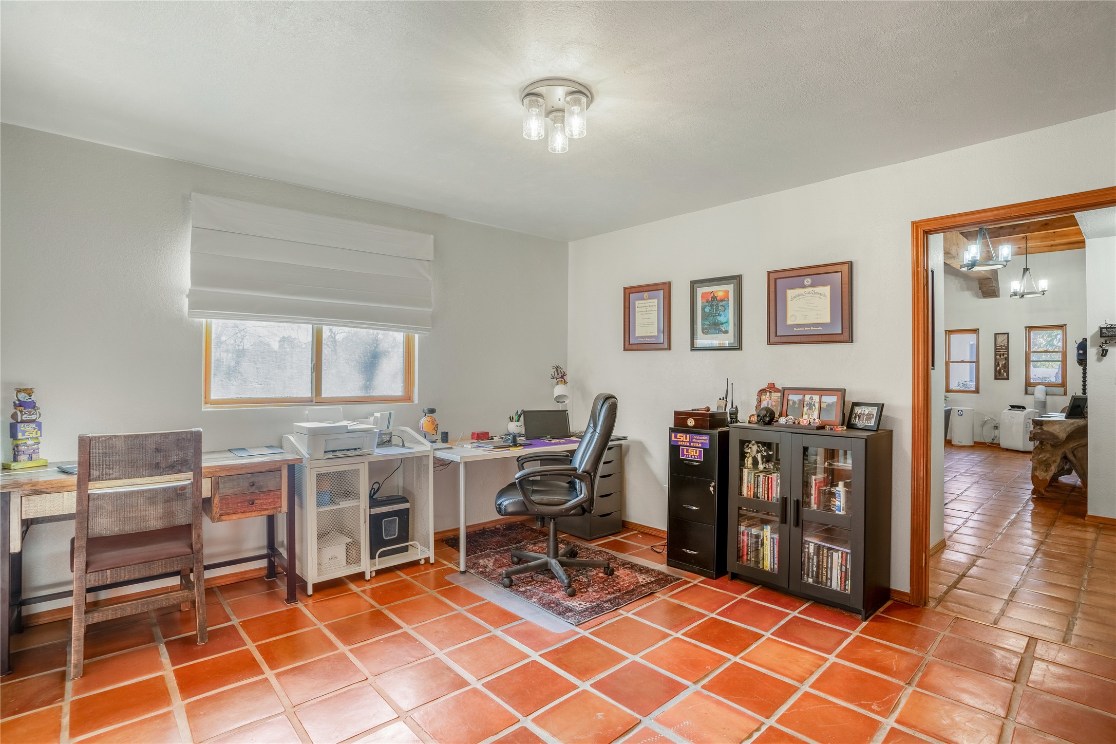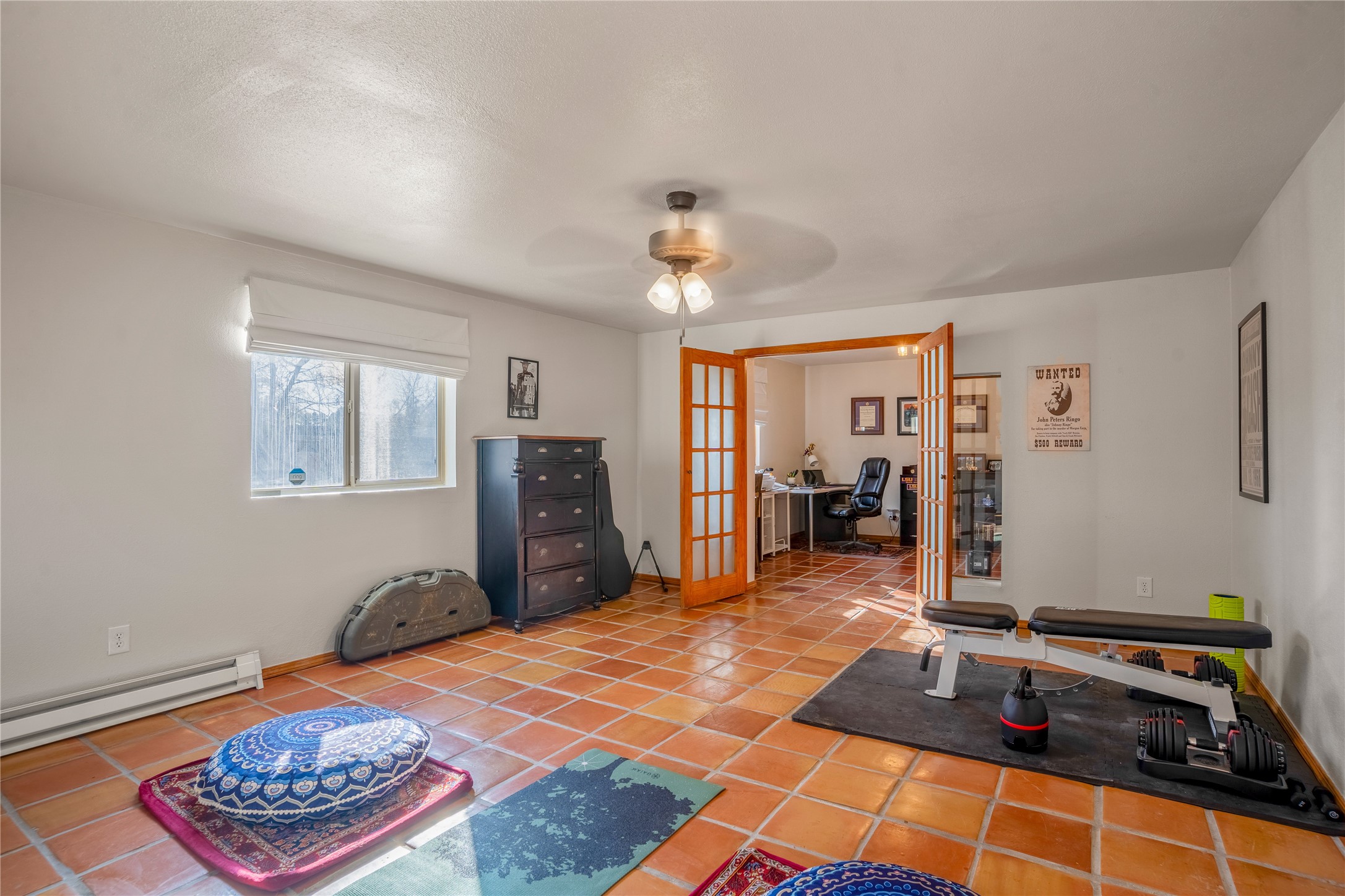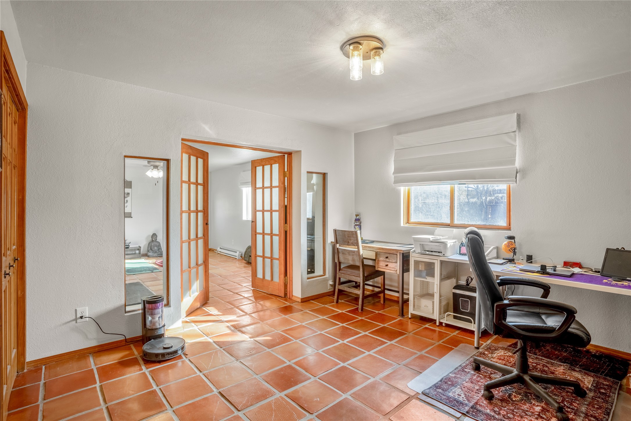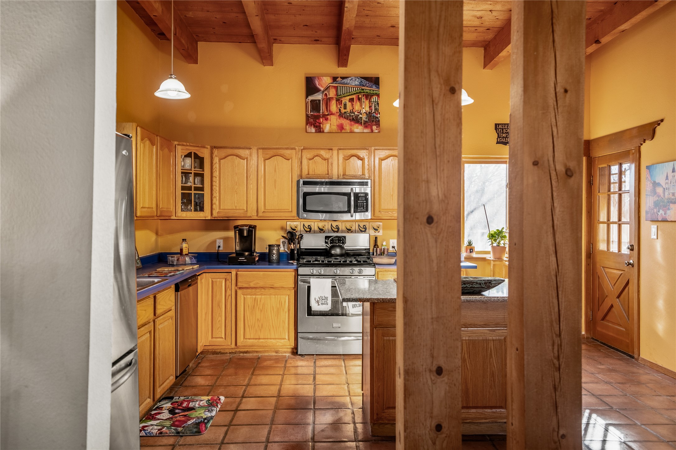 *Price Improvement* This charming New Mexico pueblo-style home is nestled on a private 0.75-acre setting at the end of a quiet, tree-lined private drive in La Mesilla. A stunning curved privacy wall surrounds the property, leading to a beautifully landscaped courtyard with established trees, flower beds, a lawn, drip irrigation, sprinklers, and even a small water featrure--perfect for relaxation and outdoor enjoyment. The home's spacious fenced backyard features, a gazebo, a back porch, and shade trees, ideal for entertaining or unwinding. Inside, the airy and bright open-concept layout boasts tall rustic beams, high ceilings, built-in bookshelves, saltillo tile, and wood grain ceramic flooring throughout. The living room, anchored by a wood-burning kiva fireplace with banco seating, flows seamlessly into the dining area and fully equipped kitchen, featuring stainless steel appliances, granite countertops, and a large pantry. The layout offers excellent bedroom separation, with the inviting primary suite on one side and two guest bedrooms, a spacious office, and a full bathroom on the other. Additional highlights include a large laundry room with cabinetry, an oversized two-car garage with ample storage, and surface water rights through the La Mesilla Community Ditch. Conveniently located approximately 25 miles from the Los Alamos and Santa Fe, this home offers peaceful rural living with modern amenities. Come experience the tranquility and beauty of this exceptional property!