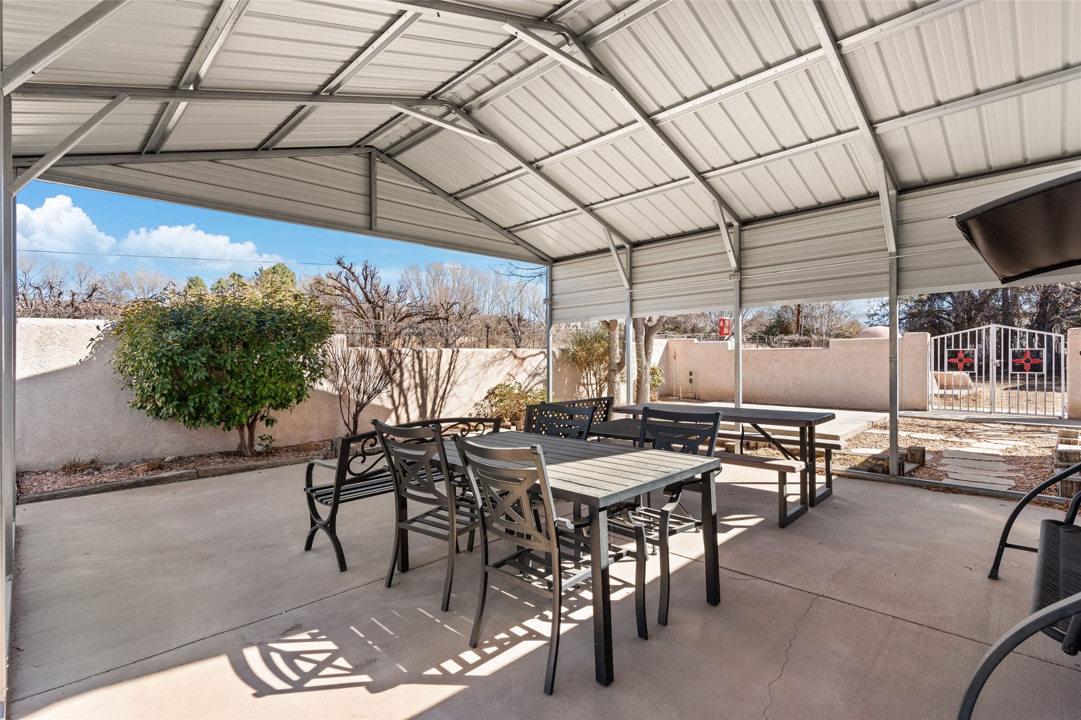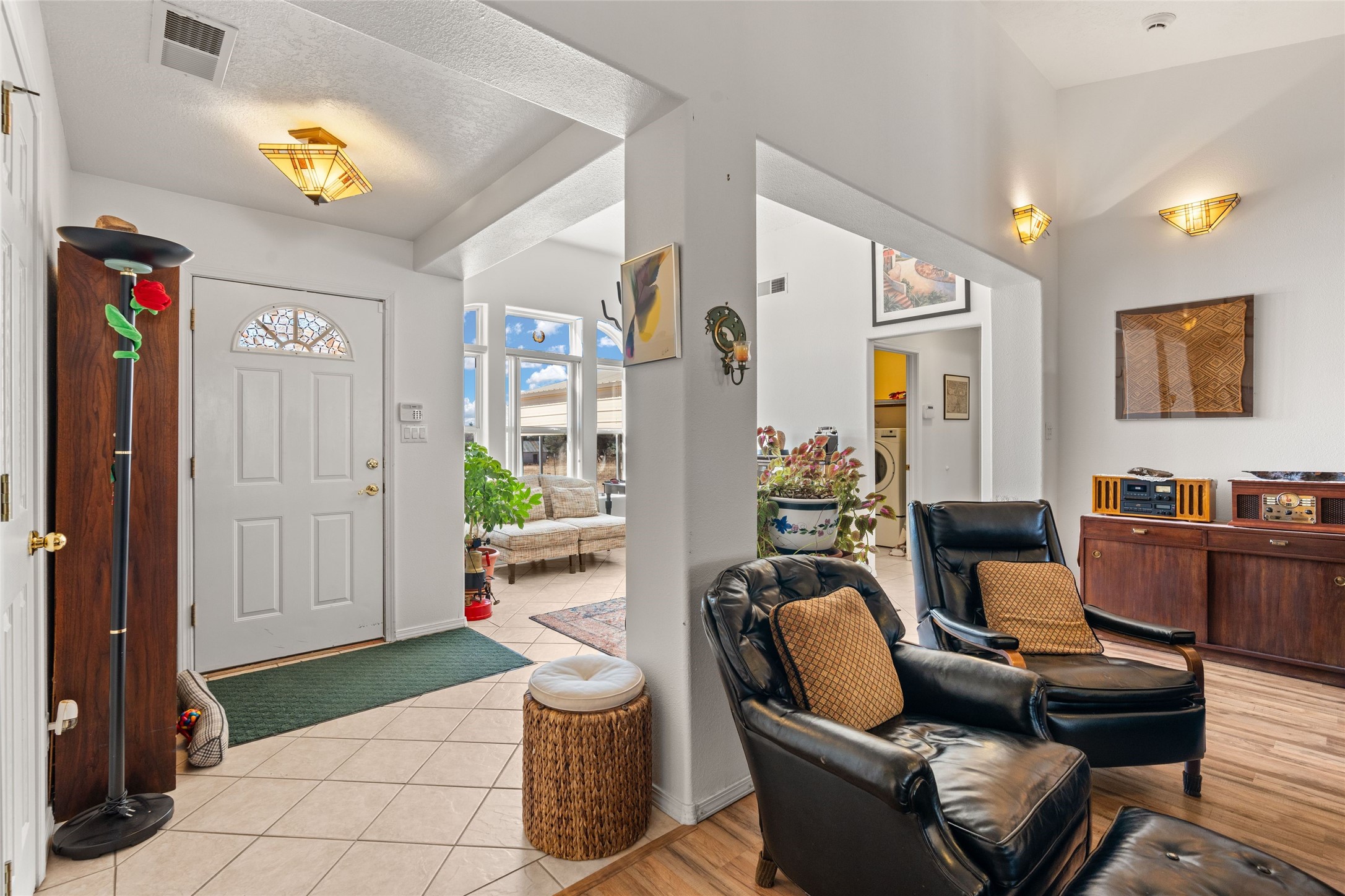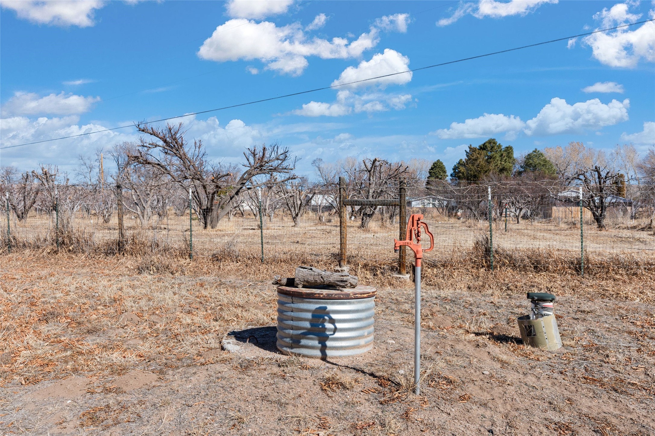 This lovely modern home boasts a beautiful, private setting in rural Chimayo with an orchard behind and pastures in front opening onto spectacular views of the barrancas and Sangre de Cristo Mountains. Enjoy clean, bright, open spaces inside with three bedrooms and 2 bathrooms. Outside an enclosed courtyard has covered portal and patio. The property has a finished attached garage, a carport and a detached garage along with a storage building. Perfect for the car enthusiast. Private Well and Surface water rights for your orchard and gardens. The location is quiet, far from the traffic and yet only 35 minutes from Santa Fe. A short distance to the Chimayo weaving and art galleries and the Santuario. Plenty of outdoor activities in the area include hiking, snow skiing, biking, fishing, rafting and horseback riding.