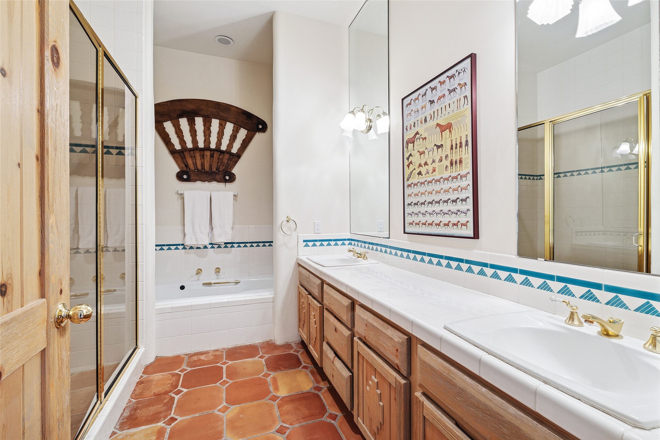 One of the most majestic estates in all of Santa Fe, this rare, exceptional compound impresses with TWO separate homes, (4) lots with 10+ acres total, (2) wells, a 3-stall barn and absolutely stunning Sangre Mountain views! This extraordinary estate excites and captivates with two impressive, separate homes, (6) garage spaces total, a stable with flexible use of space and some of the most magical and lush grounds found anywhere in Santa Fe, all within a 10-minute drive to the historic Santa Fe Plaza. The main house impresses with 4,919 square feet, inherent warmth and an expansive ranch-style porch which overlooks the fenced pastures and Sangre De Cristo Mountain views. The second home delights with 3,697 square and an open-concept design, ideal for large gatherings. This estate must be seen to fully appreciate the rarity of this land, the incredible homes and the opportunity to own one of the most iconic estates in all of Santa Fe.