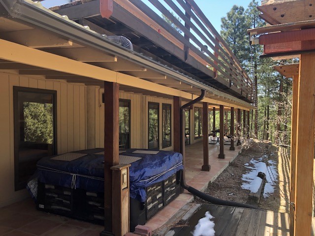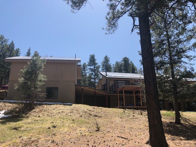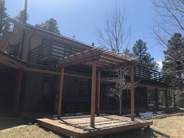 Spectacular country mountain retreat in Pendaries Village. The home is two stories with decks on three sides. Upstairs is ground level in the front, and includes 2 bedrooms and one full bath. Downstairs opens at ground level in the back of the house and has 3 bedrooms and 2.5 baths. Back deck has a hot tub which looks through tall Ponderosa. Original 2-car garage is detached from house but from the downstairs through covered porch. It has a concrete floor, 2 murphy beds, and half bath. A newer 2-car garage is a little downhill from the house, and has two large garage doors, and a small one which would accommodate UTVs and motorcycles. All this on 5.179 forested acres. There is a 4.62 kilowatt solar system and a 22 kilowatt Generac generator, which backs up the whole house and has an automatic transfer switch. Live in it full time and use it for a family retreat.