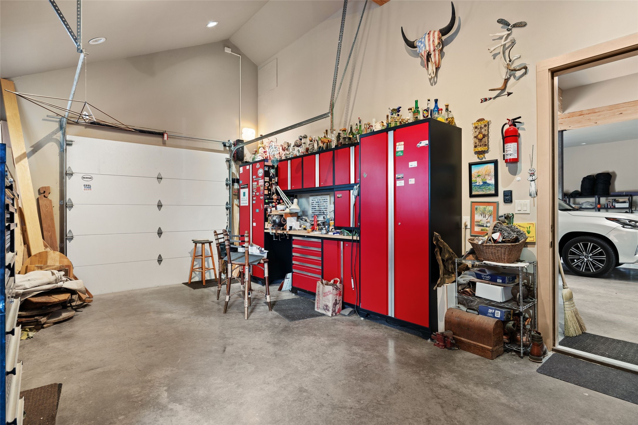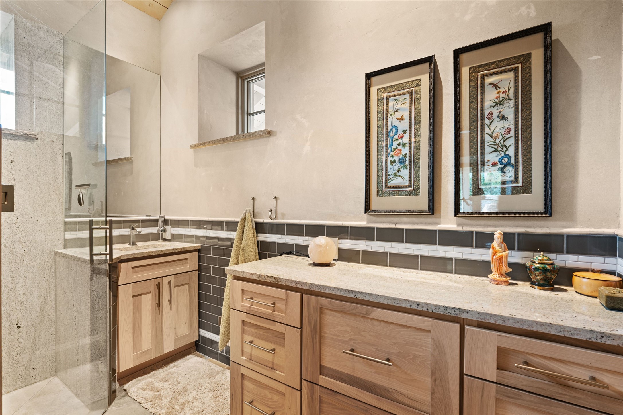An extraordinary opportunity to embrace a luxurious, self-sustaining lifestyle in this Northern New Mexico farmhouse within the gated community of Tesuque Villas. This single-level home with guesthouse is designed for off-grid potential including: a solar photovoltaic electric system, and backup generator, rainwater harvesting, private well, 10,000-gallon underground water storage tank, and 3,000-gal propane storage. Designed as a healthy home with consulting architect Paula Baker-Laporte. Inside the main home, the kitchen is equipped with a built-in Subzero refrigerator and freezer, Wolf six-burner gas stove, and Bosch dishwasher. The attached butler's pantry provides Wolf appliances including double ovens, steam oven, Miele coffee cappuccino maker, second Bosch dishwasher, and a storage room. Black walnut and locally sourced flagstone floors throughout the home with radiant in-floor heat. The great room presents a central kitchen island with solid amazonite countertop. Adjacent office space provides a convenient area for work/study. The primary suite features an infrared sauna, steam shower, heated towel rack, expansive closet, laundry, and library. With inviting outdoor kiva-style fire pit and roof deck with 360-long-range views this home exemplifies the perfect blend of modern luxury and natural beauty. Sited within the Sangre de Cristo mountains with a spectacular view of the Jemez Mountain range, this private location is just a short drive from downtown Santa Fe and minutes from the Four Seasons Rancho Encantado Resort and Tesuque Village Market.