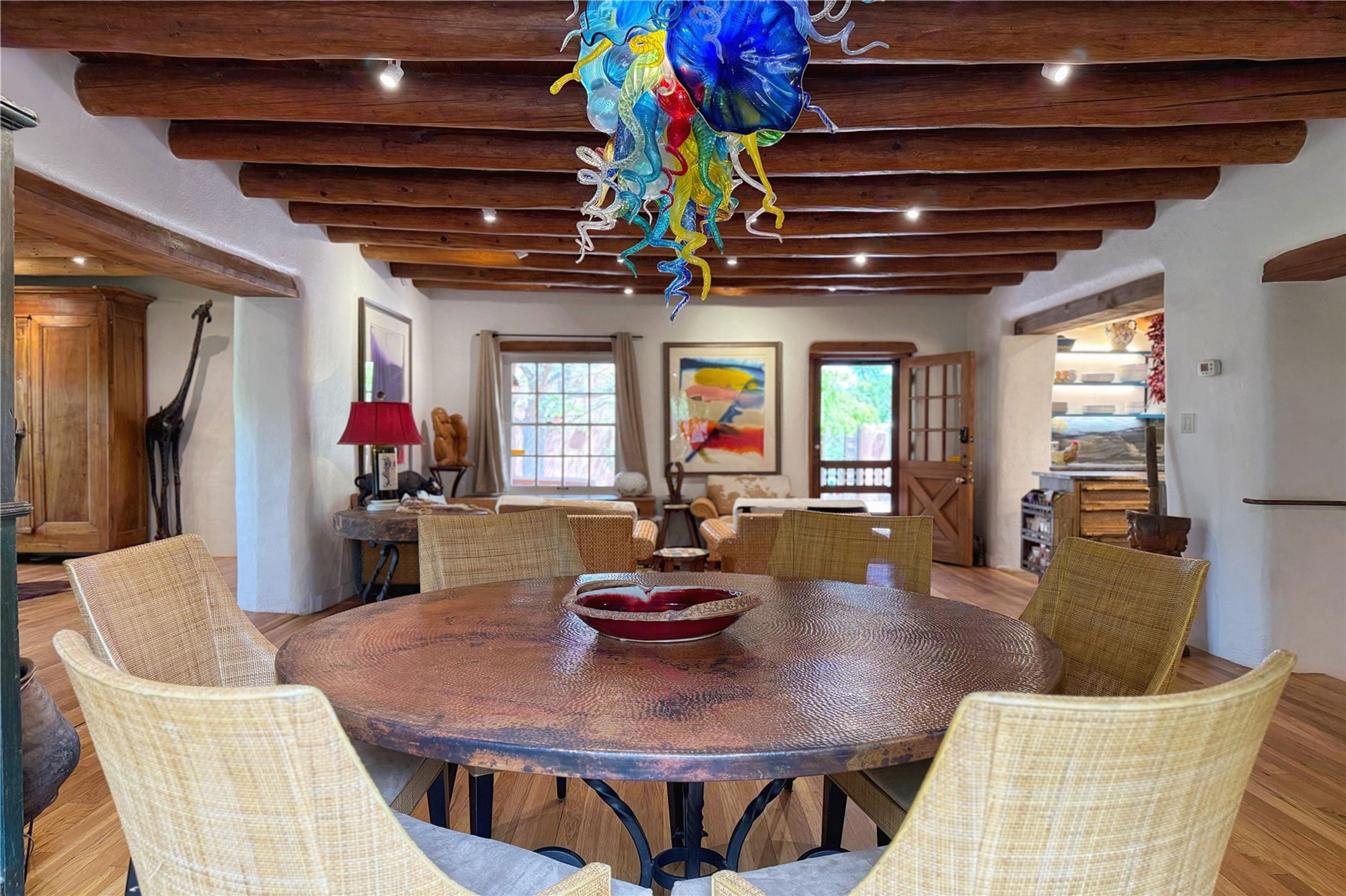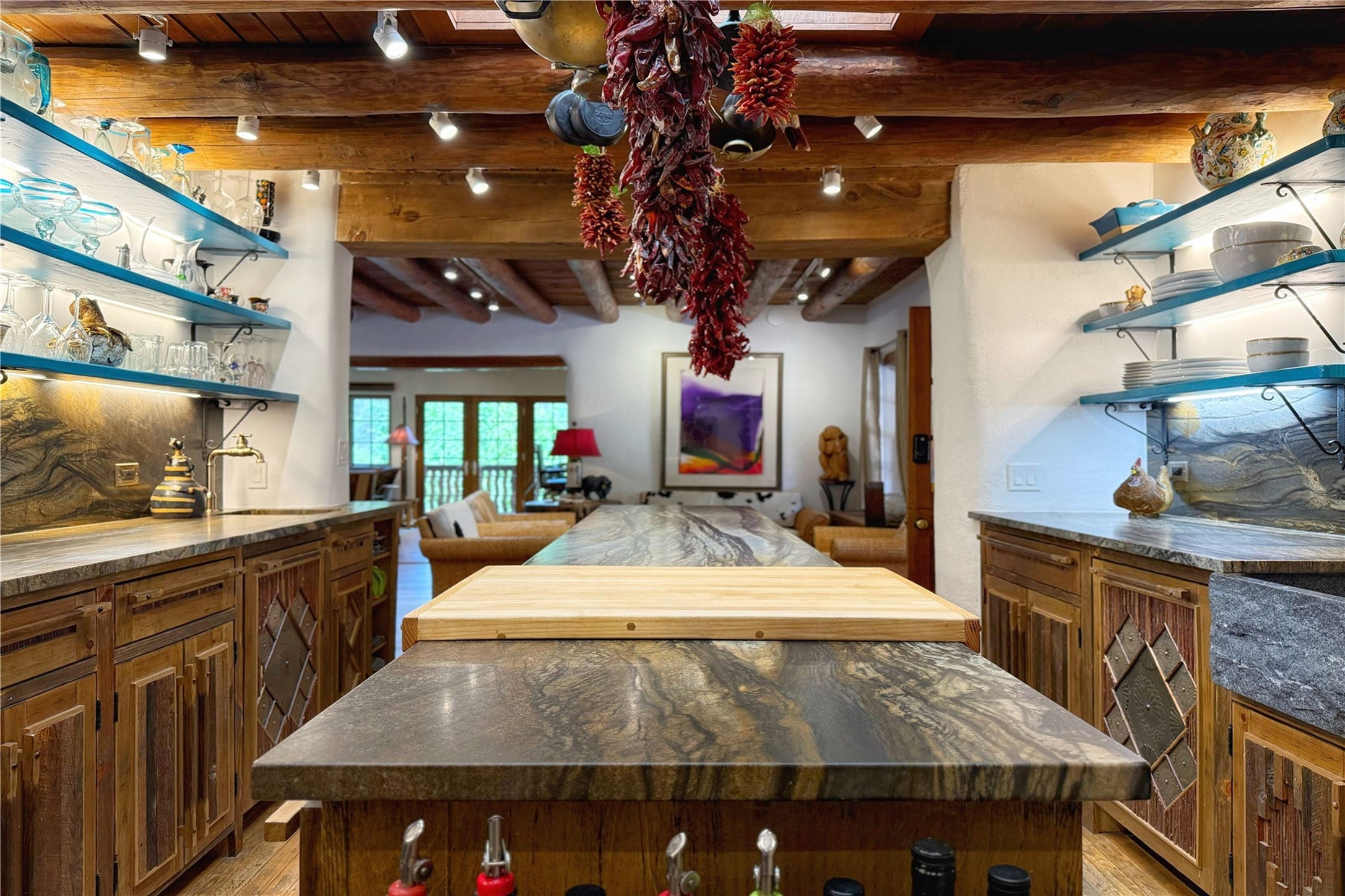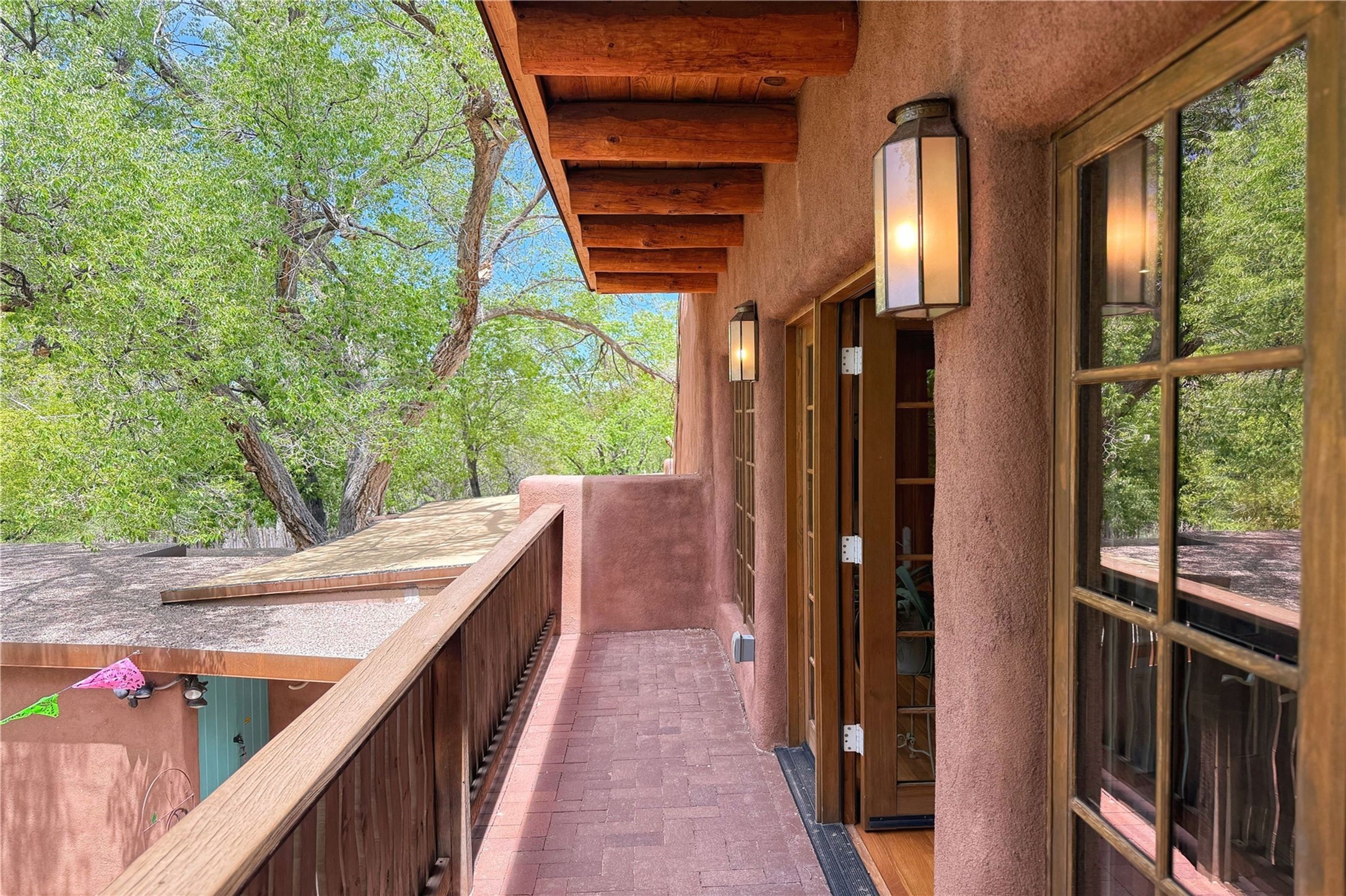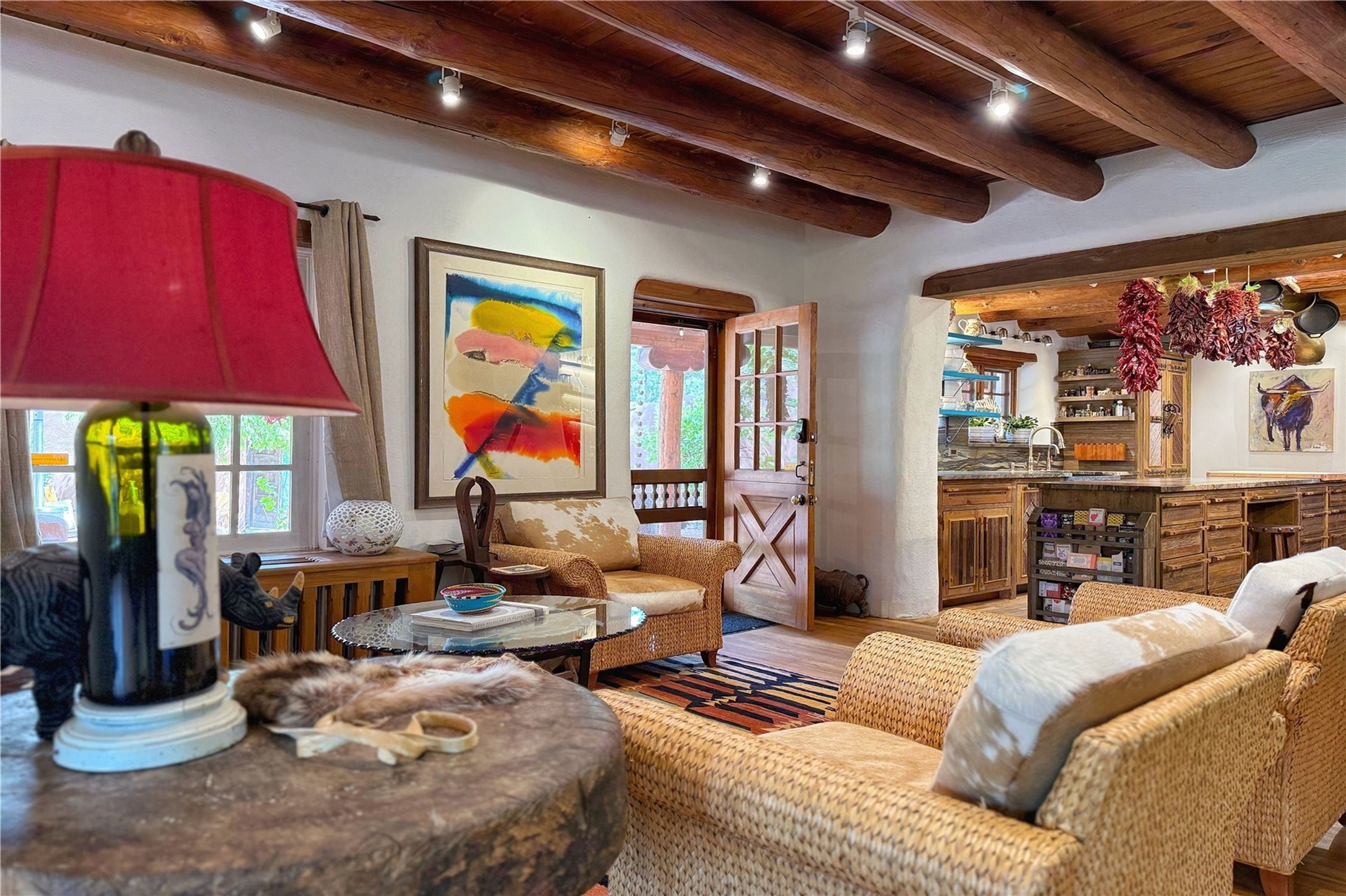 Exquisite Historic Compound with Modern Luxuries - Recent Extensive Renovation Creating a Truly Unique Lush Tesuque Oasis. Welcome to this extraordinary multi-residence estate nestled on a historic 100+ year-old property. Seamlessly blending Old Santa Fe charm with modern sophistication. From handcrafted elements to lush gardens, every detail of this property tells a story.Enter into a serene courtyard with water features, mature trees, and fruiting grapevines that leads to a warm sitting room and flows into the dining area and gourmet kitchen.Granite leather-finished countertops, a deep stone sink, open shelving, skylights, Liebherr fridge, and custom cabinetry complete a kitchen that is like no other. The main house features timeless design with 18 inch adobe walls, hardwood floors, original vigas, multiple kivas and custom cabinetry crafted on-site from 100-year-old wood.Downstairs, the primary suite is nestled below the main living area. Relax with a kiva fireplace, and a peaceful view of the back garden. Stunning Brazilian Aquamarine granite graces the primary bath. "Dancing Hare" casita offers Saltillo tile, two bedrooms, a full kitchen with Taj Mahal counters, turquoise cabinets, and a private patio and balcony. This casita has separate parking adding privacy. "Laughing Horse" casita features open-concept living with large glass doors opening to the garden with stable views, original exposed brick and wood stove, and a full kitchen. Additional Structures include large art studio with private entrance, an expansive gym, and two-stalled stables. This property boats multiple stunning outdoor spaces for dining, gardening and entertaining parties intimate or grand. Terraced levels, hot tub, fire-pit, a creek running at the back of the property and apricot trees complete this oasis. A rare opportunity to own a piece of history enhanced with artisanal craftsmanship and high-end modern finishes. A perfect personal sanctuary or family compound.