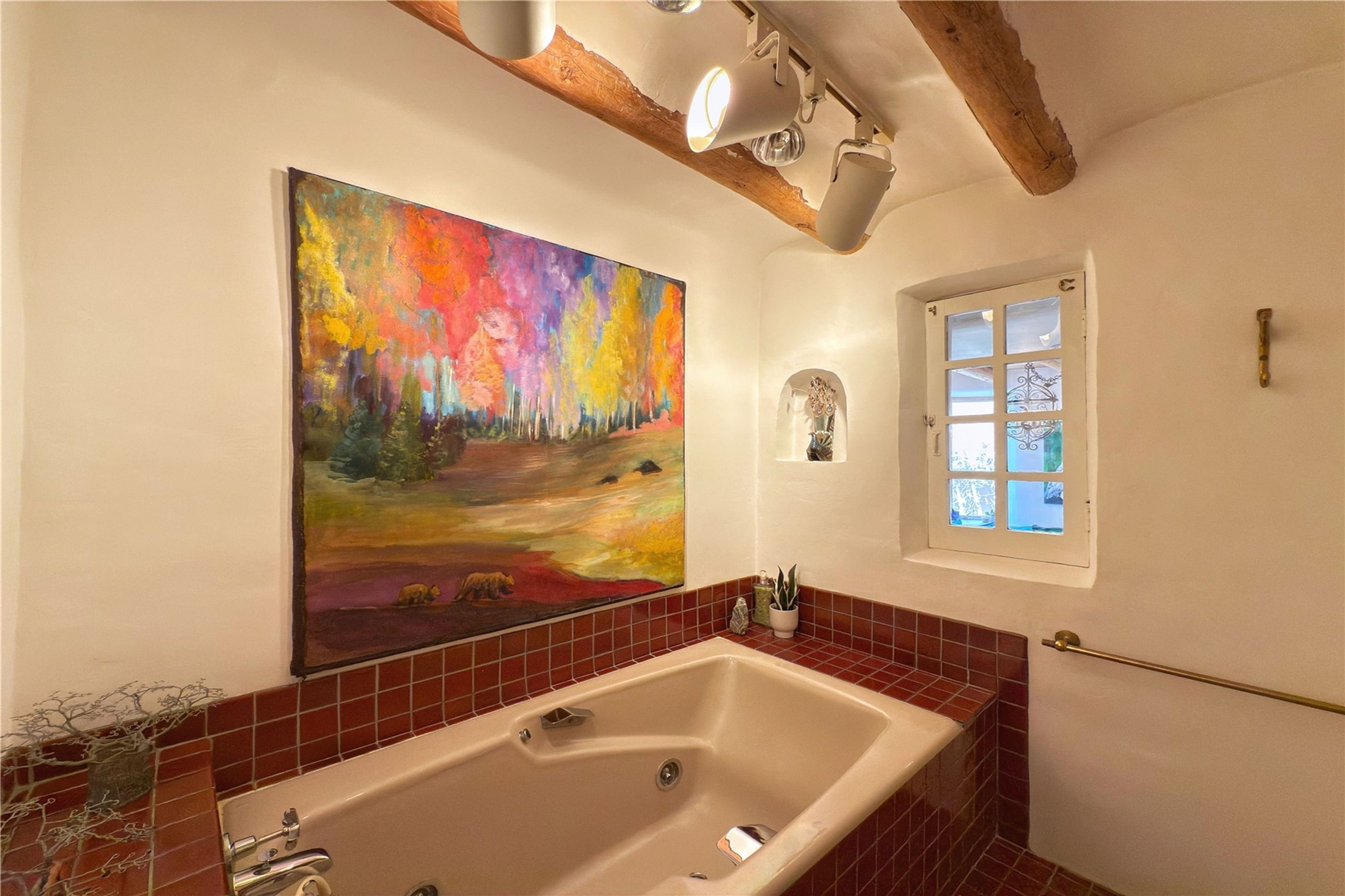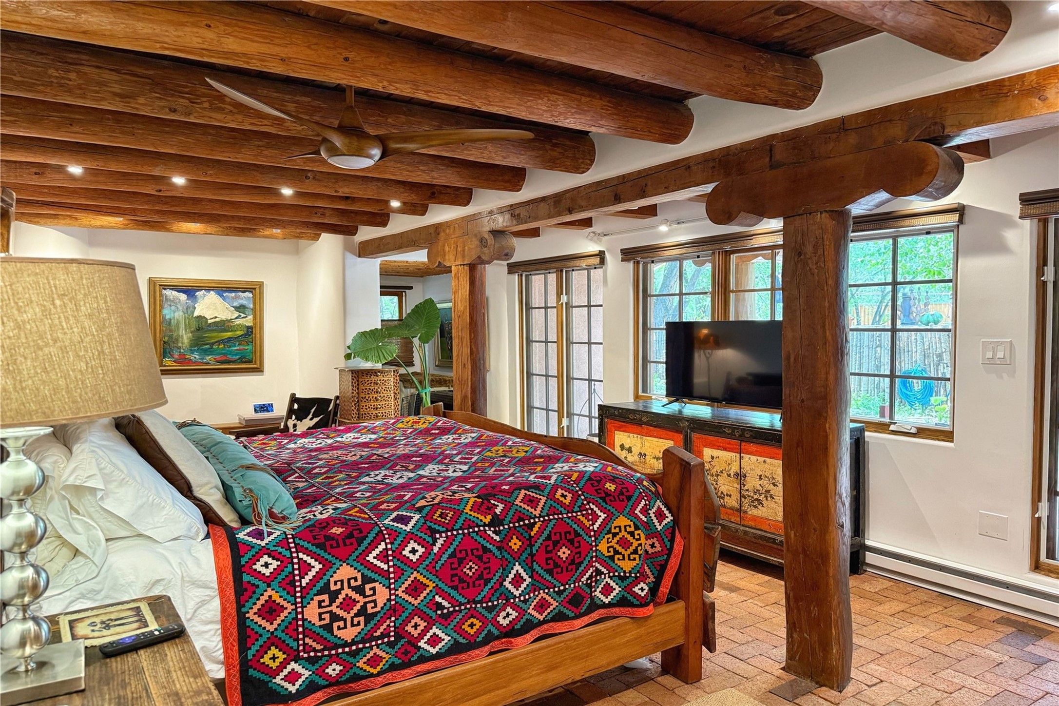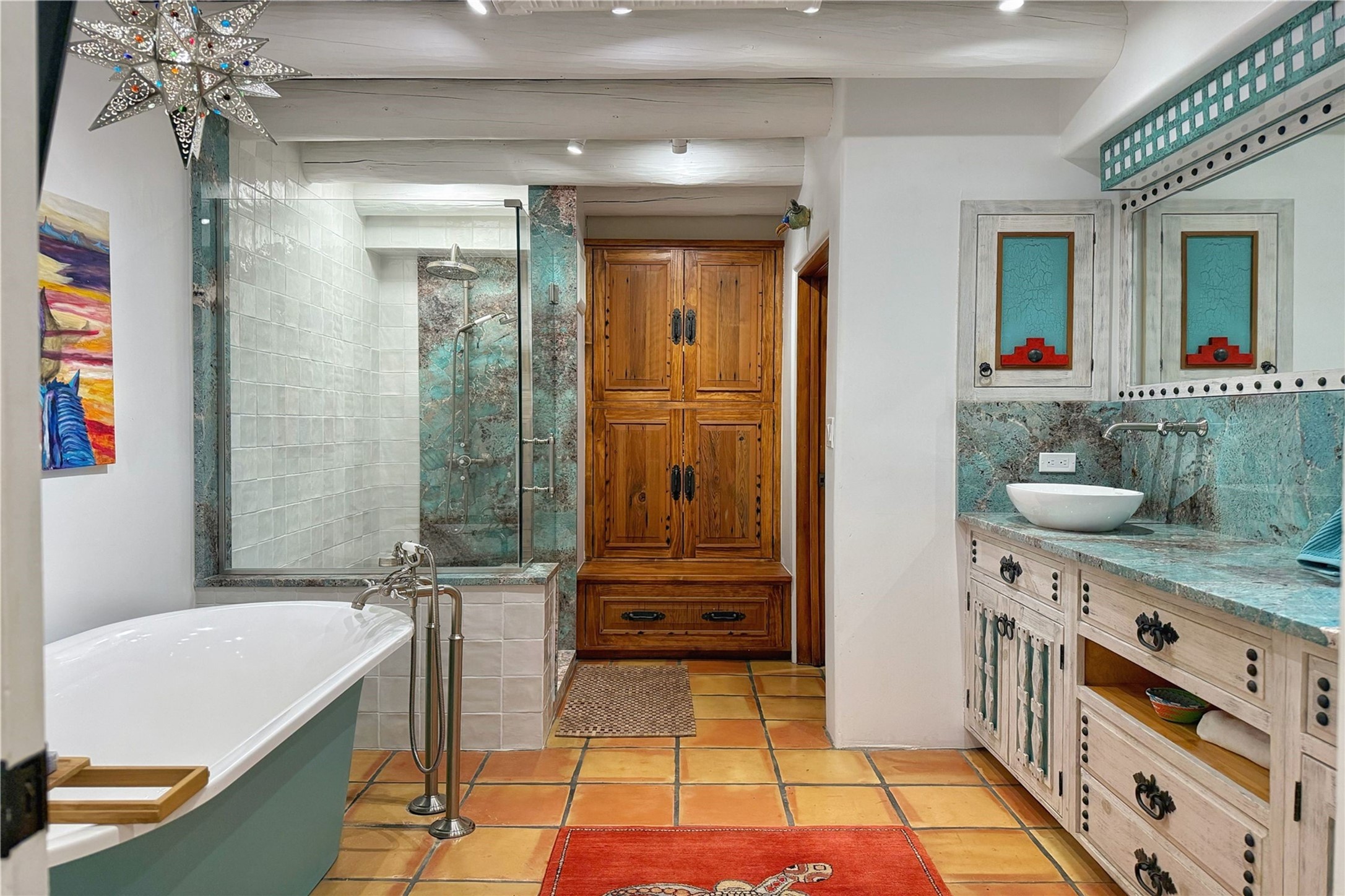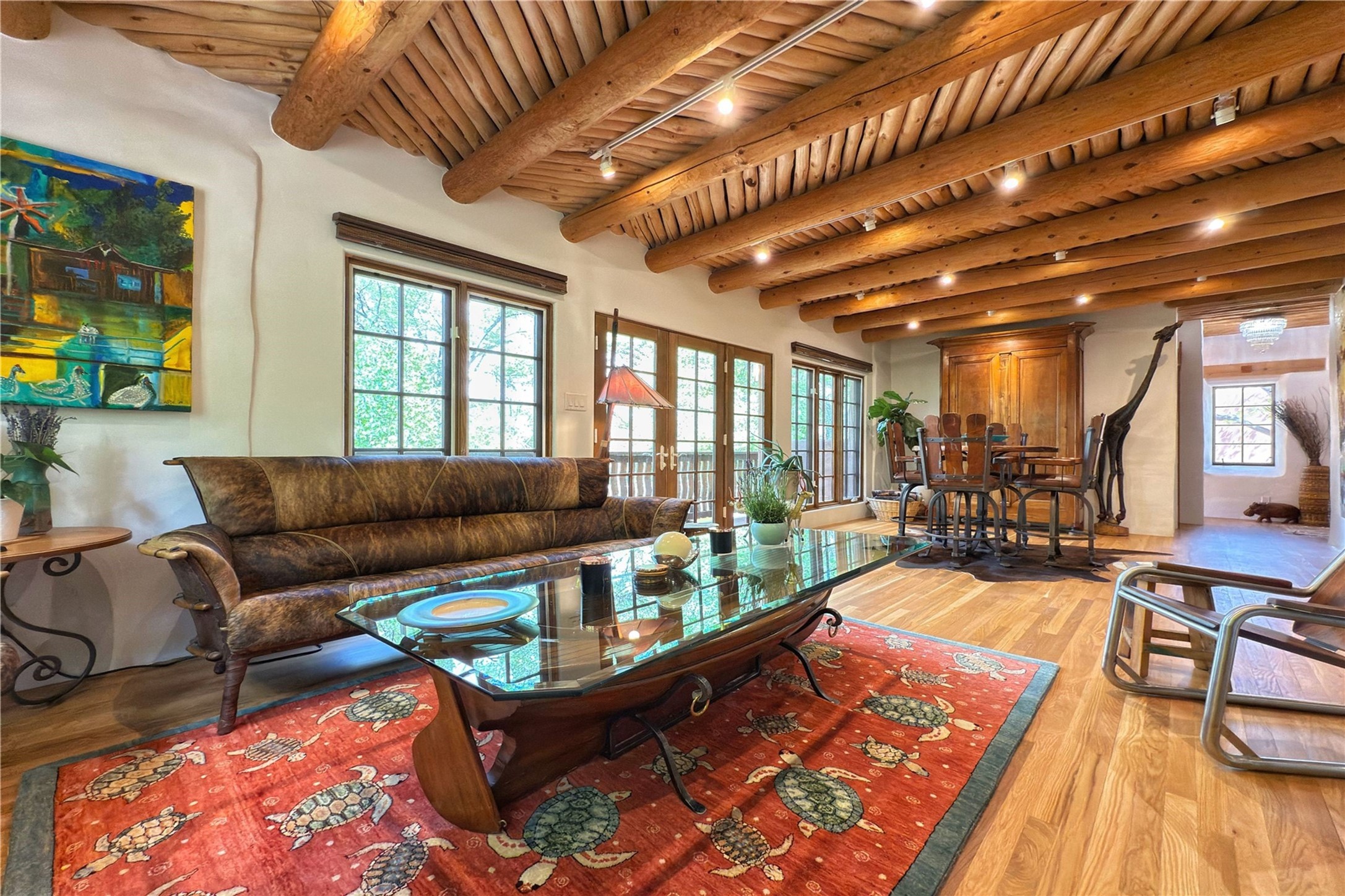 Exquisite Historic Compound with Modern Luxuries - Recent Extensive Renovation Creating a Truly Unique Lush Tesuque Oasis. Welcome to this extraordinary multi-residence estate nestled on a historic 100+ year-old property. Seamlessly blending Old Santa Fe charm with modern sophistication. From handcrafted elements to lush gardens, every detail of this property tells a story.Enter into a serene courtyard with water features, mature trees, and fruiting grapevines that leads to a warm sitting room and flows into the dining area and gourmet kitchen.Granite leather-finished countertops, a deep stone sink, open shelving, skylights, Liebherr fridge, and custom cabinetry complete a kitchen that is like no other. The main house features timeless design with 18 inch adobe walls, hardwood floors, original vigas, multiple kivas and custom cabinetry crafted on-site from 100-year-old wood.Downstairs, the primary suite is nestled below the main living area. Relax with a kiva fireplace, and a peaceful view of the back garden. Stunning Brazilian Aquamarine granite graces the primary bath. "Dancing Hare" casita offers Saltillo tile, two bedrooms, a full kitchen with Taj Mahal counters, turquoise cabinets, and a private patio and balcony. This casita has separate parking adding privacy. "Laughing Horse" casita features open-concept living with large glass doors opening to the garden with stable views, original exposed brick and wood stove, and a full kitchen. Additional Structures include large art studio with private entrance, an expansive gym, and two-stalled stables. This property boats multiple stunning outdoor spaces for dining, gardening and entertaining parties intimate or grand. Terraced levels, hot tub, fire-pit, a creek running at the back of the property and apricot trees complete this oasis. A rare opportunity to own a piece of history enhanced with artisanal craftsmanship and high-end modern finishes. A perfect personal sanctuary or family compound.