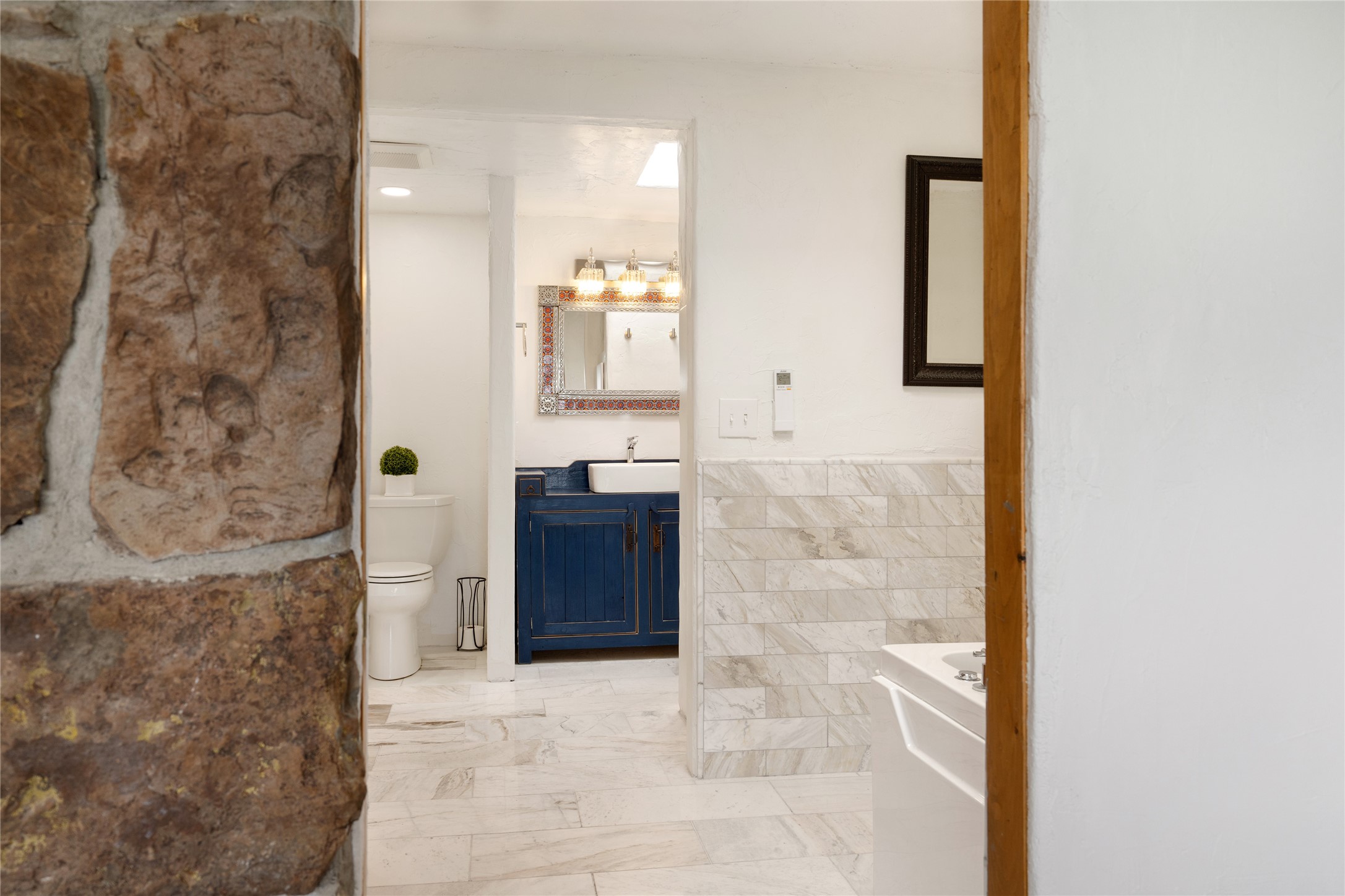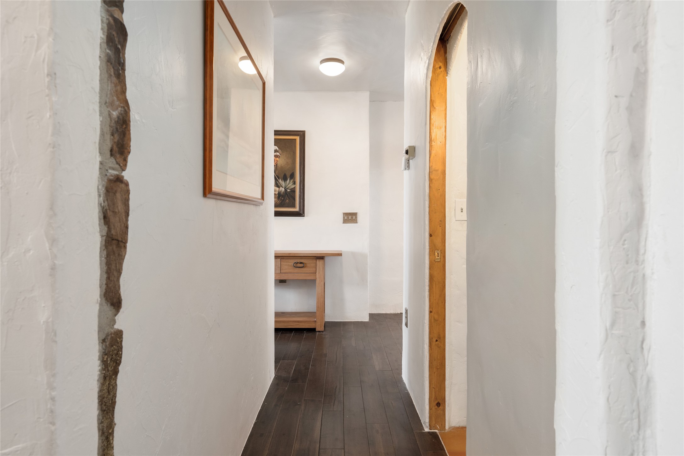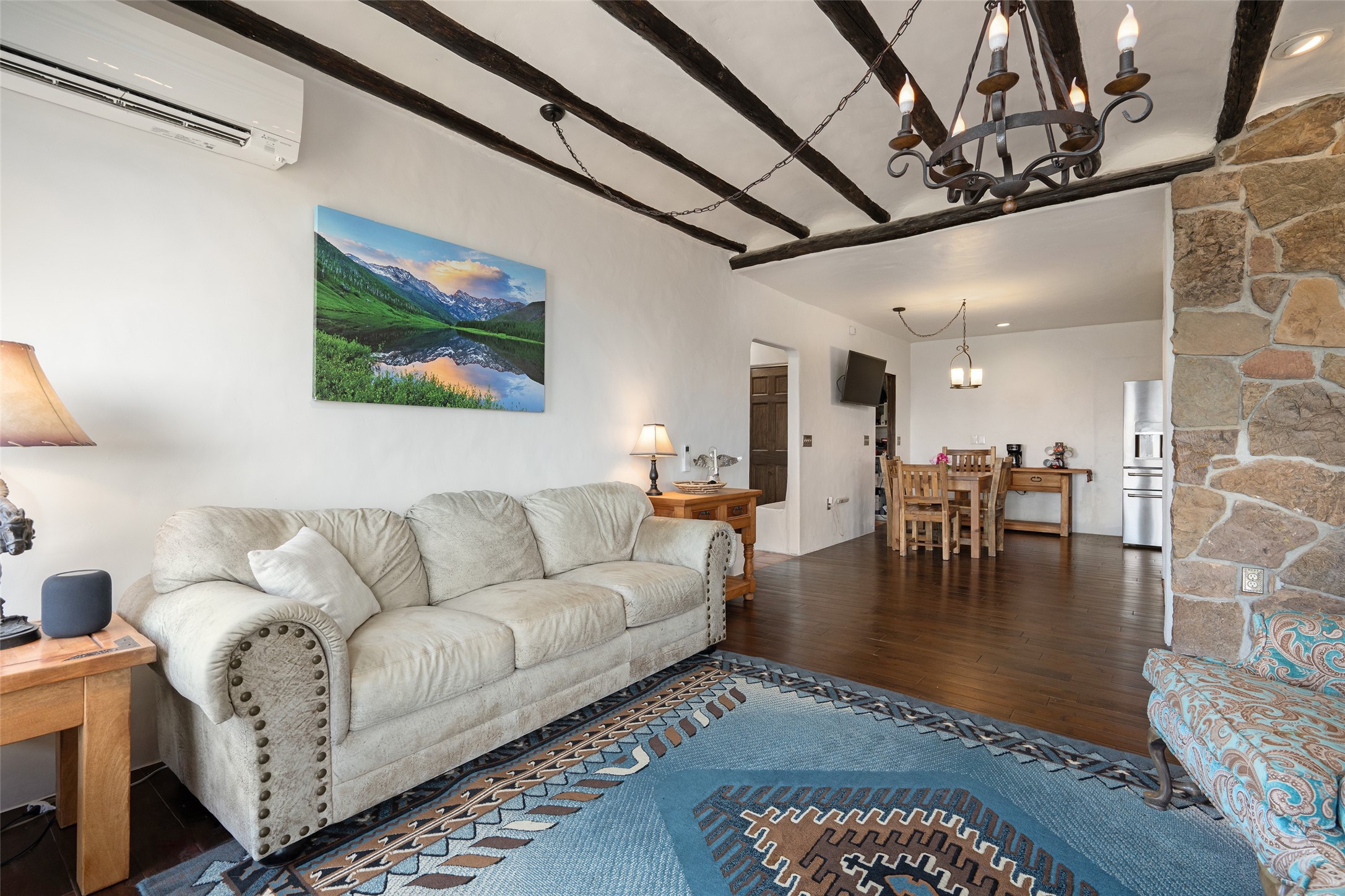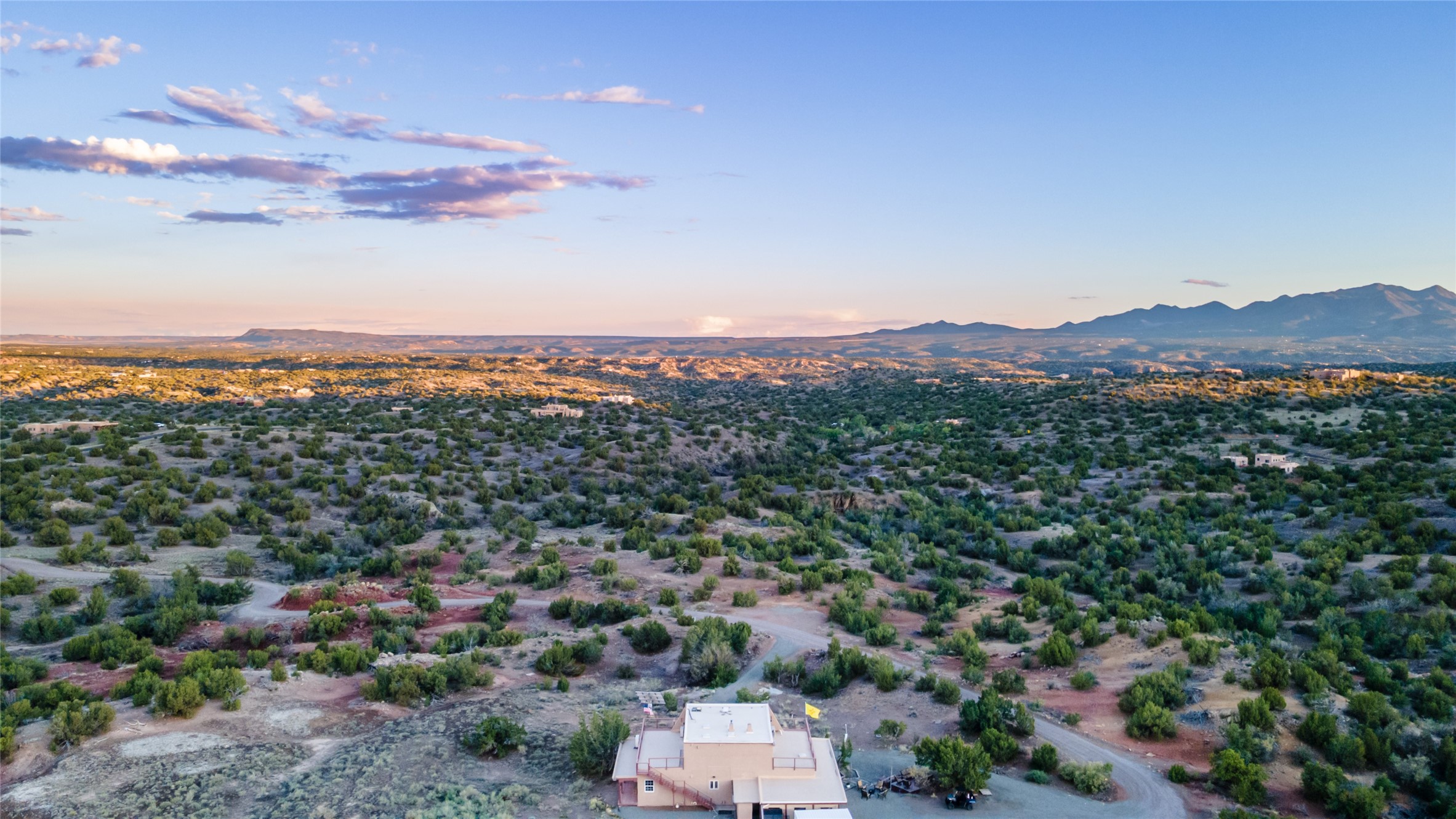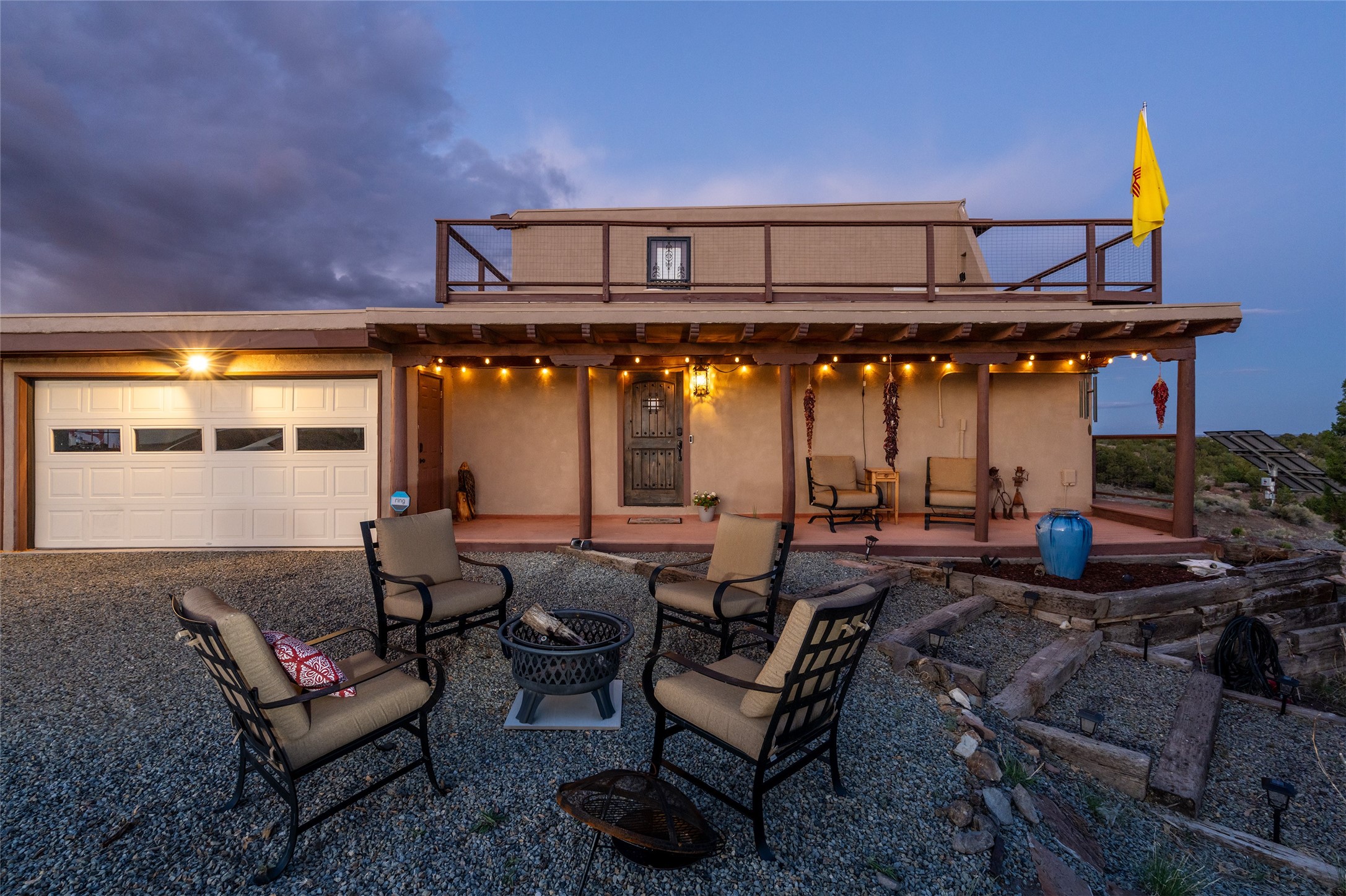 What you need to know - No HOA fees, Views for miles, Horses allowed and around 25 min to Plaza, Canyon Road, or Railyard, and 50 min from ABQ Intl Airport. This home has been renovated to accentuate traditional Santa Fe features -- walnut hardwood floors and locally hand-forged chandeliers have been added to the 10-foot ceilings with vigas and stone accent walls. The kitchen now has high-end appliances, granite countertops, and a Lacunza wood-burning stove, blending beauty and function. The open concept living, dining, and kitchen area is filled with natural light from expansive windows overlooking the surrounding landscape Talavera tile risers lead to the owner's suite, which encompasses the entire upstairs. Relax with the Mr. Steam dream shower and 2-person jetted tub surrounded by marble flooring, or watch the sunset from one of the balconies. On the main floor you'll find two bedrooms, both with outdoor access, and a shared bathroom and office space located by the entrance. Downstairs there is another bedroom, workout space, storage, laundry, meditation room with kiva and a fully equipped theater room - all of which stays with home. The rest of the space is open to your imagination - kids play room, art studio... The productive well features a new pump, cistern, and multi-stage filtration system. Programmable mini splits provide year-round comfort, while owned solar panels help keep energy costs low. The regraded and graveled driveway, along with an excavated pad, offers ample space for RVs or recreational toys, and potential for a horse barn or casita. Sitting on 16 acres of gently rolling hills dotted with juniper, mountain mahogany, and pion--it offers exceptional privacy, yet easy access to amenities.