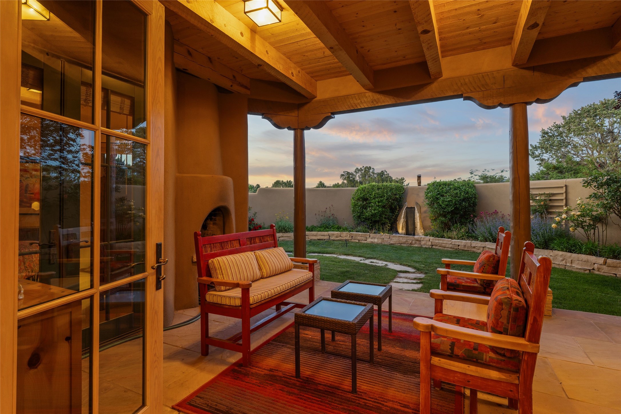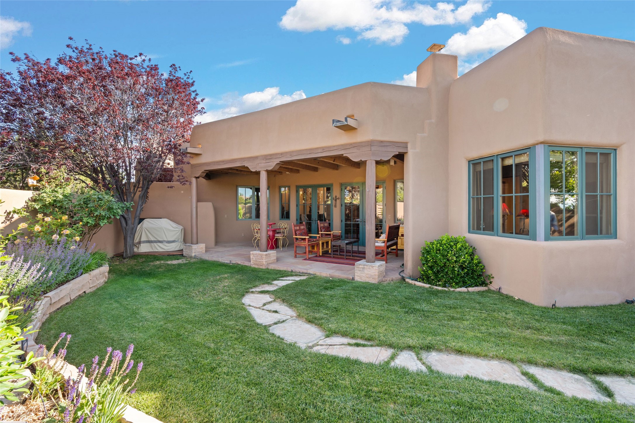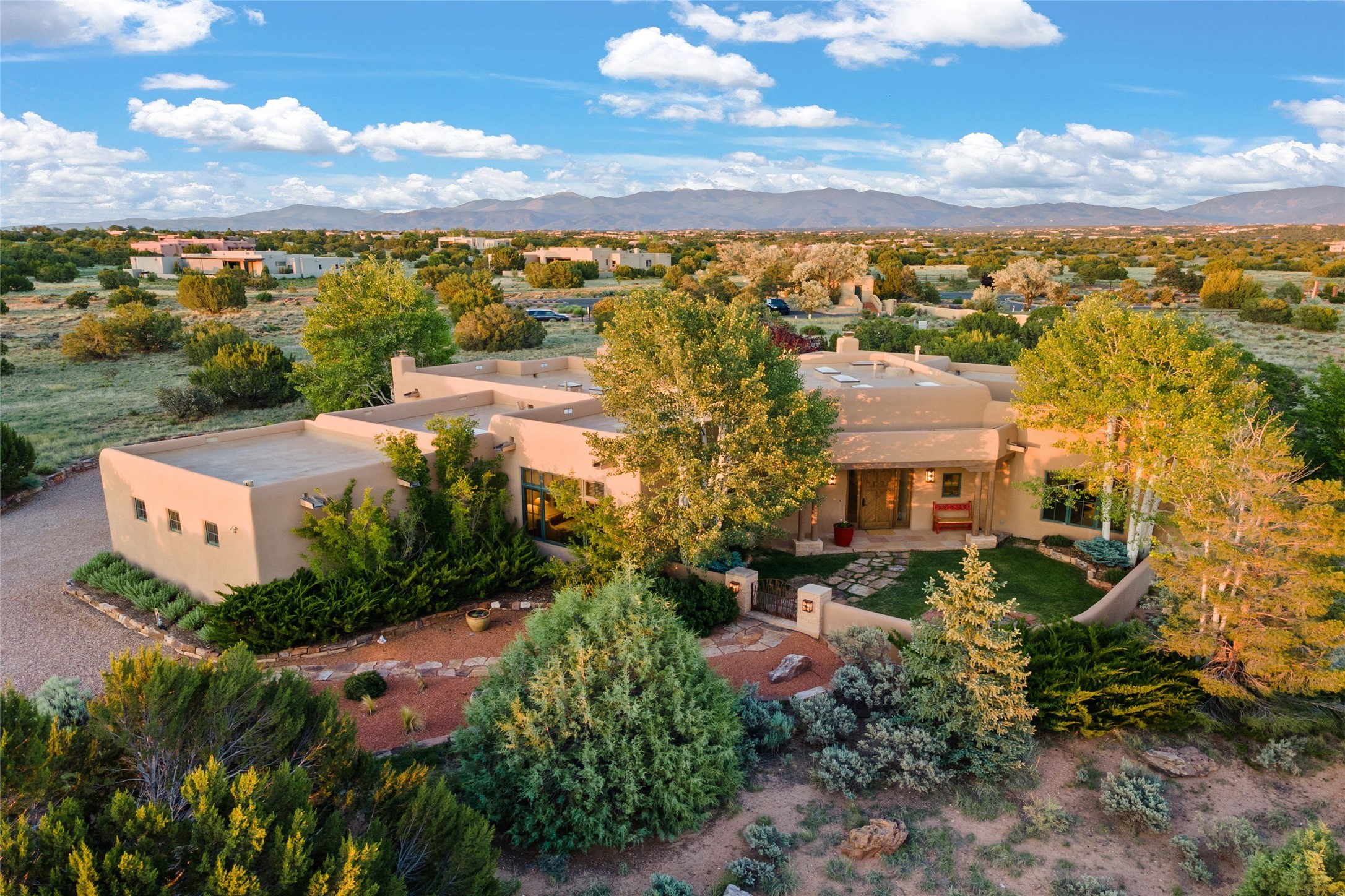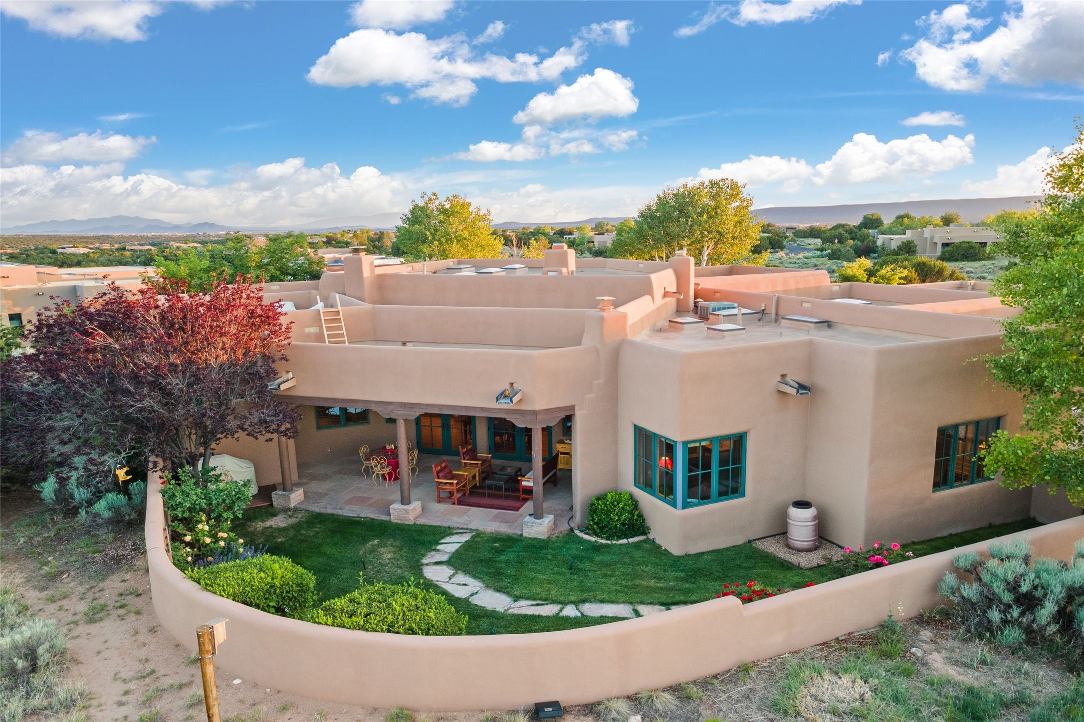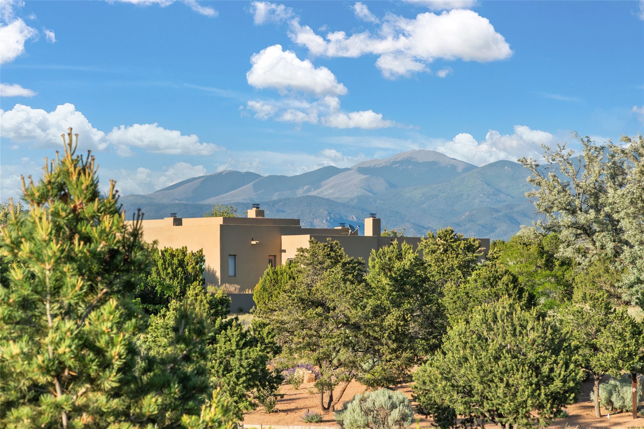 This Soft Contemporary 4-Bedroom / 3.5 Bath, Single-story home with No Steps built by locally-renowned Builder Kim Unger offers a Jemez & Sangre de Cristo View in gated Las Campanas. The Living Room has enough space for a Grand Piano & enjoys a Jemez Mountain view. The adjacent Dining Room showcases a stunning Anasazi-style fireplace & dramatic soaring ceiling. The Kitchen has stainless appliances, a large eating bar for socializing as well as an easy transition to the casual dining area with wet bar for entertaining. The nearby Family Room has a hand-built rock fireplace, TV / Media area & convenient built-in desk. The Main Suite includes a kiva fireplace, retreat area & a walk-in closet worthy of a retail establishment. The Main Bath offers a generously-sized soaking tub, walk-in shower, two-sink vanity & access to a private portal area. Three additional bedrooms provide ample space for friends & family to stay, one with an en-suite bath and another with a microwave, sink, under-counter refrigerator & outside entrance. Two adjoining 2-car garages provide a multitude of choices - Art Studio, Wood Shop, Work-Out area or space for that special collectible car. The spacious outdoor area includes a shaded portal area with wood-burning kiva fireplace, water feature, refreshing green grass lawn area, plus a spacious roof deck with 360-degree Mountain Views. This fabulous single-story home with No Steps checks all the boxes - 4 Bedrooms * Family Room * 3 Baths * 4-Car Garage * Roof Deck with 360-degree mountain views - Call for an appointment Today!