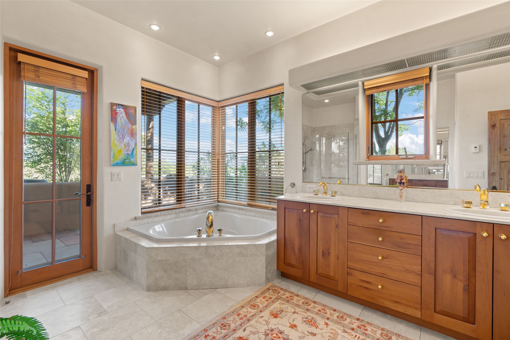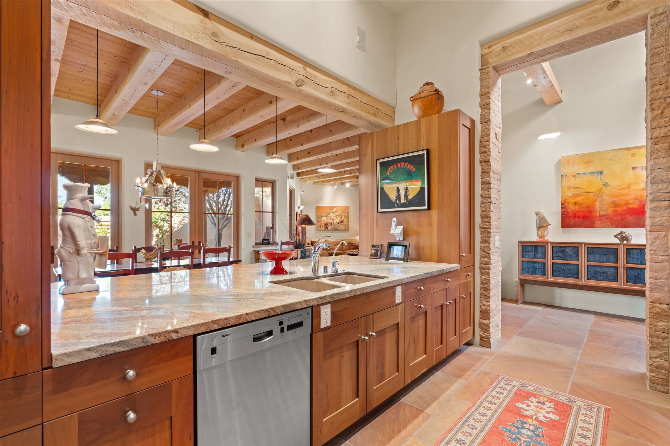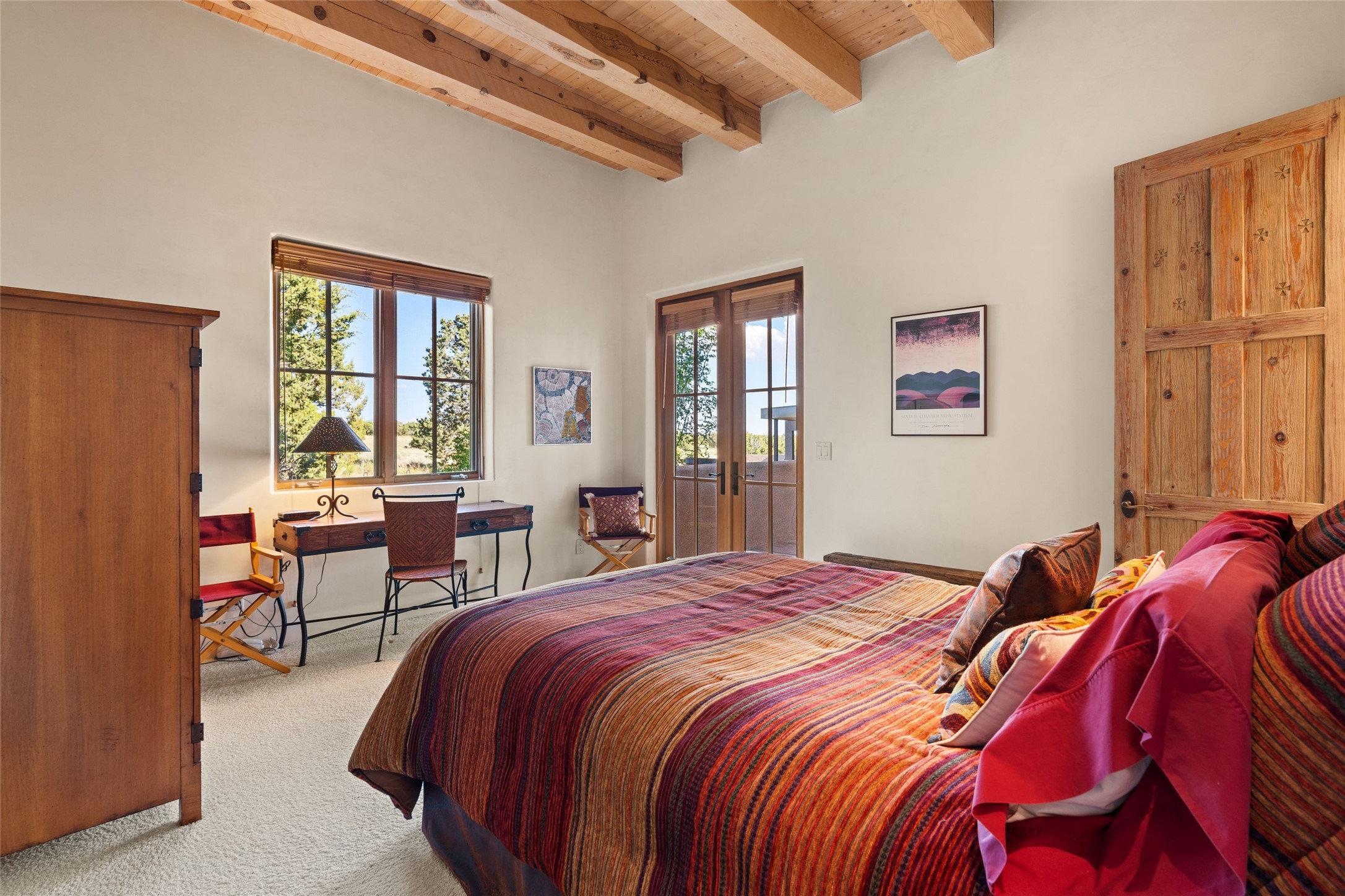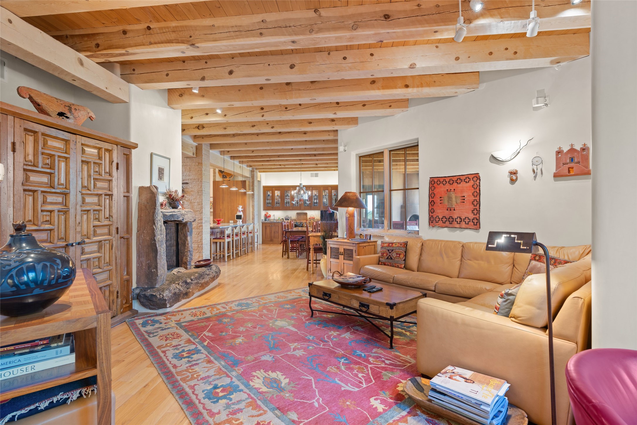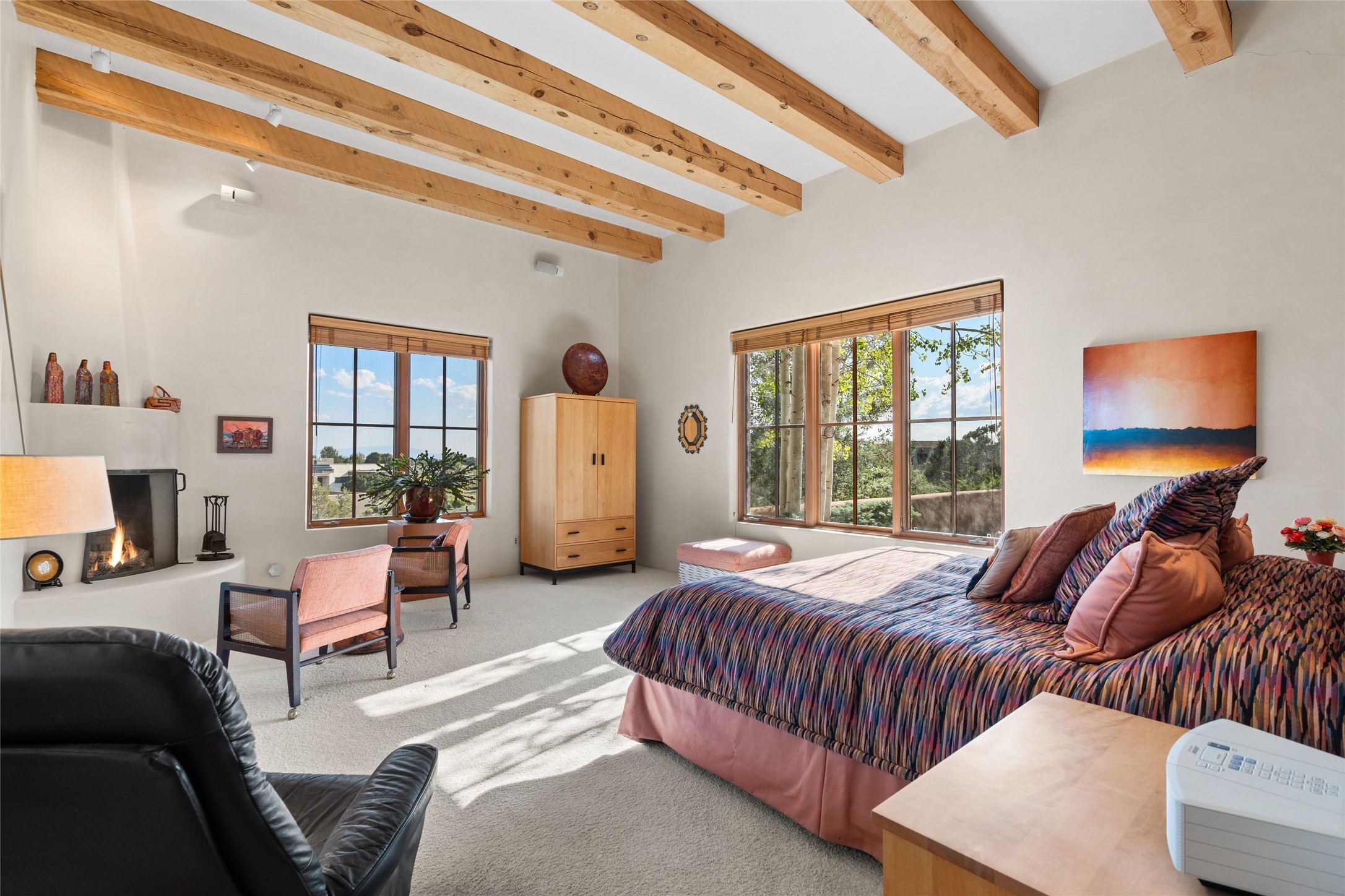 This Soft Contemporary 4-Bedroom / 3.5 Bath, Single-story home with No Steps built by locally-renowned Builder Kim Unger offers a Jemez & Sangre de Cristo View in gated Las Campanas. The Living Room has enough space for a Grand Piano & enjoys a Jemez Mountain view. The adjacent Dining Room showcases a stunning Anasazi-style fireplace & dramatic soaring ceiling. The Kitchen has stainless appliances, a large eating bar for socializing as well as an easy transition to the casual dining area with wet bar for entertaining. The nearby Family Room has a hand-built rock fireplace, TV / Media area & convenient built-in desk. The Main Suite includes a kiva fireplace, retreat area & a walk-in closet worthy of a retail establishment. The Main Bath offers a generously-sized soaking tub, walk-in shower, two-sink vanity & access to a private portal area. Three additional bedrooms provide ample space for friends & family to stay, one with an en-suite bath and another with a microwave, sink, under-counter refrigerator & outside entrance. Two adjoining 2-car garages provide a multitude of choices - Art Studio, Wood Shop, Work-Out area or space for that special collectible car. The spacious outdoor area includes a shaded portal area with wood-burning kiva fireplace, water feature, refreshing green grass lawn area, plus a spacious roof deck with 360-degree Mountain Views. This fabulous single-story home with No Steps checks all the boxes - 4 Bedrooms * Family Room * 3 Baths * 4-Car Garage * Roof Deck with 360-degree mountain views - Call for an appointment Today!